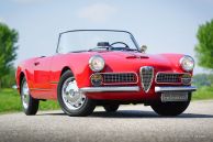 Alfa Romeo 2000 Touring Spider, jaar 1961. Kleur rood (Alfa Rosso) met een zwartleren interieur en zwart tapijt. Zwarte soft-top en kapafdekking. Een echte rijdersauto die een voortreffelijke open rijbeleving biedt in combinatie met een beeldschone vormgeving door Carrosseria Touring uit Milaan. De tweeliter viercilindermotor met twee bovenliggende nokkenassen klinkt geweldig en de vijfversnellingsbak schakelt subliem. Open genieten in sportieve en exclusieve Italiaanse stijl!