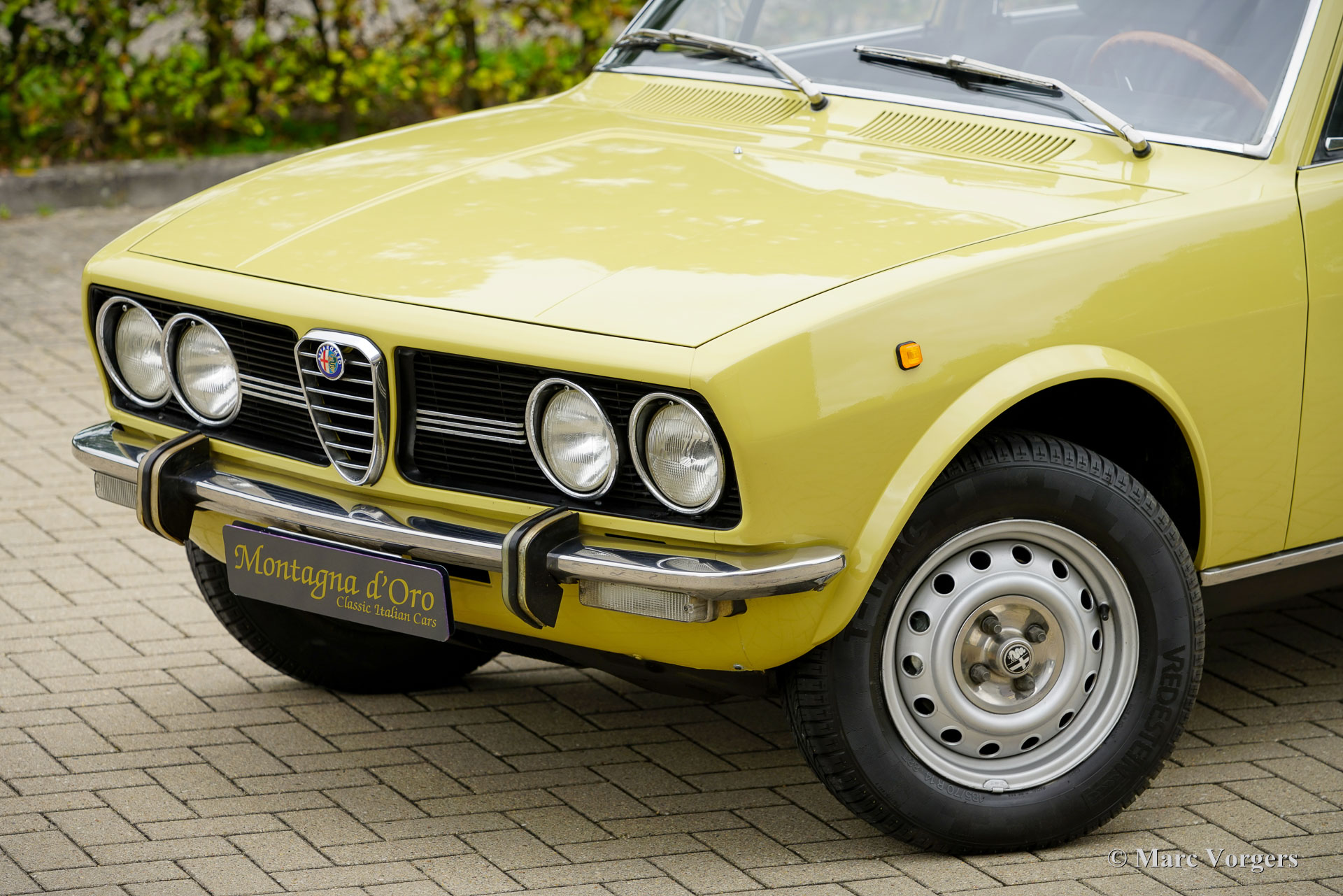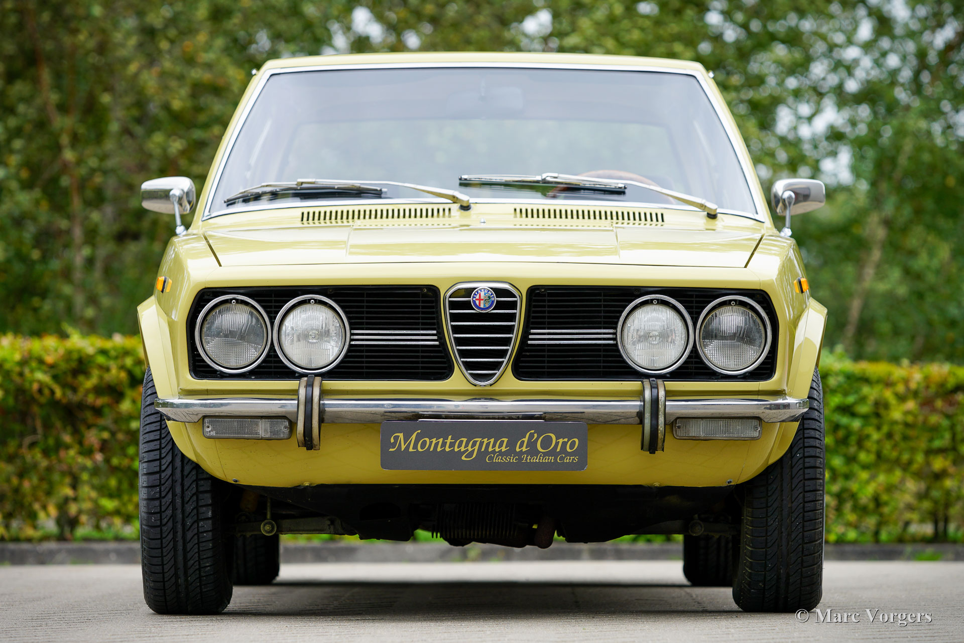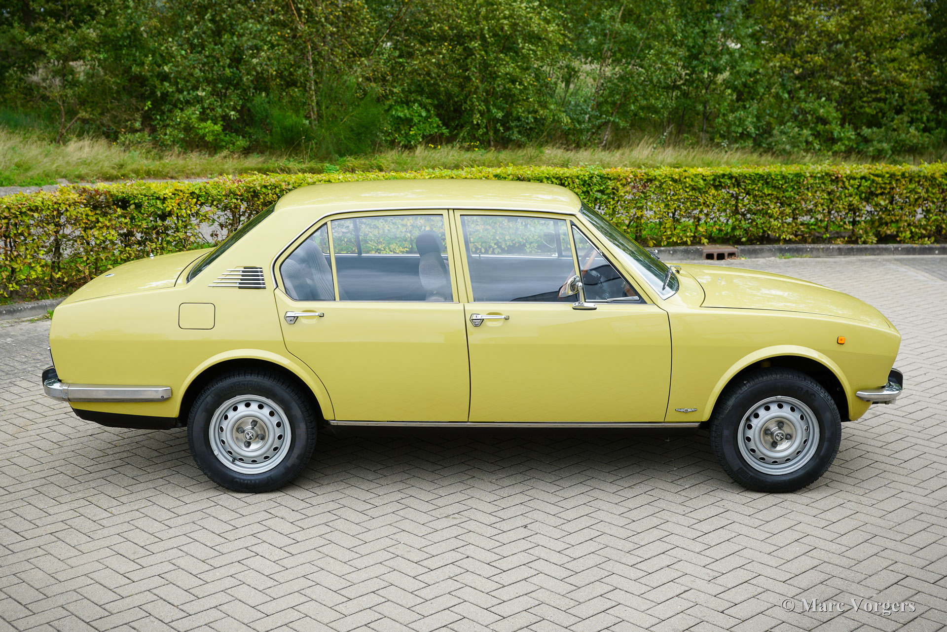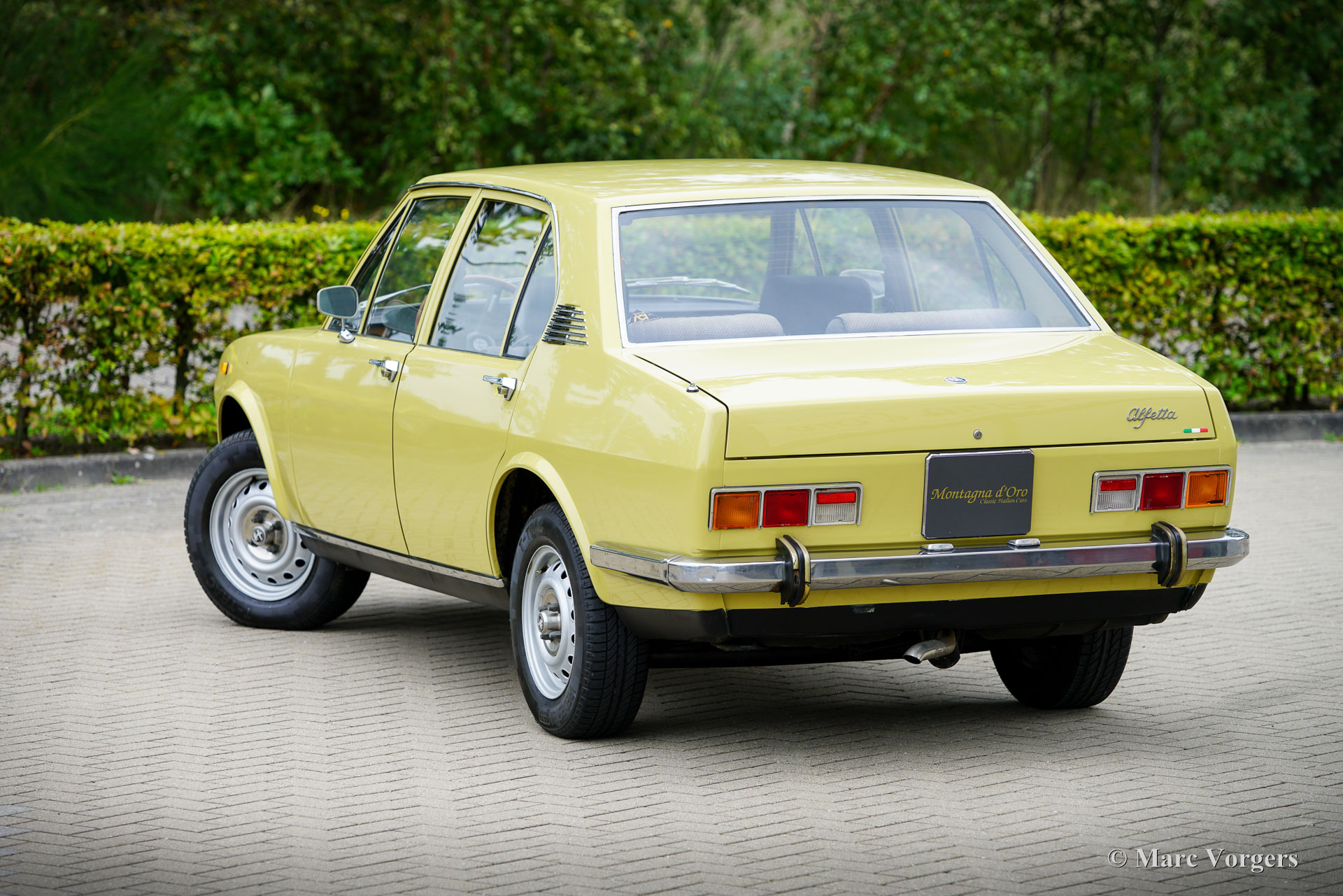 Alfa Romeo Alfetta 1800, jaar 1972. Kleur lichtgeel (Giallo Piper, AR kleurcode AR116) gecombineerd met een blauw stoffen interieur. Deze prachtige Alfetta 1800 is nieuw verkocht in Italië, de auto is in december 2001 in Nederland geïmporteerd. De kilometerteller staat momenteel op 65.679 kilometer. De Alfetta’s uit het begin van de jaren zeventig zijn in onze tijd een zeldzame verschijning. Dit prachtige exemplaar verkeert in een zeer goede conditie. De uitstekende carrosserie is in het verleden voorzien van nieuwe lak in de originele kleur. De auto is door de jaren heen goed onderhouden; service- en reparatiefacturen zijn aanwezig. De Alfa Romeo Alfetta werd geïntroduceerd in 1972. Het was de eerste middelgrote sedan van Alfa Romeo in tien jaar tijd. Alfa Romeo introduceerde de nieuwe achter gemonteerde ‘transaxle’ versnellingsbak/eindaandrijving op de Alfetta, die een vrijwel perfecte 50/50 gewichtsverdeling mogelijk maakte. Samen met de geheel onafhankelijke ophanging, de sportieve en krachtige aluminium ‘twin-cam’ motor, de schijfremmen op alle vier de wielen en de vijfversnellingsbak was/ is de Alfetta een echte sportsedan! Dit fraaie exemplaar geeft de rijervaring zoals de ontwerpers het bedoeld hebben, een prachtige mix van comfort en sportiviteit. Het motorgeluid klinkt als muziek in de oren van de liefhebber. De auto wordt goed gedocumenteerd en compleet geleverd met twee originele sleutelsets.