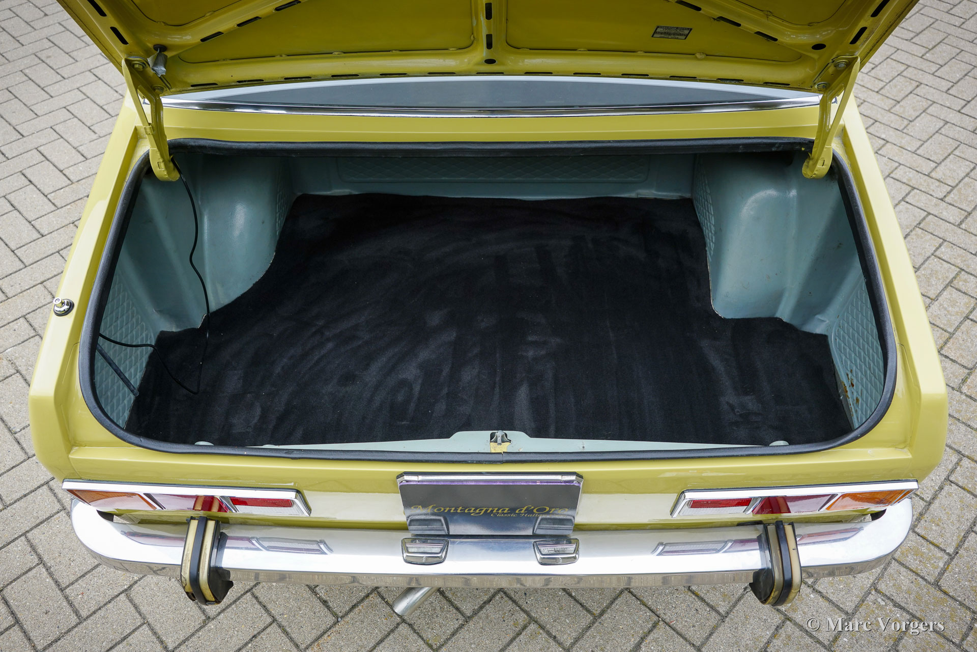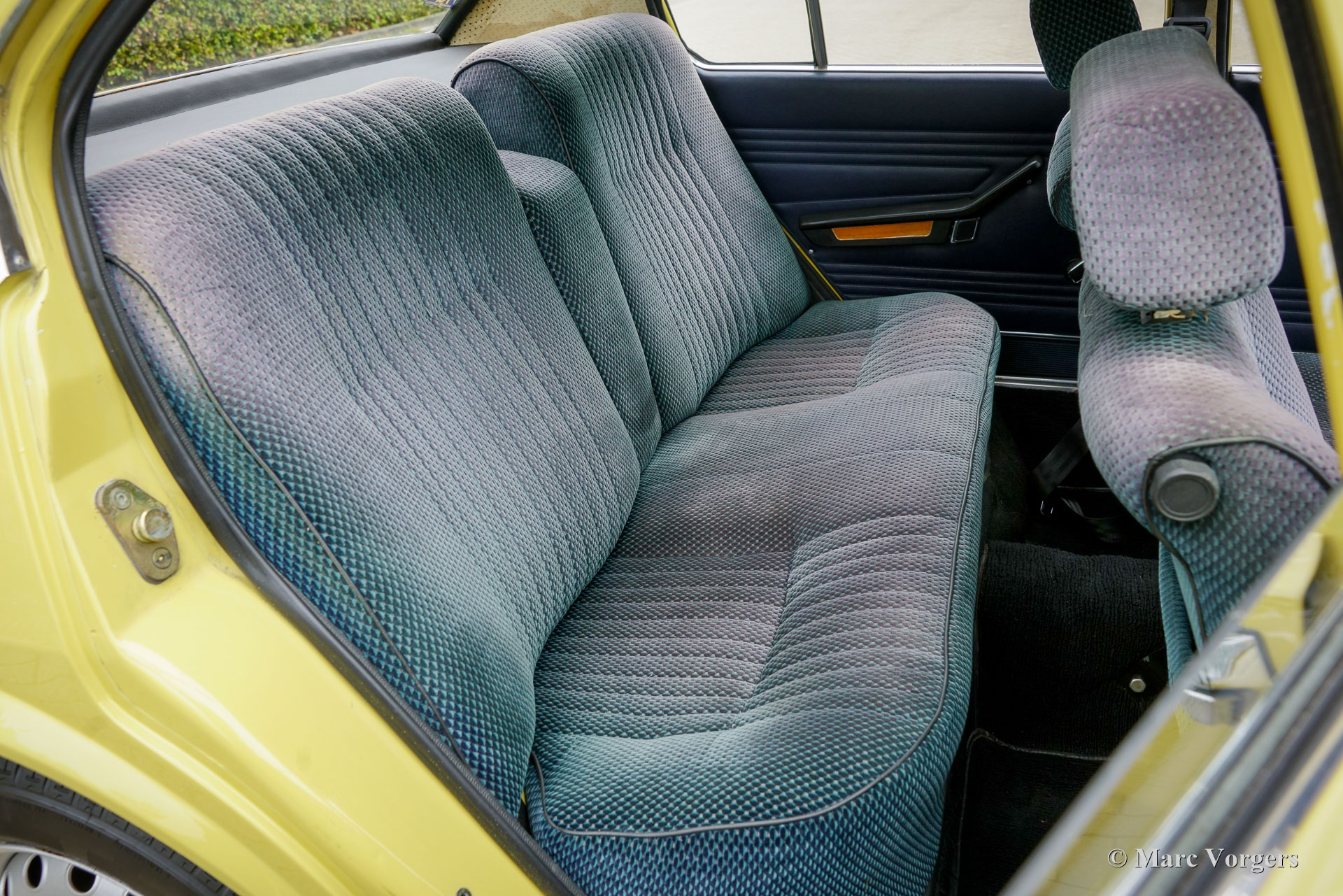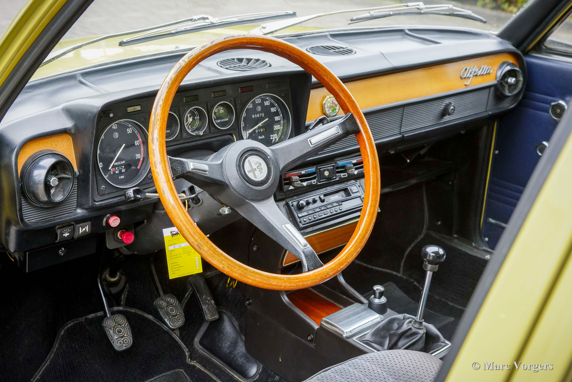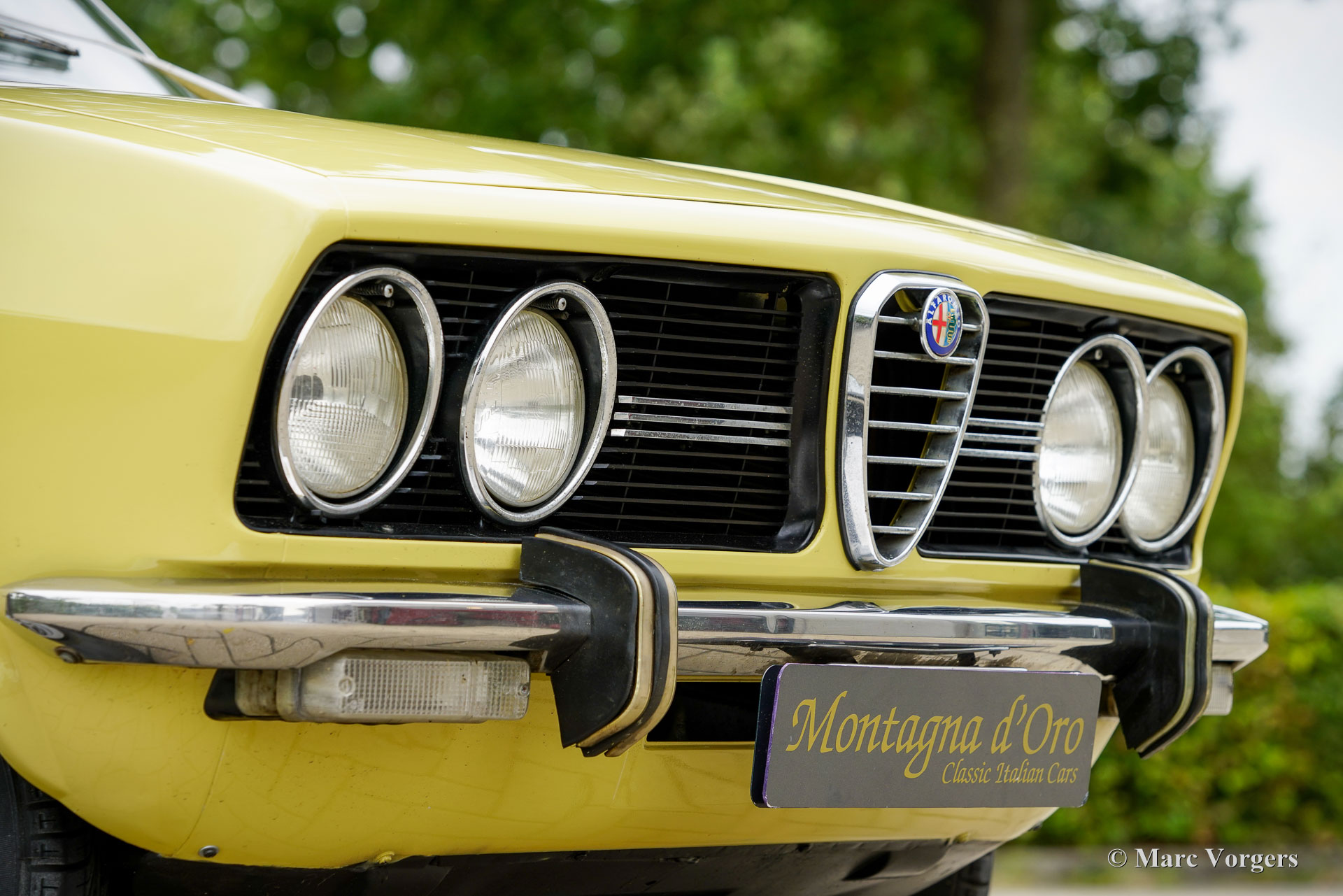Alfa Romeo Alfetta 1800, jaar 1972. Kleur lichtgeel (Giallo Piper, AR kleurcode AR116) gecombineerd met een blauw stoffen interieur. Deze prachtige Alfetta 1800 is nieuw verkocht in Italië, de auto is in december 2001 in Nederland geïmporteerd. De kilometerteller staat momenteel op 65.679 kilometer. De Alfetta’s uit het begin van de jaren zeventig zijn in onze tijd een zeldzame verschijning. Dit prachtige exemplaar verkeert in een zeer goede conditie. De uitstekende carrosserie is in het verleden voorzien van nieuwe lak in de originele kleur. De auto is door de jaren heen goed onderhouden; service- en reparatiefacturen zijn aanwezig. De Alfa Romeo Alfetta werd geïntroduceerd in 1972. Het was de eerste middelgrote sedan van Alfa Romeo in tien jaar tijd. Alfa Romeo introduceerde de nieuwe achter gemonteerde ‘transaxle’ versnellingsbak/eindaandrijving op de Alfetta, die een vrijwel perfecte 50/50 gewichtsverdeling mogelijk maakte. Samen met de geheel onafhankelijke ophanging, de sportieve en krachtige aluminium ‘twin-cam’ motor, de schijfremmen op alle vier de wielen en de vijfversnellingsbak was/ is de Alfetta een echte sportsedan! Dit fraaie exemplaar geeft de rijervaring zoals de ontwerpers het bedoeld hebben, een prachtige mix van comfort en sportiviteit. Het motorgeluid klinkt als muziek in de oren van de liefhebber. De auto wordt goed gedocumenteerd en compleet geleverd met twee originele sleutelsets.