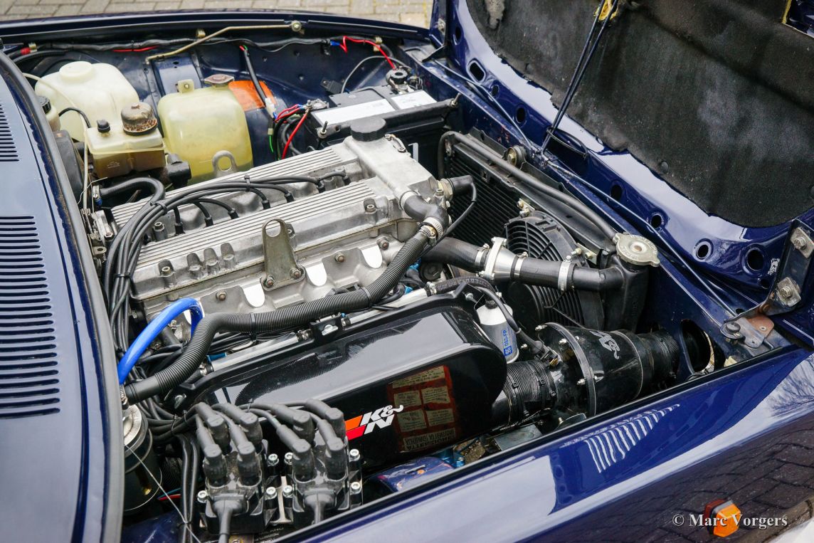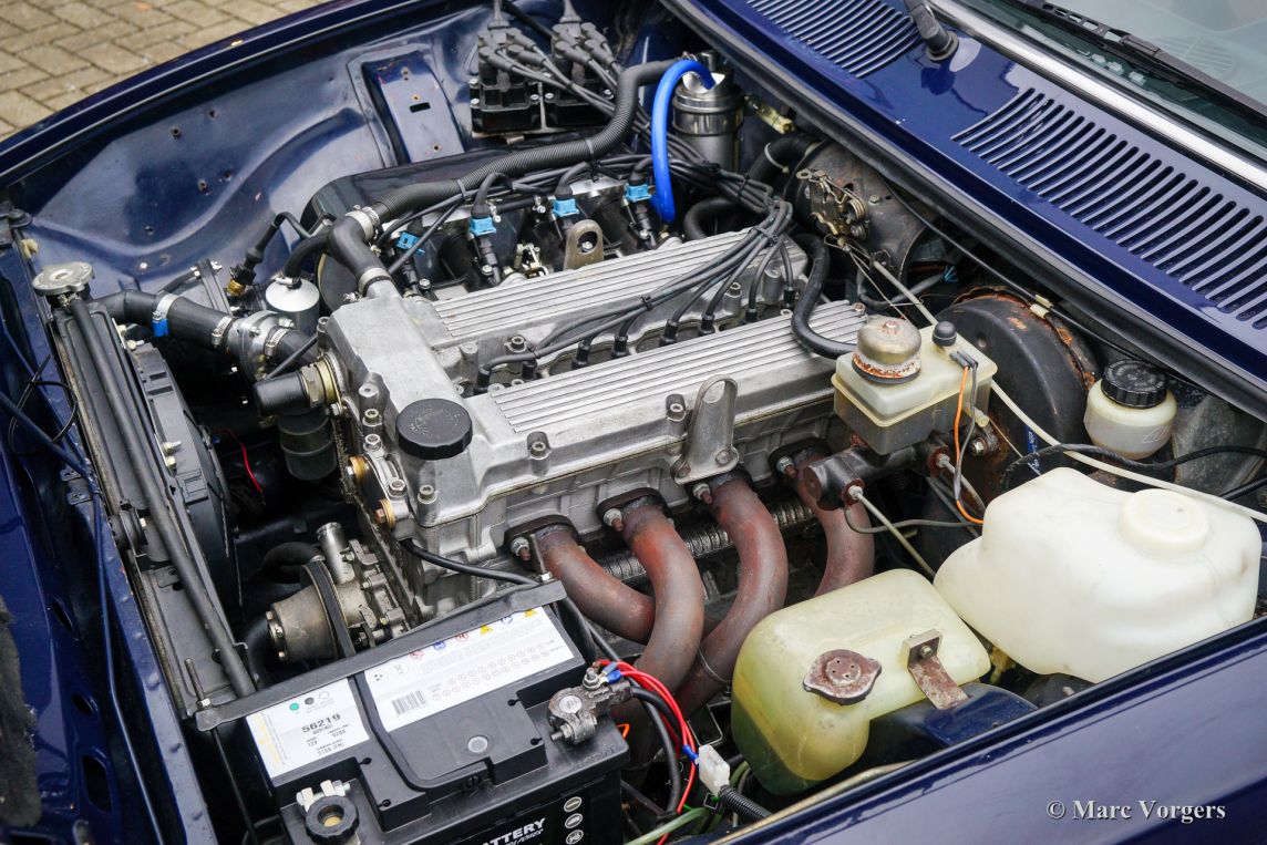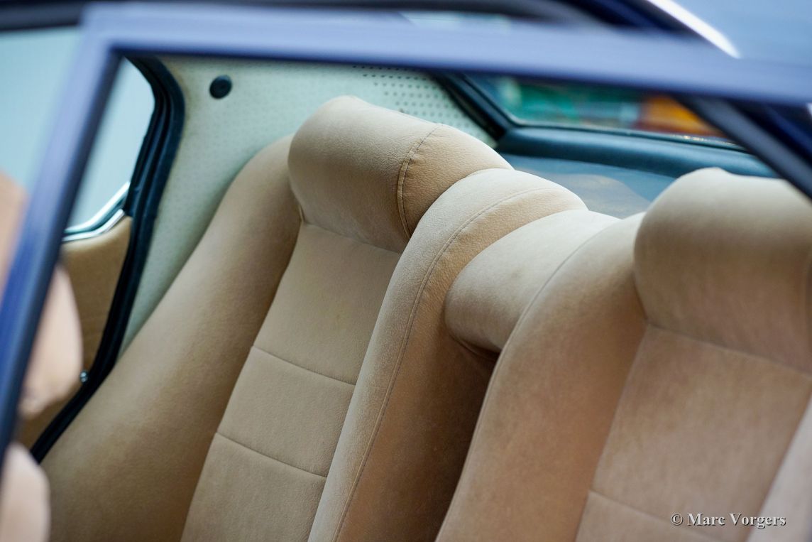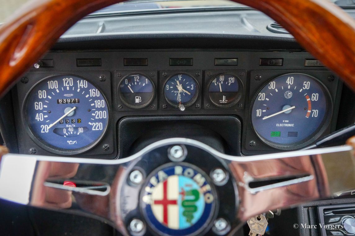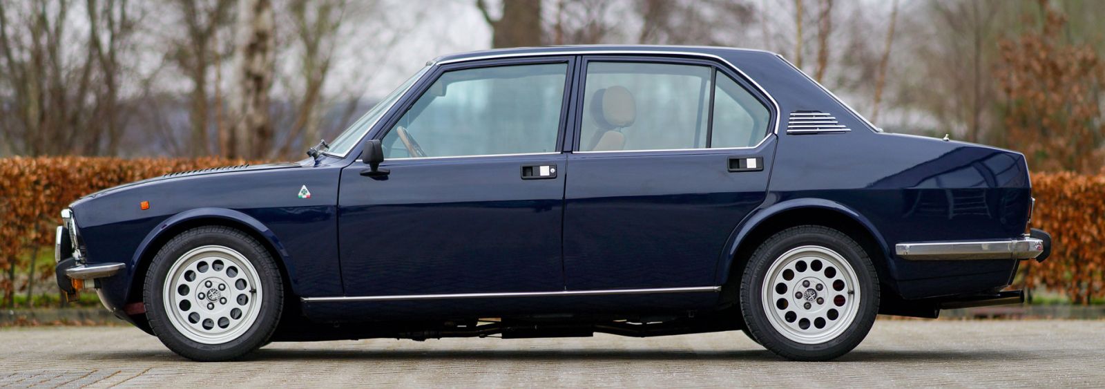 Alfa Romeo Alfetta Twin Spark, jaar 1980. Kleur donkerblauw ‘Blu Olandese’ (AR343) gecombineerd met een beige stoffen Recaro interieur en zwart tapijt. Deze prachtige Alfa Romeo Alfetta werd in het jaar 2004 in Nederland geïmporteerd. De Alfetta heeft de afgelopen jaren een carrosserierestauratie ondergaan waarbij veel nieuwe originele plaatwerkdelen zijn gebruikt (alle vier portieren en het linker voorspatbord). Daarna is de auto prachtig gespoten in de originele kleur. Het interieur is uitgerust met speciale Alfa 75 ‘Numerata’ Recaro-stoelen, en de achterbank en de deurpanelen zijn voorzien van nieuwe bekleding. Ook werd de auto uitgebreid geüpgraded en mechanisch gereviseerd, de Alfetta 1.8 Twin Spark is nu een indrukwekkend snelle 2.0 Twin Spark met 180 pk en 202 Nm koppel! Hieronder vindt u een lijst met alle speciale upgrades. Deze fraaie en zeer sportieve Alfetta Twin Spark verkeert in een zeer goede tot uitstekende conditie en de auto rijdt zeer sportief! De kilometerstand is 63.972 kilometer, de nieuw gereviseerde motor, versnellingsbak en aandrijflijn hebben 6000 kilometer gereden. Deze Alfa Romeo Alfetta is een geweldige sportieve rijmachine voor op de weg of op het circuit!