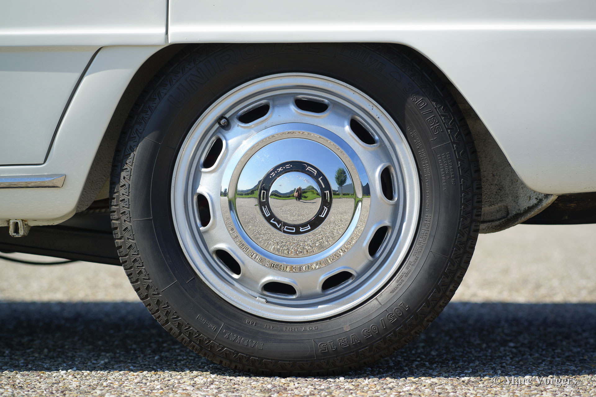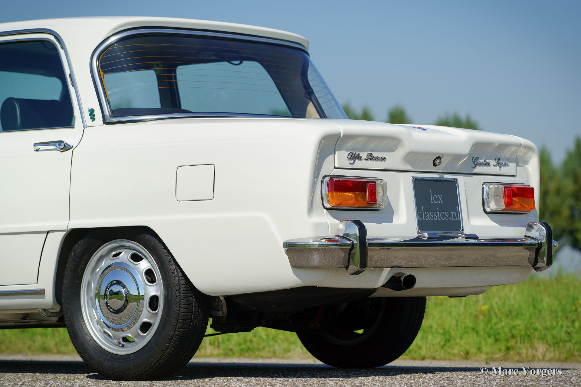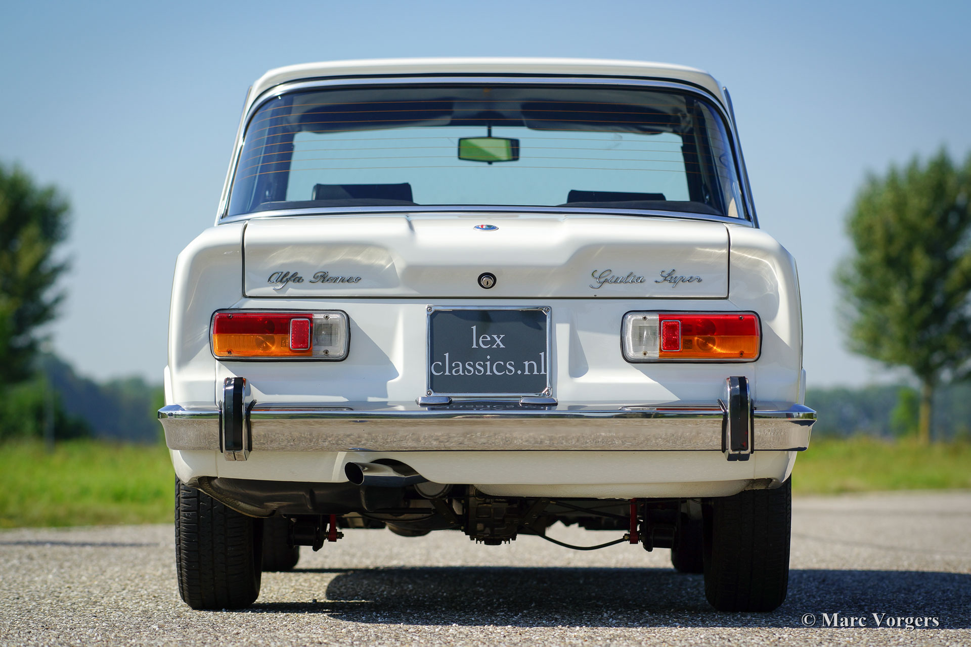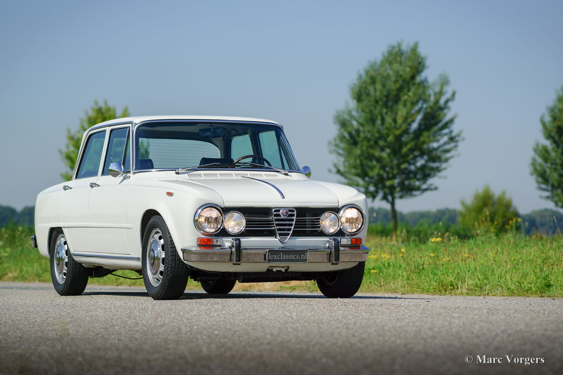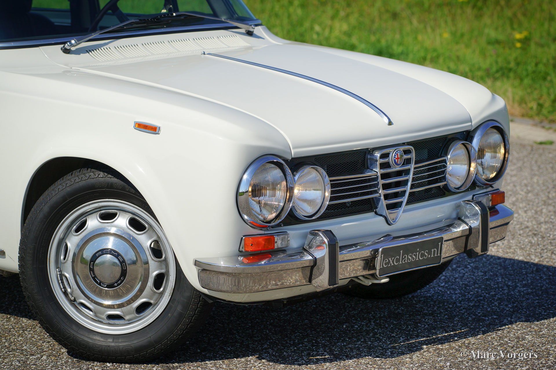 Alfa Romeo Giulia 1600 Super, jaar 1971. Kleur wit (Bianco Spino) met een zwart interieur en zwart tapijt. Deze fantastische Alfa Romeo Giulia werd in het verleden prachtig gerestaureerd door een Duitse specialist. Daarbij werd de auto uitgerust met een krachtigere twee liter Giulia motor. Er zijn enkele foto’s van de restauratie bij de auto aanwezig. Deze Giulia Super verkeert in sublieme topstaat, de carrosserie toont fraaie passingen, de lak is perfect, het interieur is als nieuw en onder de motorkap is alles zeer verzorgd. De twee liter motor geeft de auto vleugels; deze Giulia rijdt subliem! De auto is uitgerust met een hout-omrand stuurwiel en een prachtige Becker Europa radio. Een pracht-exemplaar!