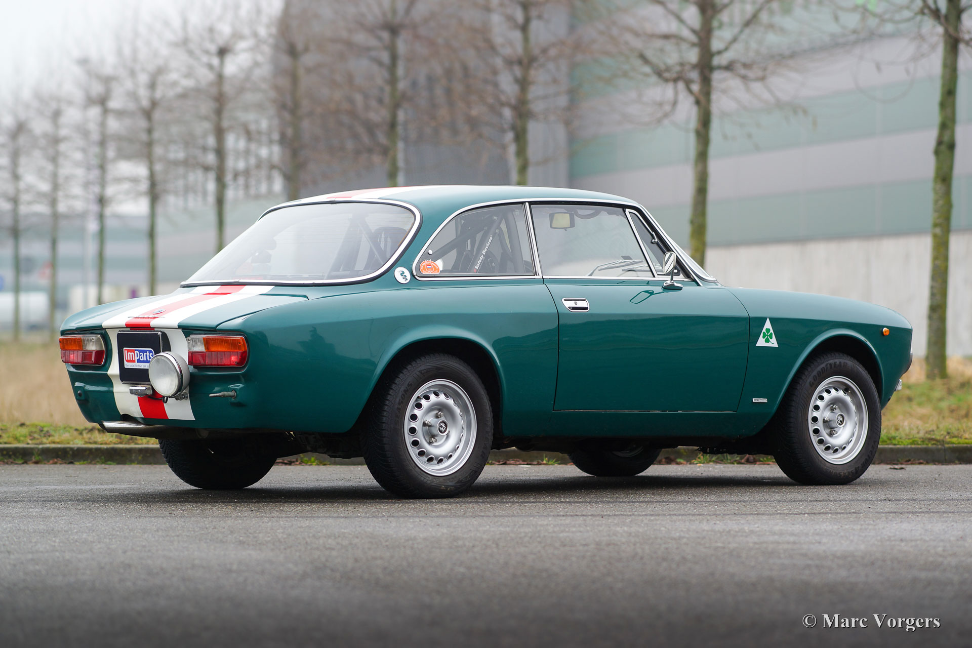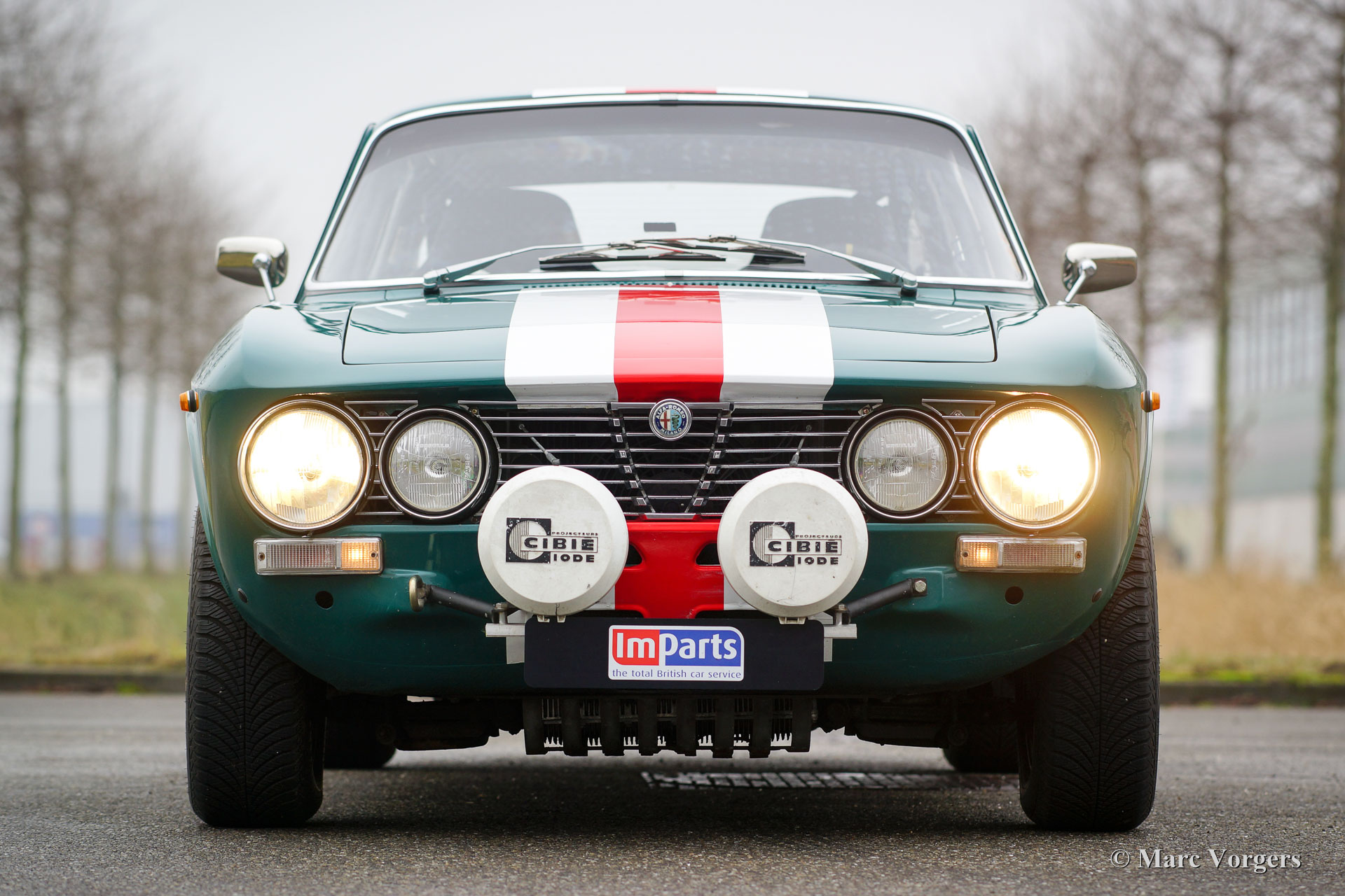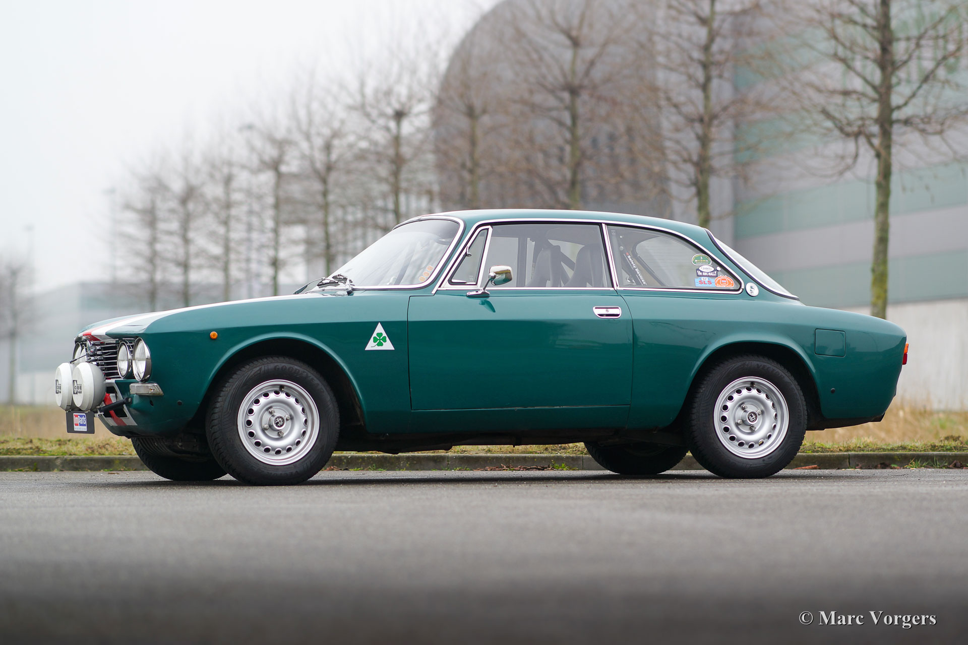 Alfa Romeo Giulia 2000 GTV rallyauto, jaar 1971. Kleur groen (Pine Green/ Pino Verde) met een zwart rally interieur. Deze fraaie Alfa Romeo ‘Bertone’ werd in het jaar 2009 in Nederland geregistreerd. Aansluitend werd de auto geprepareerd voor deelname aan historische rally evenementen waarvoor de auto uitermate geschikt is. De Alfa Romeo Giulia modellen uit de jaren 1960 en 1970 waren technisch al zeer geavanceerd; de auto’s beschikten over een aluminium motorblok met bovenliggende nokkenassen (DOHC), twee dubbele carburateurs, standaard vijfversnellingsbak en schijfremmen rondom. De 2000 GTV was zelfs uitgerust met een sperdifferentieel waardoor de 150 SAE-pk’s effectief op de weg overgebracht konden worden. Deze Alfa Romeo is uitgebreid rally geprepareerd. Deze echte rijdersauto verkeert in zeer goede en fraaie staat. Hierbij moet opgemerkt worden dat er aan de carrosserie een paar kleine roestplekjes aanwezig zijn (onderaan het linker portier en aan de rechter C-stijl).