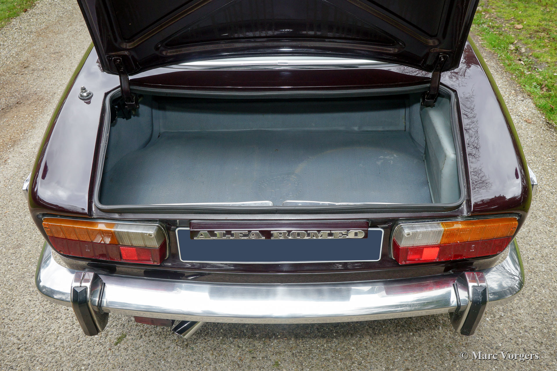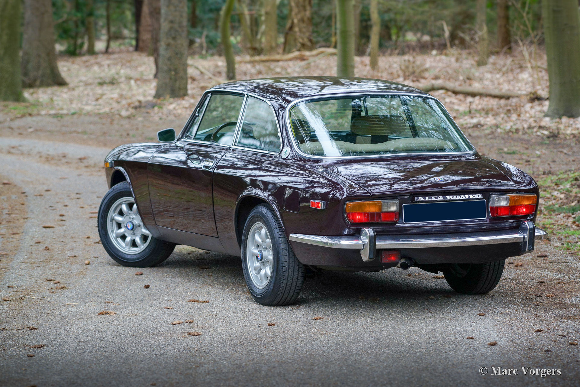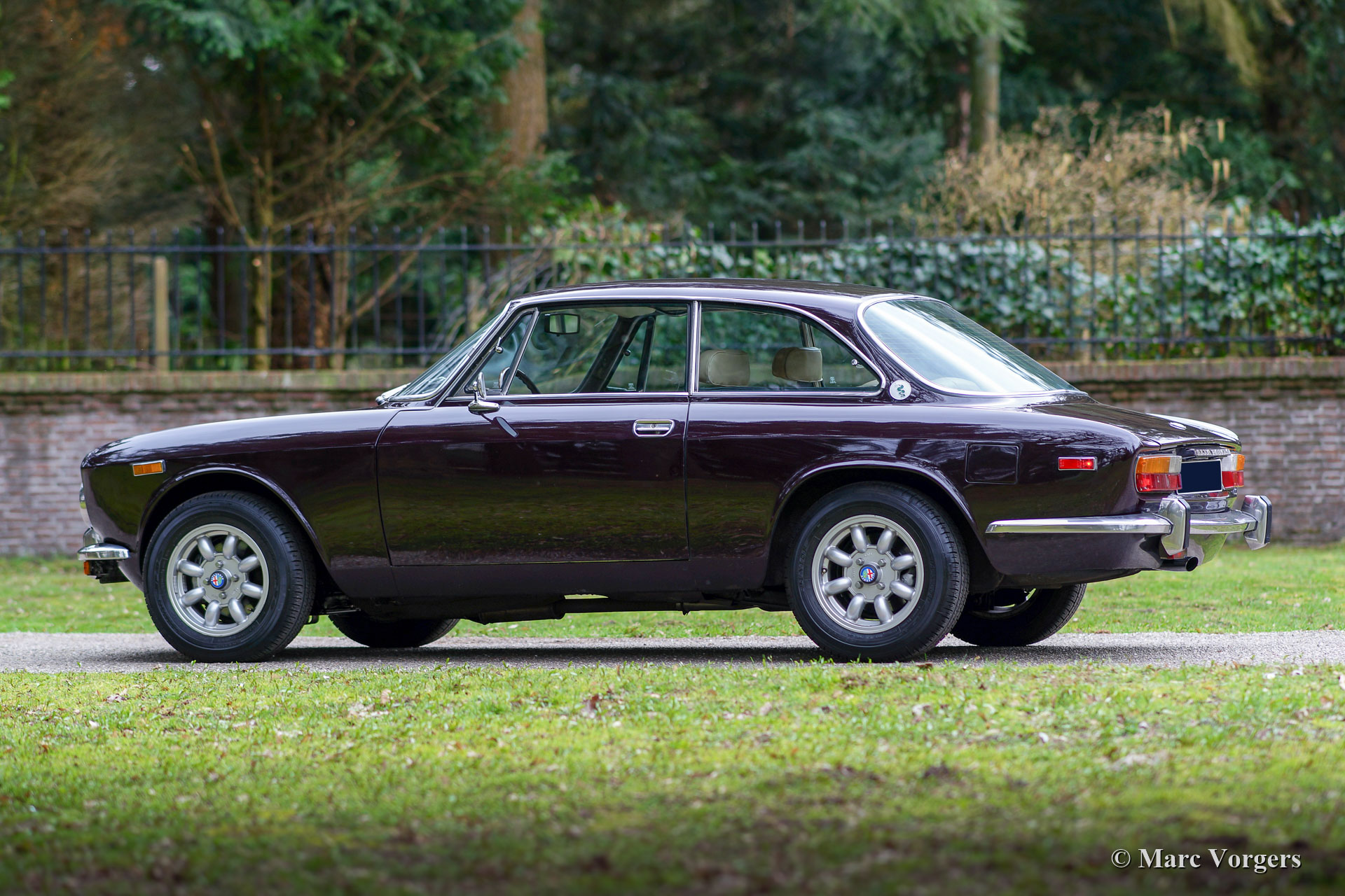 Alfa Romeo Giulia 2000 GTV, jaar 1975. Kleur Faggio (zeer donkerrood/ bruin) gecombineerd met een beige kunstleren interieur en zwart tapijt. Deze prachtige Alfa Romeo 'Bertone' werd nieuw verkocht aan een Duitse militair in Hamburg. Deze voor de Amerikaanse markt bedoelde Giulia GTV 2000 in US-uitvoering werd nimmer naar de VS geëxporteerd. De auto werd uitgerust met twee dubbele Dell'Orto-carburateurs in plaats van de Spica-benzine-injectie voor de Amerikaanse markt.