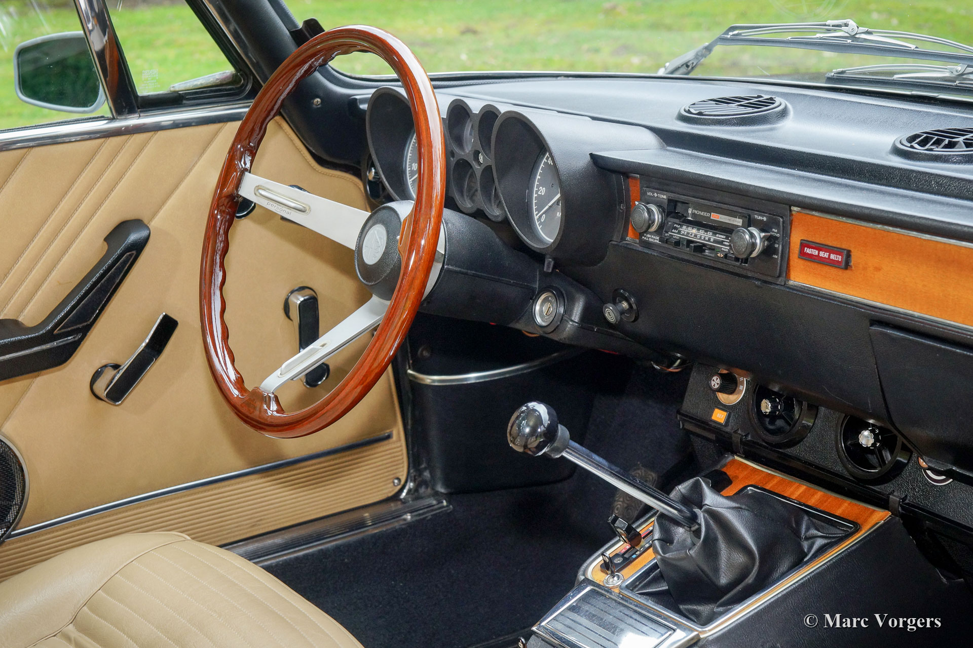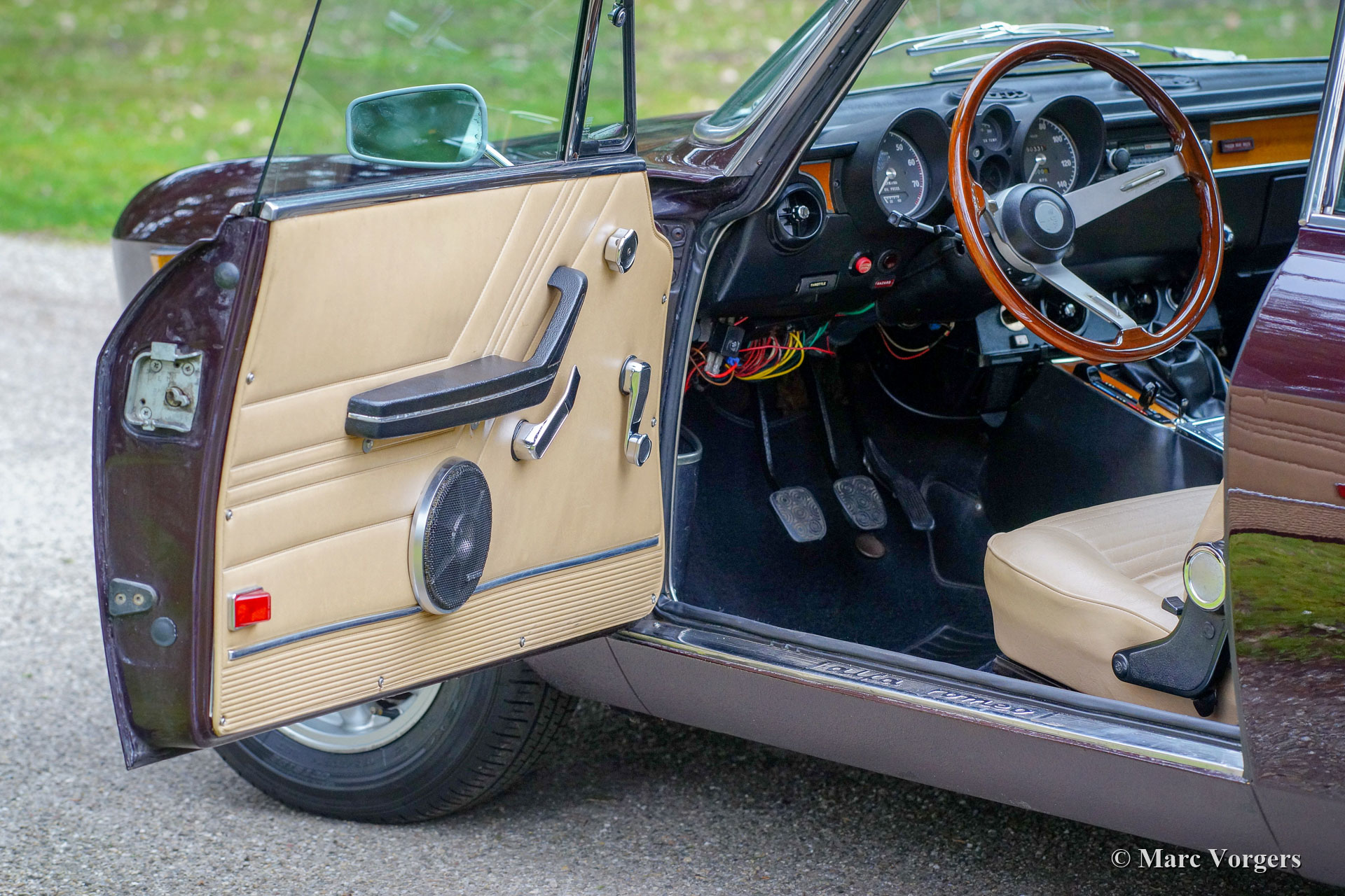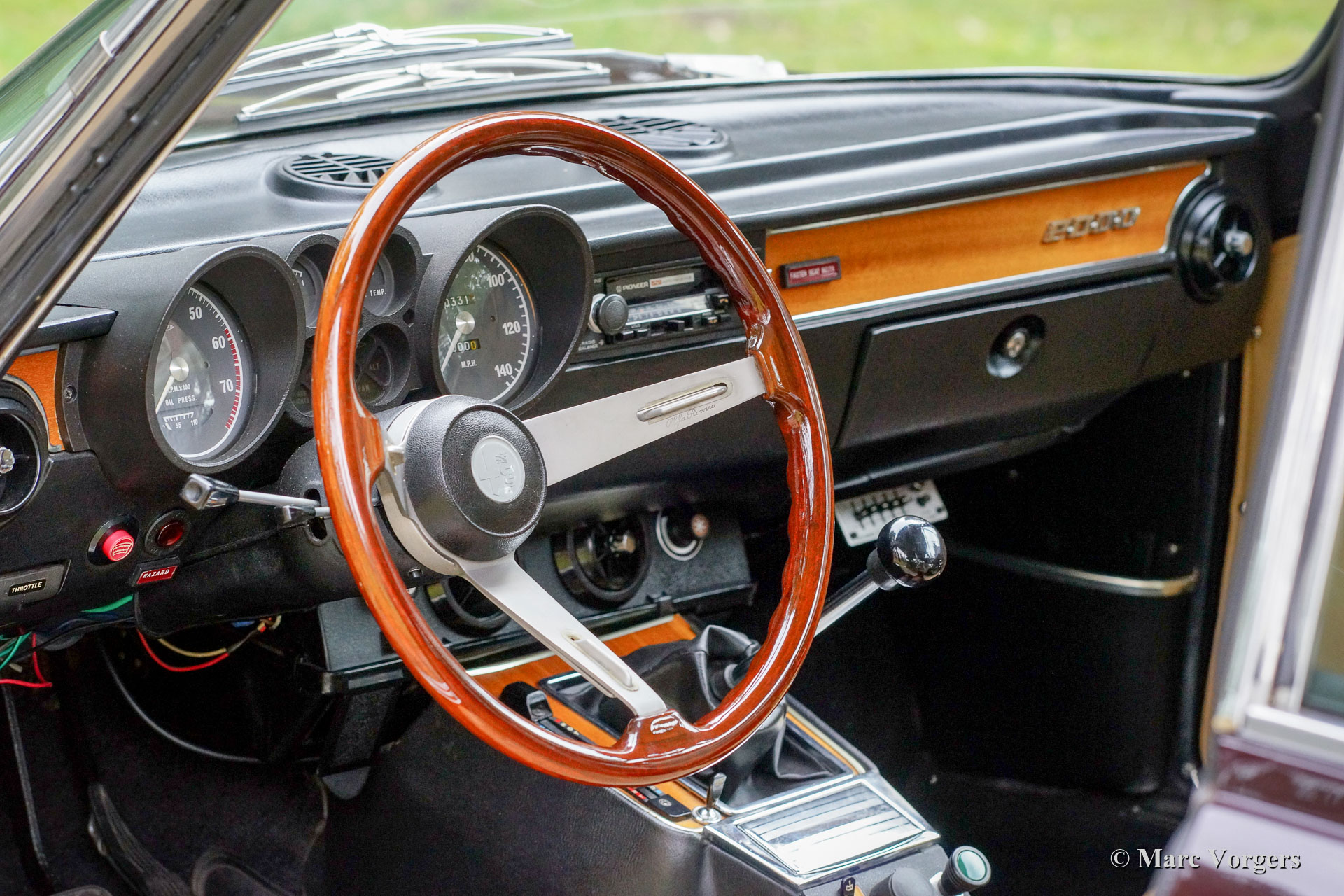 Alfa Romeo Giulia 2000 GTV, jaar 1975. Kleur Faggio (zeer donkerrood/ bruin) gecombineerd met een beige kunstleren interieur en zwart tapijt. Deze prachtige Alfa Romeo 'Bertone' werd nieuw verkocht aan een Duitse militair in Hamburg. Deze voor de Amerikaanse markt bedoelde Giulia GTV 2000 in US-uitvoering werd nimmer naar de VS geëxporteerd. De auto werd uitgerust met twee dubbele Dell'Orto-carburateurs in plaats van de Spica-benzine-injectie voor de Amerikaanse markt.