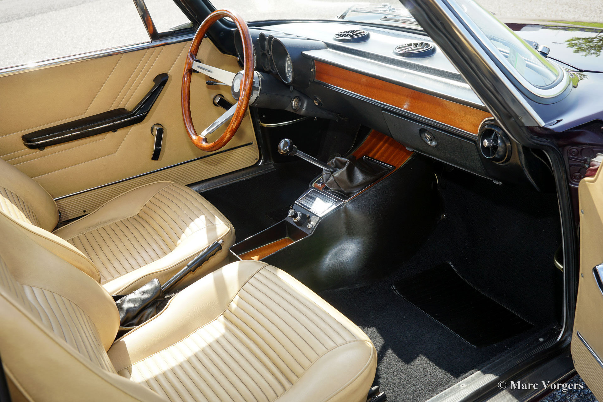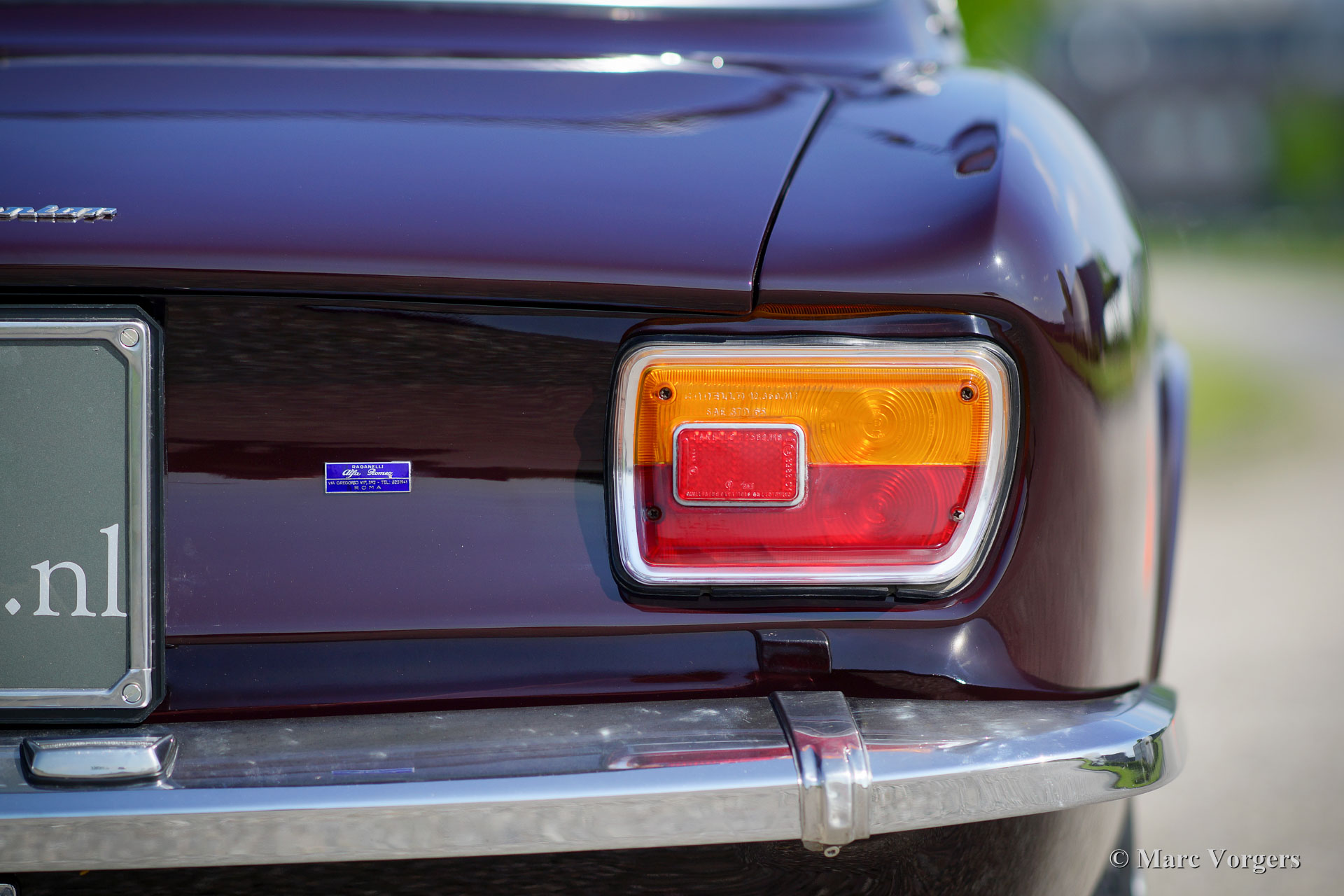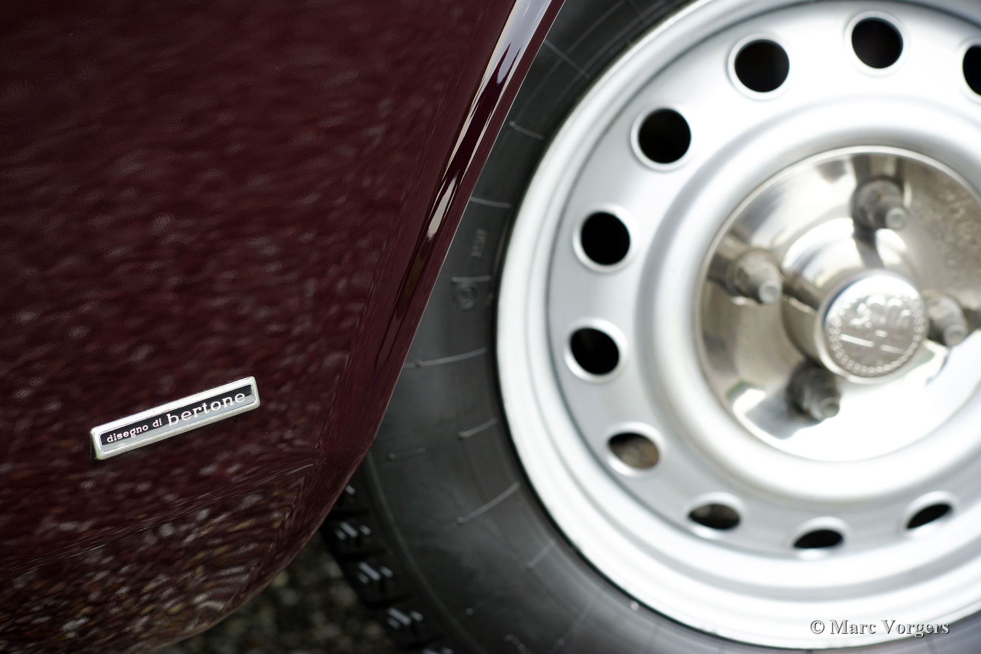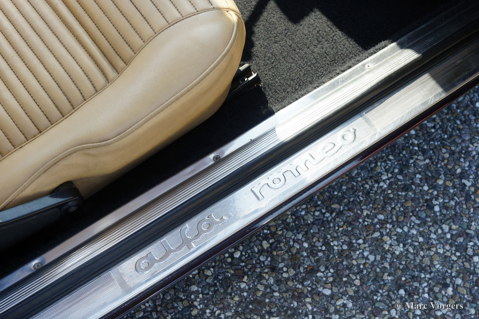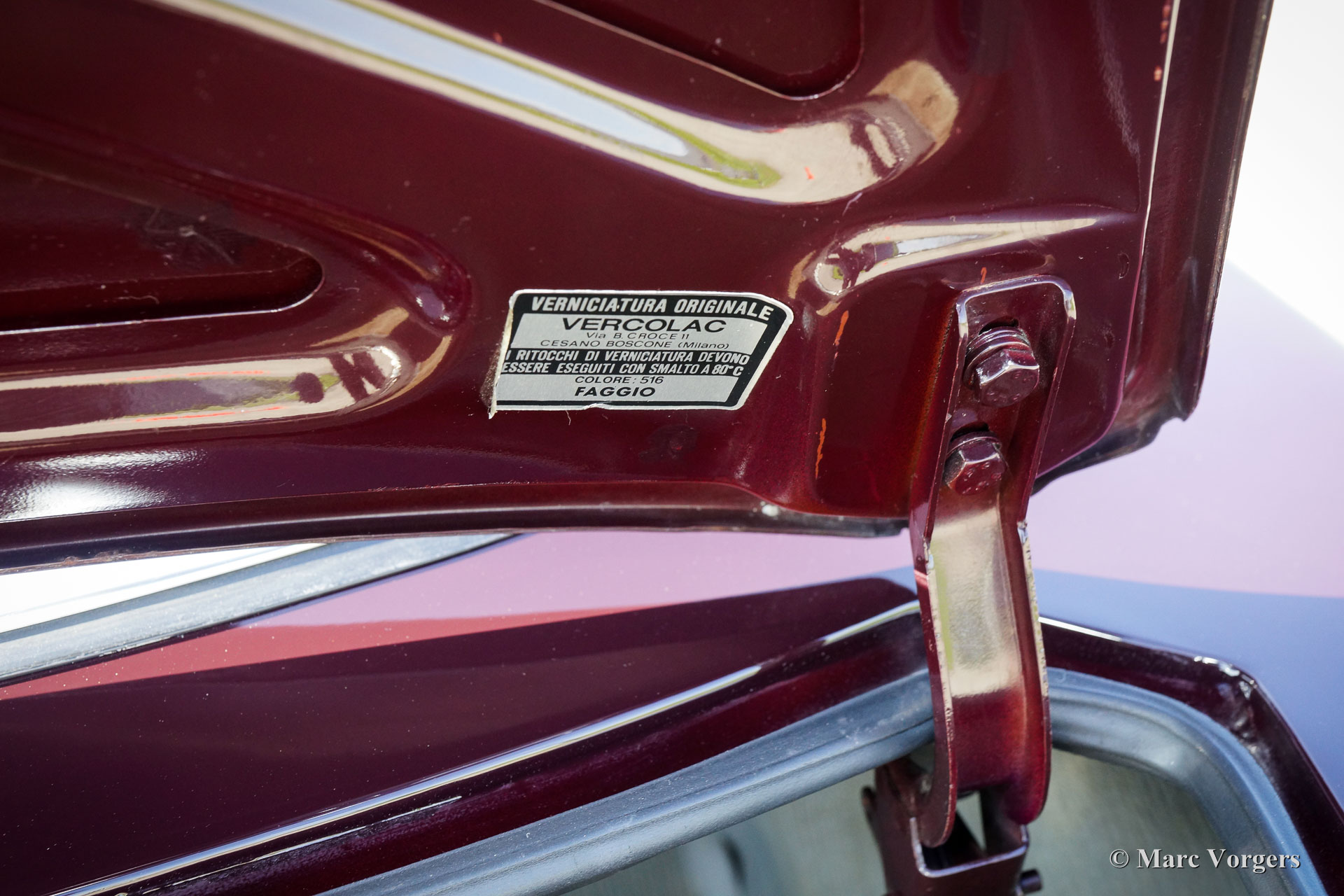 Alfa Romeo Giulia GT 1300 Junior ‘Lusso’, jaar 1975. Kleur ‘Faggio’ (donker bordeauxrood, Alfa kleurcode AR 516) met een beige kunstleren interieur en zwart tapijt. Deze beeldschone Alfa Romeo GT 1300 Junior, door liefhebbers ook vaak ‘Bertone’ genoemd, werd op 20 februari 1975 nieuw afgeleverd in Rome, Italië. Deze Alfa Romeo verkeert in sublieme originele staat, de auto heeft vanaf nieuw slechts 75.600 kilometer gereden. De auto werd slechts eenmaal nieuw gespoten in de originele kleur en alle originele details zijn aanwezig. Er is zelfs nooit een radio ingebouwd geweest! De auto is compleet met het originele boordgereedschap en de fabriek-originele stickers in motorruimte en kofferbak zijn aanwezig. Het laatste uitlaatgedeelte is vervangen door een zogenaamde ‘brulpijp’ waardoor het motorgeluid dieper is geworden. Het betreft de voorlaatste zogenaamde ‘Lusso’ (luxe) uitvoering van de Giulia GT 1300 Junior. Dit type heeft het interieur, de geluidsisolatie en de grille van topmodel Giulia 2000 GTV maar nog de kleine achterlichten van de voorganger. Dit soort super originele, en nooit gerestaureerde, klassiekers van topkwaliteit zijn het hoogst haalbare voor de echte liefhebber en verzamelaar. Zelfs een topklasse restauratie benadert nooit de charme van fabrieksoriginaliteit die door de jaren gerijpt is.