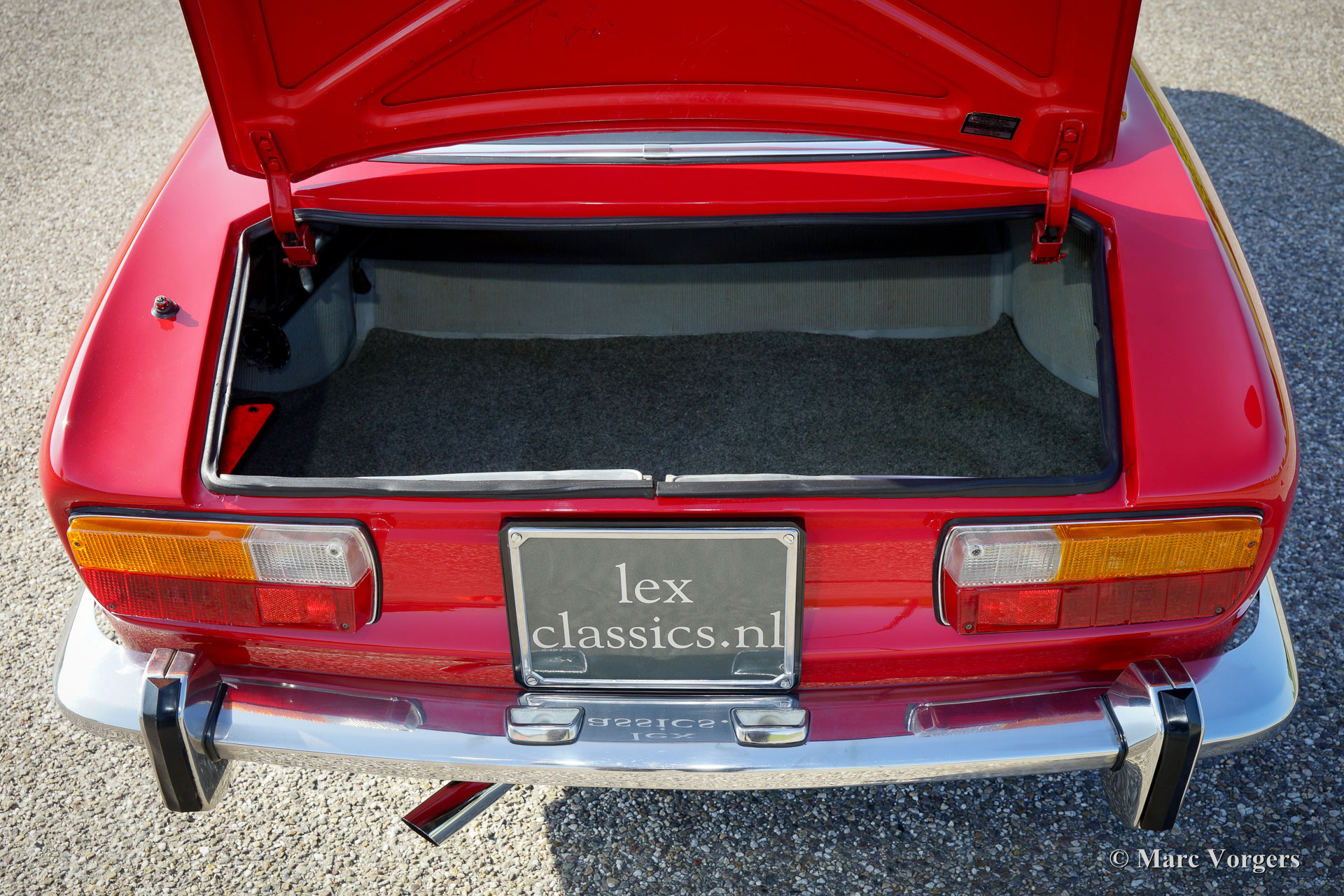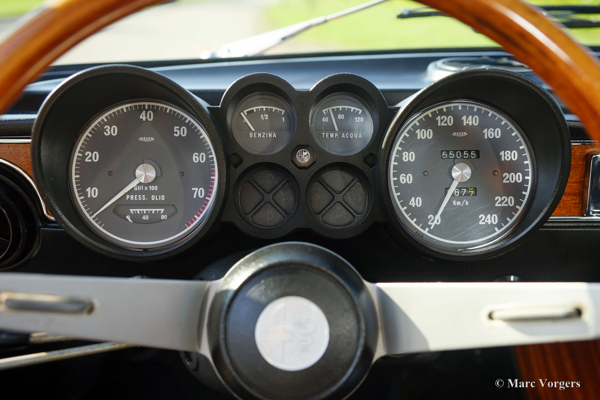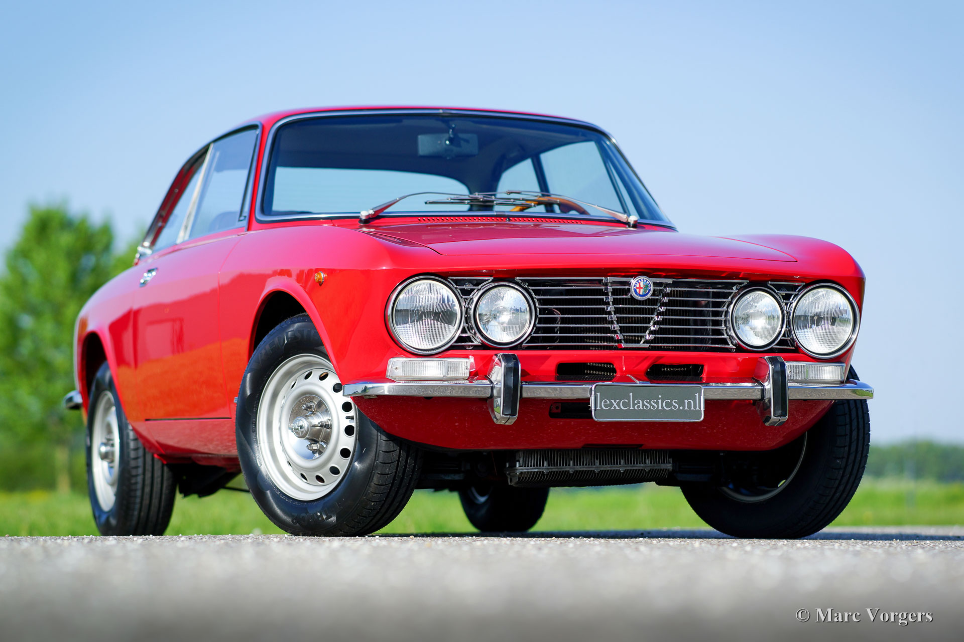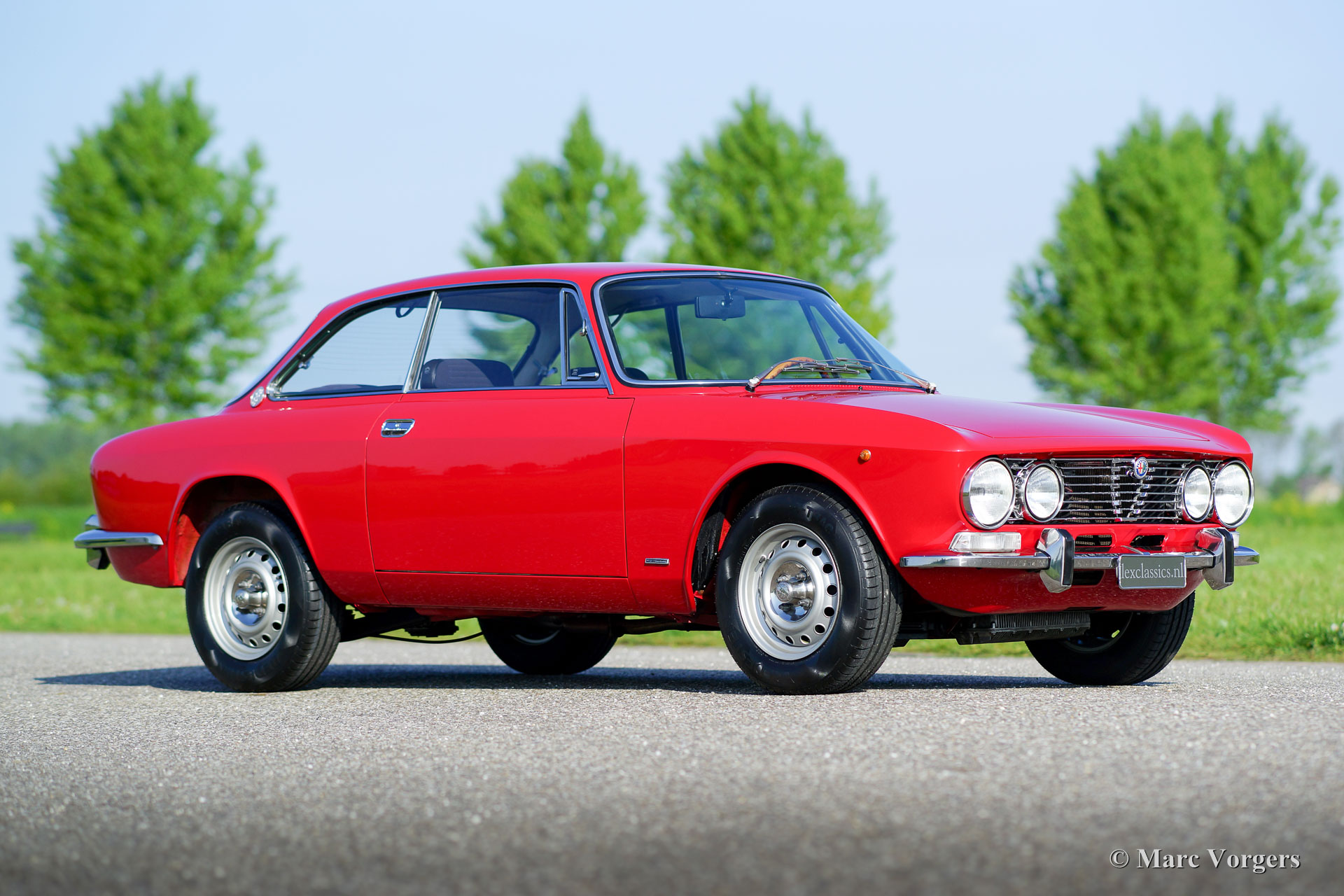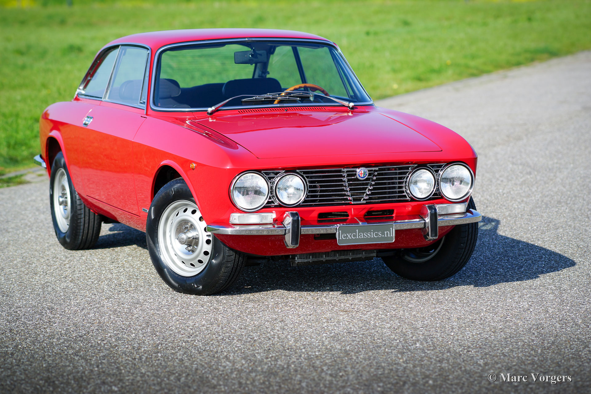 Alfa Romeo Giulia GT 1300 Junior ‘Lusso’, jaar 1975. Chassisnummer AR10530*0001302. Kleur rood (Alfa Rosso 501) met een zwart/donkergrijs kunstleren interieur met stoffen zitvlakken en zwart tapijt. Deze fantastische Alfa Romeo Giulia GT 1300 Junior (door liefhebbers vaak ‘Bertone’ genoemd) is afkomstig van de eerste Italiaanse eigenaar! Deze super originele Alfa Romeo werd recent in Nederland ingevoerd, de auto heeft vanaf nieuw slechts 55.055 km gereden! De auto verkeert in sublieme originele topstaat (concours)! Aan de auto werd nimmer gelast en niets gerestaureerd, de carrosserie werd enkel voorzien van perfecte nieuwe lak. Deze magnifieke ‘Bertone’ toont alle originele details, het boordgereedschap is aanwezig evenals de originele boekjes! De auto is voorzien van een prachtige originele en tijd-correcte Grundig radio. Het betreft het laatste ‘Lusso’ (luxe) model van de Giulia GT 1300 Junior. Dit type deelt, op de mechaniek na, alle uiterlijke kenmerken van het topmodel Giulia GTV 2000. Zoals: het interieur, de geluidsisolatie, grille, achterlichten en bumperrozetten. Dit soort super originele, en nooit gerestaureerde, klassiekers van topkwaliteit zijn het hoogst haalbare voor de echte liefhebber en verzamelaar. Zelfs een topklasse restauratie benadert nooit de charme van fabrieksoriginaliteit die door de jaren gerijpt is.