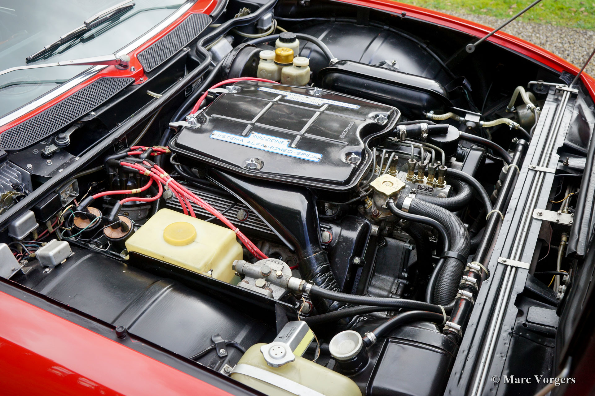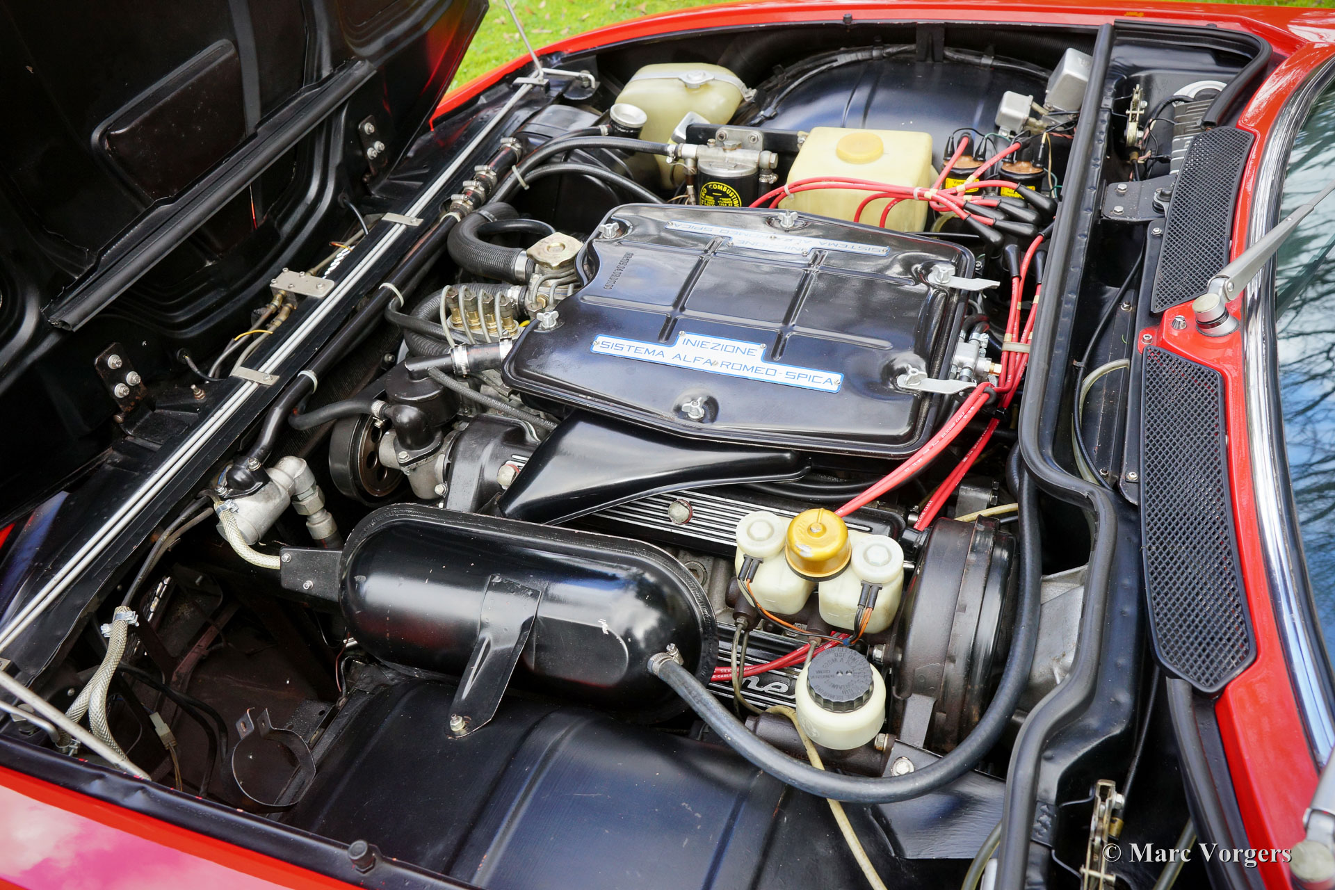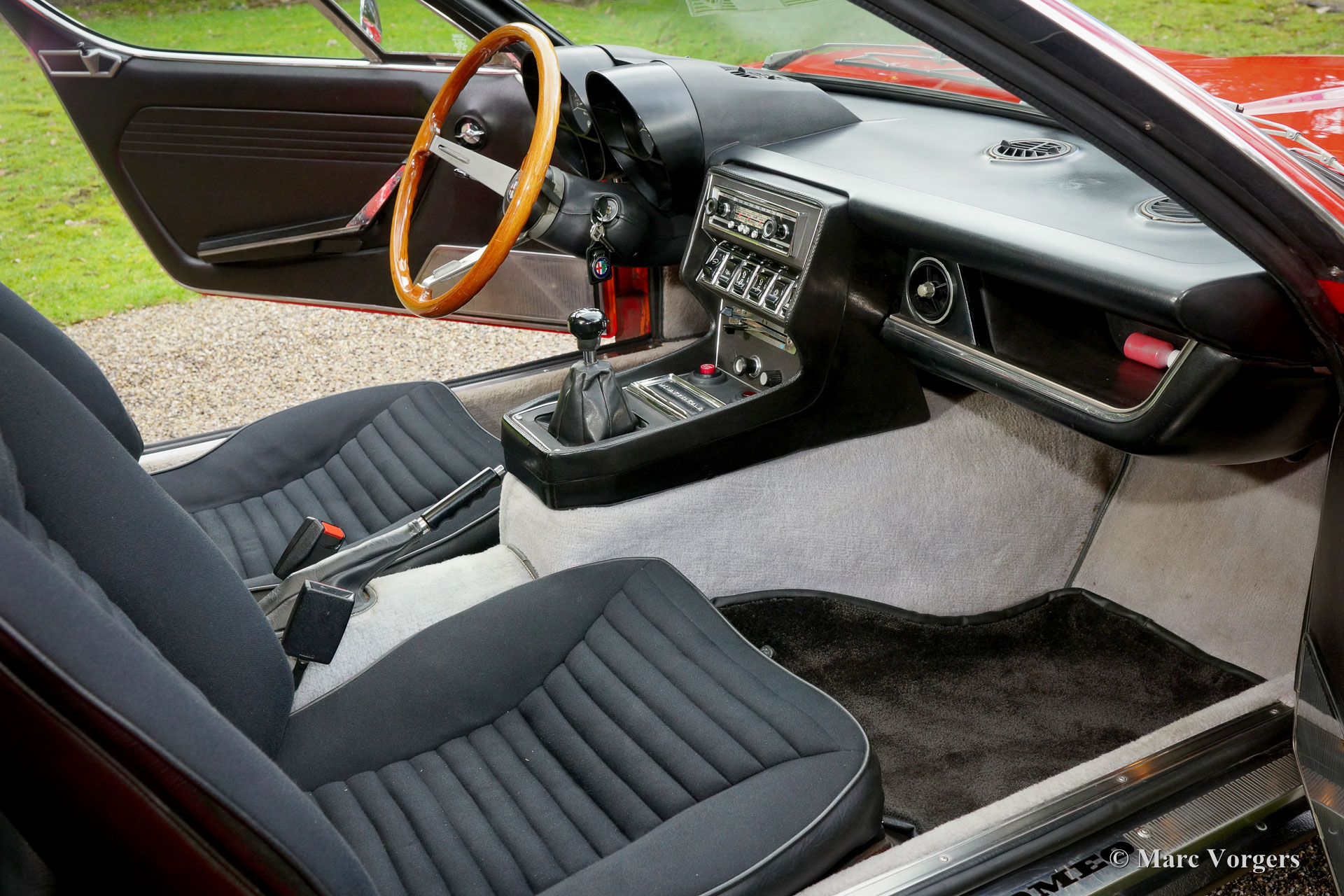 Alfa Romeo Montreal, jaar 1972. Kleur rood met een zwart interieur. Lichtgrijs tapijt en zwarte matten. Deze geweldige Alfa Romeo Montreal verkeert in zeer originele en in zeer goede staat! De eerste eigenaar ontving de auto met oranje lak, een latere eigenaar besloot de perfecte carrosserie van rode lak te laten voorzien. Deze prachtige Alfa Romeo Montreal toont fraaie originele details in het zeer gave originele interieur en in de smetteloze motorruimte. De auto is sinds het jaar 2013 in het bezit van de huidige eigenaar. Deze heeft de auto steeds verder laten perfectioneren. De uit de racerij afkomstige V8 motor (Alfa ‘33’) loopt als een droom; de Spica injectie is afgesteld door de NL-specialist Birnie. Tevens is er een uitdraai van de firma Speedcentre waarop het motorvermogen en het koppel staan vermeld. Een zeer originele en uitstekend rijdende Alfa Romeo Montreal in een geweldige conditie!