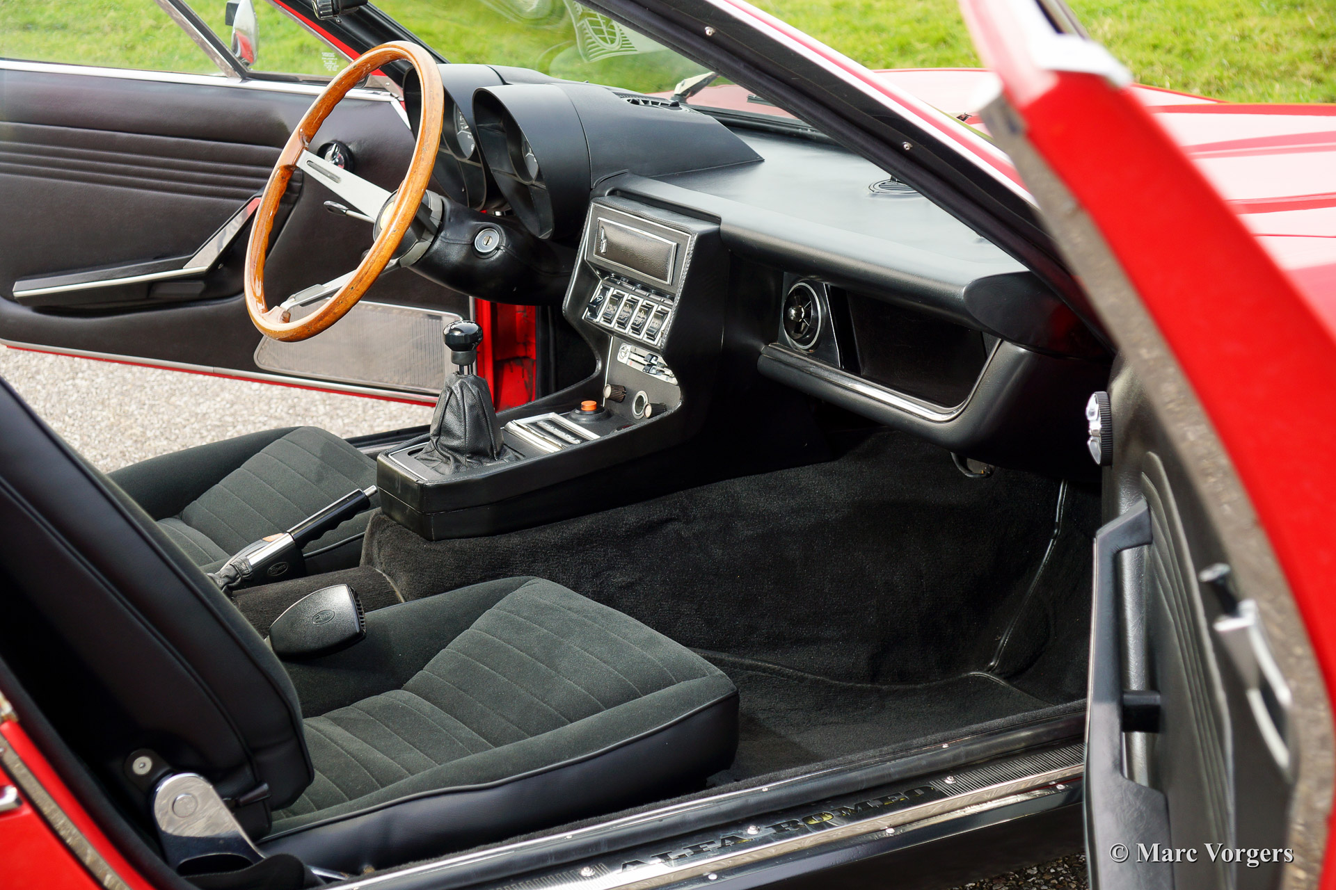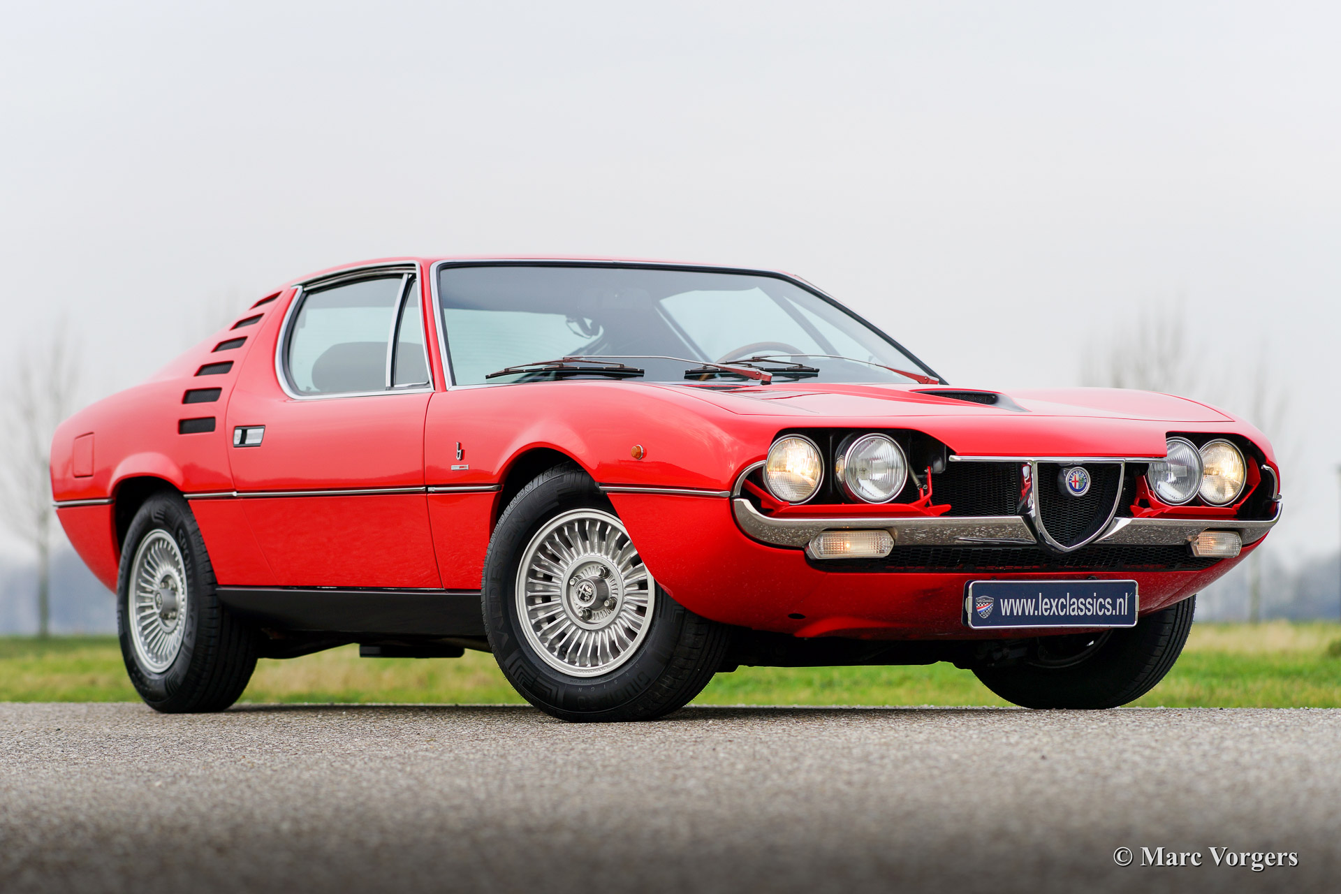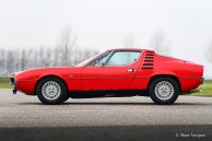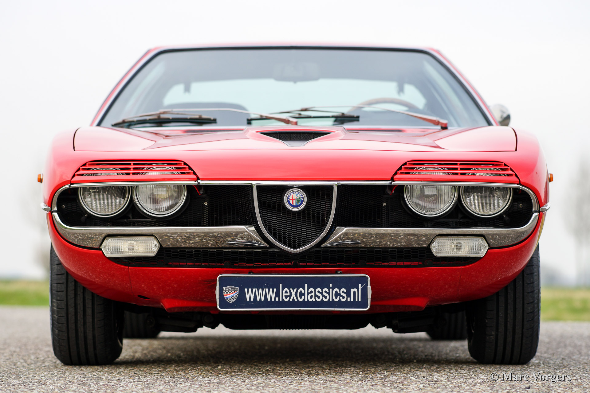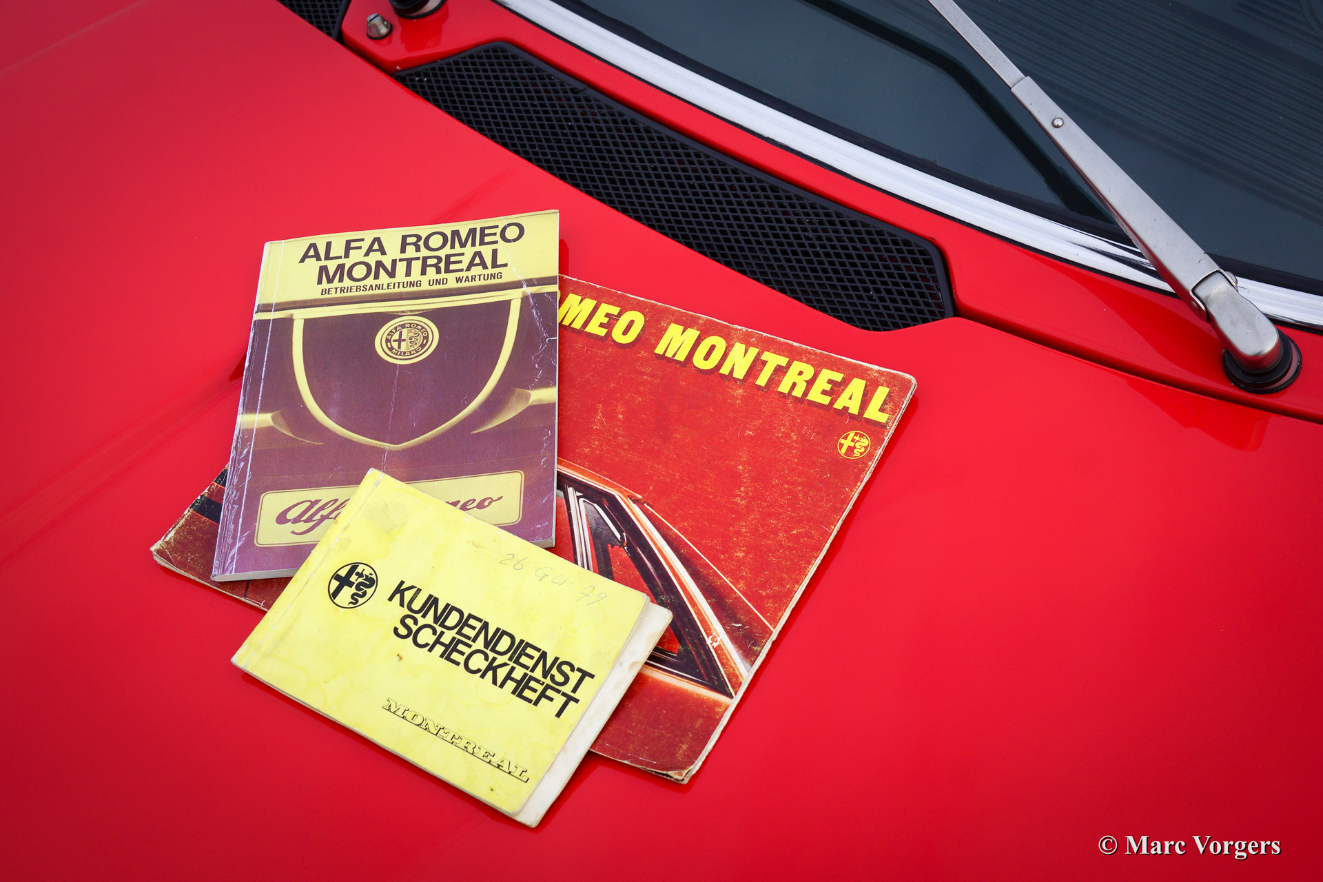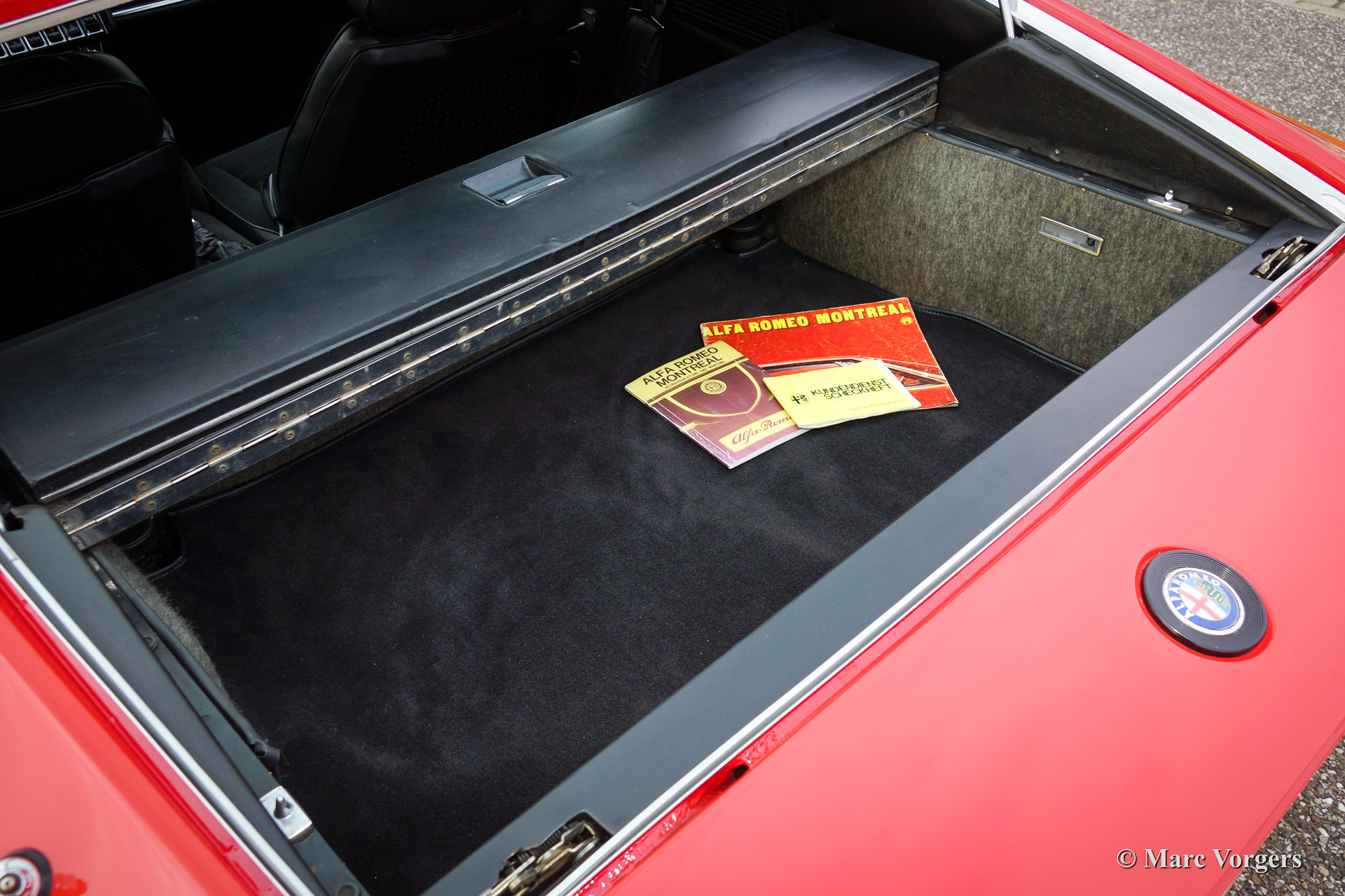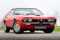 Alfa Romeo Montreal, year 1975. Colour red with a black cloth interior. Black carpet. Chassis number AR1428XXX. This magnificent Alfa Romeo Montreal is in to superb (excellent+) condition and the car drives fantastic! This automobile has been cherished by a true Alfa Romeo enthusiast who has taken excellent care of this tremendous car. The car was delivered new in the Netherlands. This Montreal shows the original details and the car comes with the original booklets like the owners manual and service booklet. The V8 engine runs perfectly and the sound is... very addictive! A truly excellent specimen and a sound investment.