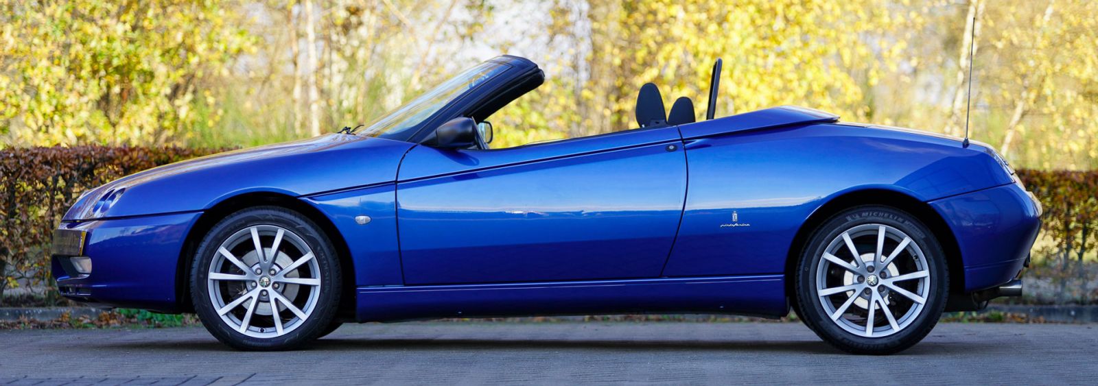 Alfa Romeo Spider 2.0 JTS, jaar 2005. Kleur blauw metallic (Blu Reims, Alfa Romeo code 254/A) gecombineerd met een antraciet met blauw stoffen interieur. Deze prachtige Alfa Spider werd nieuw verkocht in Italië. In november 2006 is de auto door de eerste Nederlandse eigenaar in Nederland geïmporteerd. In 2015 heeft de auto een nieuwe eigenaar gevonden die de auto tot op de dag van vandaag heeft gekoesterd. In 2018 zijn bij 64.789 kilometer de distributieriem en waterpomp vernieuwd. In 2023 heeft de auto bij 79.996 kilometer een volledige onderhoudsbeurt gehad waarbij de distributieriem ook weer is vernieuwd. Momenteel staat de kilometerteller op 85.758 kilometer. Deze prachtige alfa Romeo Spider verkeert in een zeer goede tot excellente originele staat en de auto rijdt perfect. De carrosserie is puntgaaf, het interieur vertoont zeer lichte sporen van gebruik en de stoffen kap is nog origineel en in behoorlijk goede staat.