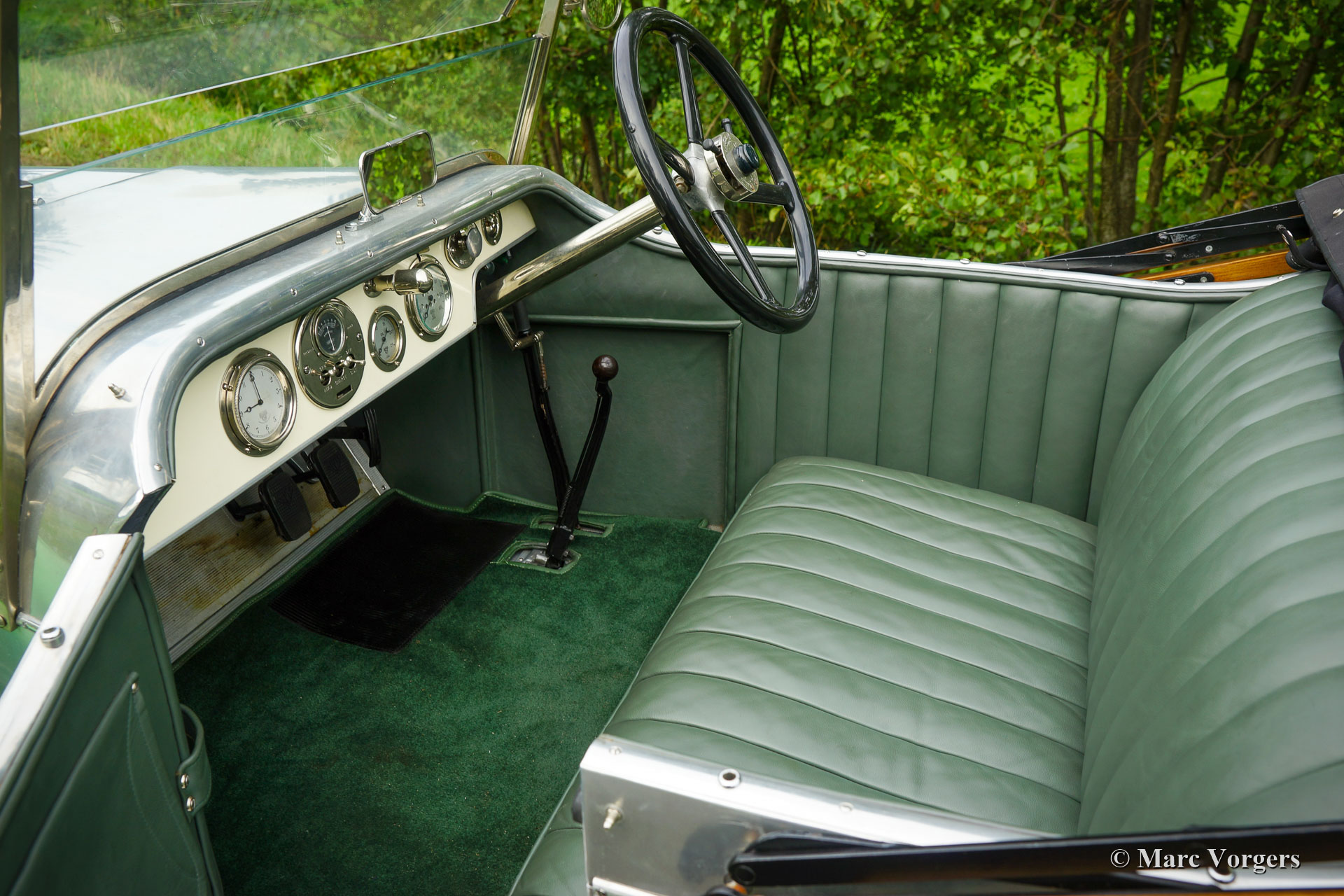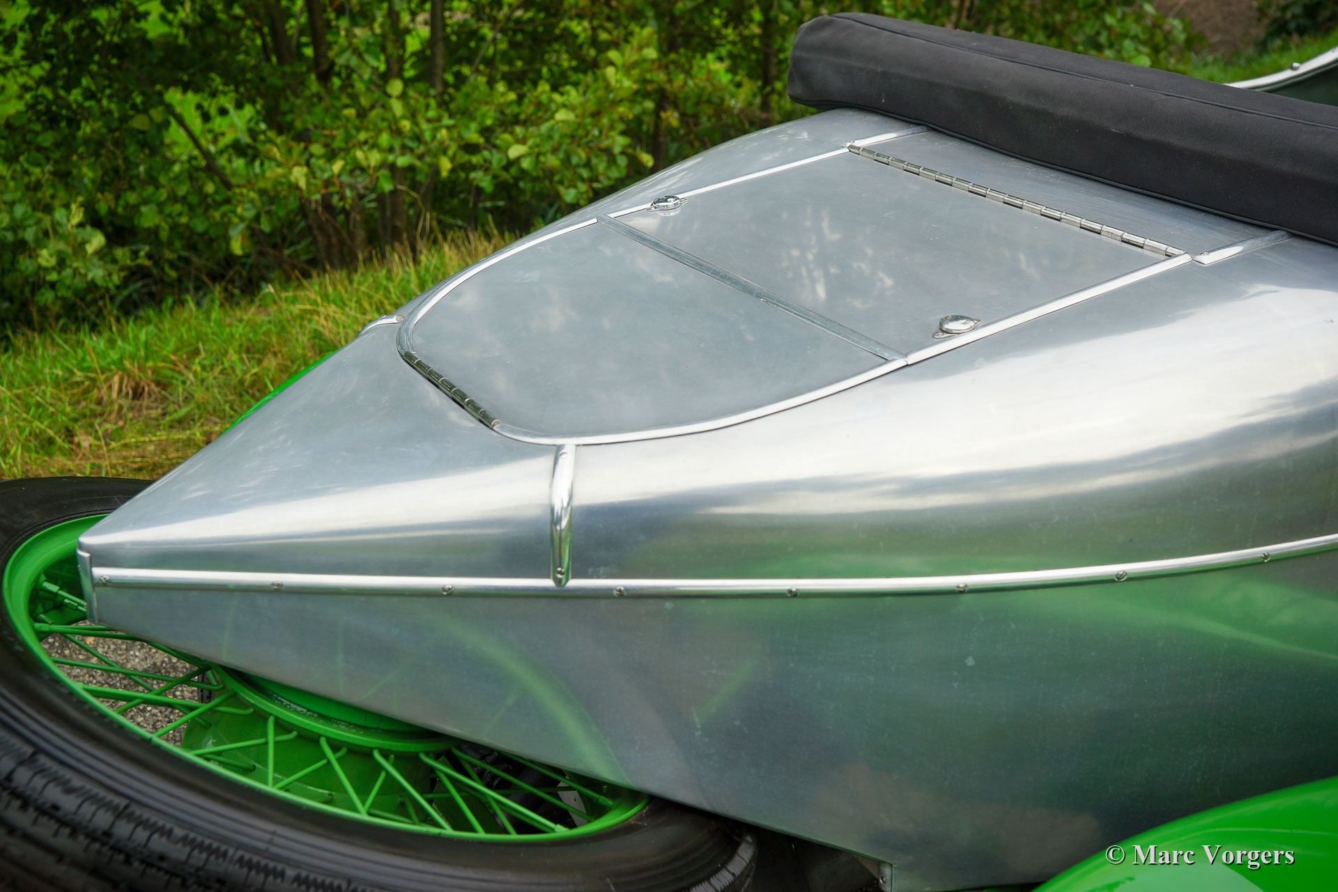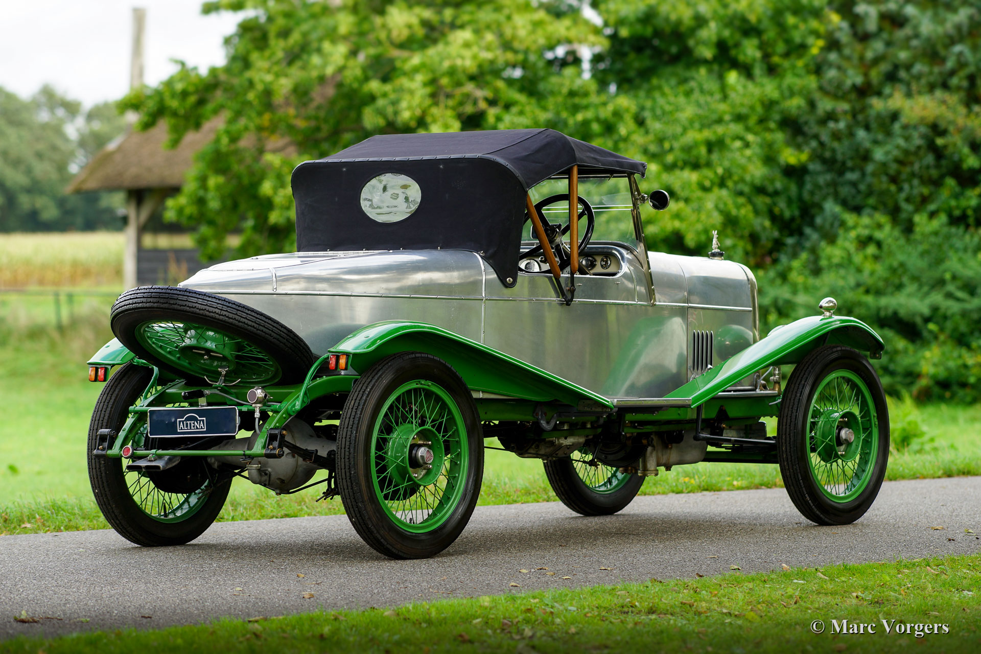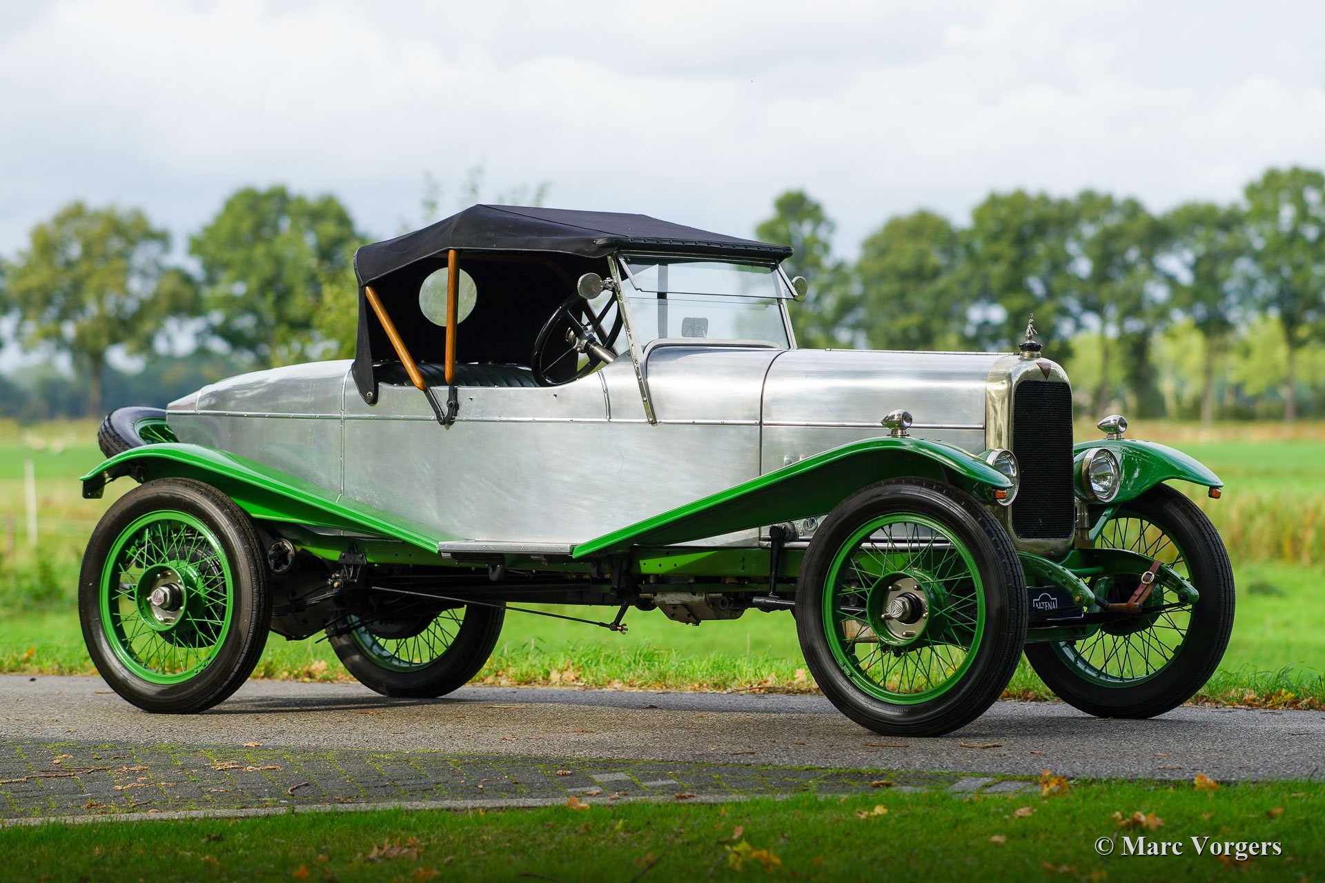 Alvis 12/40 TC ‘Duck’s Back’ Supersports, jaar 1923. Kleur ongelakte aluminium carrosserie met groene spatborden en groene spaakwielen. ‘Sage Green’ lederen interieur en bijpassend tapijt. Deze fantastische Alvis 12/40 TC werd op 7 december 1923 in chassisvorm naar Australië verscheept. Na aankomst in Australië werd het chassis door de firma Charles Kirkham in Petersham, Sydney, voorzien van een vierpersoons carrosserie. Vanaf nieuw is de volledige geschiedenis bekend en gedocumenteerd… Dit inclusief TWEE reizen van Engeland naar Australië en terug… De volledige geschiedenis wordt bij de auto gegeven (in het Engels), hier presenteren we een korte versie. De derde Australische eigenaar verkocht de auto aan Orchid Cars in het Verenigd Koninkrijk die de auto in 2000 respectievelijk (toen weer enkel het rijdende chassis met schutboard) verkocht aan ex-Alvis tekenkamer medewerker O. Stoke. Vanwege de toenmalige slechte gezondheid van Stoke werd de bijna voltooide Alvis (nu uitgerust met 'Duck's Back' Supersports-carrosserie) in 2006 verkocht aan Richard Dyson-Harvey die vervolgens emigreerde naar (raad eens) Australië en de Alvis met zich meenam. Eenmaal terug in Australië kreeg Tony Heard uit Adelaide in 2011 de opdracht voor herbouw van de Alvis. De Alvis werd volledig gedemonteerd en herbouwd tot in de perfectie. Het werk werd in 2013 voltooid. Een gedetailleerd fotografisch verslag van de restauratie is aanwezig bij de auto. De vorige eigenaar O. Stoke kocht de auto ongezien in 2014 en de auto keerde weer terug in het VK in 2015.