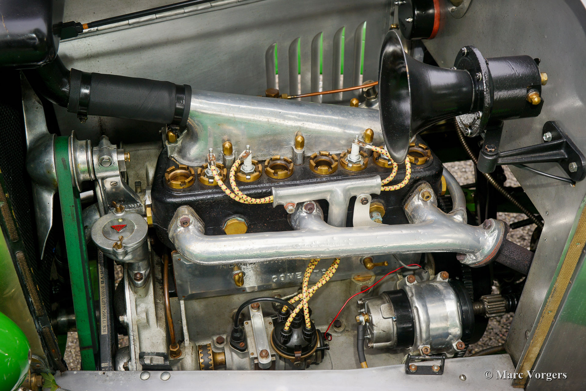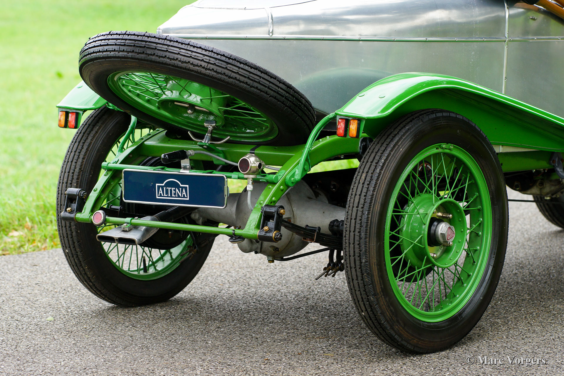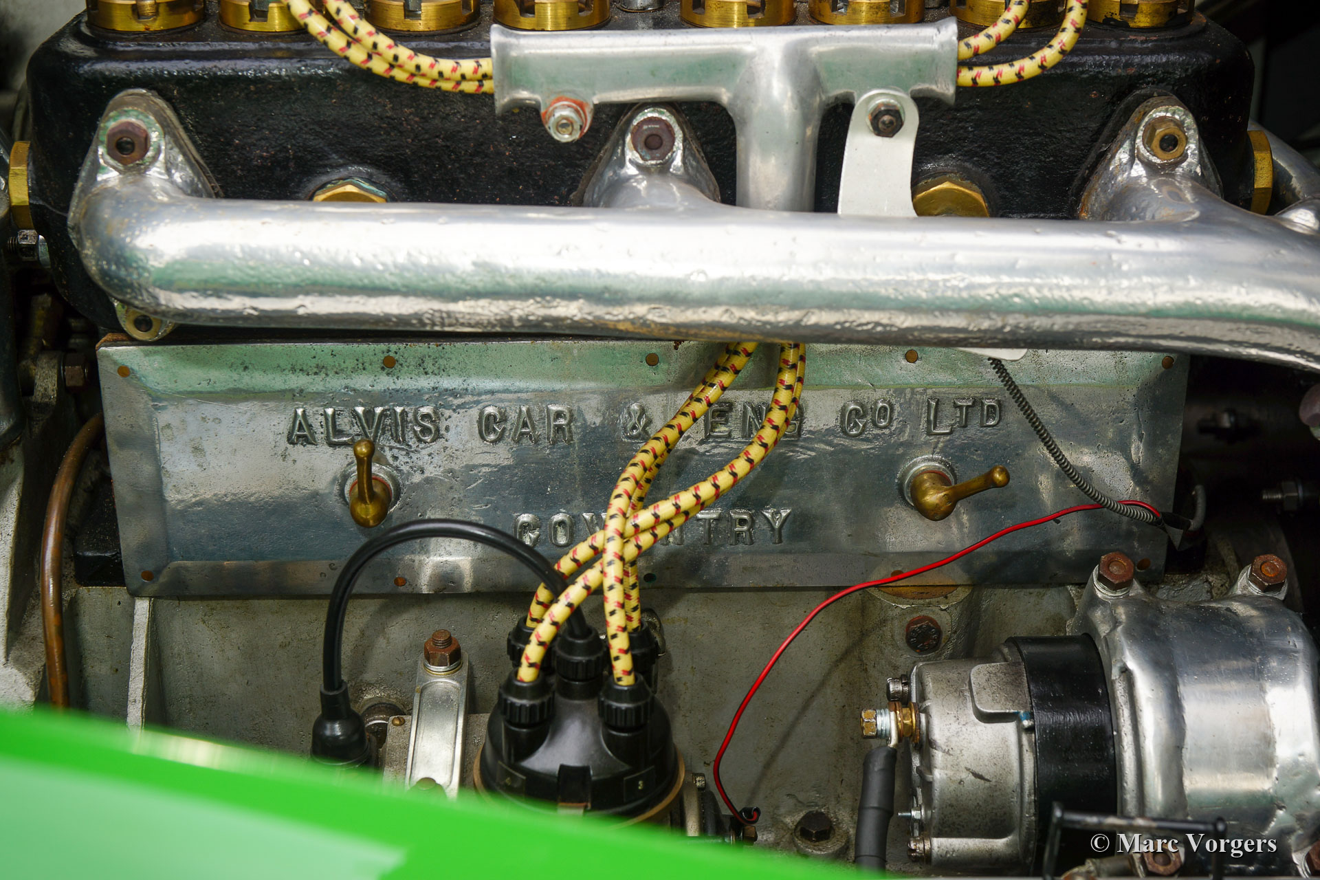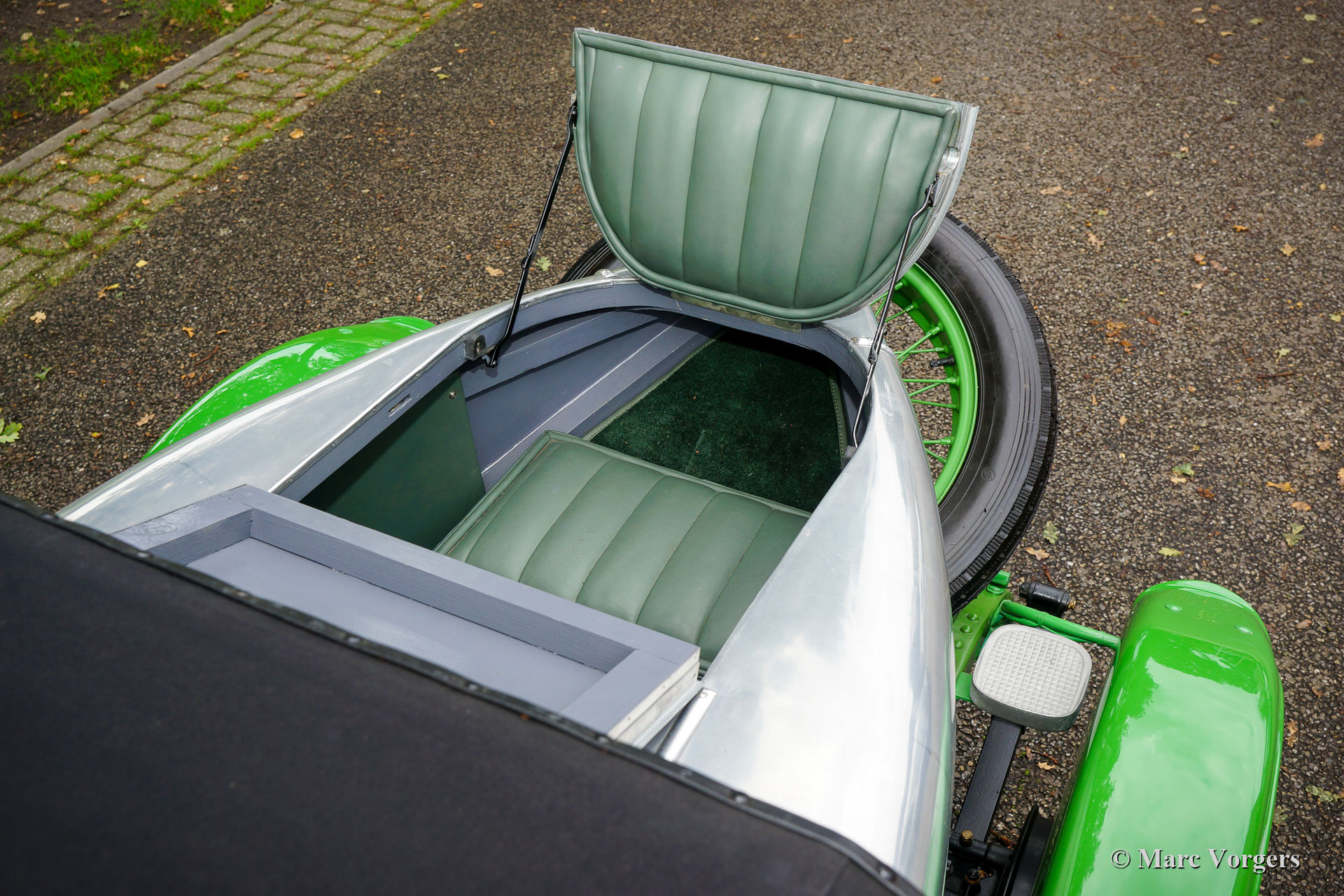 Alvis 12/40 TC ‘Duck’s Back’ Supersports, jaar 1923. Kleur ongelakte aluminium carrosserie met groene spatborden en groene spaakwielen. ‘Sage Green’ lederen interieur en bijpassend tapijt. Deze fantastische Alvis 12/40 TC werd op 7 december 1923 in chassisvorm naar Australië verscheept. Na aankomst in Australië werd het chassis door de firma Charles Kirkham in Petersham, Sydney, voorzien van een vierpersoons carrosserie. Vanaf nieuw is de volledige geschiedenis bekend en gedocumenteerd… Dit inclusief TWEE reizen van Engeland naar Australië en terug… De volledige geschiedenis wordt bij de auto gegeven (in het Engels), hier presenteren we een korte versie. De derde Australische eigenaar verkocht de auto aan Orchid Cars in het Verenigd Koninkrijk die de auto in 2000 respectievelijk (toen weer enkel het rijdende chassis met schutboard) verkocht aan ex-Alvis tekenkamer medewerker O. Stoke. Vanwege de toenmalige slechte gezondheid van Stoke werd de bijna voltooide Alvis (nu uitgerust met 'Duck's Back' Supersports-carrosserie) in 2006 verkocht aan Richard Dyson-Harvey die vervolgens emigreerde naar (raad eens) Australië en de Alvis met zich meenam. Eenmaal terug in Australië kreeg Tony Heard uit Adelaide in 2011 de opdracht voor herbouw van de Alvis. De Alvis werd volledig gedemonteerd en herbouwd tot in de perfectie. Het werk werd in 2013 voltooid. Een gedetailleerd fotografisch verslag van de restauratie is aanwezig bij de auto. De vorige eigenaar O. Stoke kocht de auto ongezien in 2014 en de auto keerde weer terug in het VK in 2015.