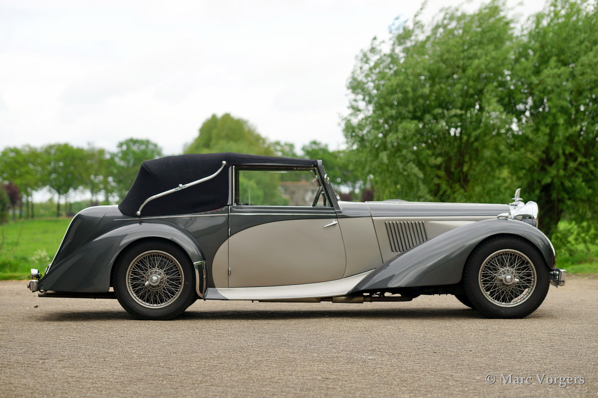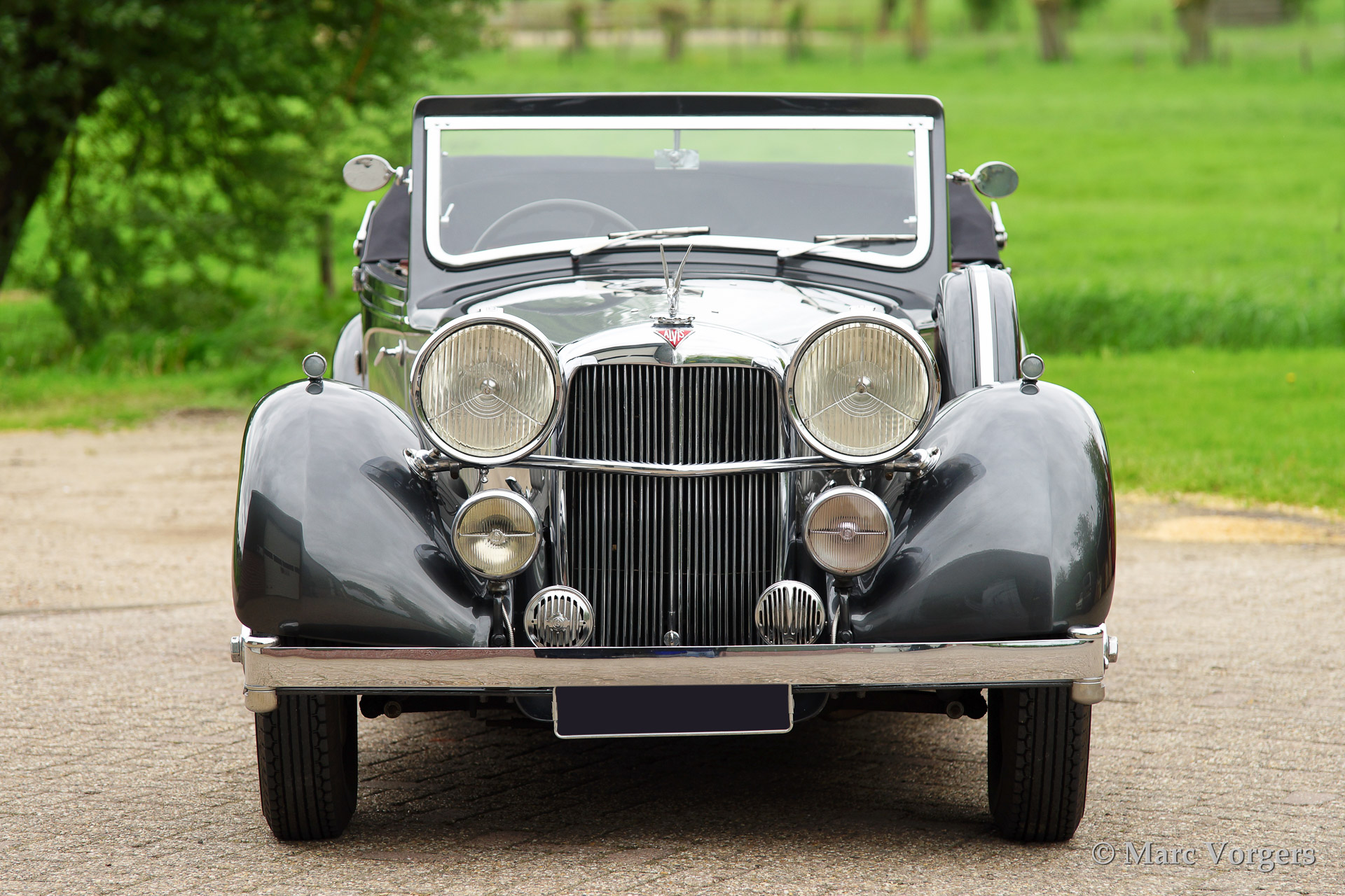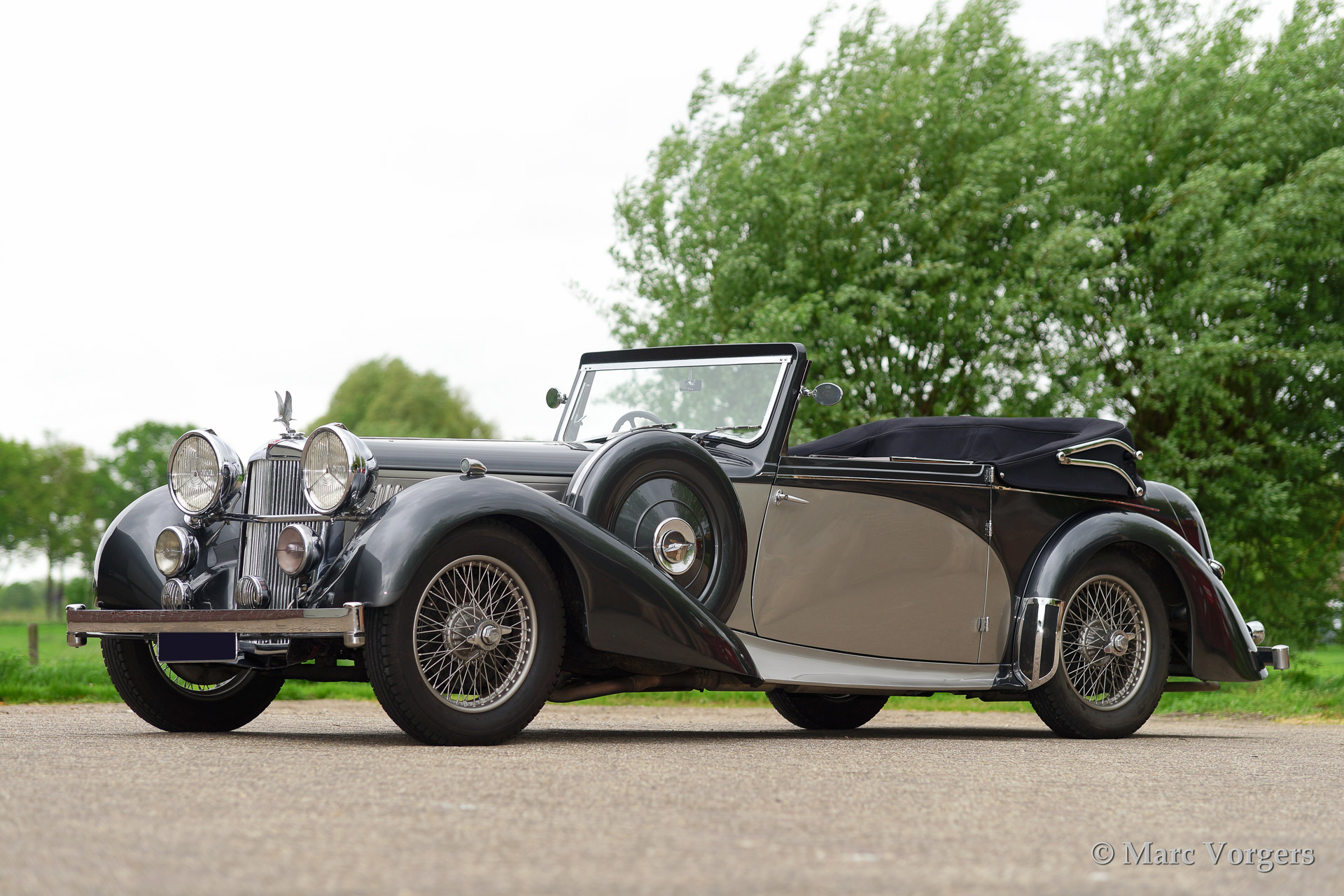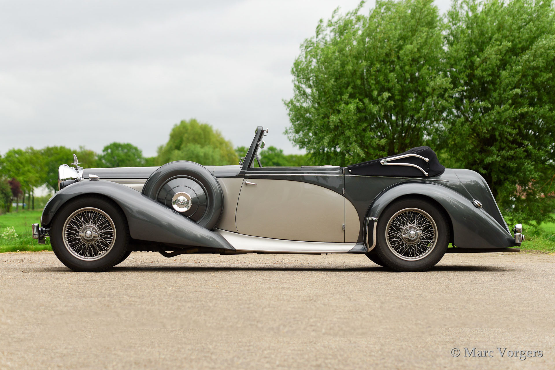 Alvis Speed 25 Charlesworth DHC, bouwjaar 1939. kleur 'two tone', zilver metallic/grijs metallic met een donkerrood lederen interieur en grijs tapijt. Zwarte cabrioletkap en hood cover. Deze geweldige Alvis Speed 25 is een schaarse automobiel, er werden slechts 62 Charlesworth Drophead coupe's gebouwd. Alvis is een van de grote vooroorlogse Engelse merken. Een echt 'ingenieursmerk' waarbij de technici zelf bijna alle delen ontwierpen waar veel andere merken deze inkochten. De volledig gesynchroniseerde versnellingsbak is hiervan een voorbeeld. In vergelijking met de toenmalige concurrentie werkt die van Alvis perfect en kraakvrij zonder te 'double declutchen' met de koppeling. De Charlesworth Drophead Coupe wordt gekenmerkt door een speciale 3-positie kap. Open, half open of gesloten.