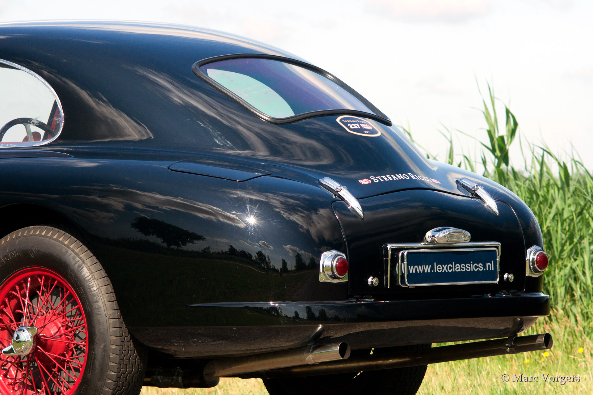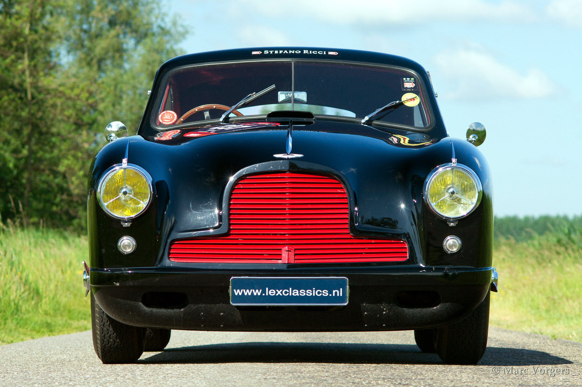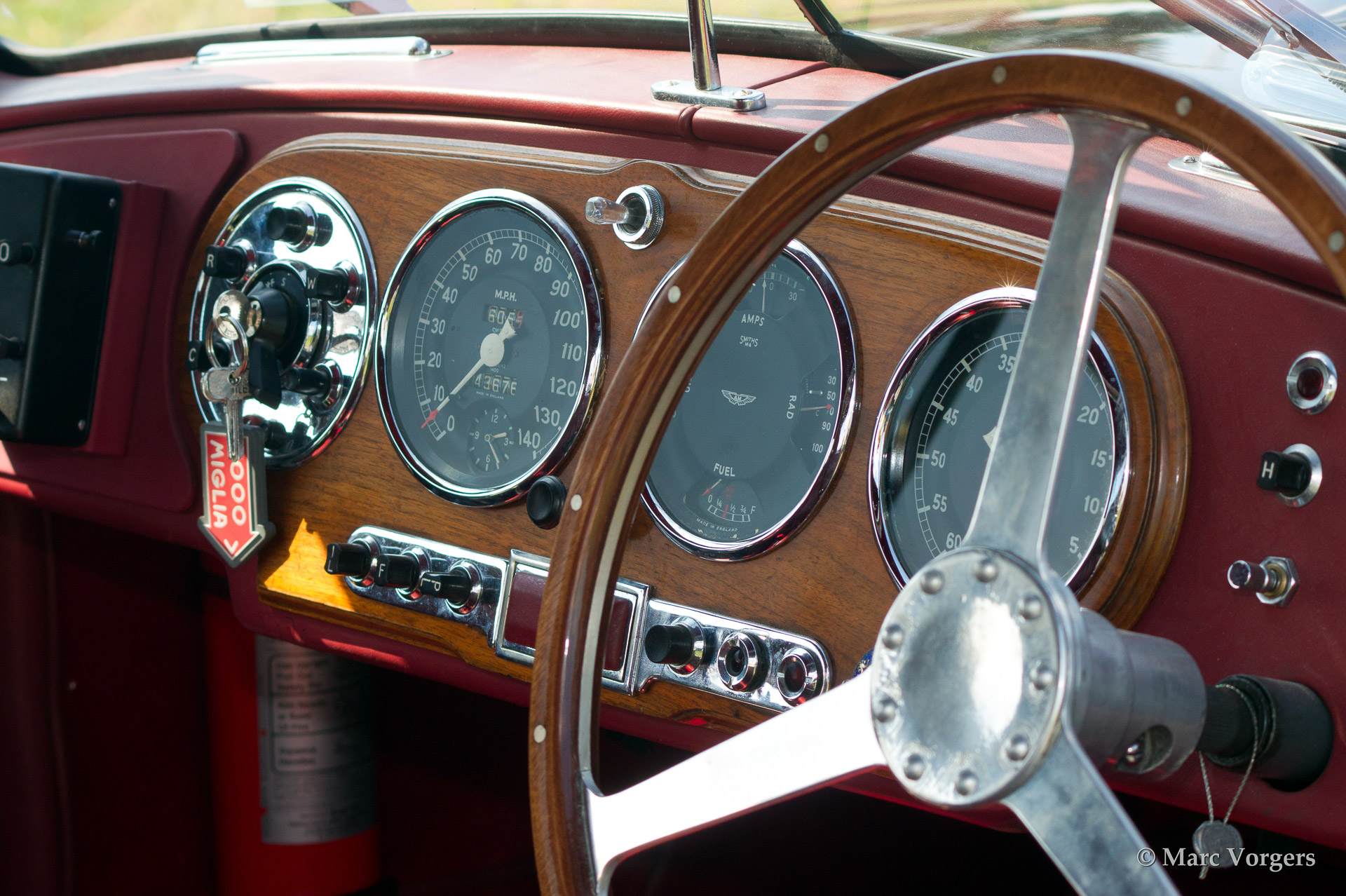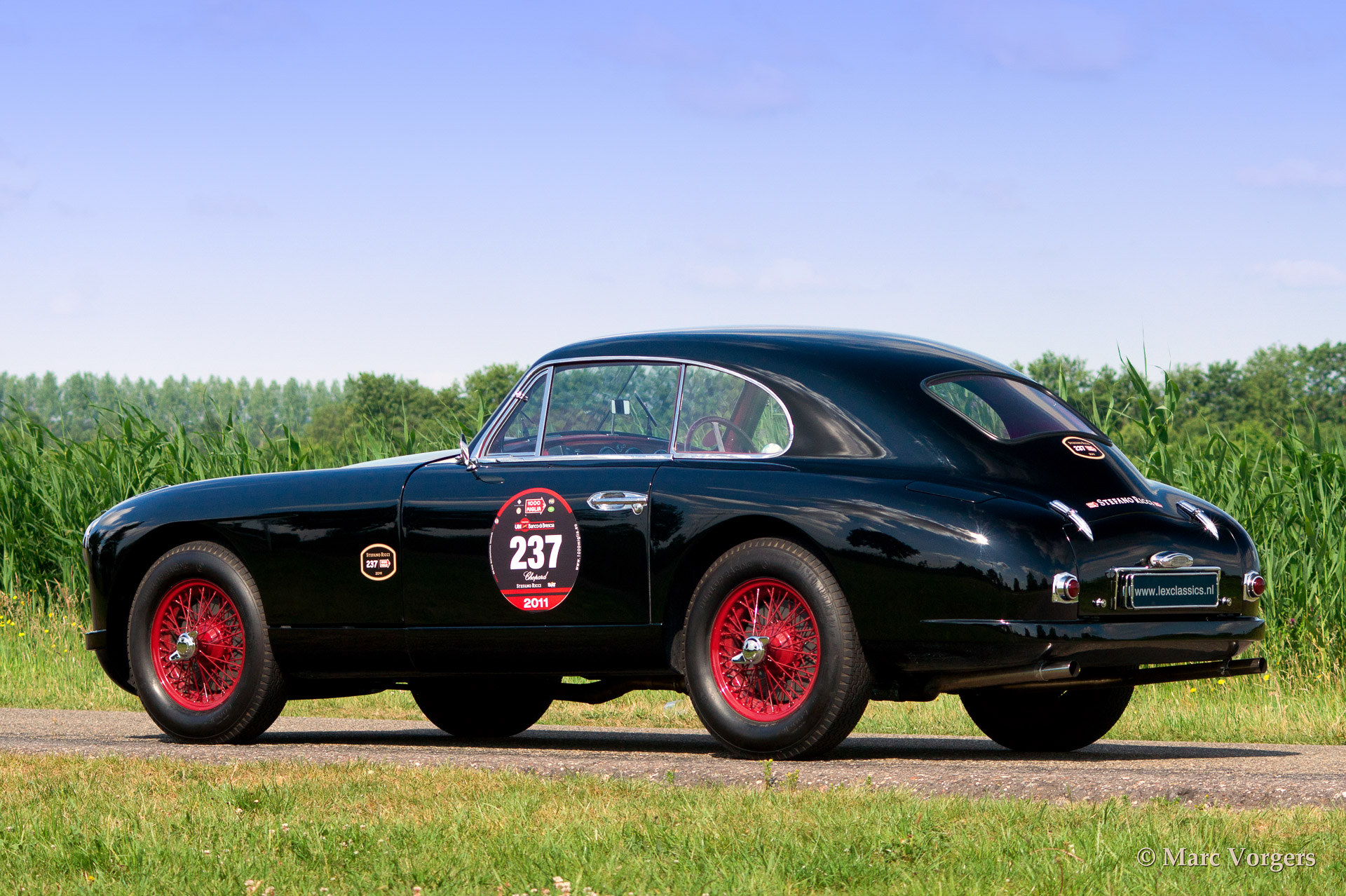Aston Martin DB2 Vantage, bouwjaar 1952. Kleur zwart met donkerrood gelakte spaakwielen en een donkerrood lederen interieur. Deze zeldzame en bijzonder fraaie DB2 Vantage werd uitvoerig gerestaureerd. Deze Aston Martin werd nieuw afgeleverd door H.W. Motors (HWM) op 1 januari 1953.