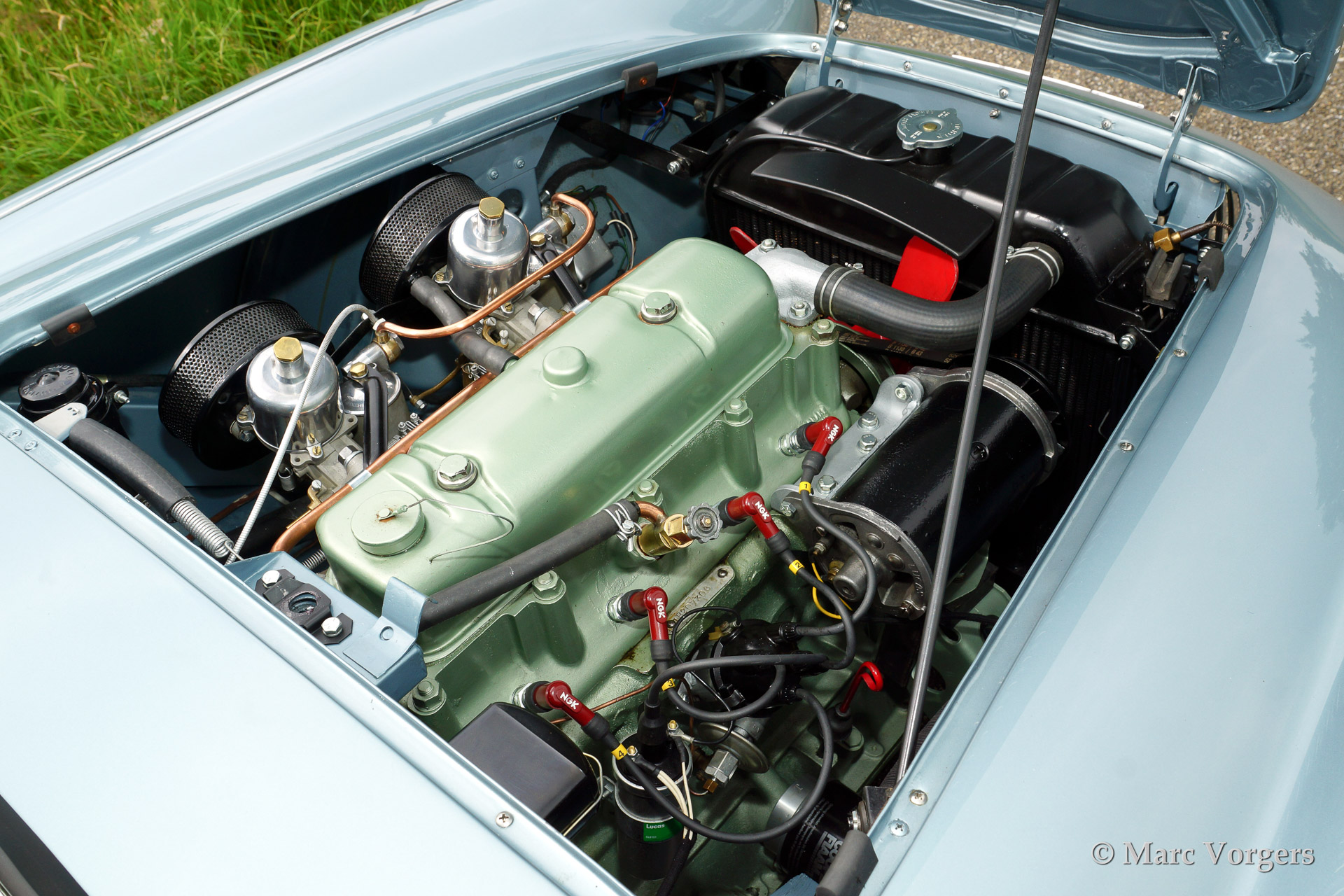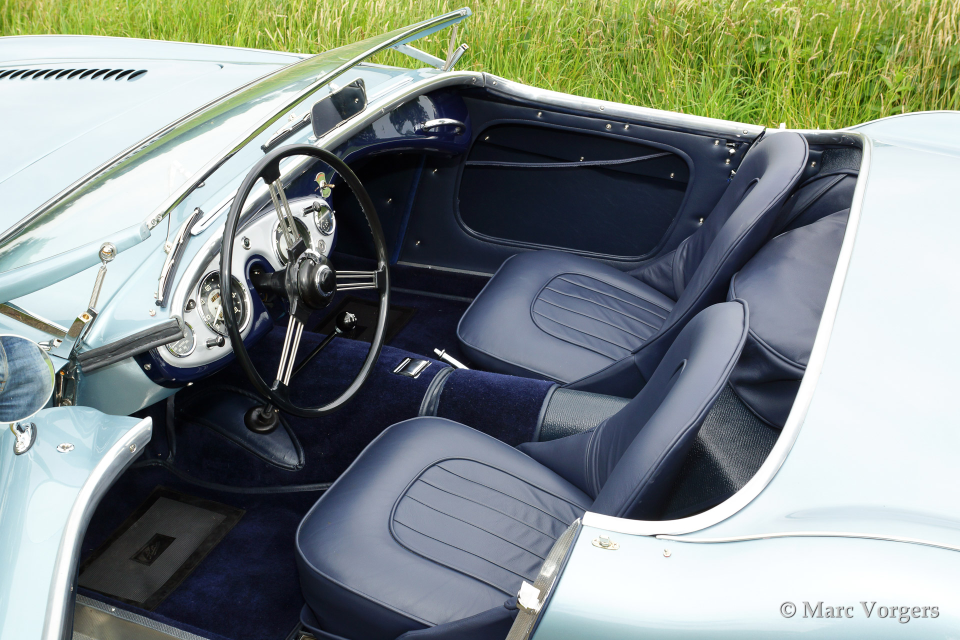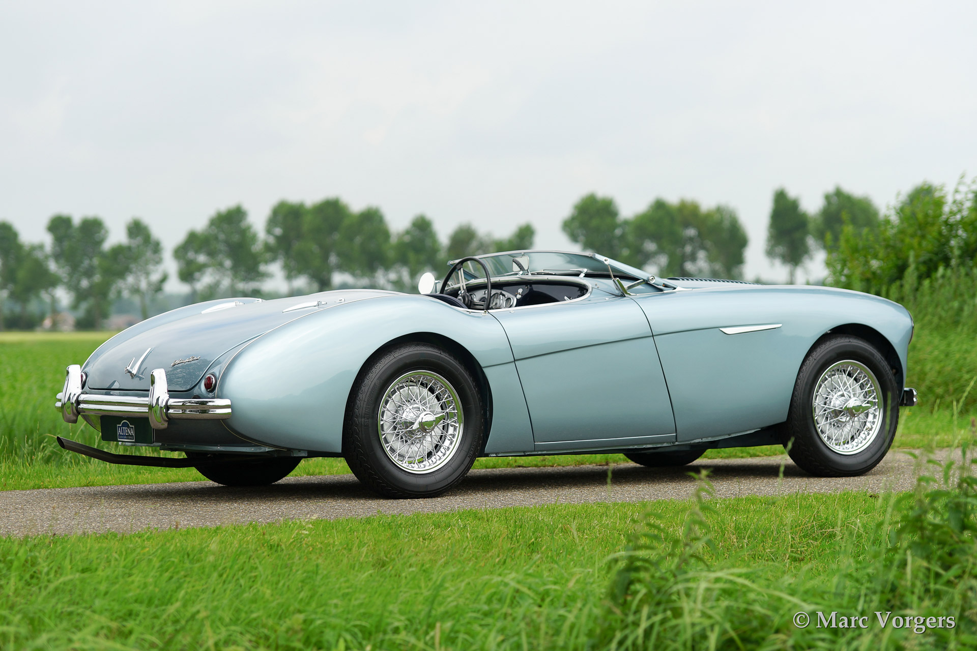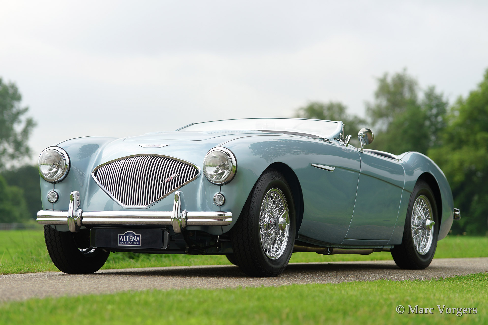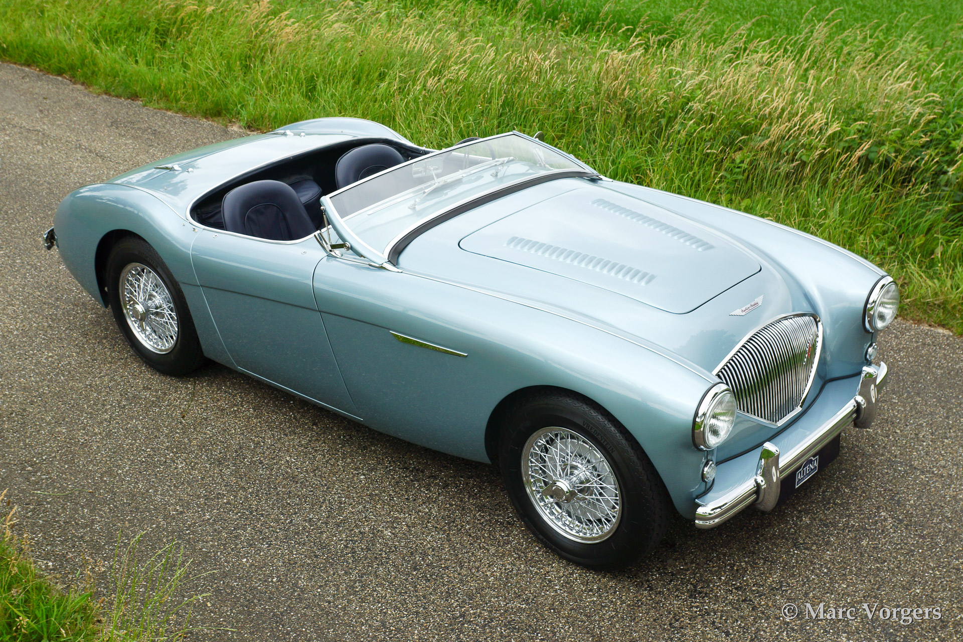 Austin Healey 100/4 BN-1, bouwjaar 1954. Kleur 'Ice Blue' metallic met een blauw lederen interieur, blauw tapijt en een blauw mohair sof top. Deze geweldige Austin Healey 100 - 'four' is juist gereed na volledige restauratie. De automobiel verkeert in concoursstaat! Uiteraard werd de volledige techniek gereviseerd, er werd een speciale aluminium cilinderkop gemonteerd. De auto is voorzien van chroom spaakwielen, een tonneau cover, RVS uitlaat en een aluminium benzinetank.