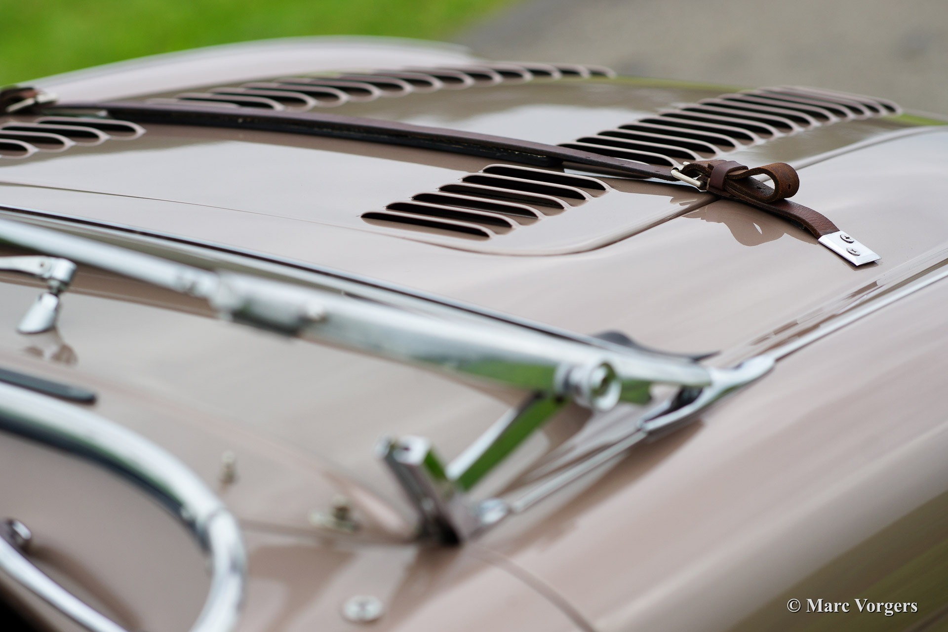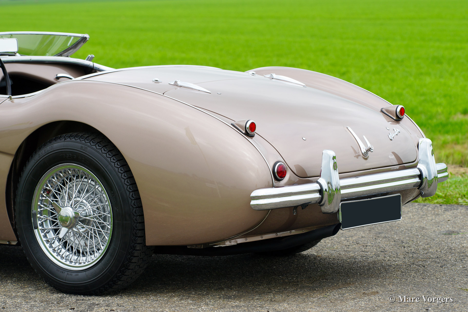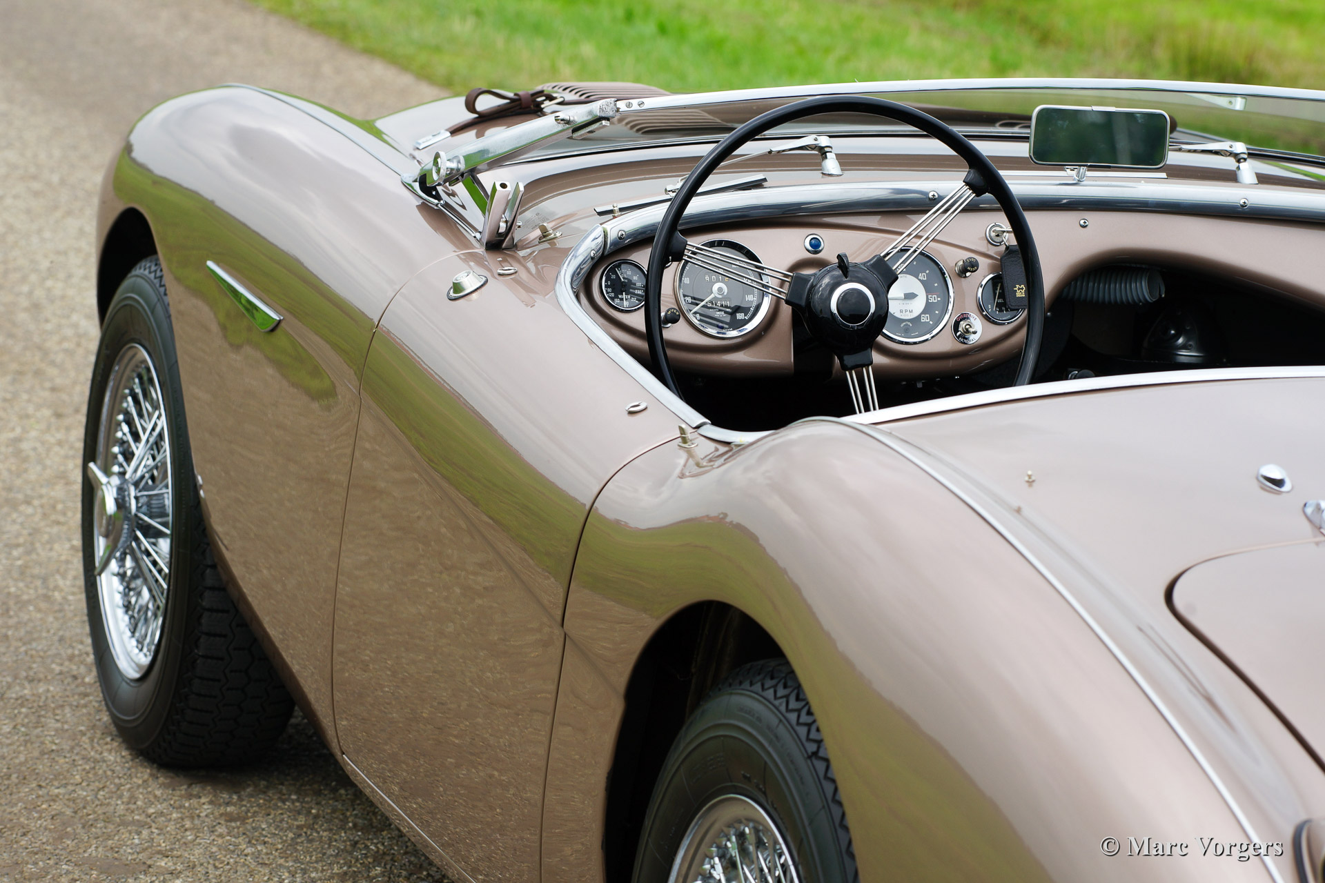 Austin Healey 100/4, bouwjaar 1956. Kleur 'golden beige' metallic. Geen originele 100/4 kleur. Deze gave Healey 100/4 is gemodificeerd naar 'Le Mans' specificaties. BN-2 met vierversnellingsbak en overdrive.