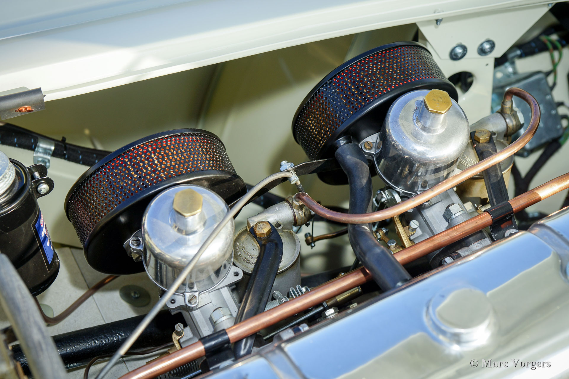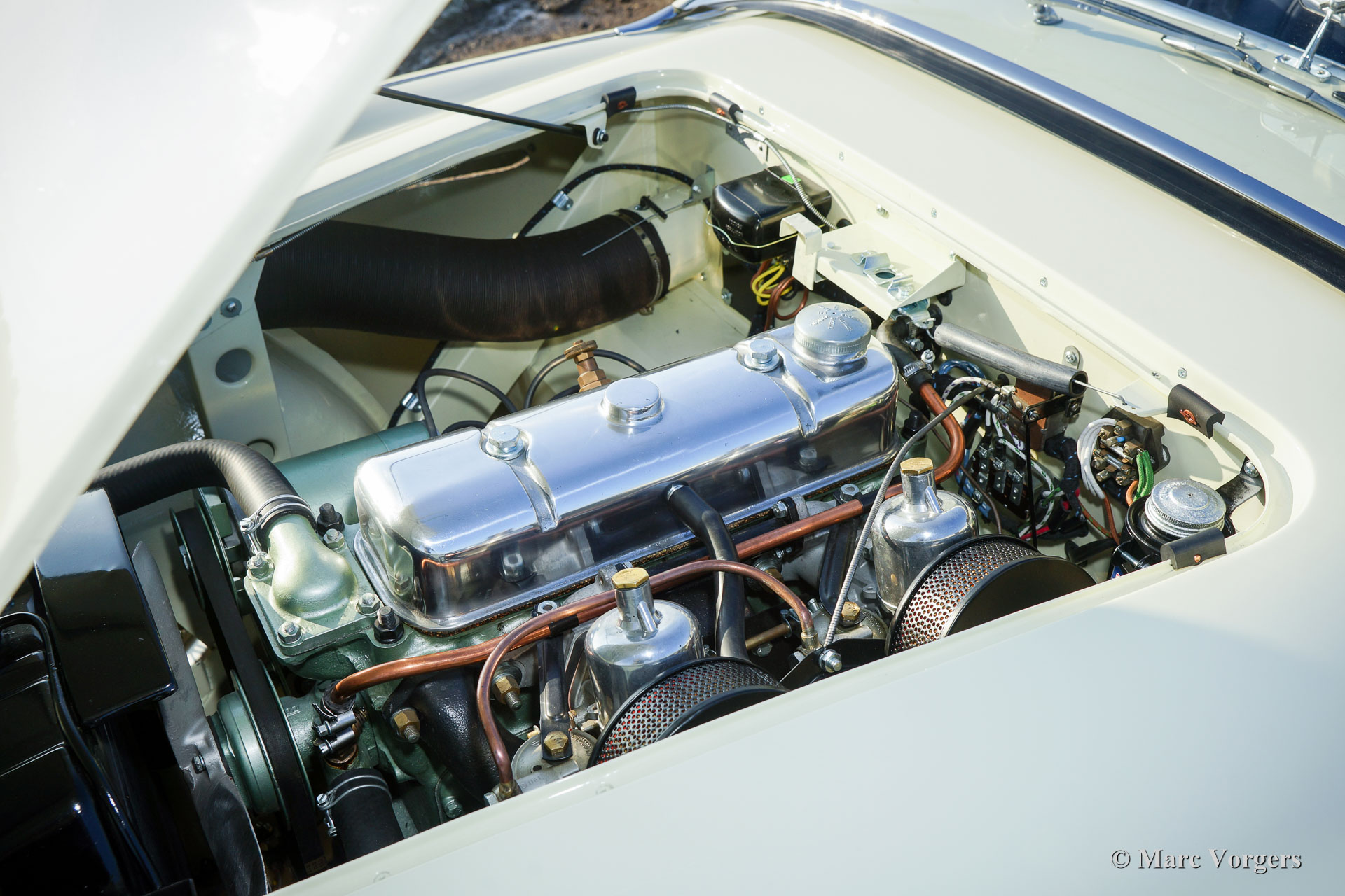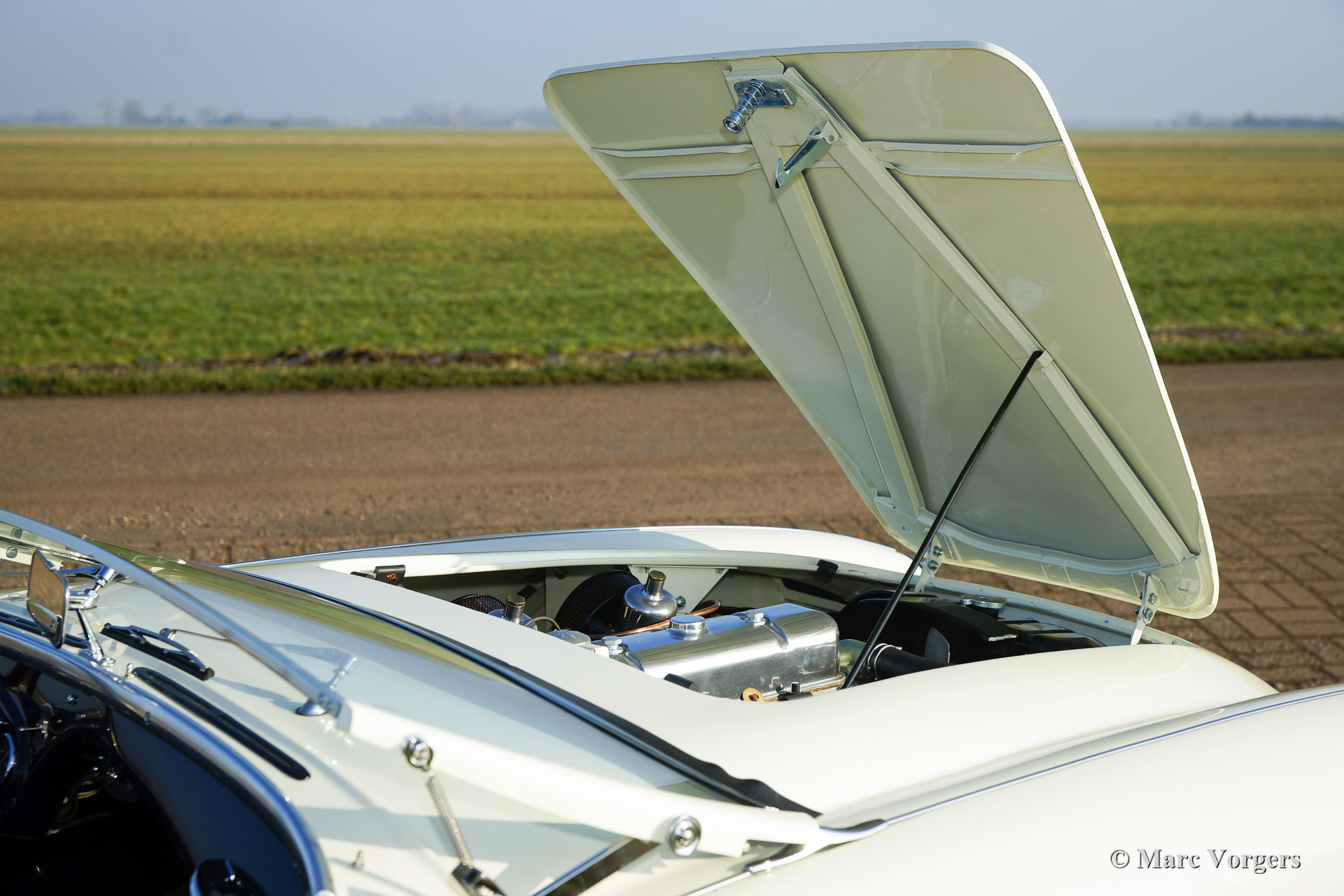 Austin Healey 100/4 BN1, jaar 1955. Kleur Old English White boven donkerblauw met een donkerblauw lederen interieur en blauw tapijt. Blauwe ‘soft-top’ en ‘side-screens’. Deze fantastische Austin Healey 100-FOUR is uitvoerig en zeer fraai gerestaureerd door een ervaren restaurateur. Na de plaatwerkfase heeft de body een KTL-behandeling gehad (kathodische dompellak) zodat deze vanbinnen en van buiten, ook in de holle ruimtes, beschermd is. Werkelijk alles is onder handen genomen en uiteraard zijn de motor en de versnellingsbak gereviseerd. Een uitgebreide fotoreportage van de restauratie is aanwezig evenals facturen die in totaal de 70.000 euro overschrijden. De auto verkeert in sublieme topstaat; concours! De carrosserie en motornummers zijn fabrieksorigineel en ‘matching numbers’, de versnellingsbak is van het BN2 type met vier versnellingen in plaats van drie. De auto is uitgerust met overdrive, spaakwielen een rvs uitlaat, Vredestein banden en een aluminium benzinetank. Een uitstekend rijdend TOP-exemplaar!