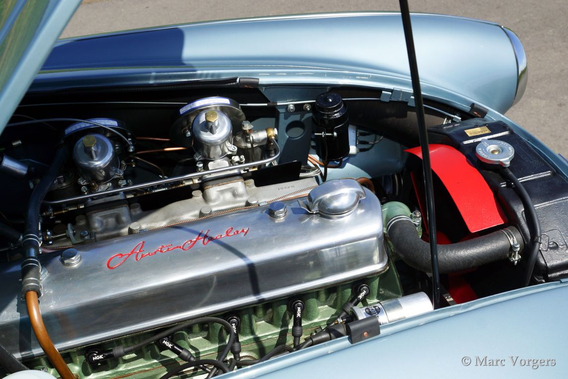 Austin Healey 100/6, bouwjaar 1958. kleur 'Ice Blue' metallic met een zwart lederen interieur afgebiest met grijze 'piping'. Deze stoere Healey toont zeer sportief met weggelaten bumpers en met fraaie extra koplampen!