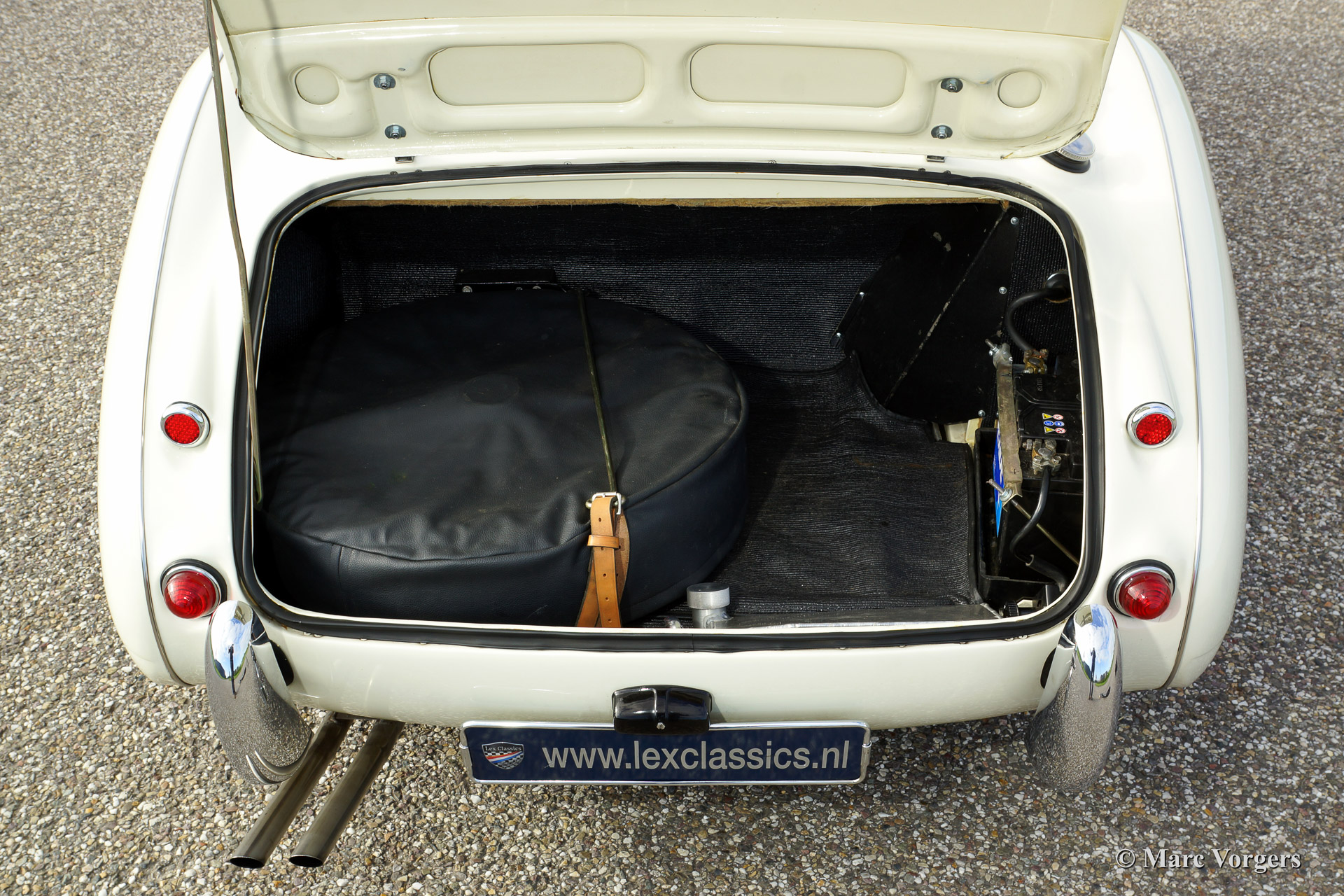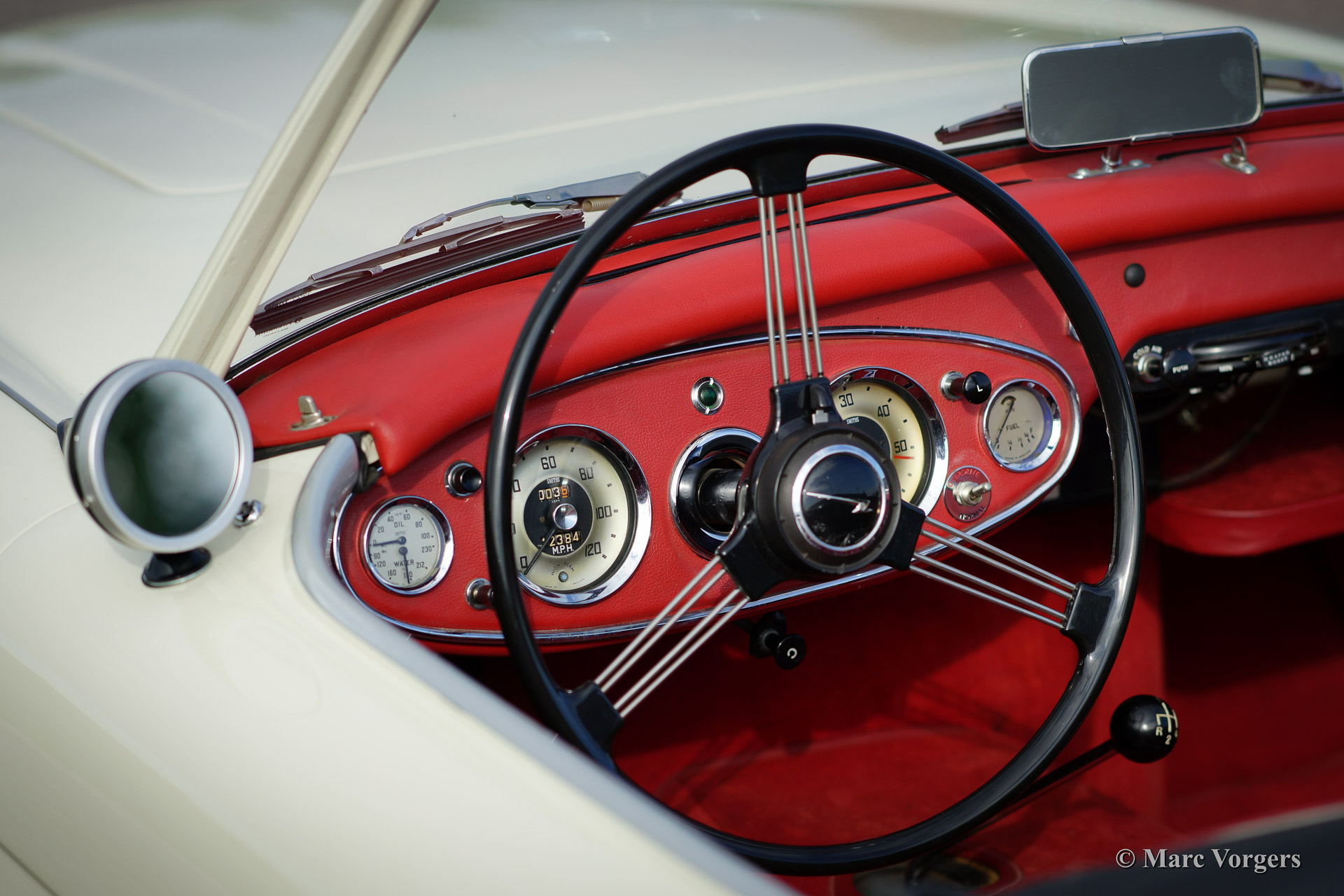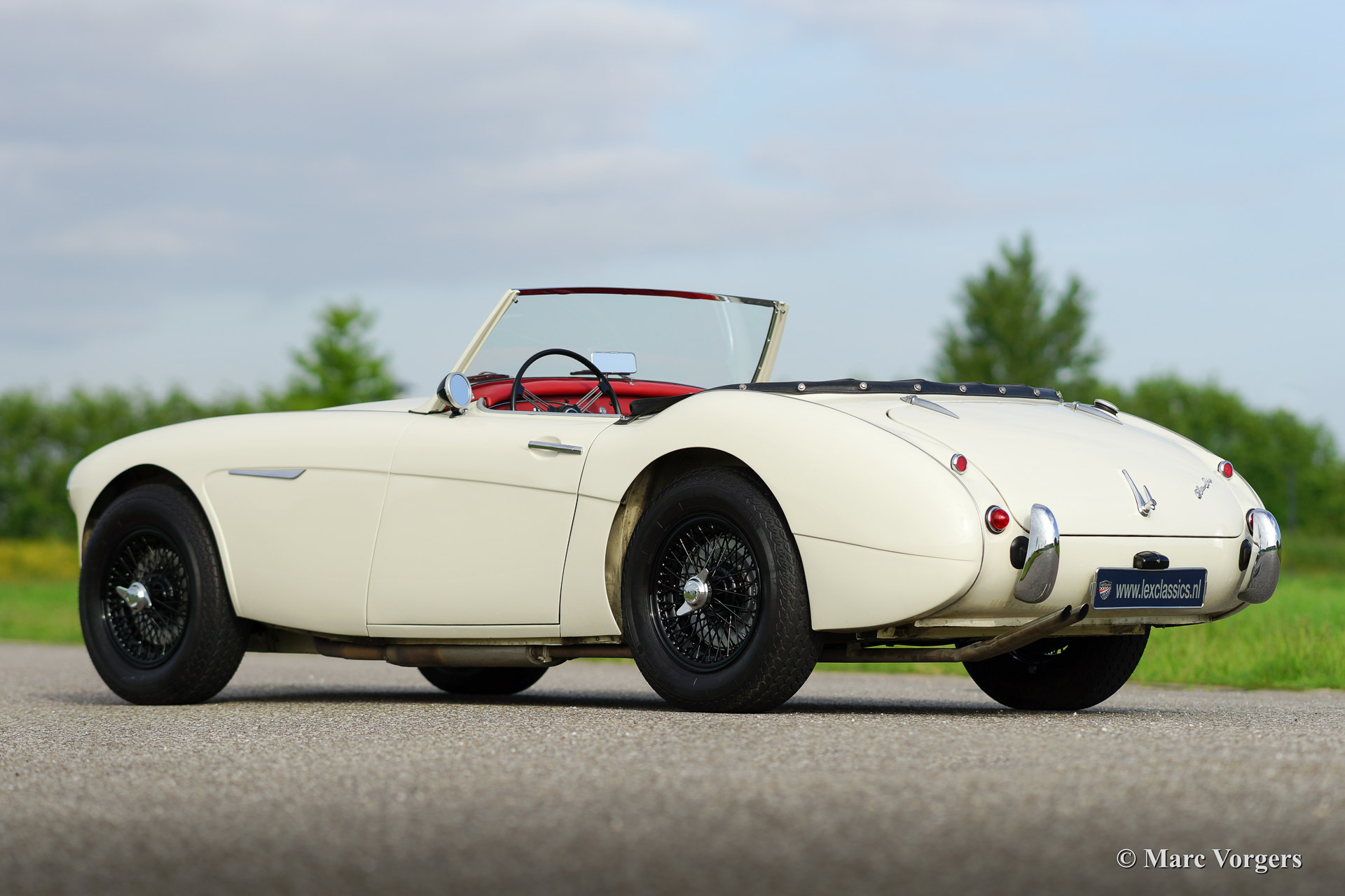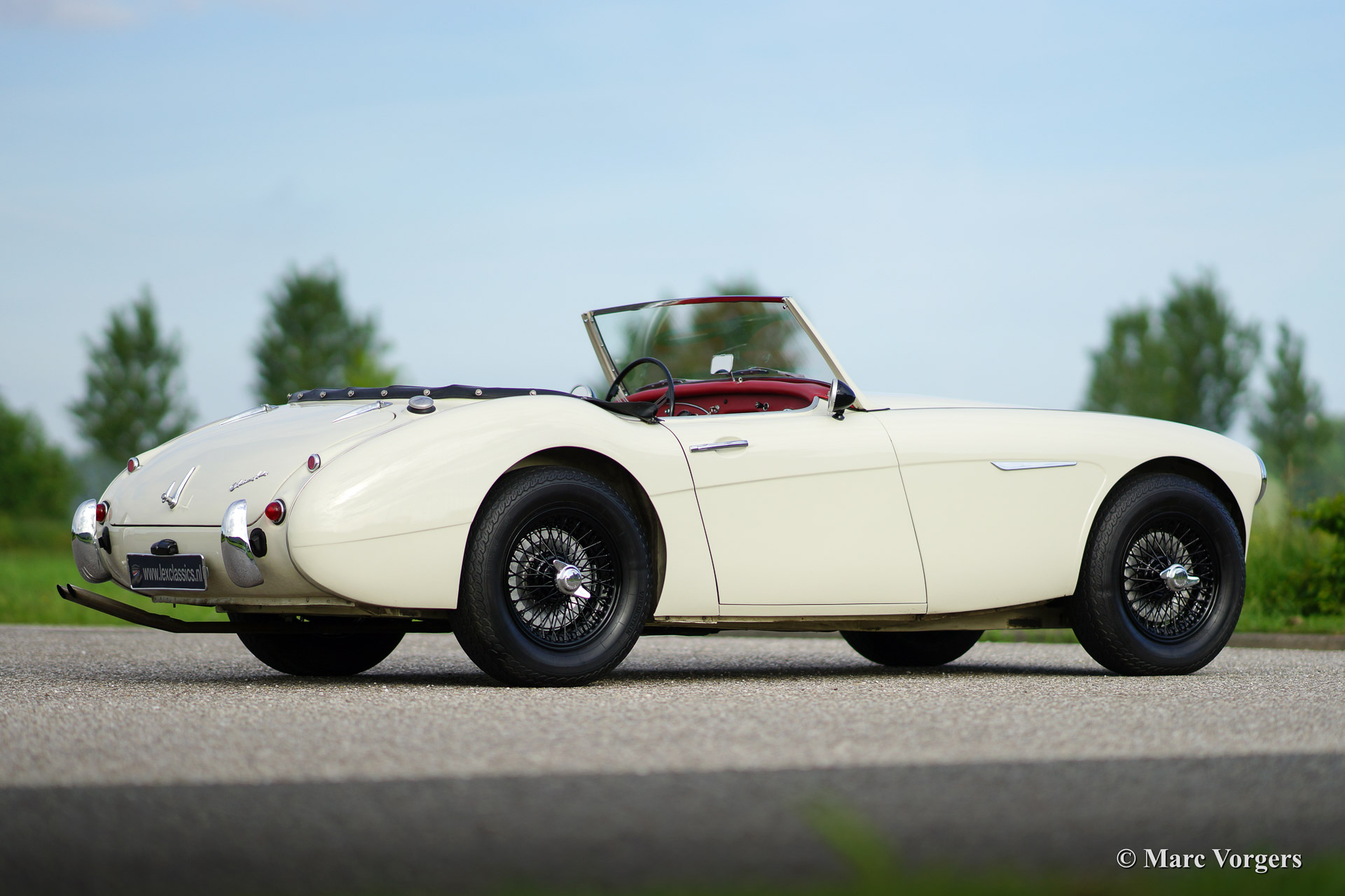 Austin Healey 100/6, bouwjaar 1959. Chassis nummer BN4LO/75XXX, motor nummer 29K/RU/H9XXX (latere Healey 3000 motor). Kleur crème wit met een rood lederen interieur afgebiest in wit. Zwarte soft top en aluminium 'side screens'. Deze geweldig stoere 'Big Healey' verkeert in excellente staat en de auto rijdt en klinkt subliem! De auto is voorzien van zwart gelakte spaakwielen, een RVS uitlaat, elektronische ontsteking, een aluminium benzine tank, een speciaal gemaakte 'jerry can' en beschermhoezen voor de 'side screens'.