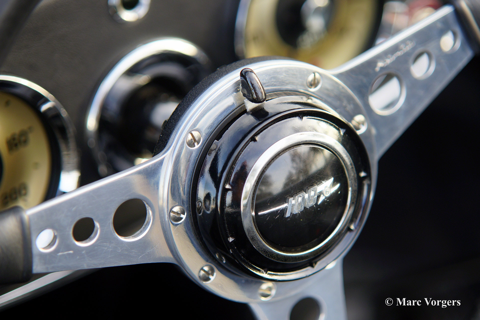 Austin Healey 100/6 BN-6 tweezitter, bouwjaar 1957. Kleur lichtgroen metallic boven crème wit met een zwart lederen interieur en zwart tapijt. Zwarte mohair sof top. Deze zeer vroege Healey 100/6 werd voorzien van nieuwe wielnaven. Wij namen de gelegenheid om de auto te laten zien met spaakwielen aan de ene- en Minilite lichtmetalen wielen aan de andere kant van de auto.