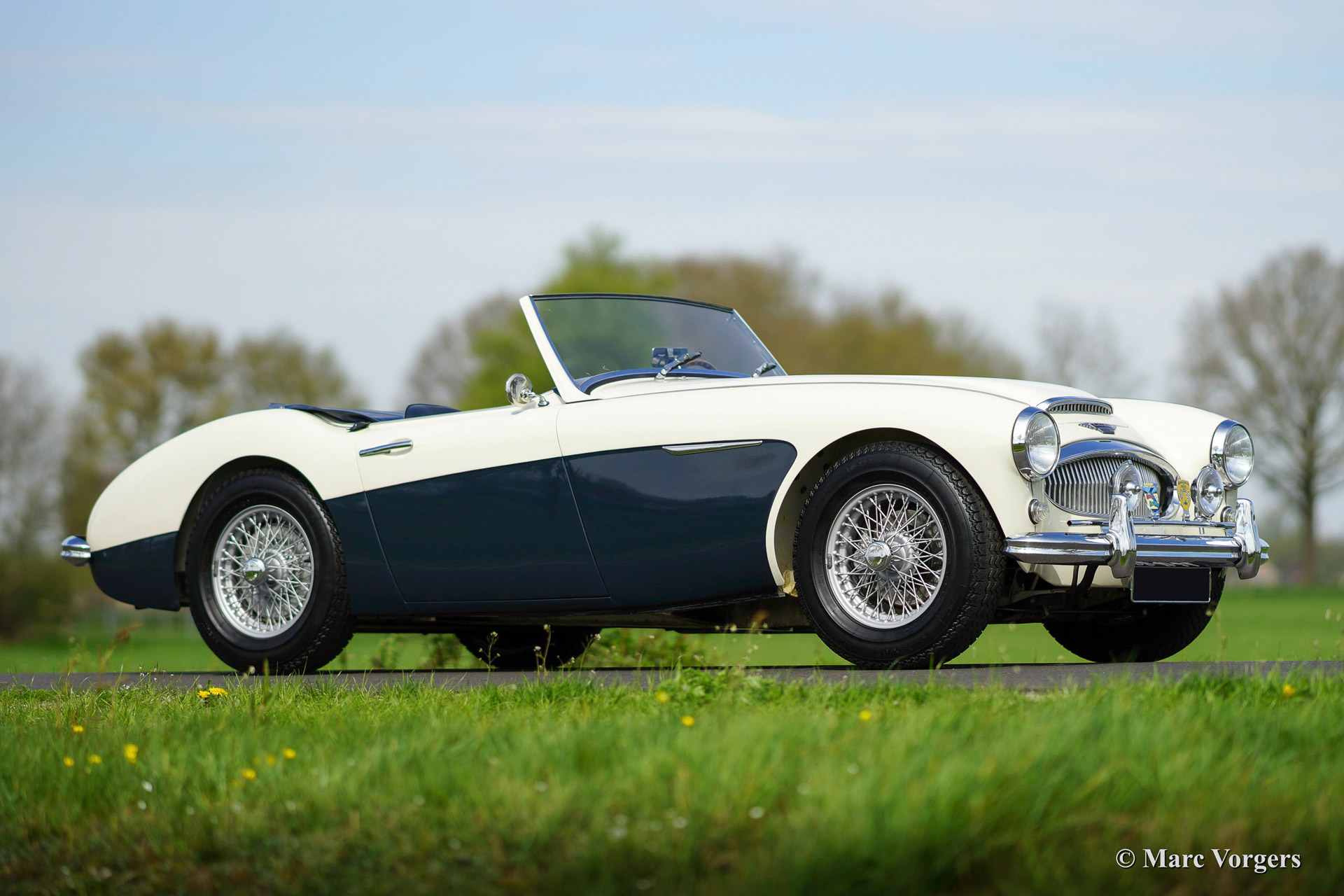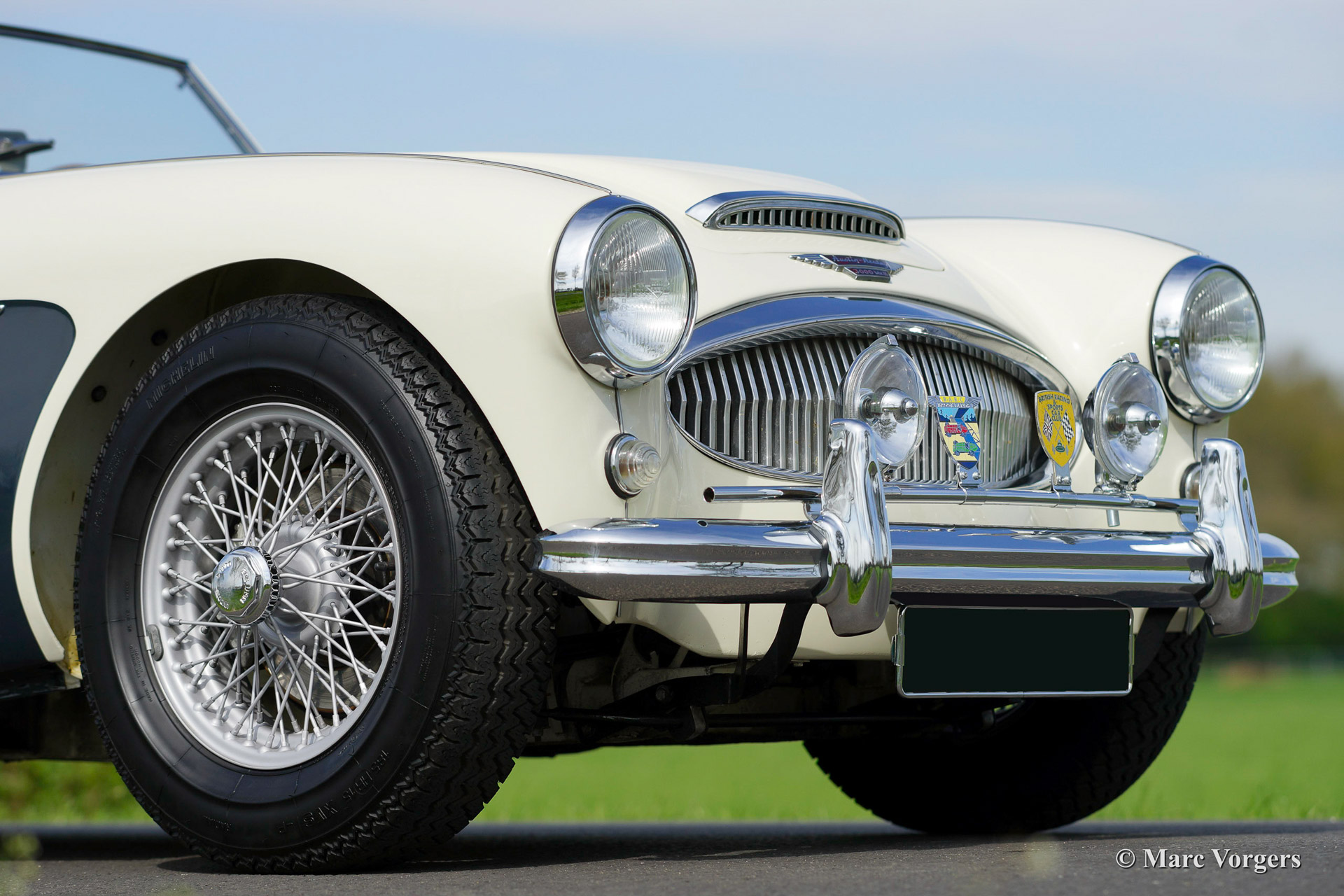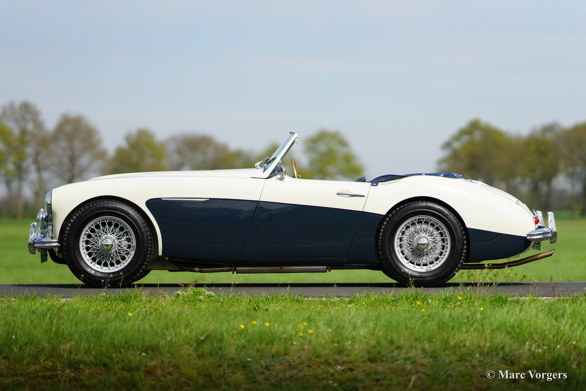 Austin Healey 3000 Mk II, bouwjaar 1962. Kleur crème wit boven donker blauw. Blauw lederen interieur en een blauwe tonneau cover. Deze prachtige Austin Healey 3000 Mk II is een schaars 3-carburateur model. De auto is een aantal jaren geleden uitvoerig gerestaureerd. Deze Healey rijdt perfect en de auto verkeert in excellente tot sublieme staat. De automobiel is uitgerust met overdrive, zilver gelakte spaakwielen, een MotoLita sportstuur met houten rand, een chroom 'badge bar' met extra lampen, een aluminium kleppendeksel en een RVS uitlaat.