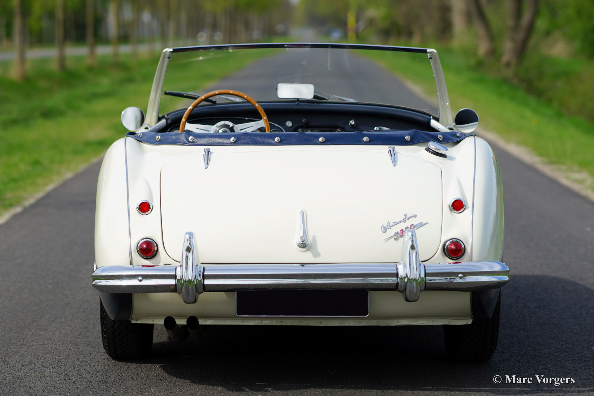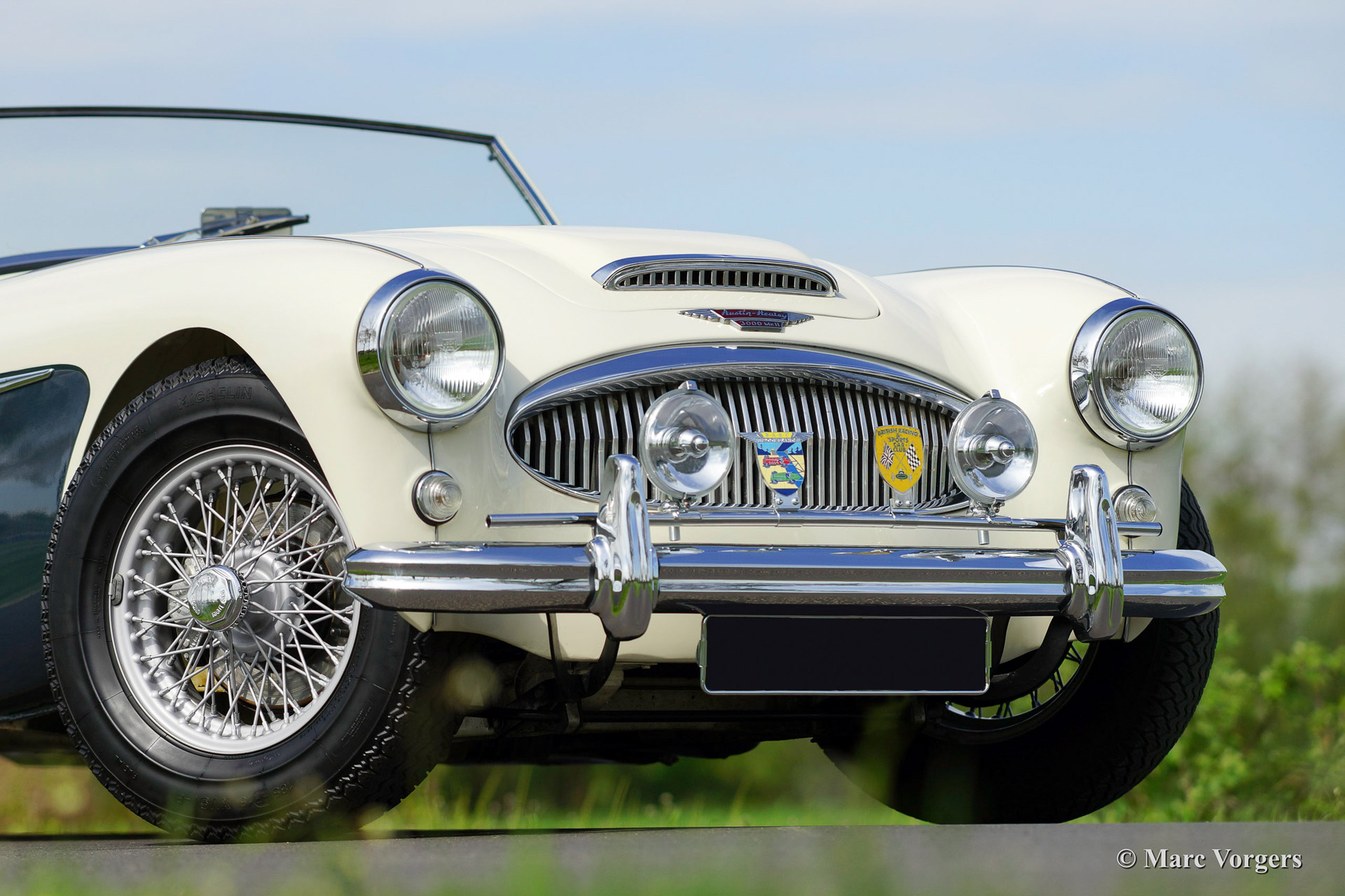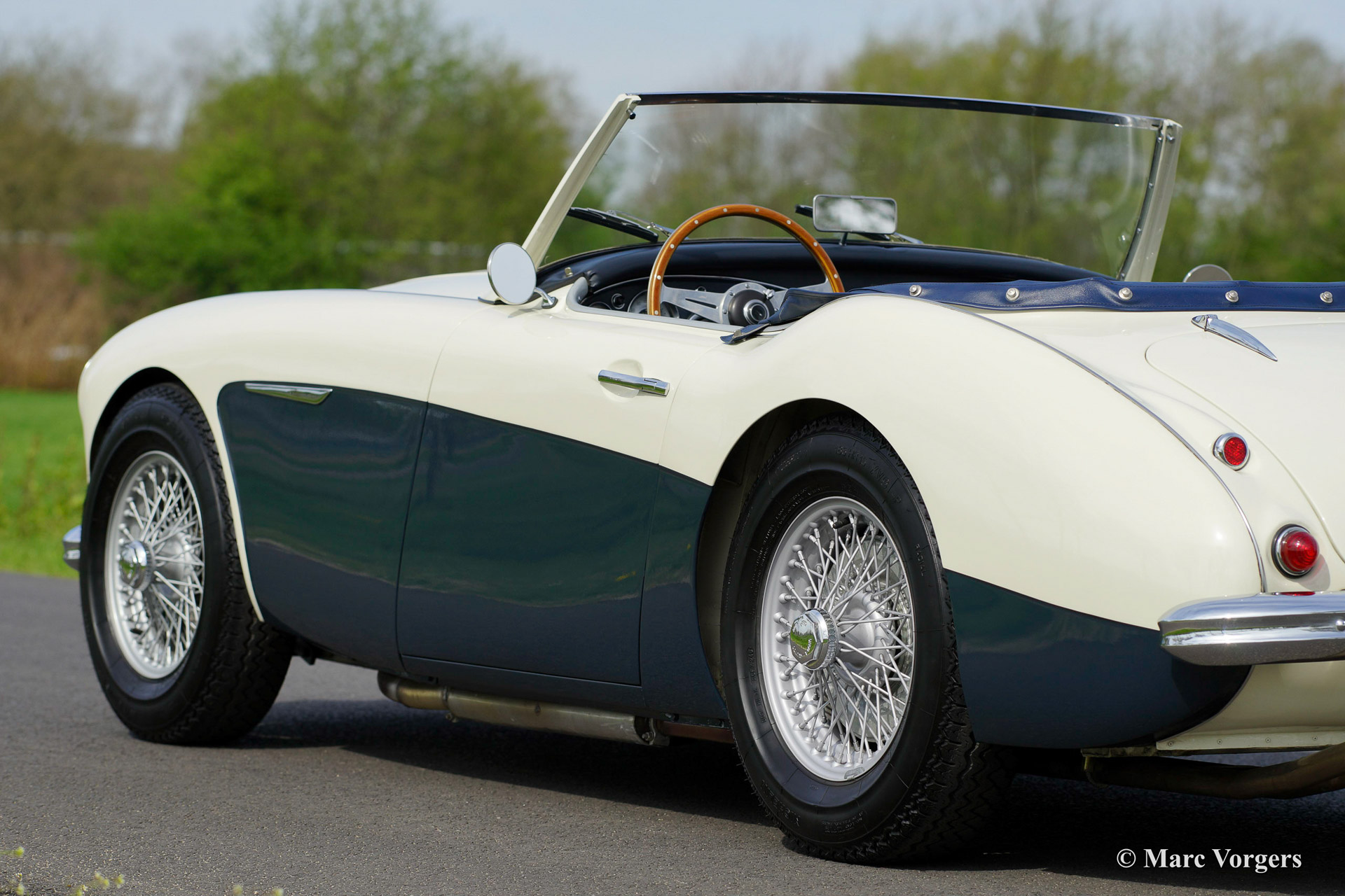 Austin Healey 3000 Mk II, bouwjaar 1962. Kleur crème wit boven donker blauw. Blauw lederen interieur en een blauwe tonneau cover. Deze prachtige Austin Healey 3000 Mk II is een schaars 3-carburateur model. De auto is een aantal jaren geleden uitvoerig gerestaureerd. Deze Healey rijdt perfect en de auto verkeert in excellente tot sublieme staat. De automobiel is uitgerust met overdrive, zilver gelakte spaakwielen, een MotoLita sportstuur met houten rand, een chroom 'badge bar' met extra lampen, een aluminium kleppendeksel en een RVS uitlaat.
