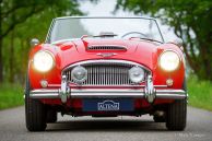 Austin Healey 3000 MK II (A) convertible, jaar 1963. Kleur Karmijnrood boven crème wit gecombineerd met een zwartlederen interieur afgebiesd met witte biezen en zwart tapijt. Zwarte vinyl cabrioletkap en kapafdekking, zwarte mohair tonneaucover. Deze fantastische Austin Healey 3000 is nieuw verkocht in de USA, in 1991 is de auto geïmporteerd in Nederland en uitgebreid gerestaureerd naar topstaat. Nu, ruim 25 jaar, en twee zorgvuldige Nederlandse eigenaren later, verkeert de auto nog steeds in een zeer goede en prachtige staat! Deze Healey 3000 MK II is de eerste van de zogenaamde ‘convertible’ modellen met de eenvoudig op te zetten en neer te laten cabrioletkap en met zwengels in de portieren afzinkbare zijruiten. Dit (BJ7) cabrioletmodel staat ook wel bekend als MK II ‘A’. De auto toont vele prachtige originele details, en is voorzien van chromen spaakwielen met ‘knock on’ wielmoeren, een badge bar met een Lucas SLR575 vérstraler en een Lucas SFT575 mistlamp (originele klassieke combinatie), Vredestein Sprint Classic banden, overdrive, wisselstroomdynamo, en K&N sportluchtfilters. De auto wordt geleverd met een FIVA-kaart en het oude Nederlandse kenteken. Een zeer begeerlijke ‘Big Healey’ in prachtige conditie, klaar om met volle teugen van te genieten!