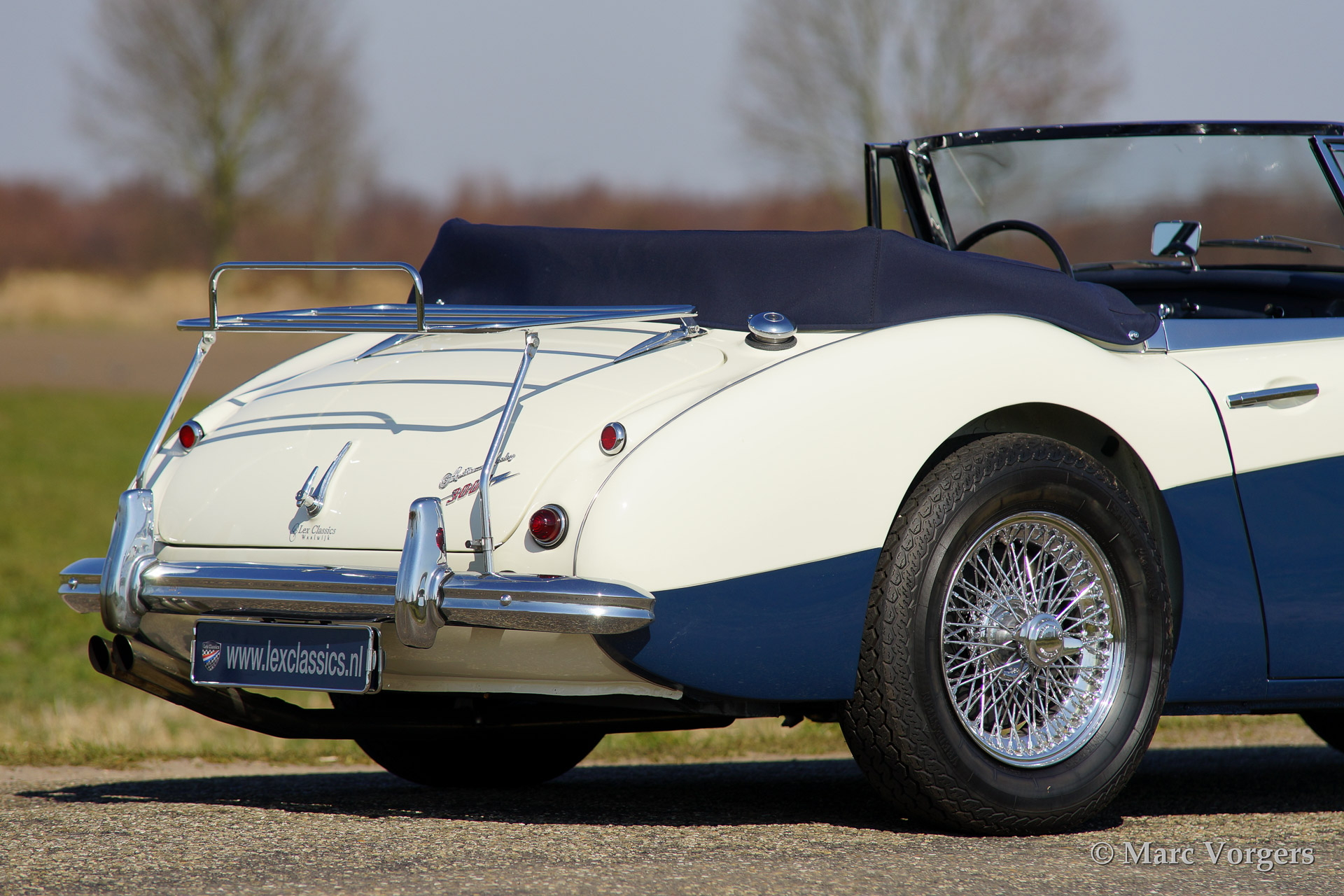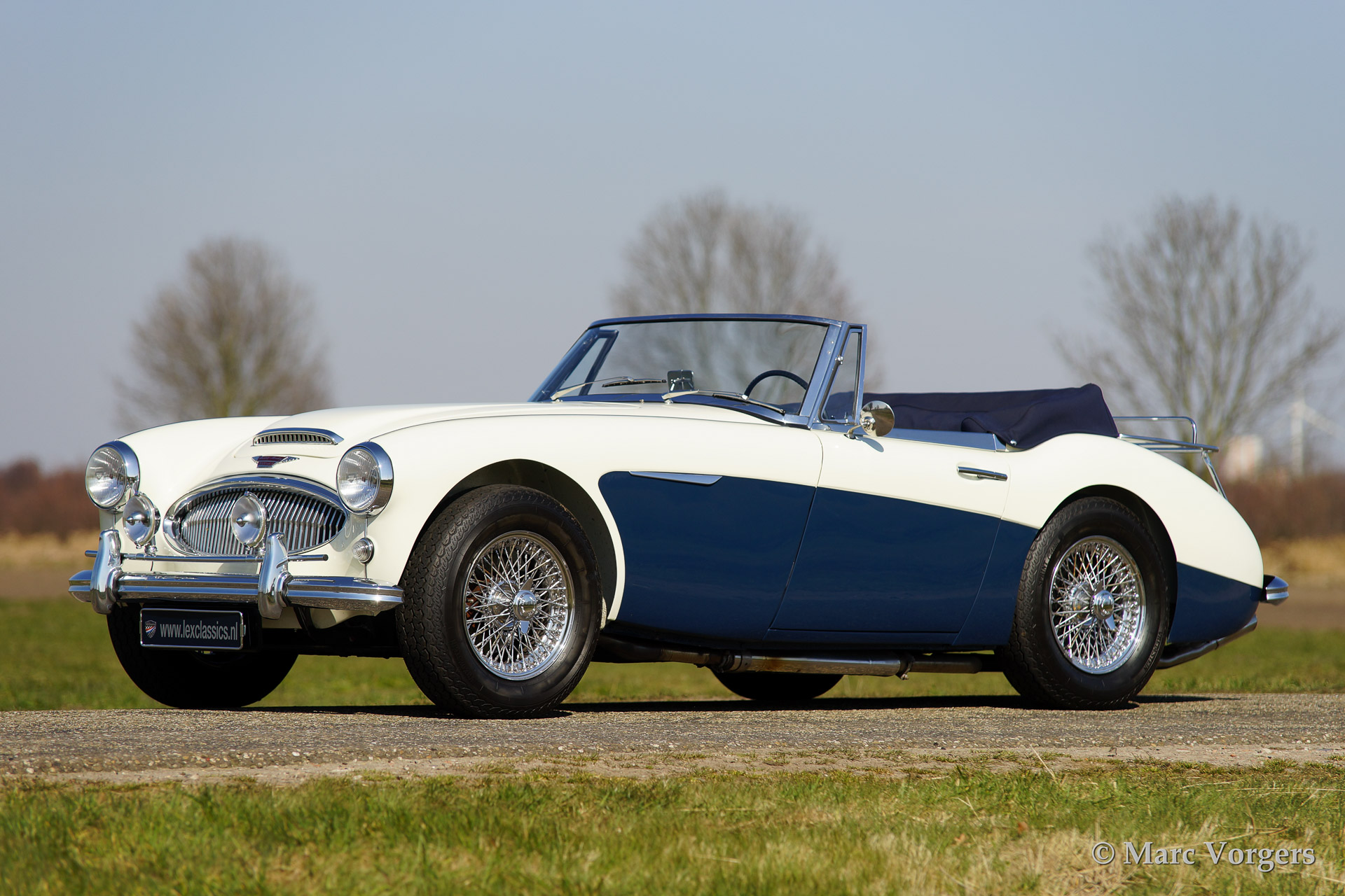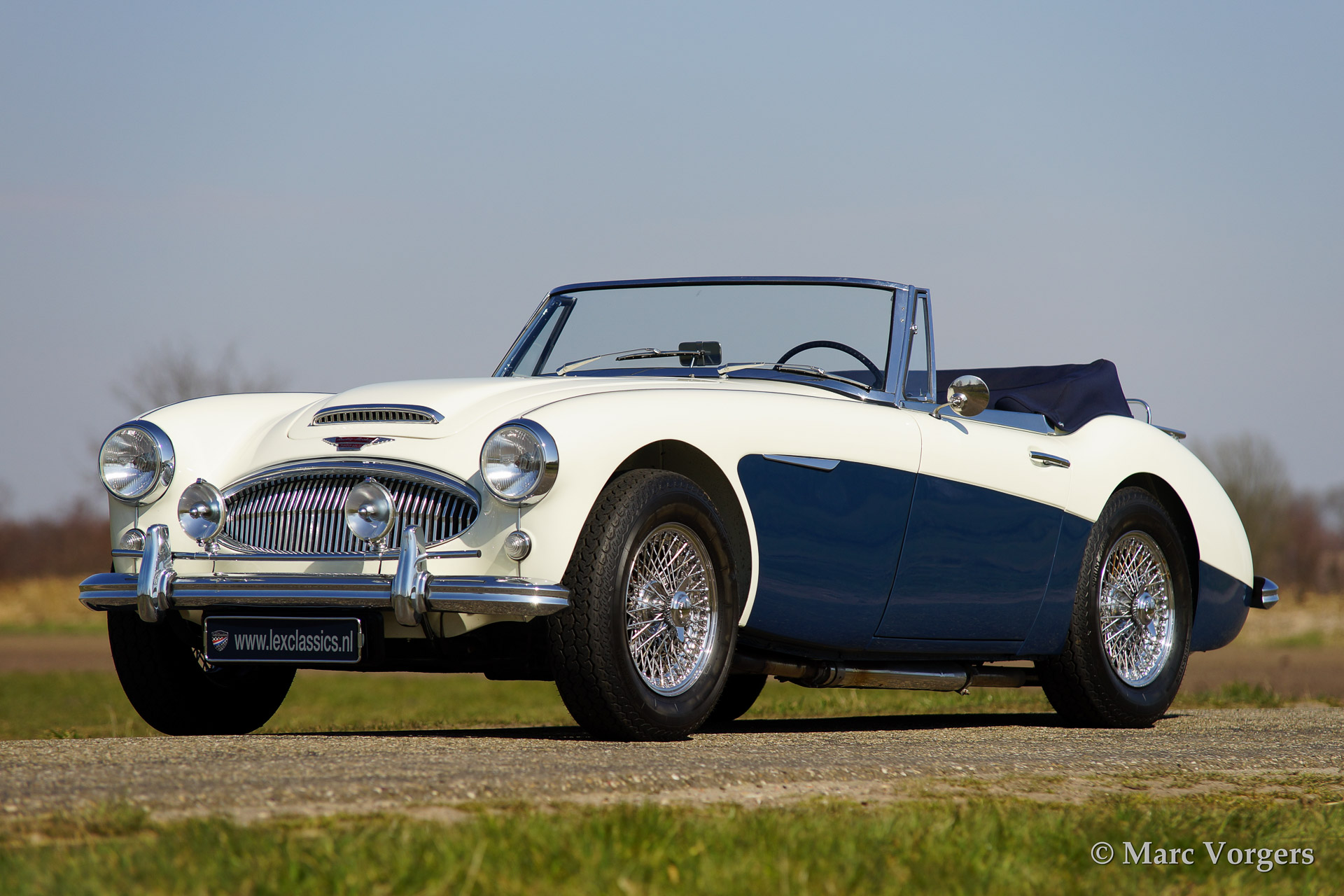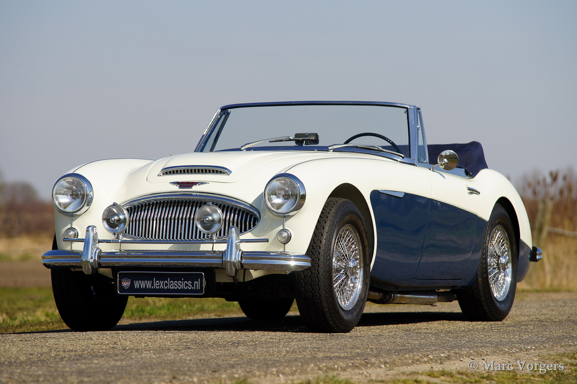 Austin Healey 3000 Mk IIa, bouwjaar 1962. Kleur 'Old English White' boven donkerblauw. Blauw lederen interieur afgebiest met witte 'piping'. Blauwe soft top en tonneau cover. De Healey 3000 Mk IIa is de eerste convertible uitvoering van de Austin Healey. De auto heeft een eenvoudig op en neer te klappen soft top en neerdraaibare zijruiten. De auto is uitgerust met spaakwielen, overdrive, RVS uitlaat, chroome 'badge bar' met extra lampen, een chroom kofferrek en een klassieke Blaupunkt radio.