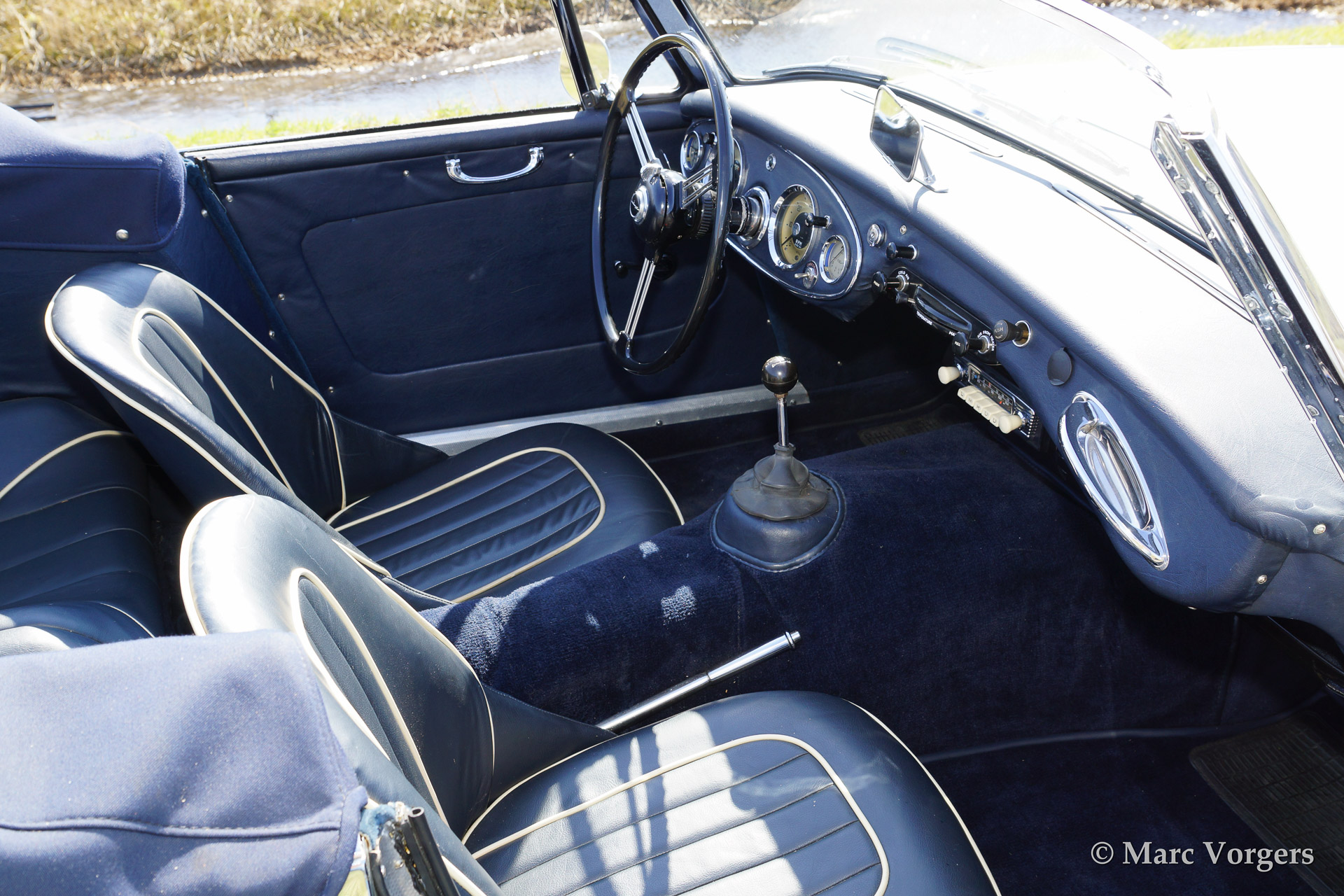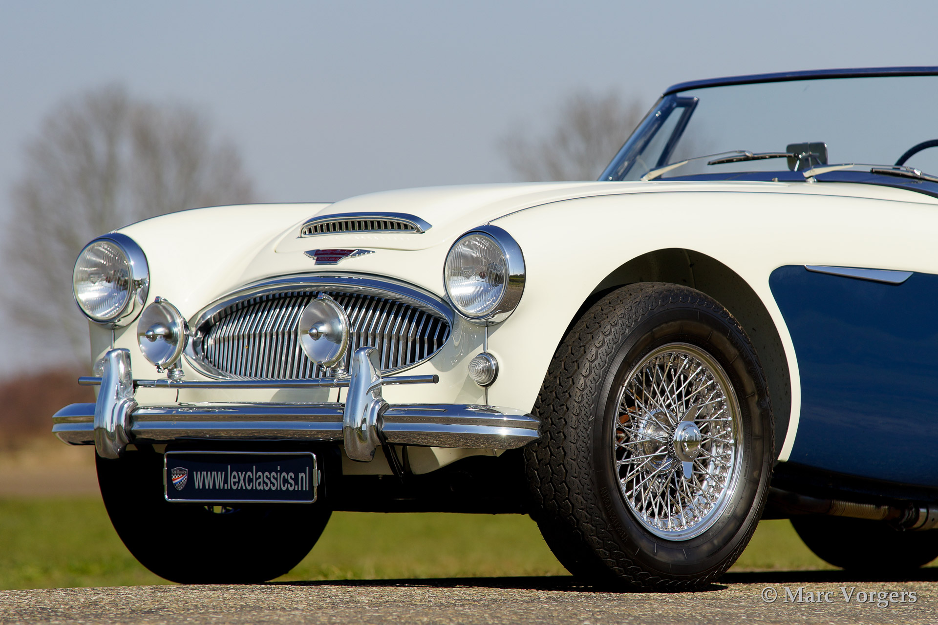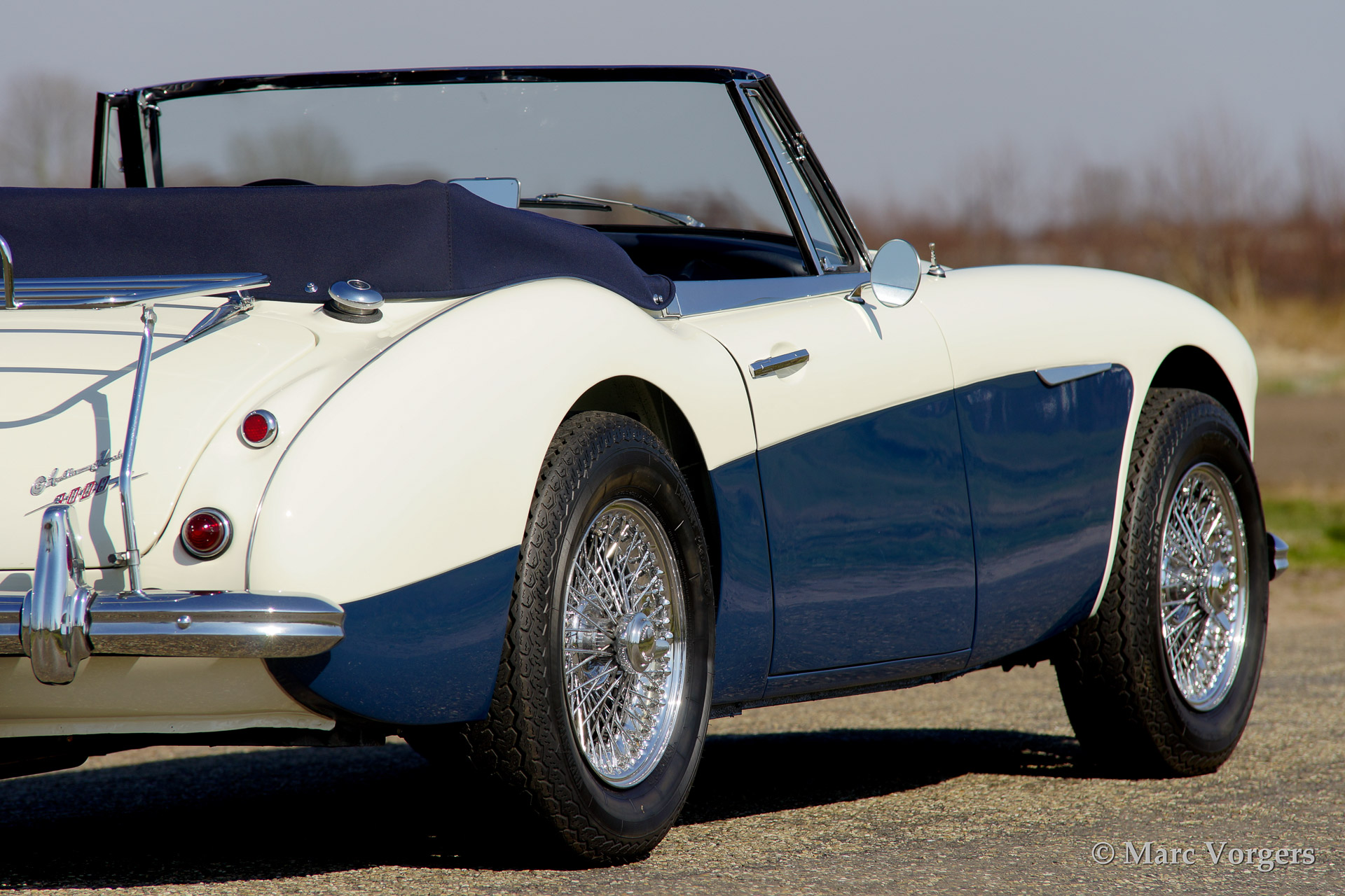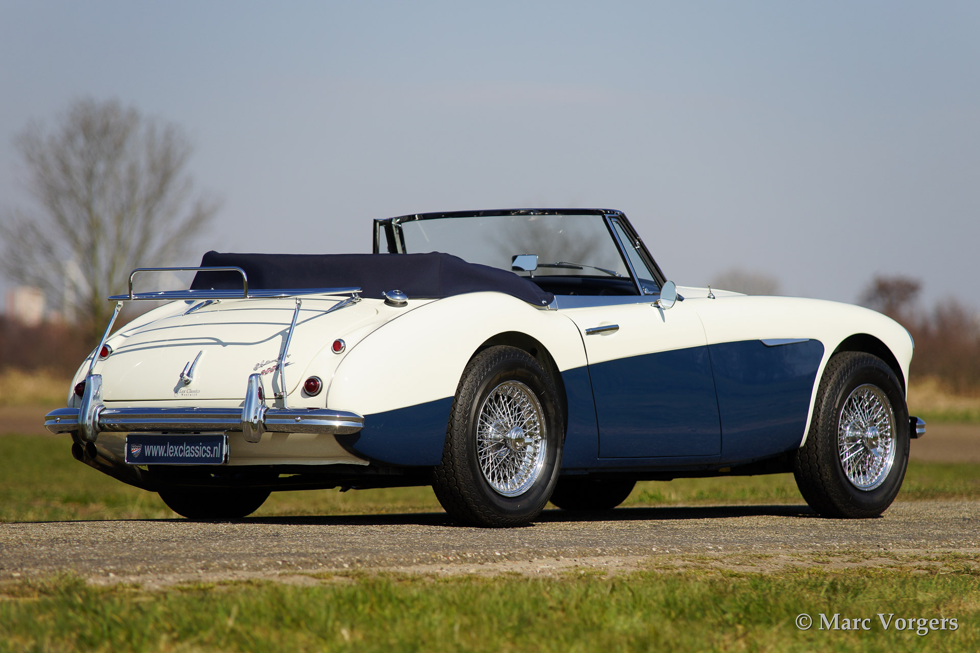 Austin Healey 3000 Mk IIa, bouwjaar 1962. Kleur 'Old English White' boven donkerblauw. Blauw lederen interieur afgebiest met witte 'piping'. Blauwe soft top en tonneau cover. De Healey 3000 Mk IIa is de eerste convertible uitvoering van de Austin Healey. De auto heeft een eenvoudig op en neer te klappen soft top en neerdraaibare zijruiten. De auto is uitgerust met spaakwielen, overdrive, RVS uitlaat, chroome 'badge bar' met extra lampen, een chroom kofferrek en een klassieke Blaupunkt radio.