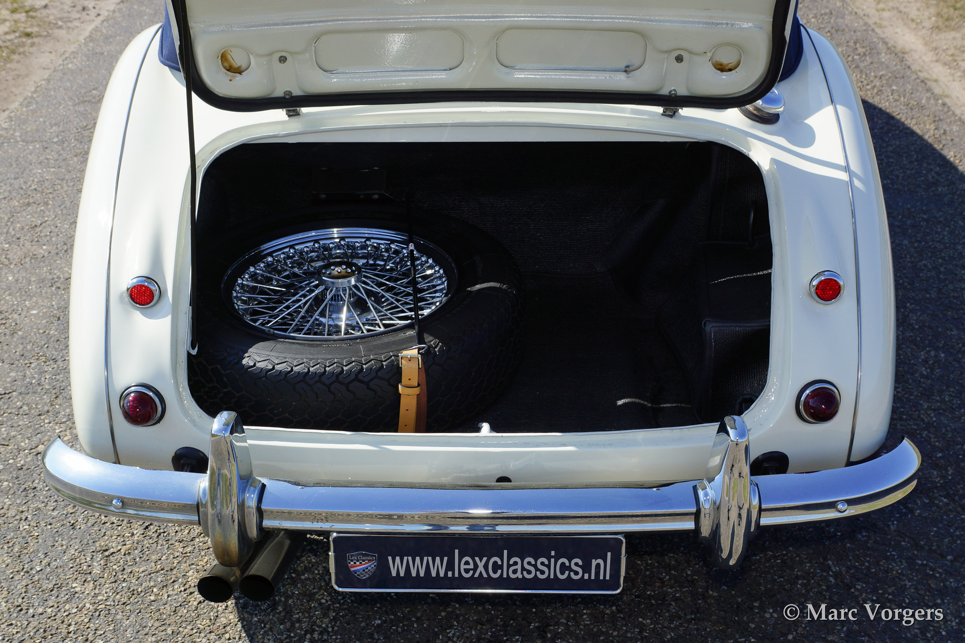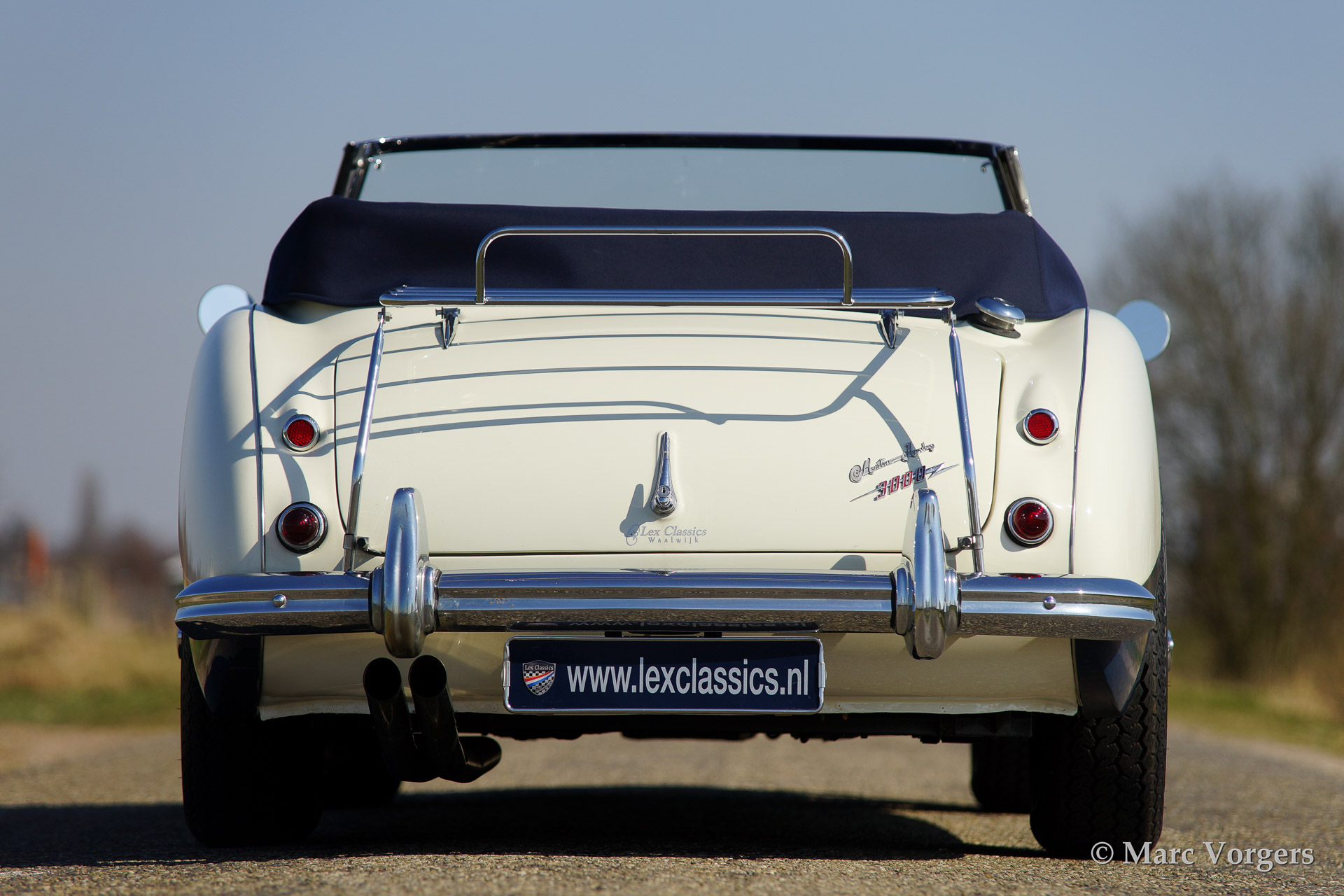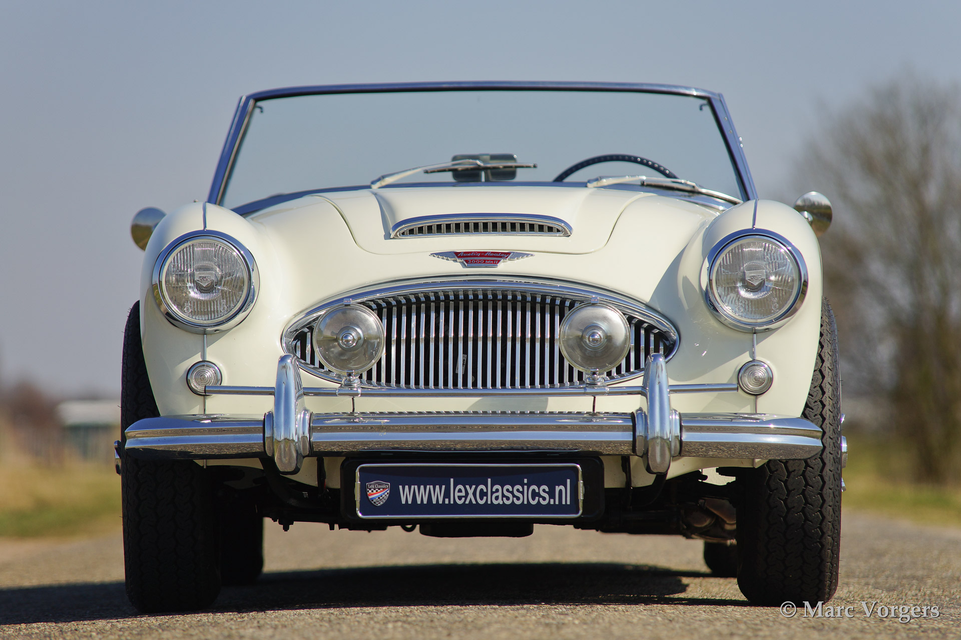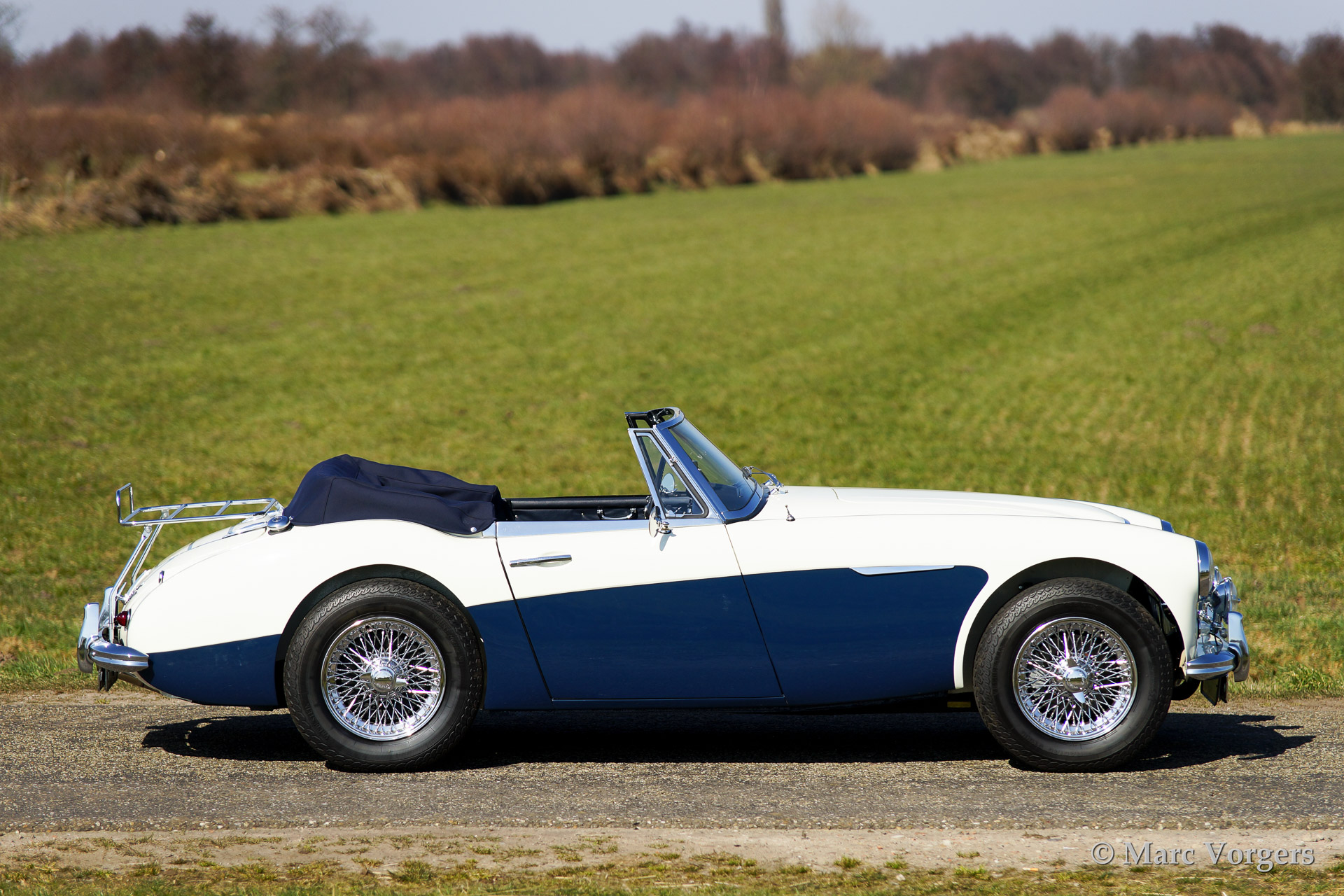 Austin Healey 3000 Mk IIa, bouwjaar 1962. Kleur 'Old English White' boven donkerblauw. Blauw lederen interieur afgebiest met witte 'piping'. Blauwe soft top en tonneau cover. De Healey 3000 Mk IIa is de eerste convertible uitvoering van de Austin Healey. De auto heeft een eenvoudig op en neer te klappen soft top en neerdraaibare zijruiten. De auto is uitgerust met spaakwielen, overdrive, RVS uitlaat, chroome 'badge bar' met extra lampen, een chroom kofferrek en een klassieke Blaupunkt radio.