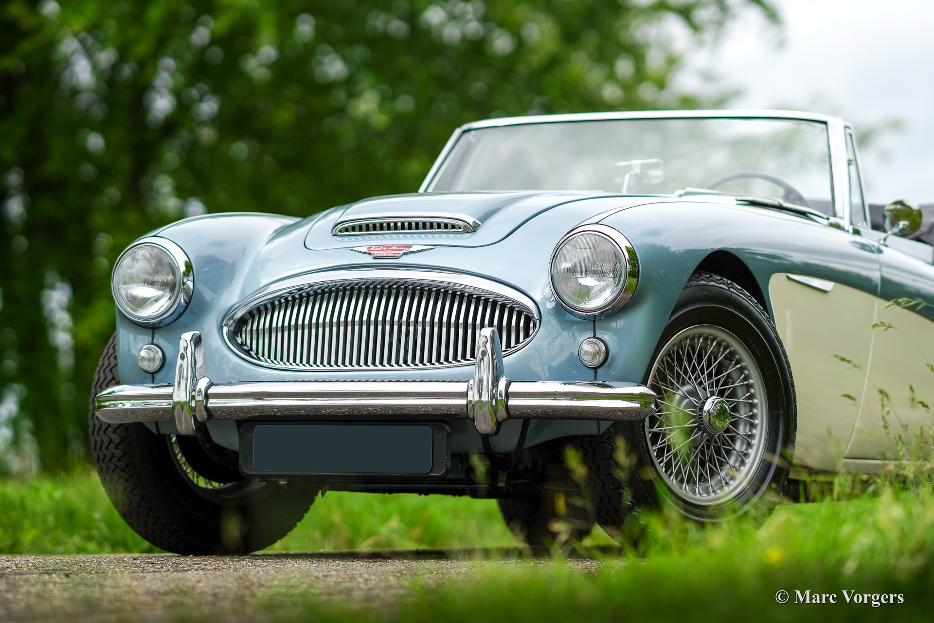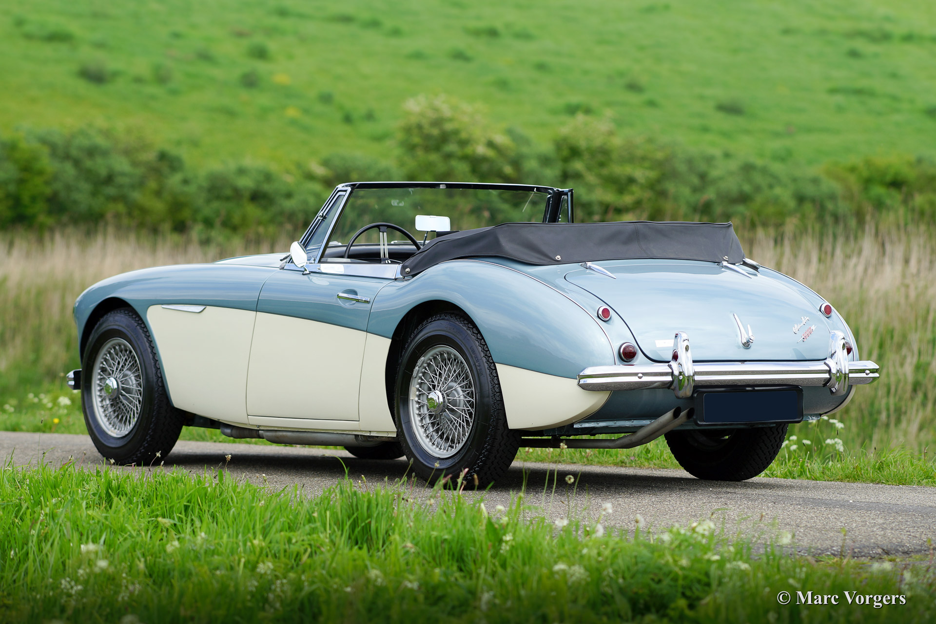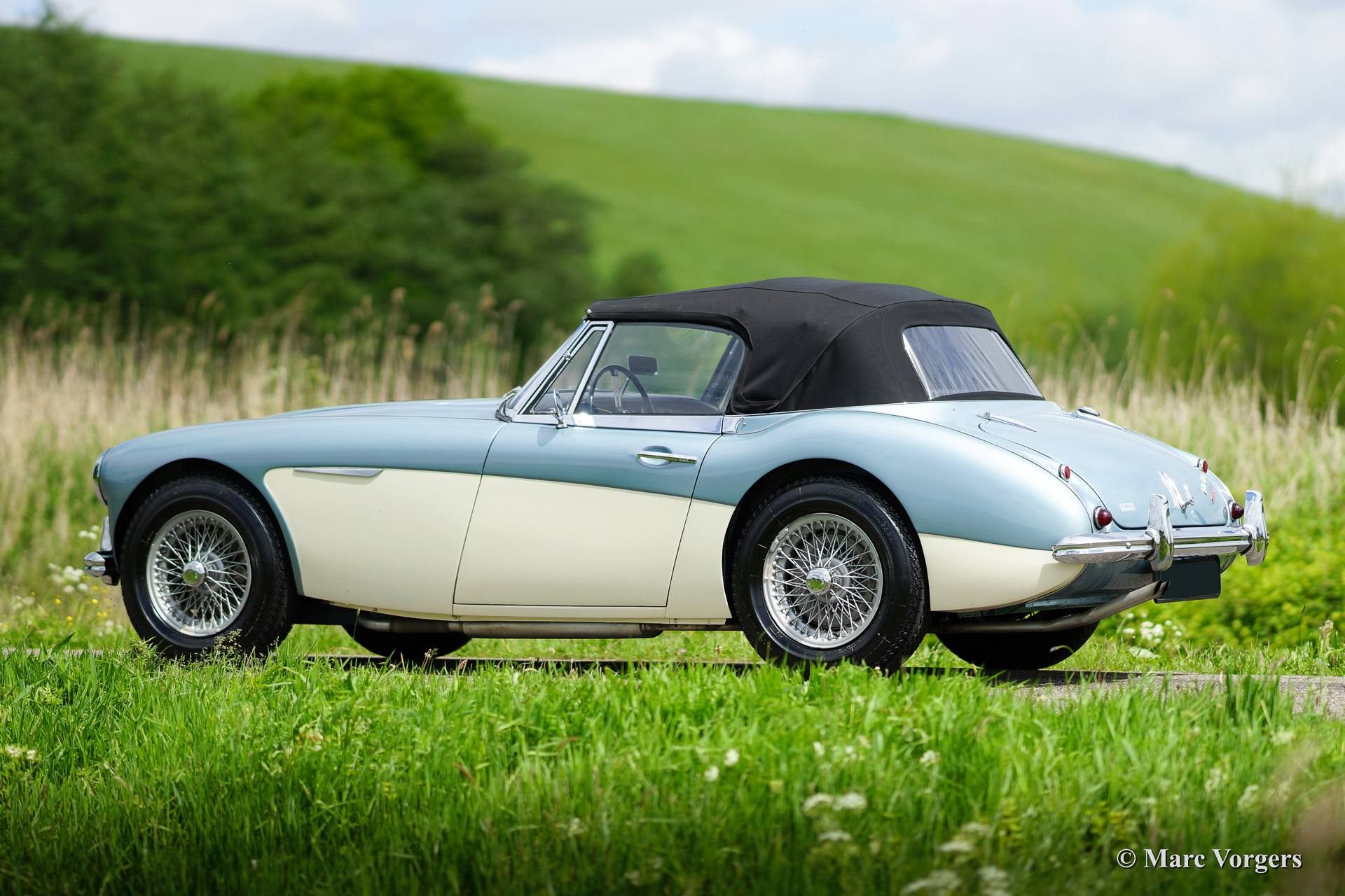 Austin Healey 3000 Mk IIa (convertible), bouwjaar 1963. Kleur 'Ice Blue' metallic boven crème wit. Zwart lederen interieur, zwarte mohair soft top en tonneau cover. Deze fantastische Austin Healey werd volledig en perfect gerestaureerd vanaf de blanke plaat door Piet Mozes Restauraties in Heerenveen. De restauratie was gereed in het jaar 2008 en de auto heeft sindsdien slechts 975 mijl gereden!