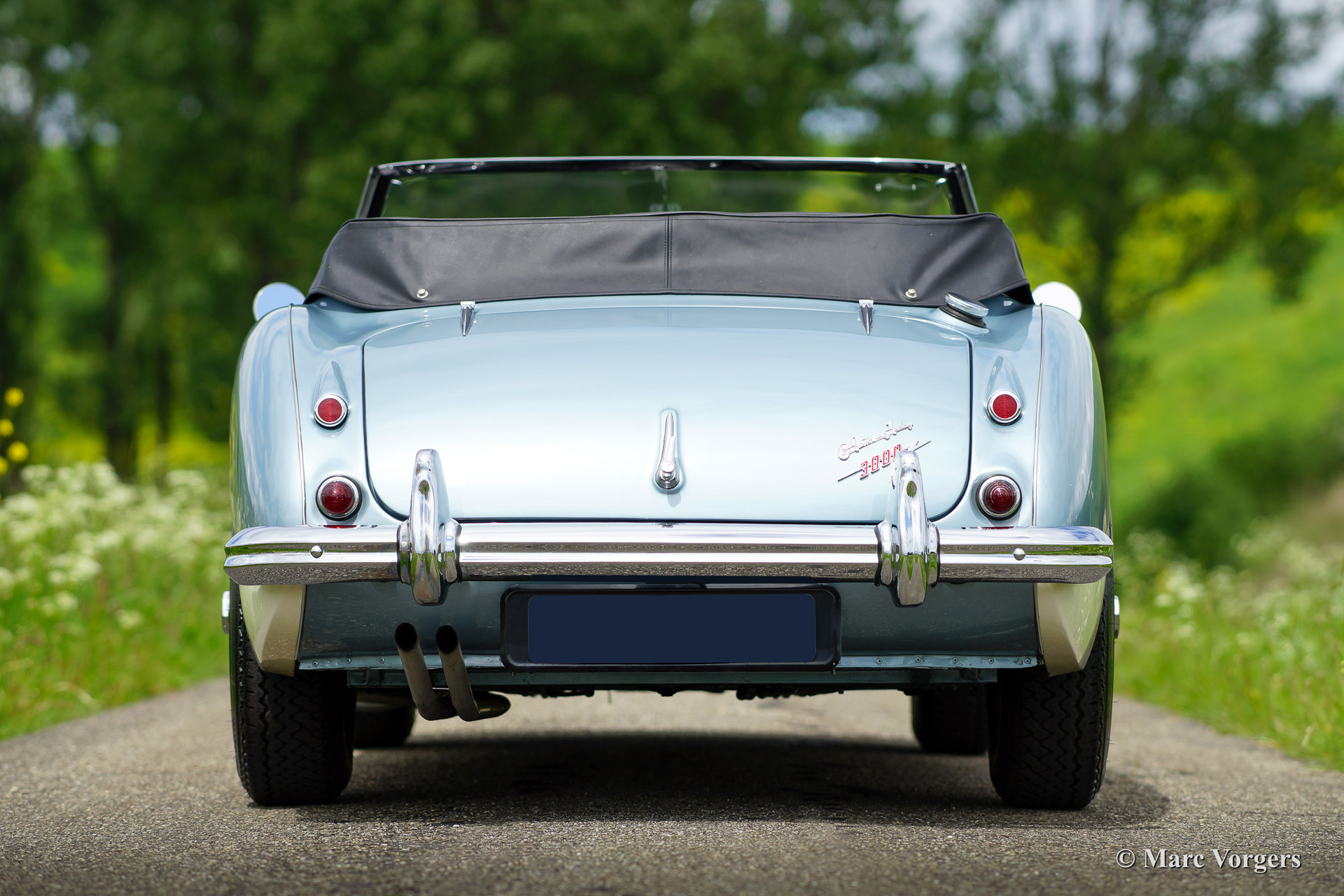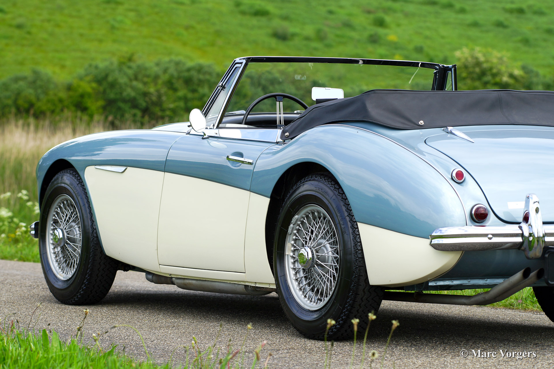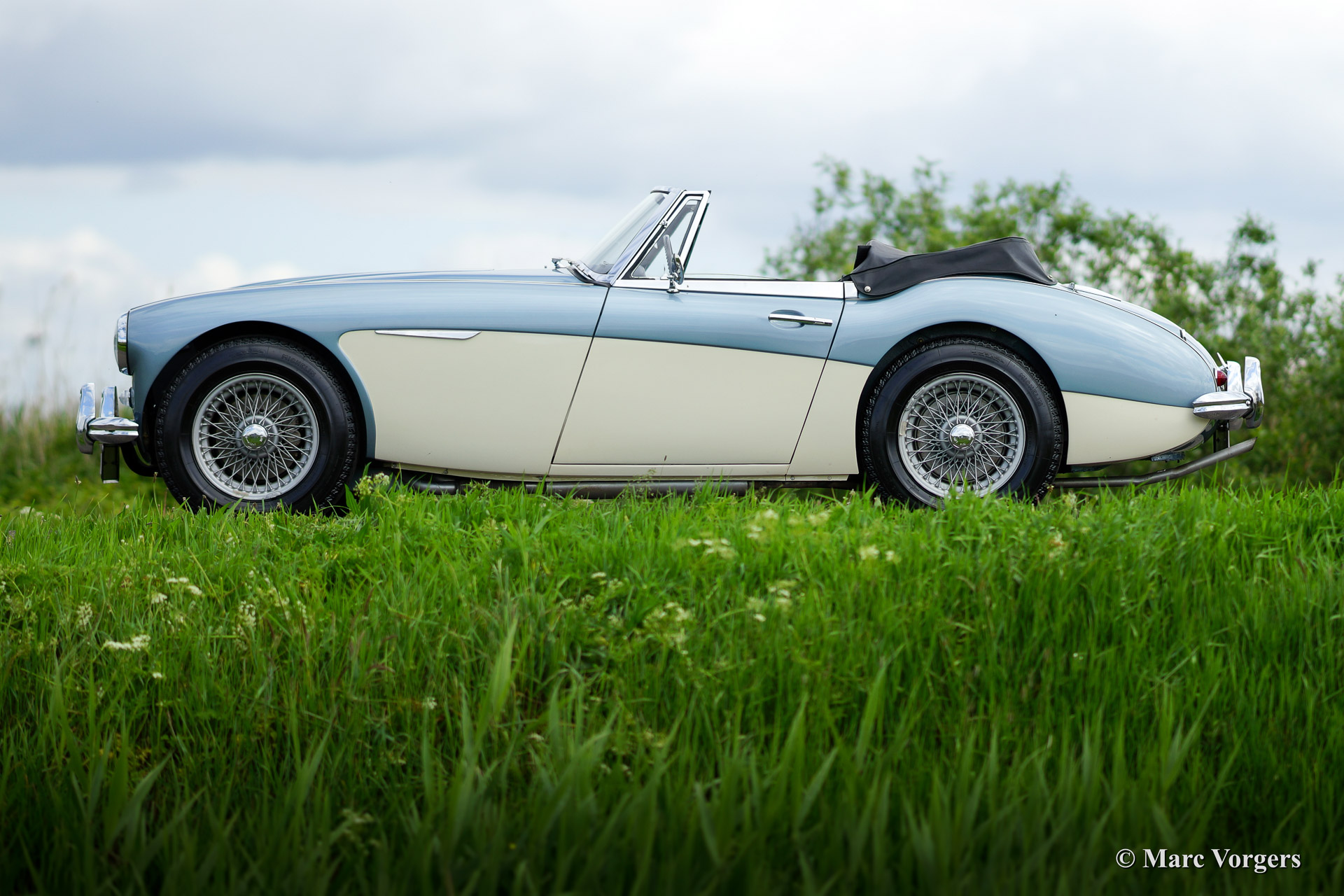 Austin Healey 3000 Mk IIa (convertible), bouwjaar 1963. Kleur 'Ice Blue' metallic boven crème wit. Zwart lederen interieur, zwarte mohair soft top en tonneau cover. Deze fantastische Austin Healey werd volledig en perfect gerestaureerd vanaf de blanke plaat door Piet Mozes Restauraties in Heerenveen. De restauratie was gereed in het jaar 2008 en de auto heeft sindsdien slechts 975 mijl gereden!