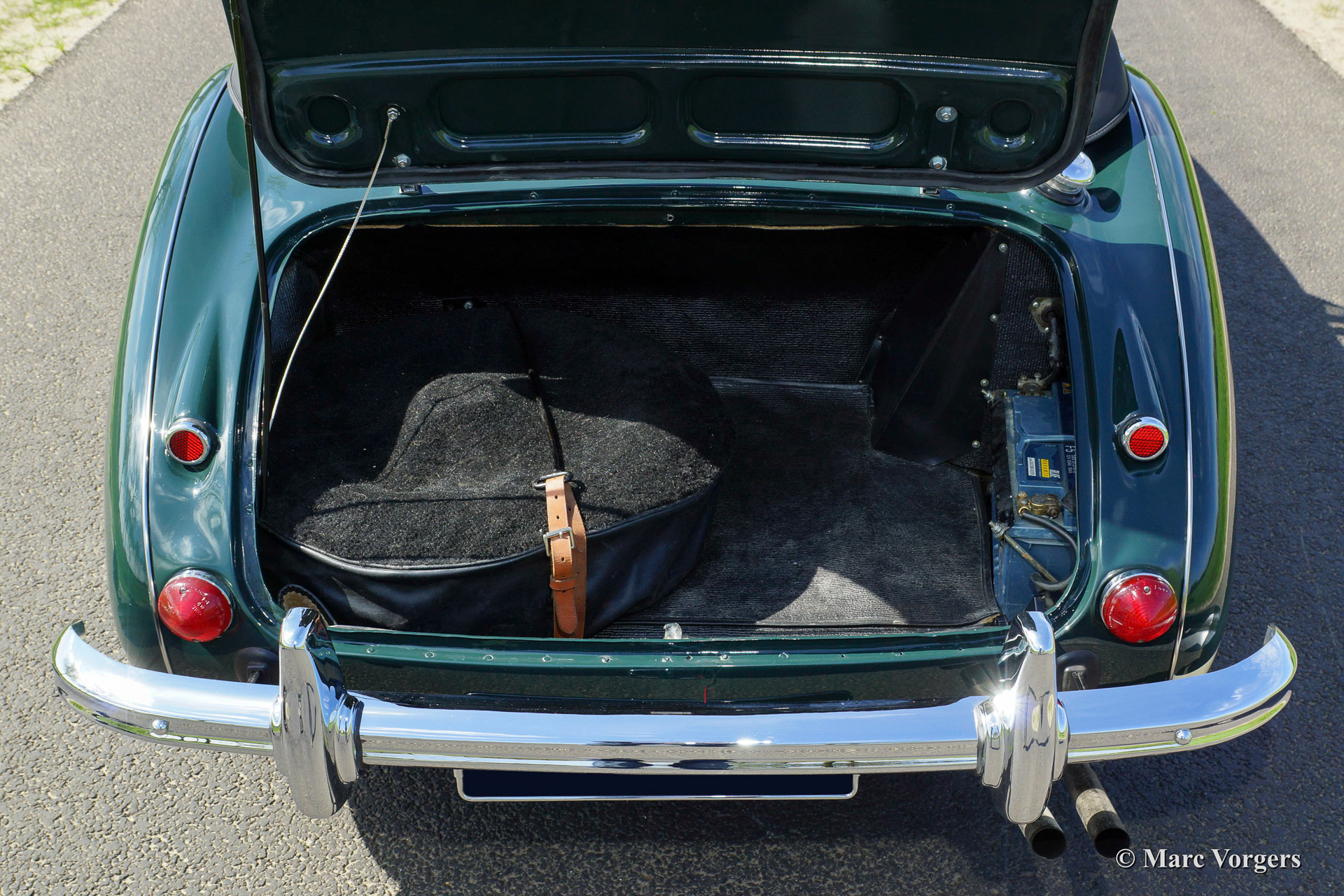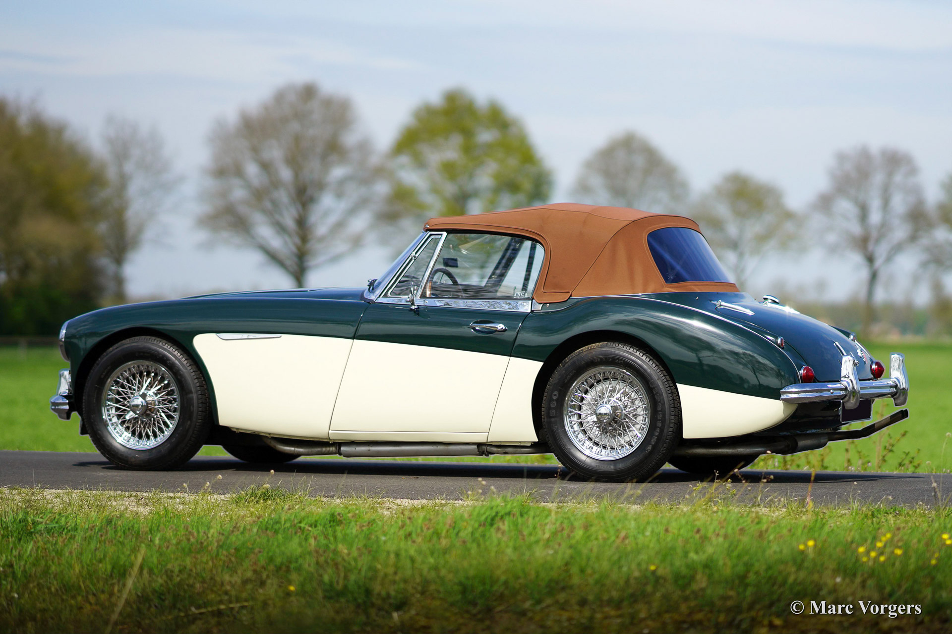 Austin Healey 3000 Mk III phase 1, bouwjaar 1964. Kleur donkergroen boven crème wit. Zwart lederen interieur afgebiest met witte 'piping', bruine mohair soft top en een zwarte hood cover. Deze geweldige 'Big Healey' werd enige jaren geleden uitvoerig gerestaureerd. De auto verkeert in excellente tot sublieme staat en de auto rijdt perfect! De Healey Mk III is een zogenaamde 'convertible' met een vast gemonteerde eenvoudig te openen en te sluiten soft top. Net als de Mk IIa is de Mk III voorzien van op/neer draaibare zijruiten. Deze Healey heeft de volgende opties: chroom spaakwielen, overdrive, ean MotoLita sportstuur met houten rand en een RVS uitlaat.
