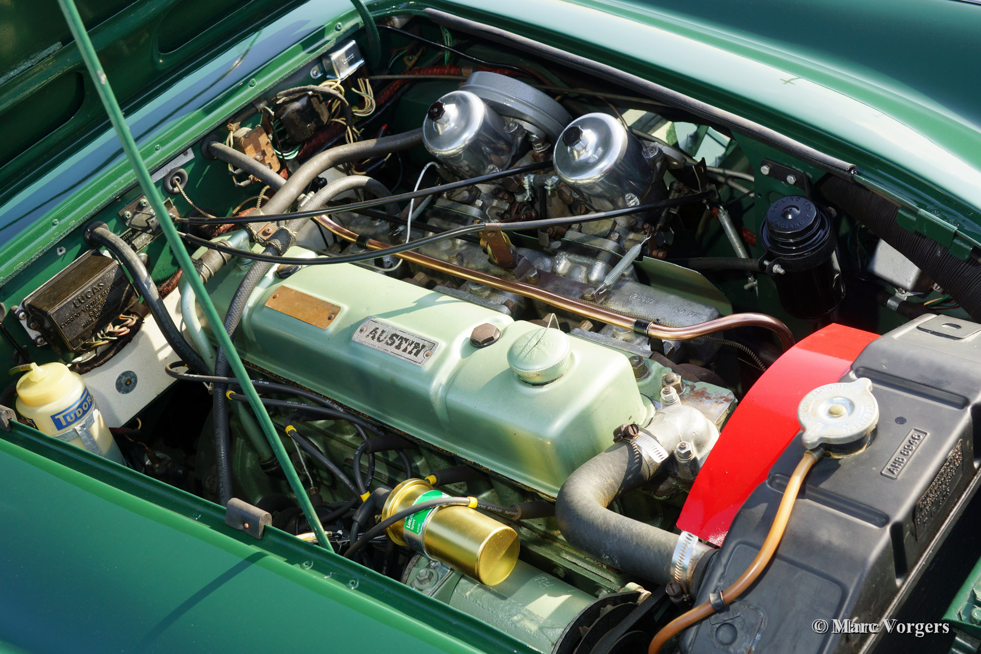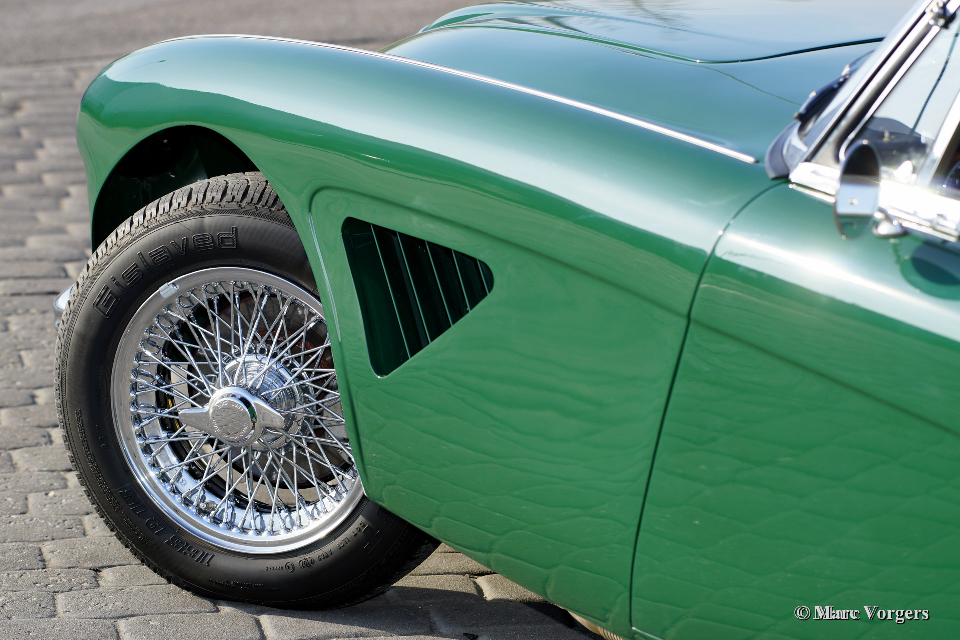 Austin Healey 3000 Mk III phase 1, bouwjaar 1965. Kleur groen met een zwart lederen interieur. Zwarte soft top en hood cover. Deze ‘big Healey’ verkeert in zeer goede staat. De motor werd gereviseerd en deze werd aangepast voor het gebruik van loodvrije benzine. De auto is uitgerust met rembekrachtiging, een oliekoeler en elektronische ontsteking.