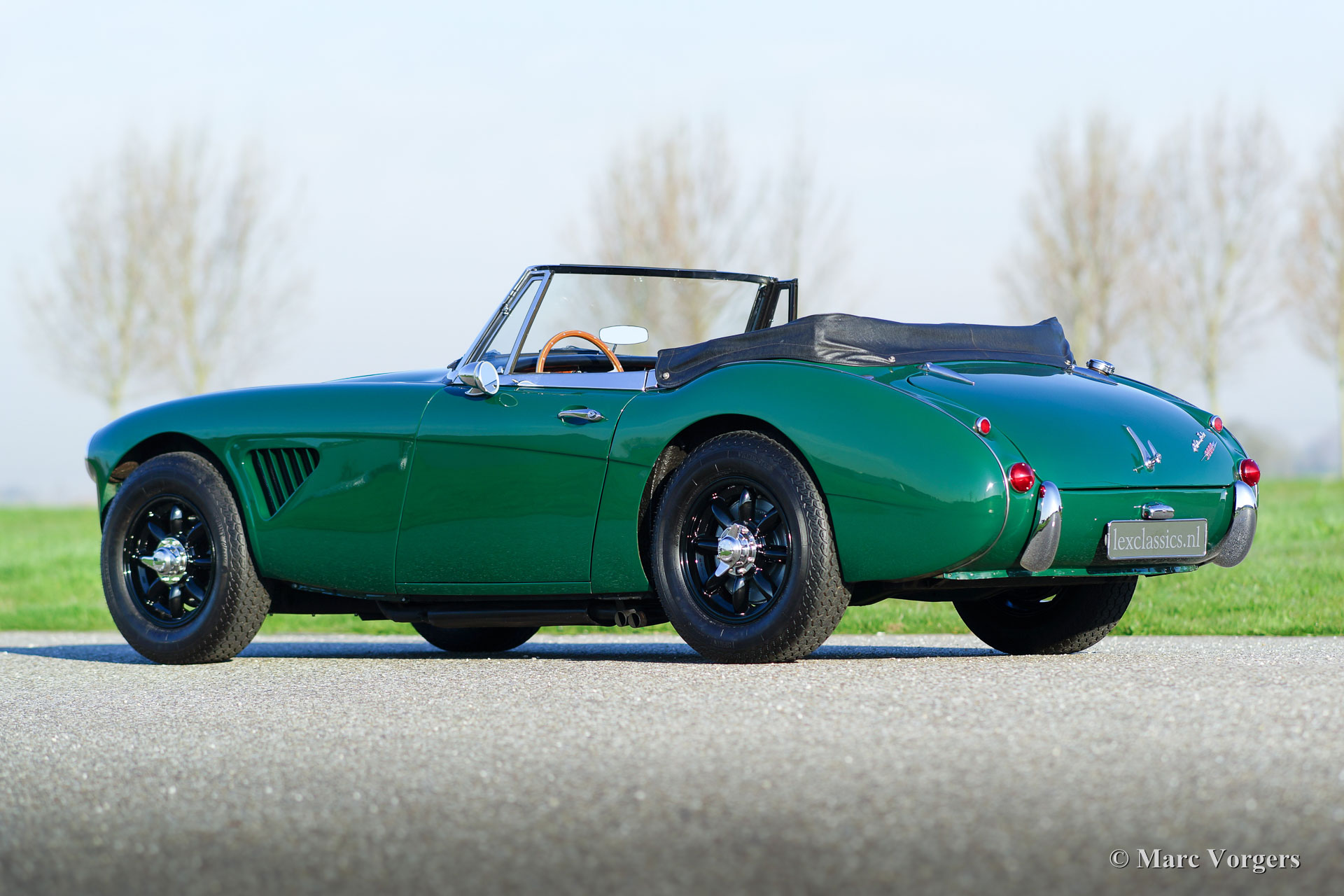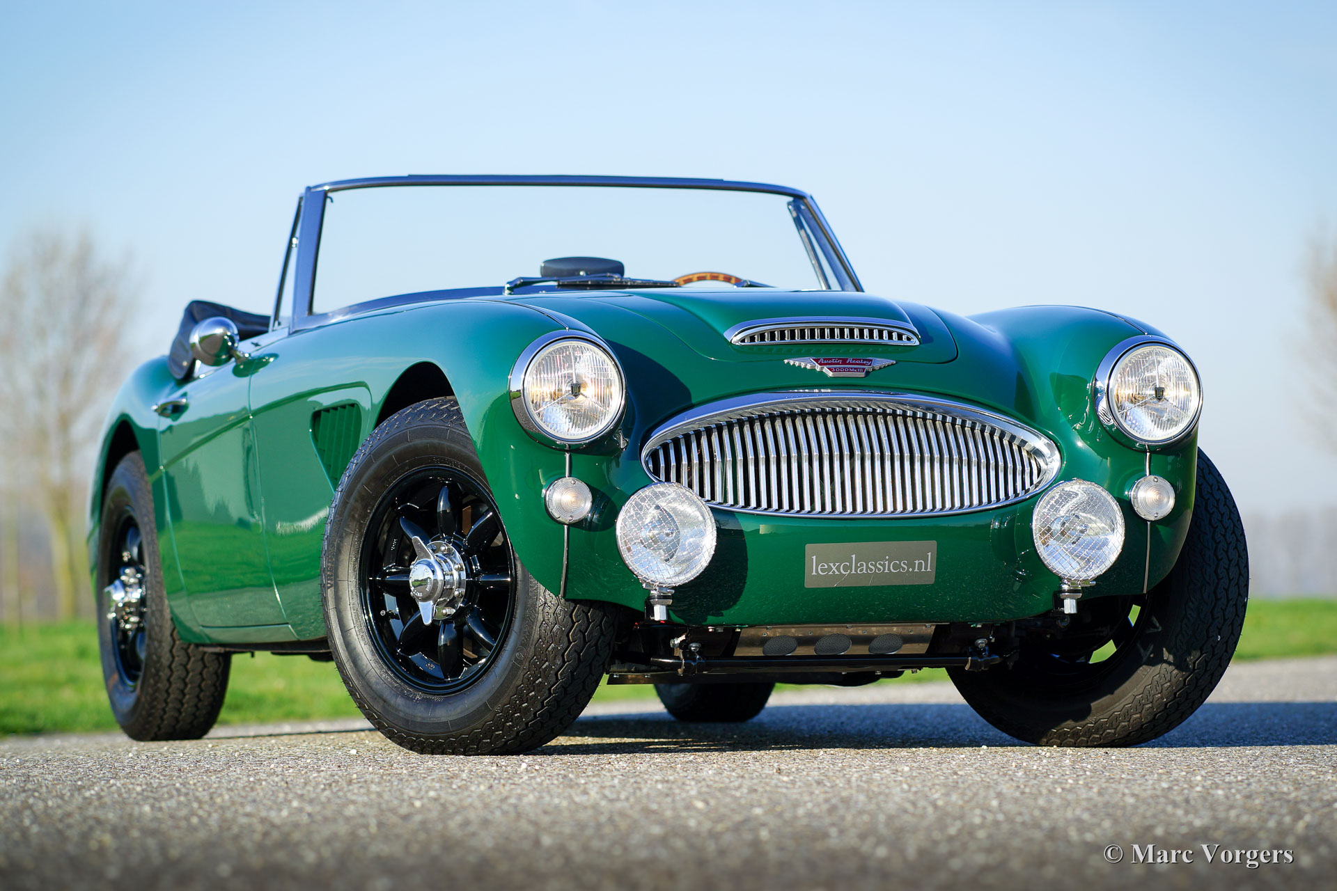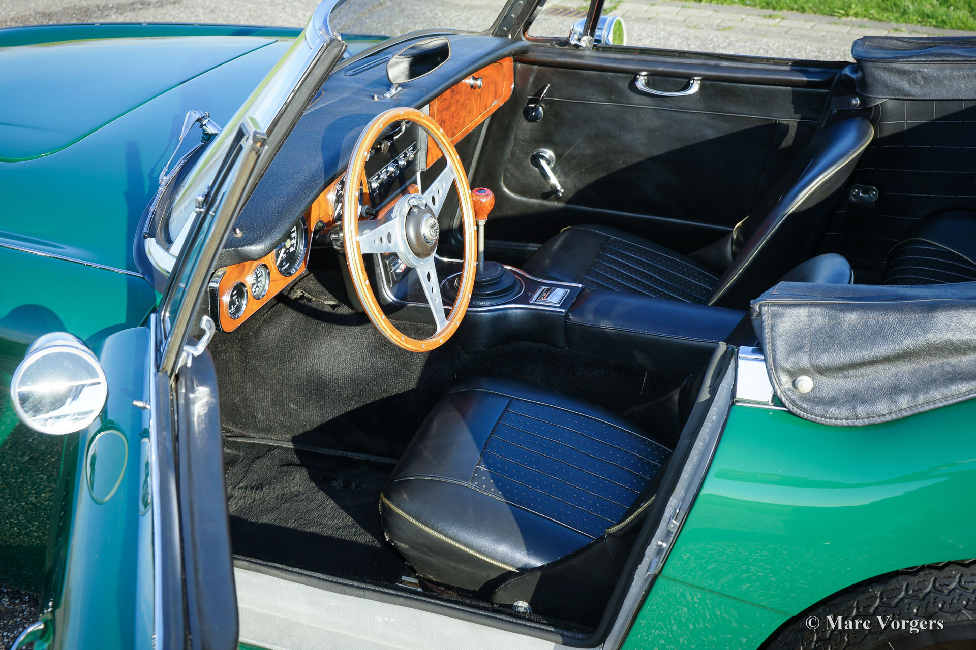 Austin Healey 3000 Mk III phase 1, jaar 1965. Kleur groen met een zwart interieur en zwarte lichtmetalen Minilite wielen. Deze stoere ‘Big Healey’ verkeert in zeer goede tot excellente staat. In het jaar 2015 werd de auto voorzien van nieuwe lak. Foto’s van deze werkzaamheden zijn aanwezig. Deze sportieve Austin Healey is uitgerust met drie dubbele Weber carburateurs waardoor het vermogen uitkomt op 170 pk. De auto is voorzien van Minilite-type wielen, verstralers aan de voorzijde, chroom bumper-rozetten achter, overdrive, zwarte mohair hood-cover, MotoLita stuur met houten rand, 2 buitenspiegels, elektronische ontsteking en een aluminium kleppendeksel.