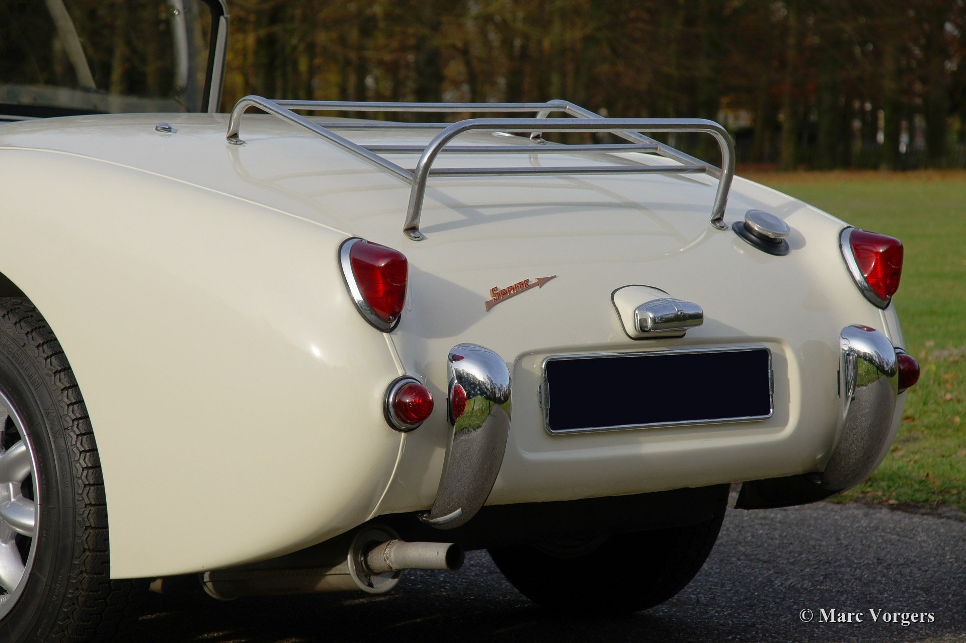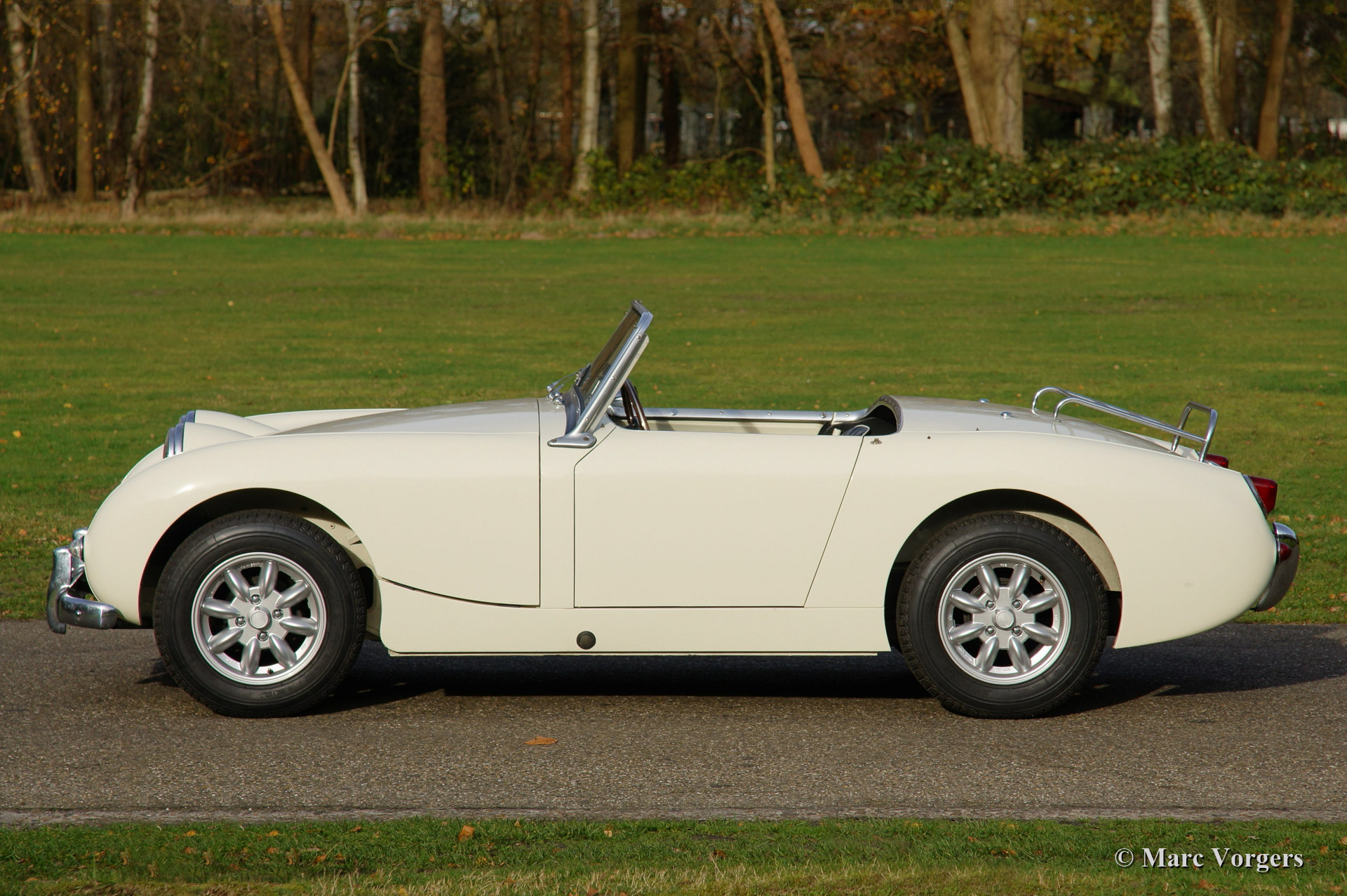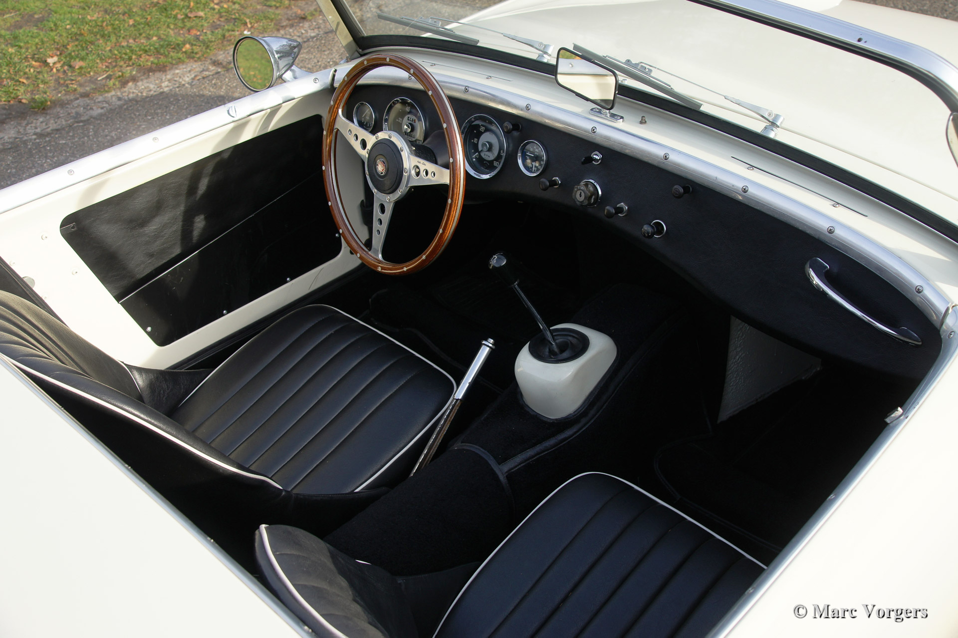 Austin Healey Sprite Mk I 'Frog Eye'. bouwjaar 1959. Kleur 'Old English White' met een zwart interieur afgewerkt met witte biezen. Deze schitterende 'Frog Eye' is voorzien van Minilite type wielen en een MotoLita stuur met houten rand.