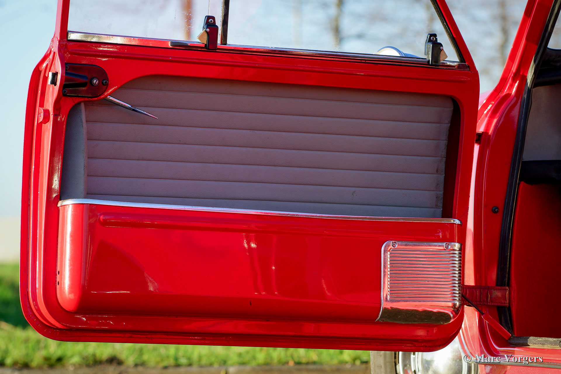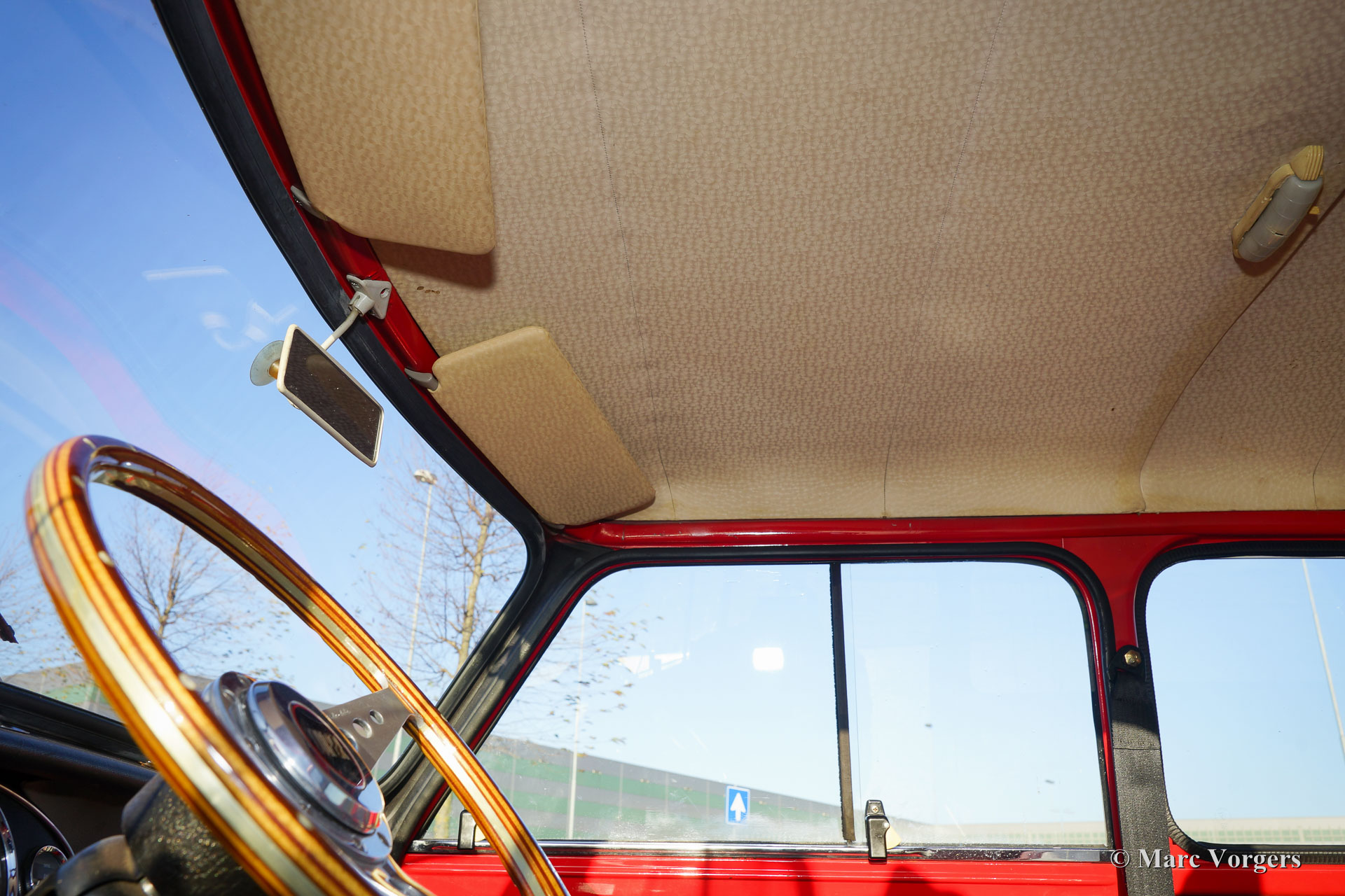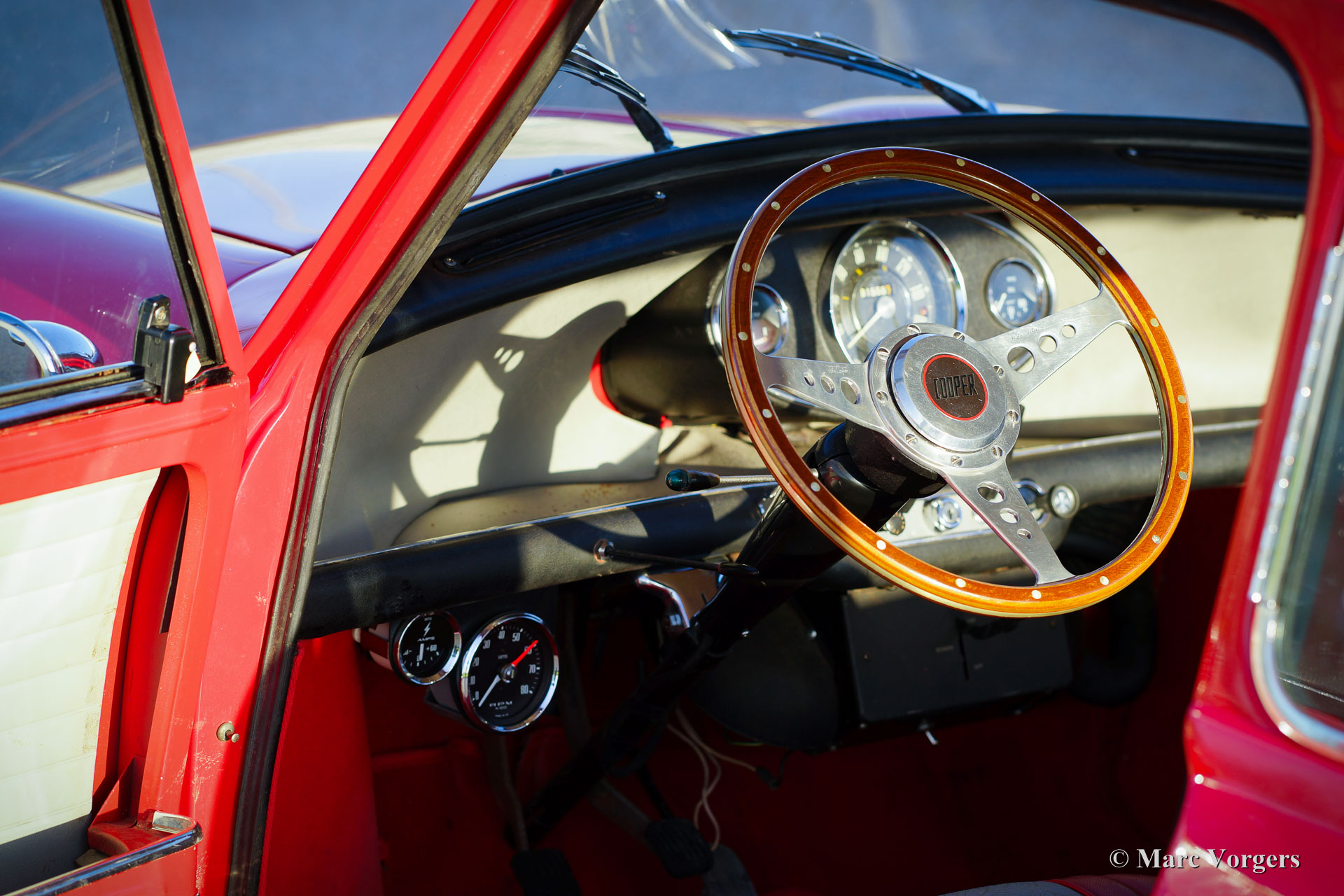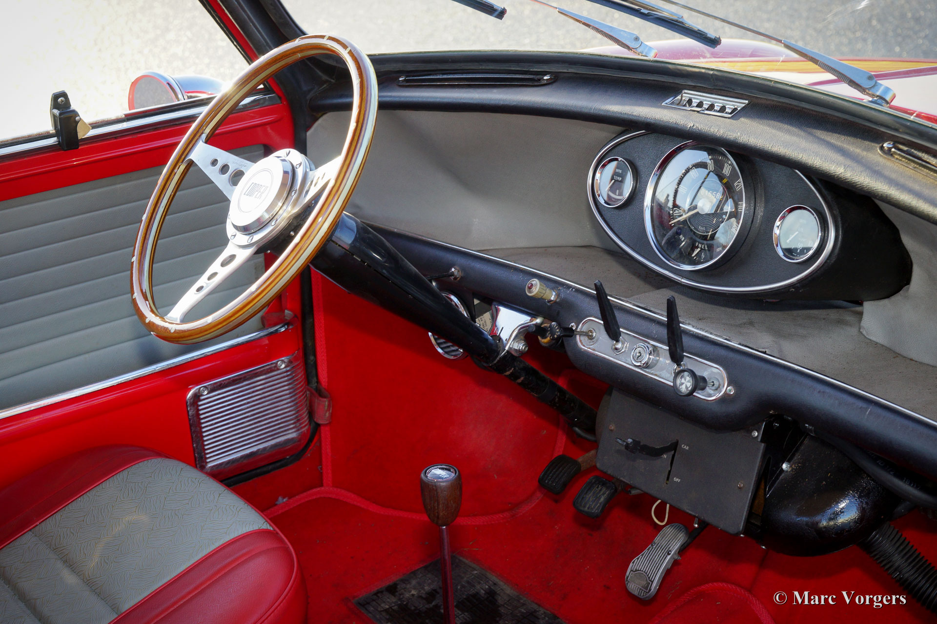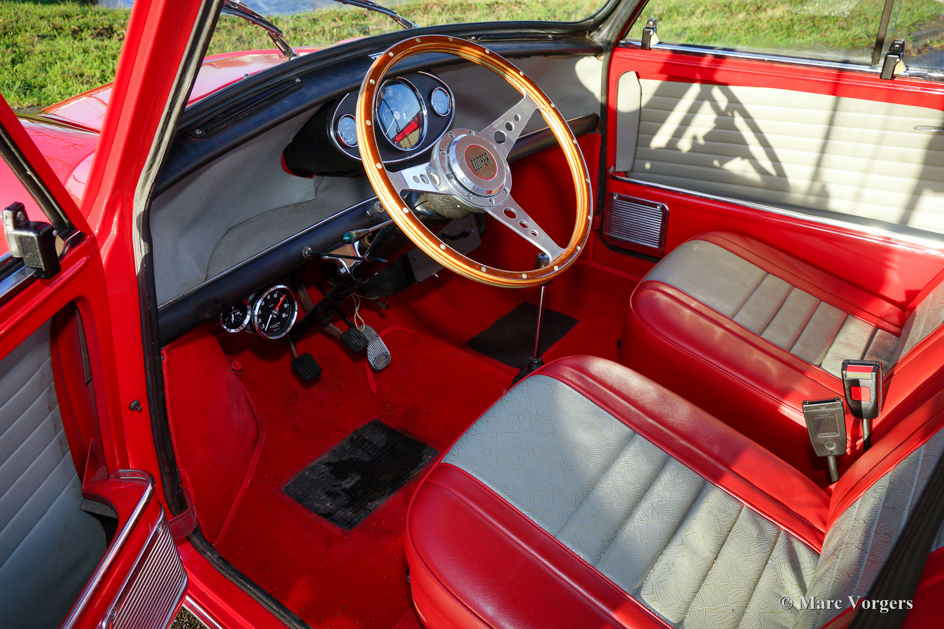 Austin Mini Cooper Mk I, bouwjaar 1966. Kleur ‘Flame Red’ met een tweekleuring grijs/rood vinyl interieur en rode vloerbedekking. Deze zeer originele Mini Cooper verkeert in zeer goede staat! Het interieur is origineel en zeer gaaf, verder zijn alle originele details aanwezig zoals de 10 inch wielen en de schijfremmen aan de voorwielen. Dit is uw kans om in het bezit te komen van een schaarse en gezochte originele Mini Cooper!