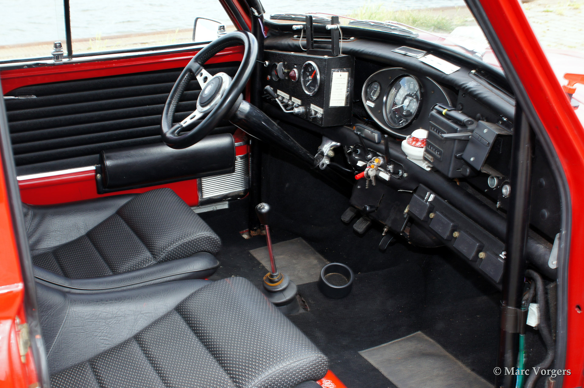 Austin Mini Cooper S Mk I, bouwjaar 1966. Kleur rood met een wit dak. Zwart rally interieur. Deze geweldige originele Mini Cooper S werd in het verleden uitvoerig gerestaureerd. De auto is prachtig uitgevoerd en geprepareerd als 'works' uitvoering. Werkelijk een plaatje!