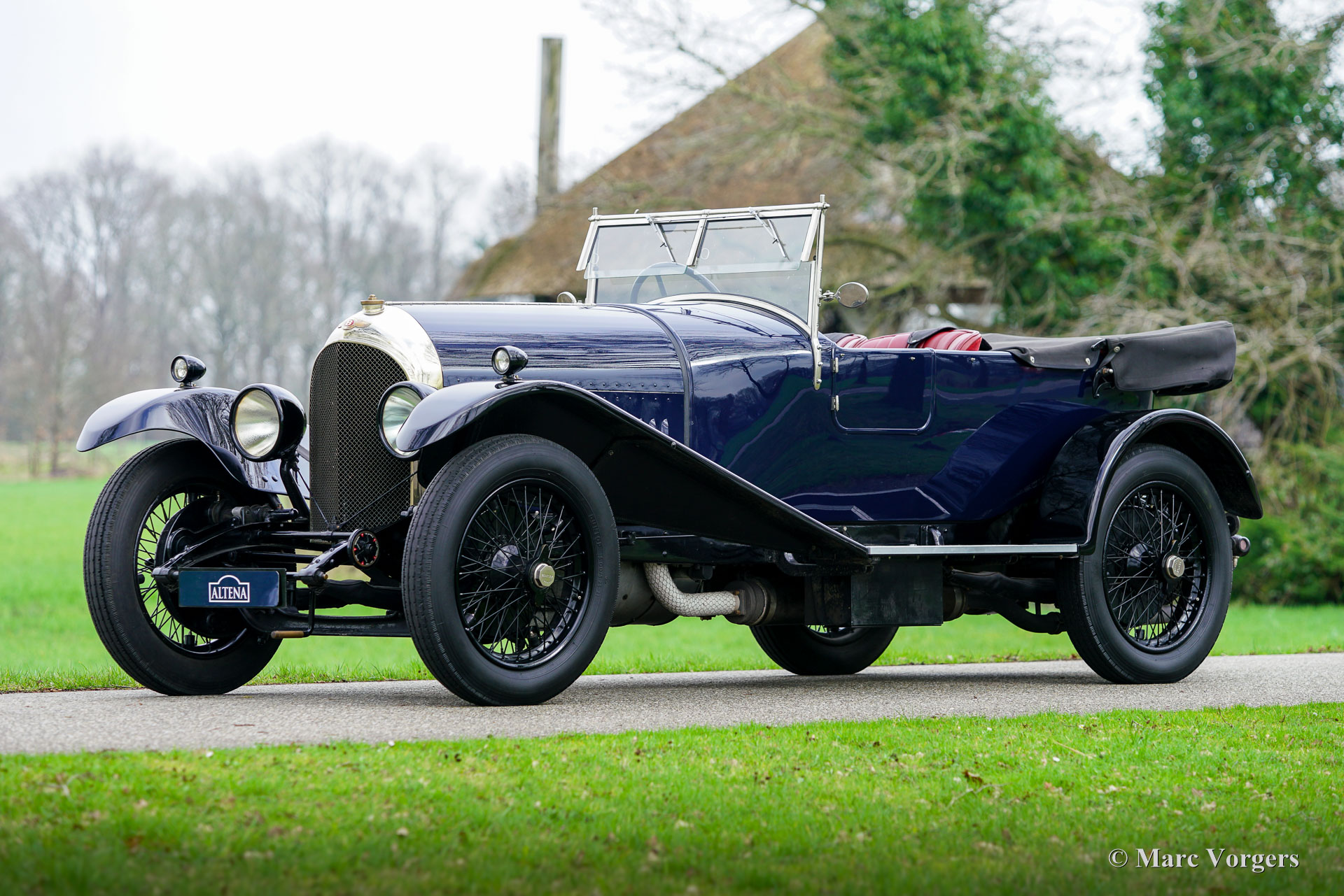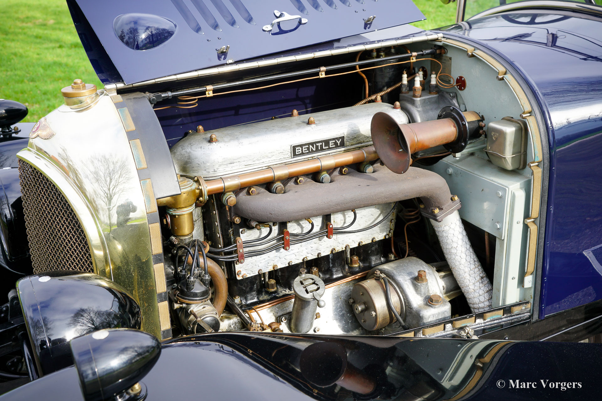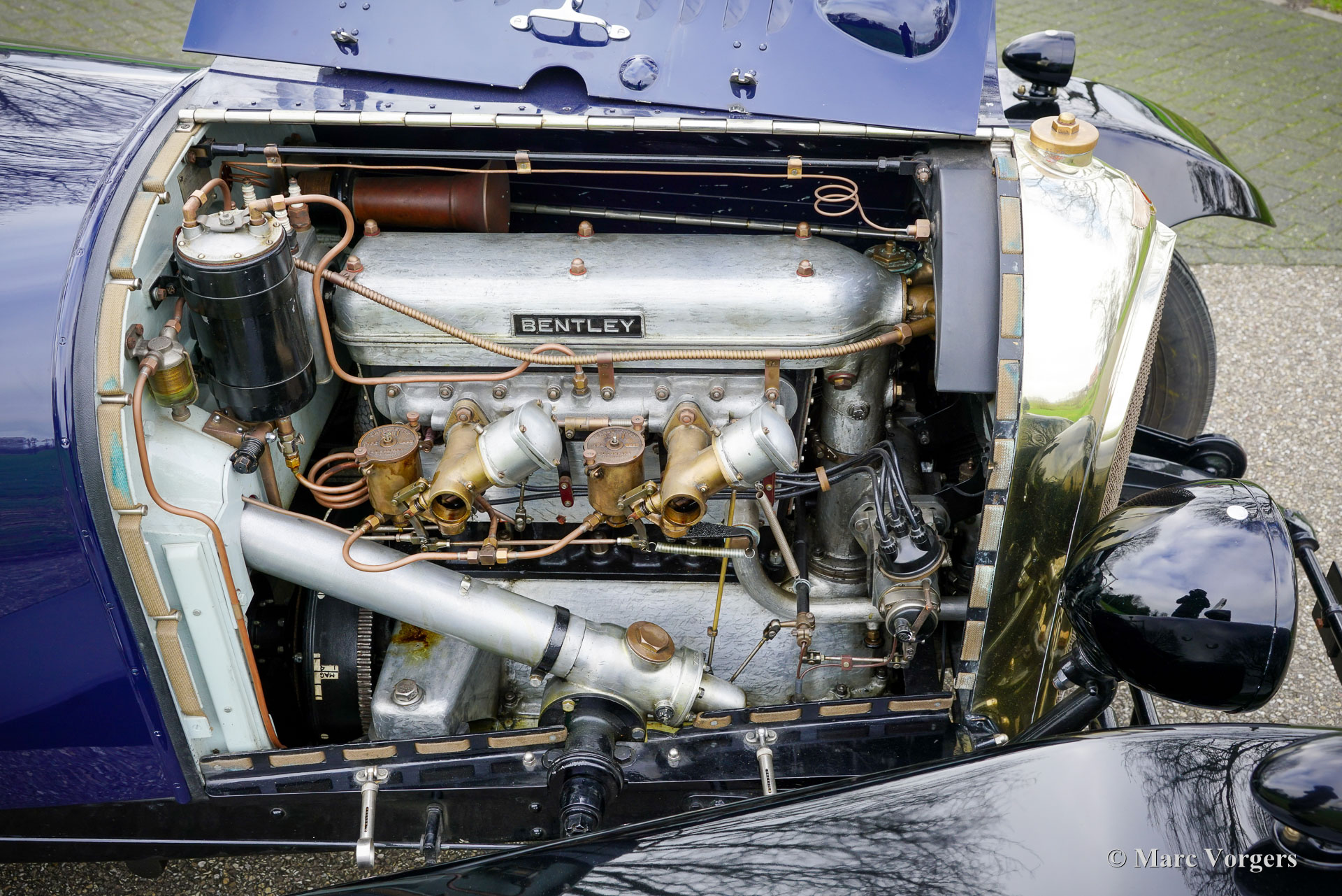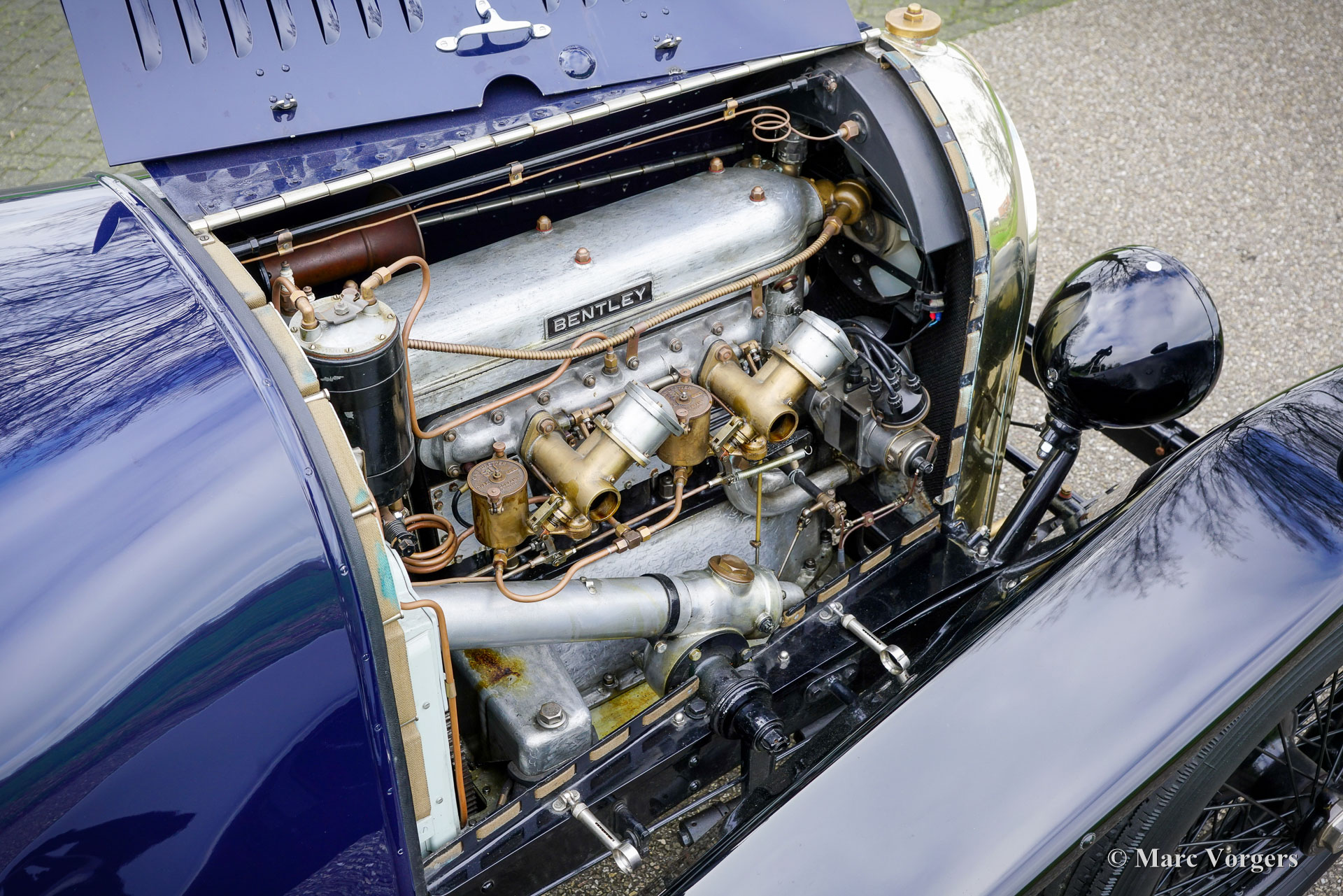 Bentley 3 Litre Speed model, bouwjaar 1924. Kleur donkerblauw met zwarte spaakwielen gecombineerd met een roodleren interieur afwerkt met rood wollen tapijt. Zwarte kap, hood-cover en tonneau-cover. Dit originele Bentley 3-litre ‘red badge’ Speed-model met kort chassis werd nieuw verkocht in het Verenigd Koninkrijk, uitgerust met een ‘Park Ward’ carrosserie. In latere jaren werd de auto voorzien van de huidige 4-zits open tourer carrosserie. De automobiel werd uitvoerig gerestaureerd en gereviseerd door een Bentley specialist met oog voor originaliteit. De motor en alle mechanische onderdelen zijn volledig gereviseerd. Alle belangrijke chassis- en mechanische onderdelen zijn fabrieksorigineel, de nummers op het chassis, de motor, de versnellingsbak, de stuurinrichting en de achteras zijn correct voor deze auto zoals deze de fabriek verliet in 1924! De auto toont vele prachtige originele details zoals de bijzondere Sloper carburateurs en de met ‘Bentley’ gemarkeerde dashboardinstrumenten. De volledige historie is bekend en gedocumenteerd en van de uitgebreide restauratie is een fotoreportage aanwezig. Dit Bentley 3-Litre Speed-model wordt genoemd in het boek ‘Bentley The Vintage Years’, een standaardwerk over Bentley van Clare Hay. Deze schitterende Bentley 3-Litre verkeert in een prachtige en zeer goede staat. De automobiel ademt de kwaliteit die W.O. Bentley voor ogen had toen hij zijn ‘3-Litre’ creëerde; ‘Een snelle auto, een goede auto, de beste in zijn klasse’. De 3-litre was als een van de eerste productie auto’s uitgerust met een motor voorzien van 4 kleppen per cilinder, dry-sump-smering en een bovenliggende nokkenas. Het eerste Bentley 3-Litre chassis werd gepresenteerd op de London (Olympia) Motor Show in 1919, en de eerste klantenauto werd in 1921 afgeleverd. Tussen de show en 1921 was er veel werk nodig om de verfijning te verbeteren. Zoals W.O. later schreef: ‘Ik haat lawaai omwille van het lawaai. 110 km per uur in stilte is veel verdienstelijker dan een luidruchtige 130 km per uur.” De Bentley 3-Litre werd zeer goed ontvangen door de autopers. Sammy Davis van Autocar schreef: “Voor de man die een echt sportief type lichte auto wil voor gebruik op een continentale tour – waar het niet de bedoeling is dat snelheidslimieten in acht worden genomen – is de 3-liter Bentley ongetwijfeld de auto bij uitstek. ” Vanaf het begin werd met de robuuste en krachtige Bentley 3-Litre deelgenomen aan wedstrijden en races. De 3-Litre won talloze races, waaronder de legendarische 24 uur van Le Mans in 1924 en 1927. Ook een particuliere eigenaar (John Duff) vestigde in 1925 21 wereldrecords in 24 uur aan het stuur van een Bentley 3-Litre. Tussen 1921 en 1929 werden in totaal 1622 Bentley 3-Litre-modellen gebouwd. Dit Bentley 3-Litre-model is een prachtig product uit deze avontuurlijke vroege Bentley Motors-periode. Een prachtig verzamelobject en een droommachine voor vintage Bentley rijders en Bentley liefhebbers.