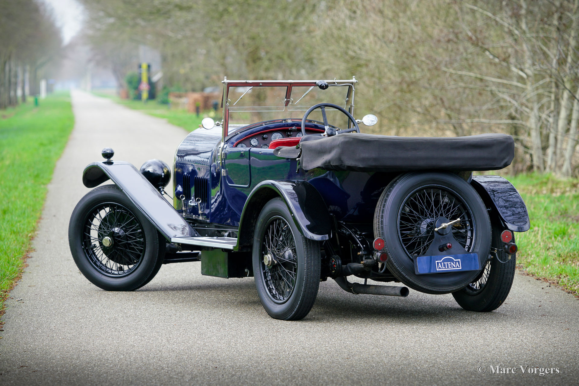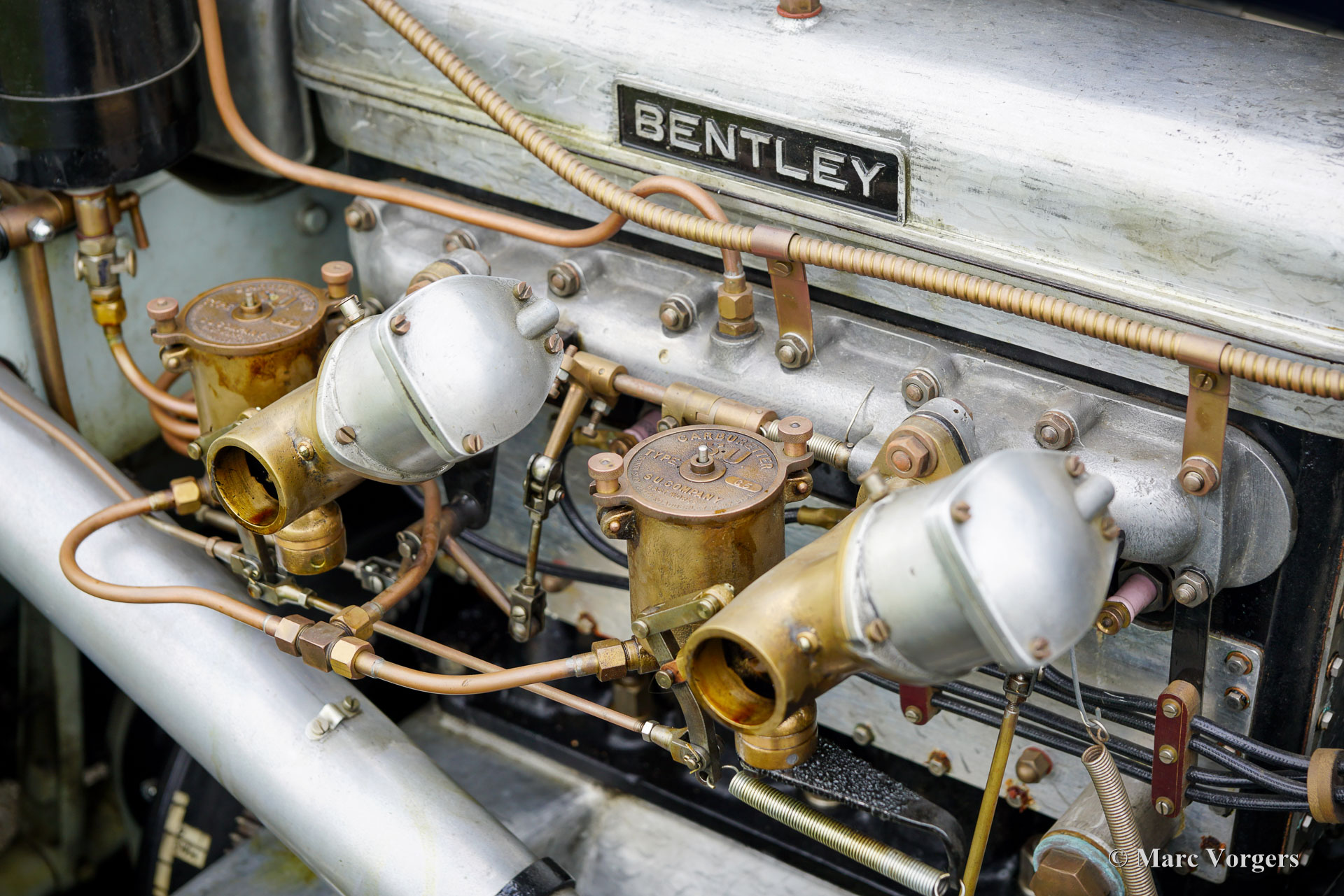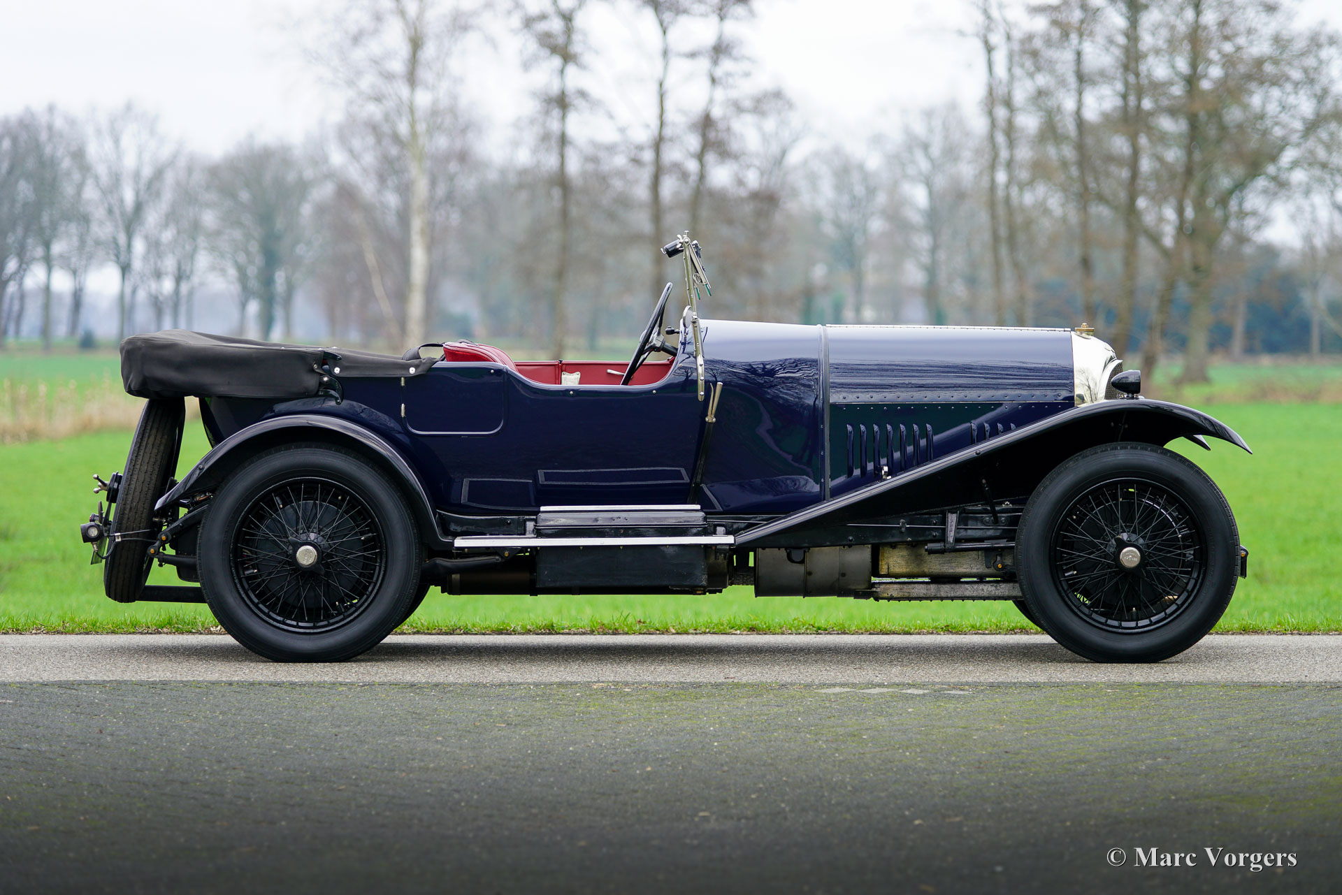 Bentley 3 Litre Speed model, bouwjaar 1924. Kleur donkerblauw met zwarte spaakwielen gecombineerd met een roodleren interieur afwerkt met rood wollen tapijt. Zwarte kap, hood-cover en tonneau-cover. Dit originele Bentley 3-litre ‘red badge’ Speed-model met kort chassis werd nieuw verkocht in het Verenigd Koninkrijk, uitgerust met een ‘Park Ward’ carrosserie. In latere jaren werd de auto voorzien van de huidige 4-zits open tourer carrosserie. De automobiel werd uitvoerig gerestaureerd en gereviseerd door een Bentley specialist met oog voor originaliteit. De motor en alle mechanische onderdelen zijn volledig gereviseerd. Alle belangrijke chassis- en mechanische onderdelen zijn fabrieksorigineel, de nummers op het chassis, de motor, de versnellingsbak, de stuurinrichting en de achteras zijn correct voor deze auto zoals deze de fabriek verliet in 1924! De auto toont vele prachtige originele details zoals de bijzondere Sloper carburateurs en de met ‘Bentley’ gemarkeerde dashboardinstrumenten. De volledige historie is bekend en gedocumenteerd en van de uitgebreide restauratie is een fotoreportage aanwezig. Dit Bentley 3-Litre Speed-model wordt genoemd in het boek ‘Bentley The Vintage Years’, een standaardwerk over Bentley van Clare Hay. Deze schitterende Bentley 3-Litre verkeert in een prachtige en zeer goede staat. De automobiel ademt de kwaliteit die W.O. Bentley voor ogen had toen hij zijn ‘3-Litre’ creëerde; ‘Een snelle auto, een goede auto, de beste in zijn klasse’. De 3-litre was als een van de eerste productie auto’s uitgerust met een motor voorzien van 4 kleppen per cilinder, dry-sump-smering en een bovenliggende nokkenas. Het eerste Bentley 3-Litre chassis werd gepresenteerd op de London (Olympia) Motor Show in 1919, en de eerste klantenauto werd in 1921 afgeleverd. Tussen de show en 1921 was er veel werk nodig om de verfijning te verbeteren. Zoals W.O. later schreef: ‘Ik haat lawaai omwille van het lawaai. 110 km per uur in stilte is veel verdienstelijker dan een luidruchtige 130 km per uur.” De Bentley 3-Litre werd zeer goed ontvangen door de autopers. Sammy Davis van Autocar schreef: “Voor de man die een echt sportief type lichte auto wil voor gebruik op een continentale tour – waar het niet de bedoeling is dat snelheidslimieten in acht worden genomen – is de 3-liter Bentley ongetwijfeld de auto bij uitstek. ” Vanaf het begin werd met de robuuste en krachtige Bentley 3-Litre deelgenomen aan wedstrijden en races. De 3-Litre won talloze races, waaronder de legendarische 24 uur van Le Mans in 1924 en 1927. Ook een particuliere eigenaar (John Duff) vestigde in 1925 21 wereldrecords in 24 uur aan het stuur van een Bentley 3-Litre. Tussen 1921 en 1929 werden in totaal 1622 Bentley 3-Litre-modellen gebouwd. Dit Bentley 3-Litre-model is een prachtig product uit deze avontuurlijke vroege Bentley Motors-periode. Een prachtig verzamelobject en een droommachine voor vintage Bentley rijders en Bentley liefhebbers.
