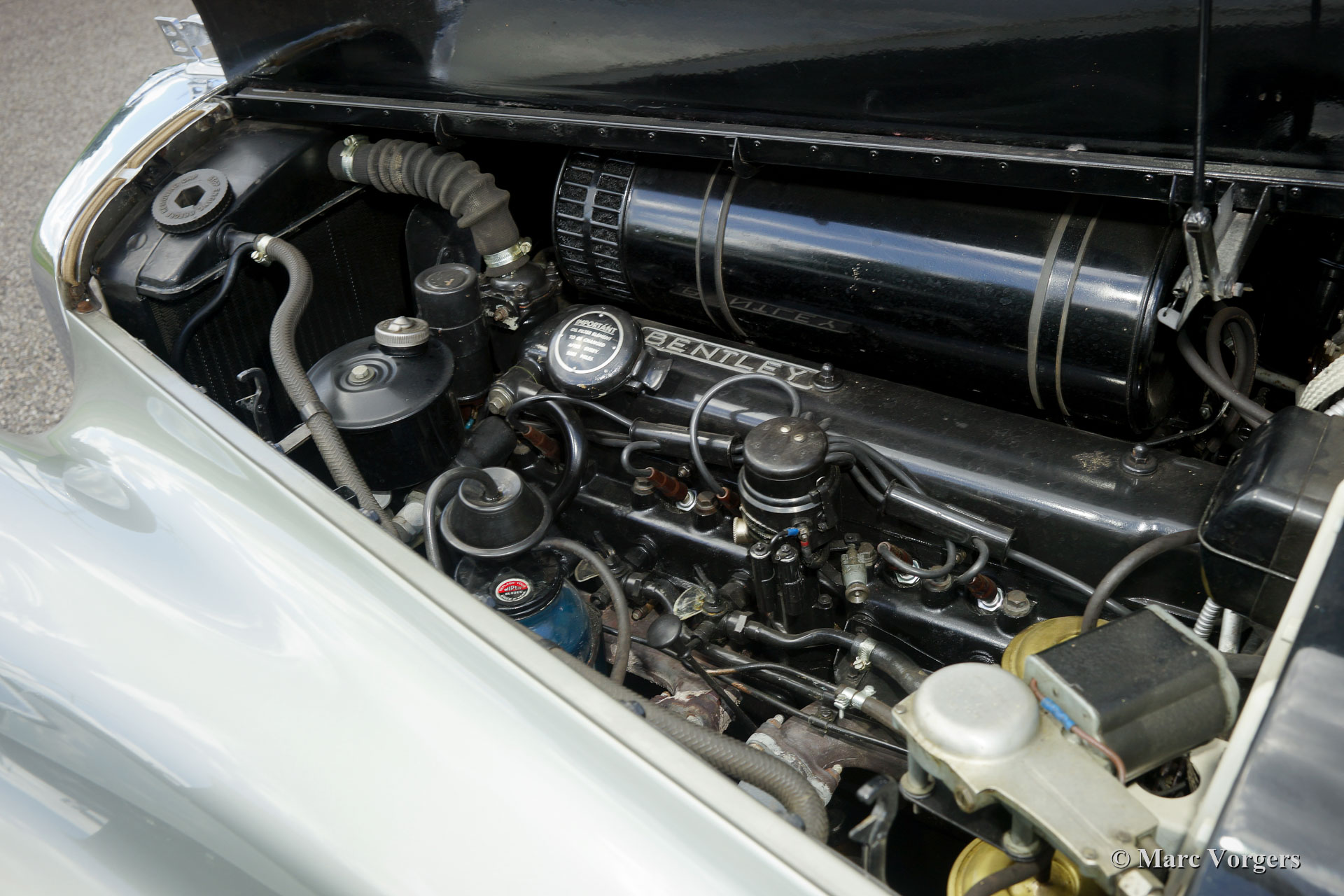 Bentley S1 Saloon, jaar 1959. Kleur: tweekleurig, zwart boven zilver gecombineerd met een donkerrood leren interieur en tapijt. Deze prachtige Bentley S1 met linkse besturing (LHD) is in excellente staat en de auto rijdt perfect. De laatste eigenaar heeft veel geld uitgegeven om deze prachtige Bentley in uitstekende staat te brengen, de carrosserie werd prachtig nieuw gespoten en het interieur werd geheel nieuw bekleed met eersteklas leer. Alle houten panelen in het interieur zijn fraai gelakt. Deze ultraluxe Bentley heeft een 4,9 liter zescilindermotor die gekoppeld is aan een 4-traps automatische versnellingsbak. De motor loopt erg soepel en de versnellingsbak schakelt stil en schokvrij. Ook zijn er stuur- en rembekrachtiging aanwezig, het niveau van assistentie is uitstekend; de grote en zware auto kan worden bestuurd met een minimum aan inspanning. Onlangs werden de remmen gereviseerd en zijn er nieuwe banden gemonteerd. De Bentley S1 is een zeldzame auto, slechts 3170 exemplaren (RHD en LHD gecombineerd) werden met de hand gebouwd in de periode 1955 - 1959. Dit is een moeilijk te vinden links gestuurd model in uitstekende staat!