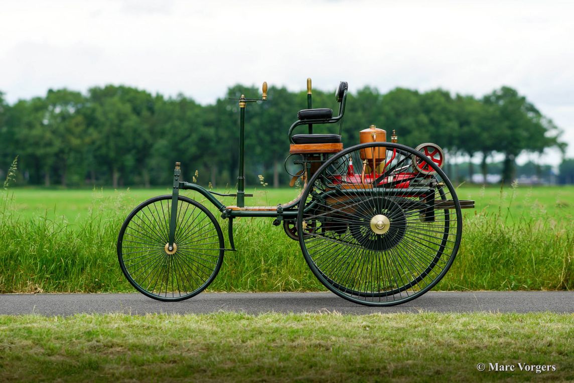 Benz ‘Patentwagen’ 1886 replica, bouwjaar 2013. Kleur groen met rode accenten. Dit is een unieke en zeer getrouwe replica van de Benz ‘Patentwagen’. De originele ‘Patentwagen’ was de eerste succesvolle door een viertakt benzinemotor aangedreven ‘automobiel’ uit de historie. De wagen was gebaseerd op Benz Patent DRP 37435 van 29 januari 1886. In hetzelfde jaar introduceerde het tevens Duitse Daimler een ‘motorkoets’ met een staande eencilinder benzinemotor gebaseerd op Daimler patent DRP 34926 van 3 april 1885. De lichte mobiele viertakt benzinemotoren van Daimler en Benz luidden het begin van de automobielindustrie in. De originele Benz ‘Patentwagen’ bestaat niet meer, zelfs het Mercedes-Benz museum in Stuttgart toont een replica.