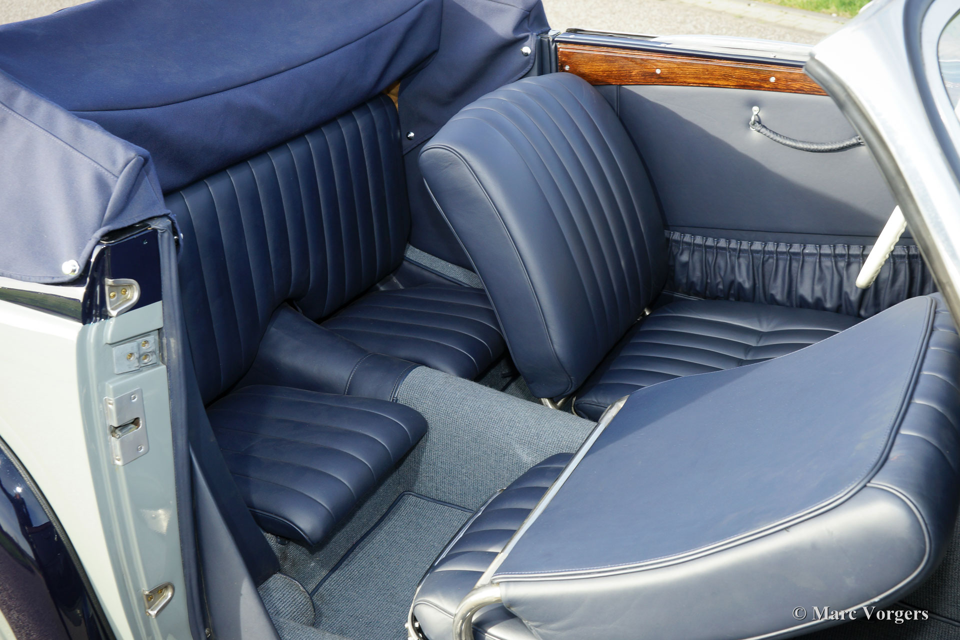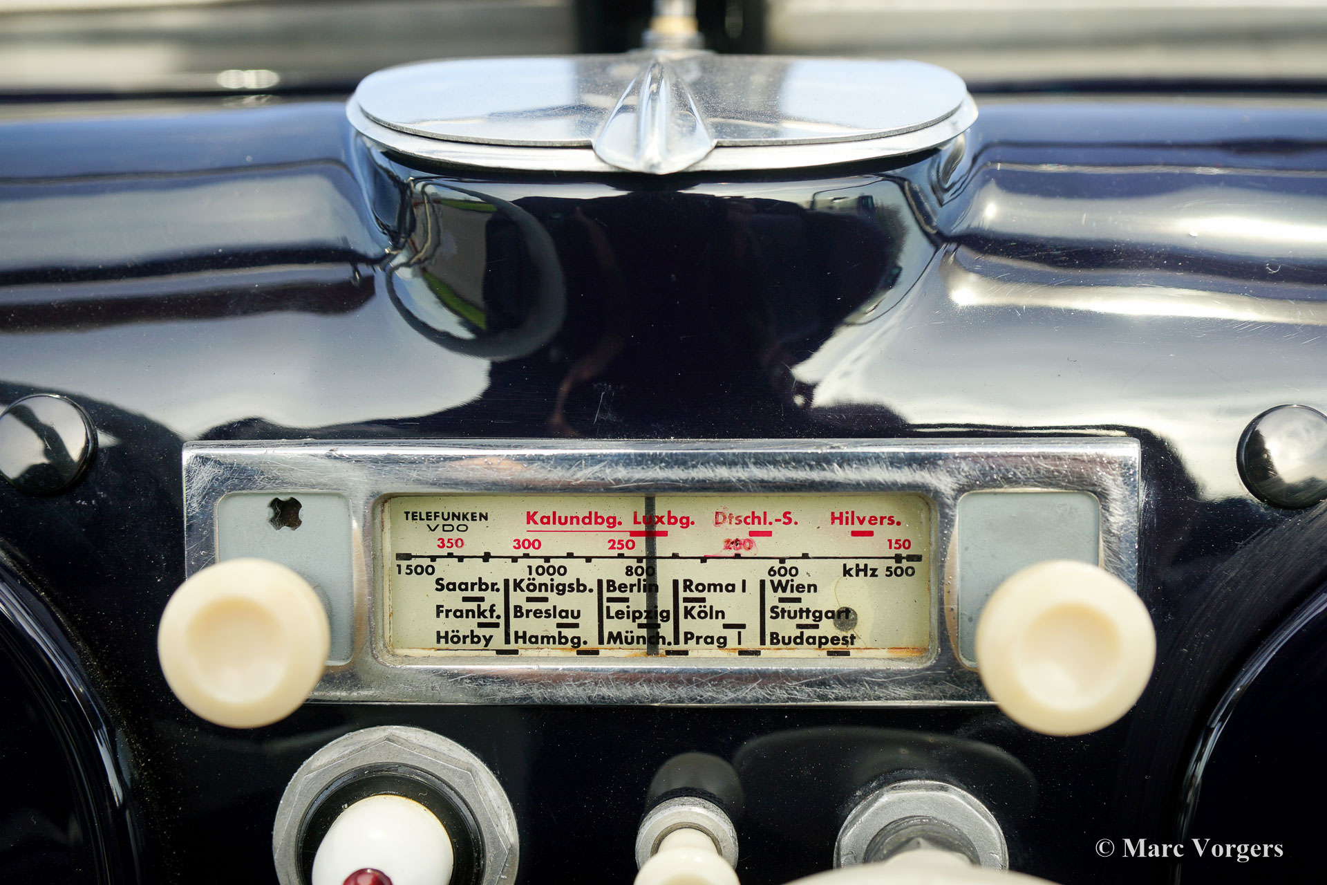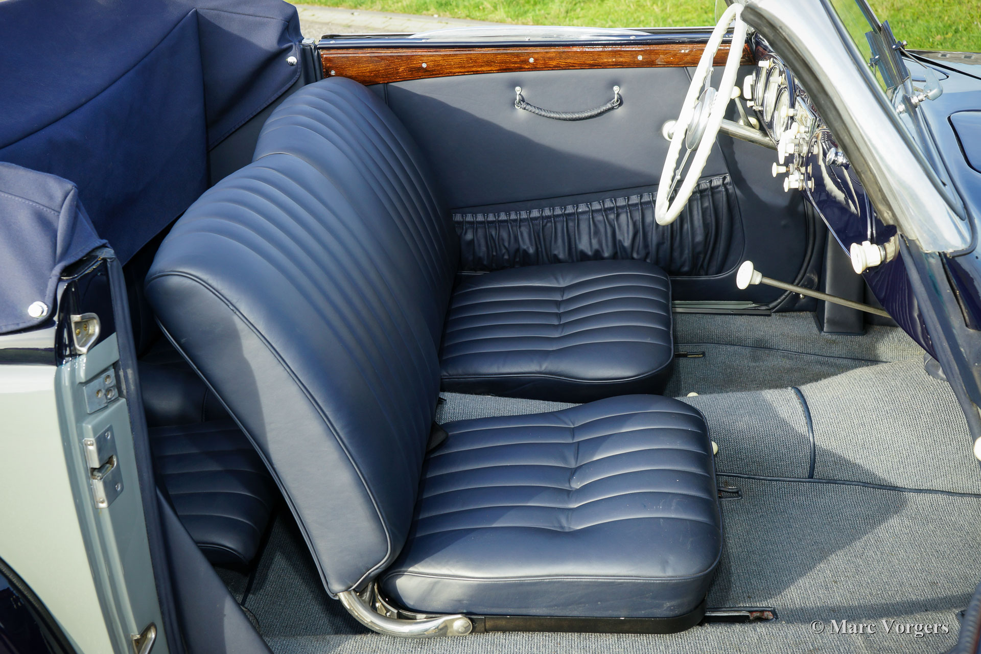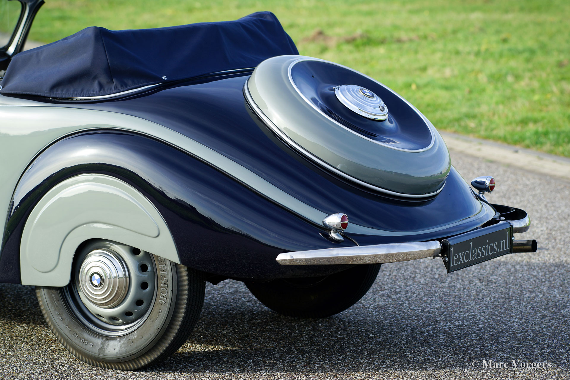 BMW 327/28 Sport-Kabriolett, jaar 1938. Kleur ‘two-tone’ donkerblauw met grijs. Blauw leren interieur met grijze deurpanelen en grijs tapijt. Blauwe mohair cabrioletkap en een blauwe mohair kap-afdekking. Deze prachtige en schaarse BMW 327/28 Sport-Kabriolett werd nieuw geleverd aan G. Bischof & Co op 11 november 1938. De automobiel werd in Duitsland uitvoerig en naar hoog niveau gerestaureerd, een fotoreportage van deze restauratie is aanwezig. In het jaar 2015 werd de auto door BMW Classic Group Deutschland in Garching technisch geheel nagezien en werd de motor gereviseerd. Foto’s en facturen van het werk zijn aanwezig. Dit exemplaar verkeert in sublieme TOP-staat en de auto rijdt geweldig! Deze BMW heeft enige corrigeerbare aanpassingen ondergaan: de originele versnellingsbak werd uitgewisseld voor een eenvoudiger schakelende Volvo vierversnellingsbak (de originele BMW-versnellingsbak is aanwezig). Tevens werd er elektrische stuurbekrachtiging (EZ Powersteering) en een oliefiltermodificatie aangebracht. Deze schaarse BMW 327/28 is uitvoerig gedocumenteerd. Aanwezig zijn o.a. een kopie van de originele ‘DDR Kraftzeugbrief für Kraftwagen’, van 18 september 1957, waarin alle specificaties van de auto en de namen van alle vorige eigenaren vermeld staan. Een geboorte certificaat, uitgegeven door BMW Classic in München op 20 november 2014 is aanwezig evenals een FIVA ‘identity card’ die op 26 april 2016 werd afgegeven.