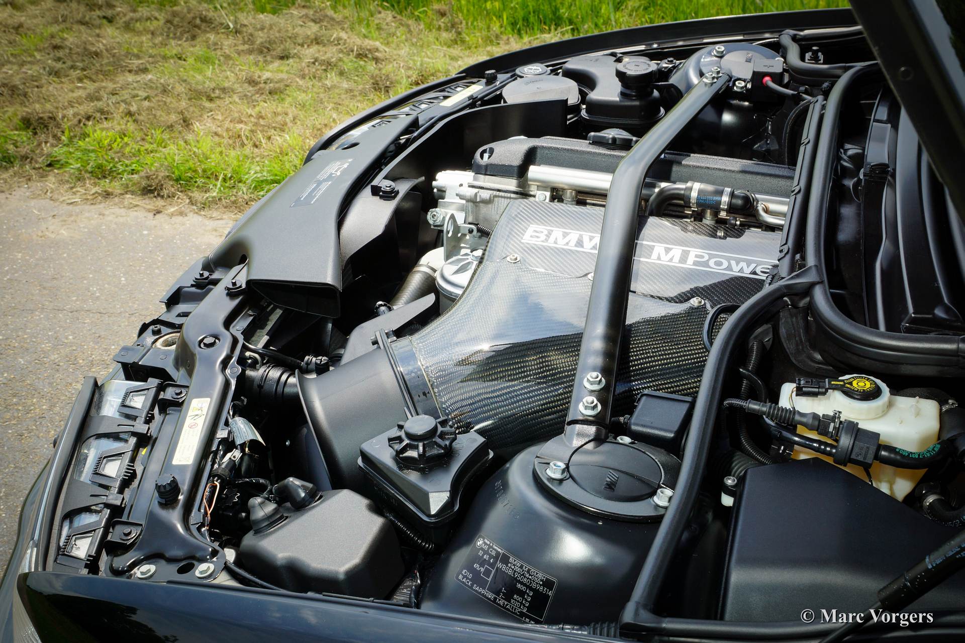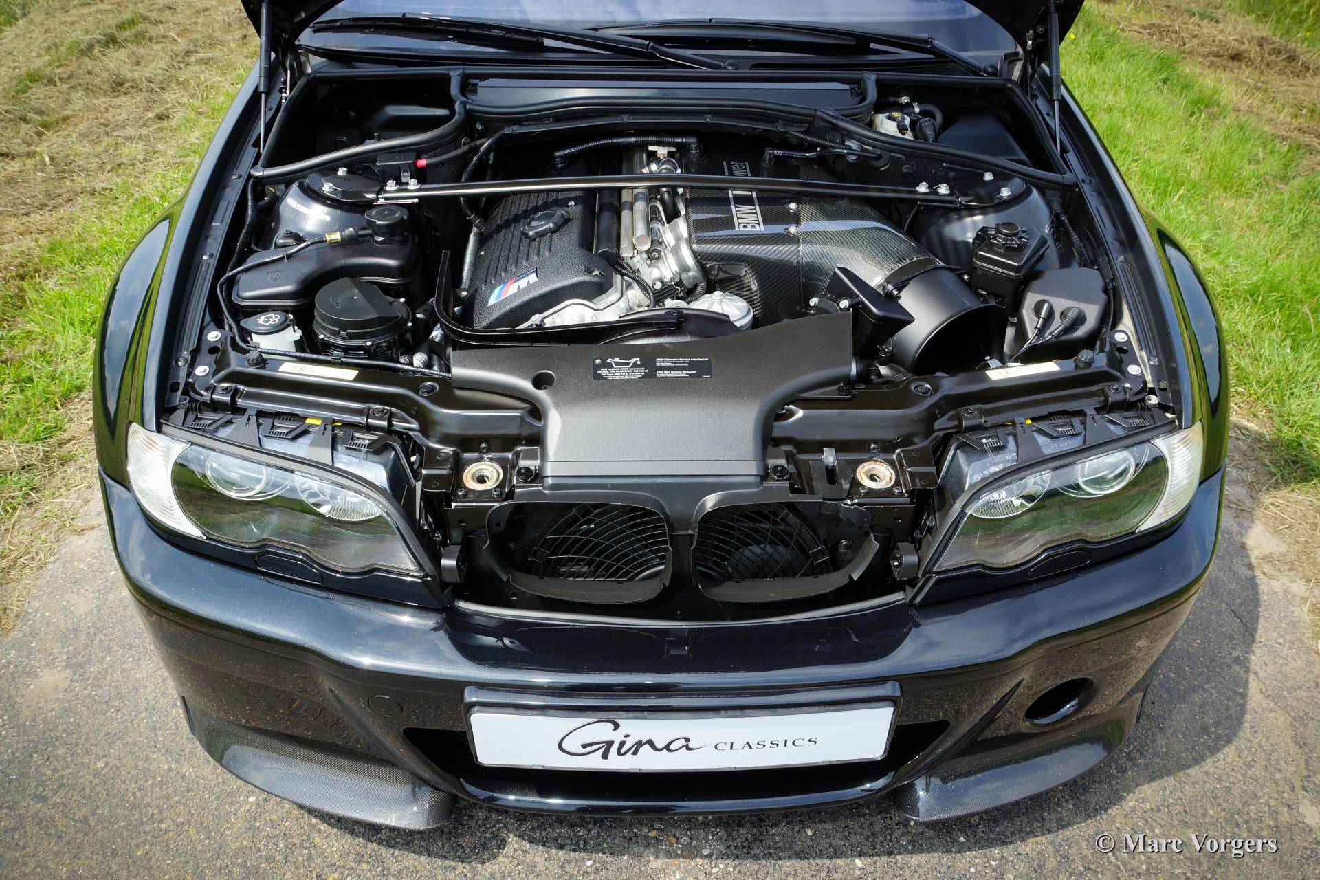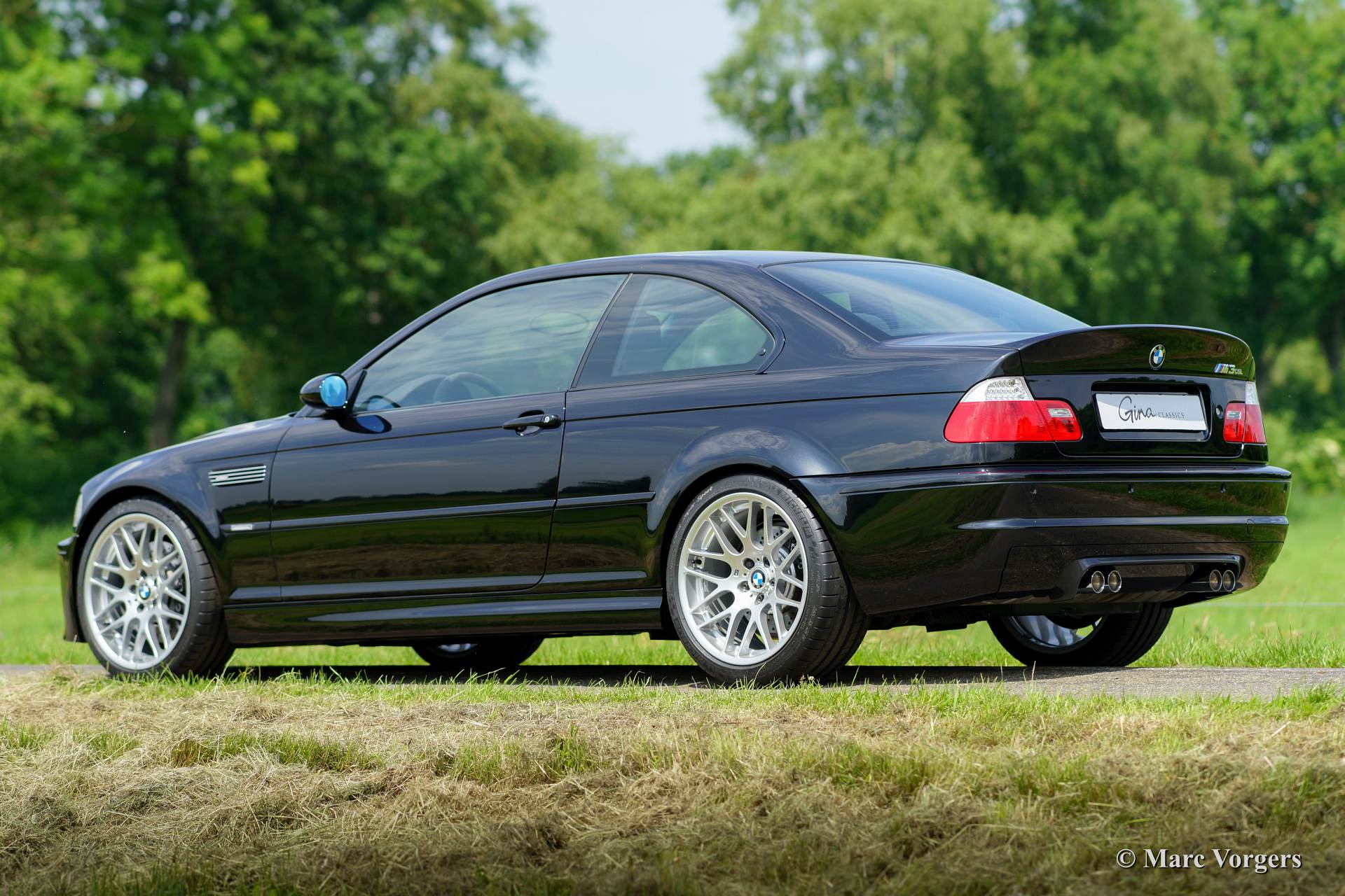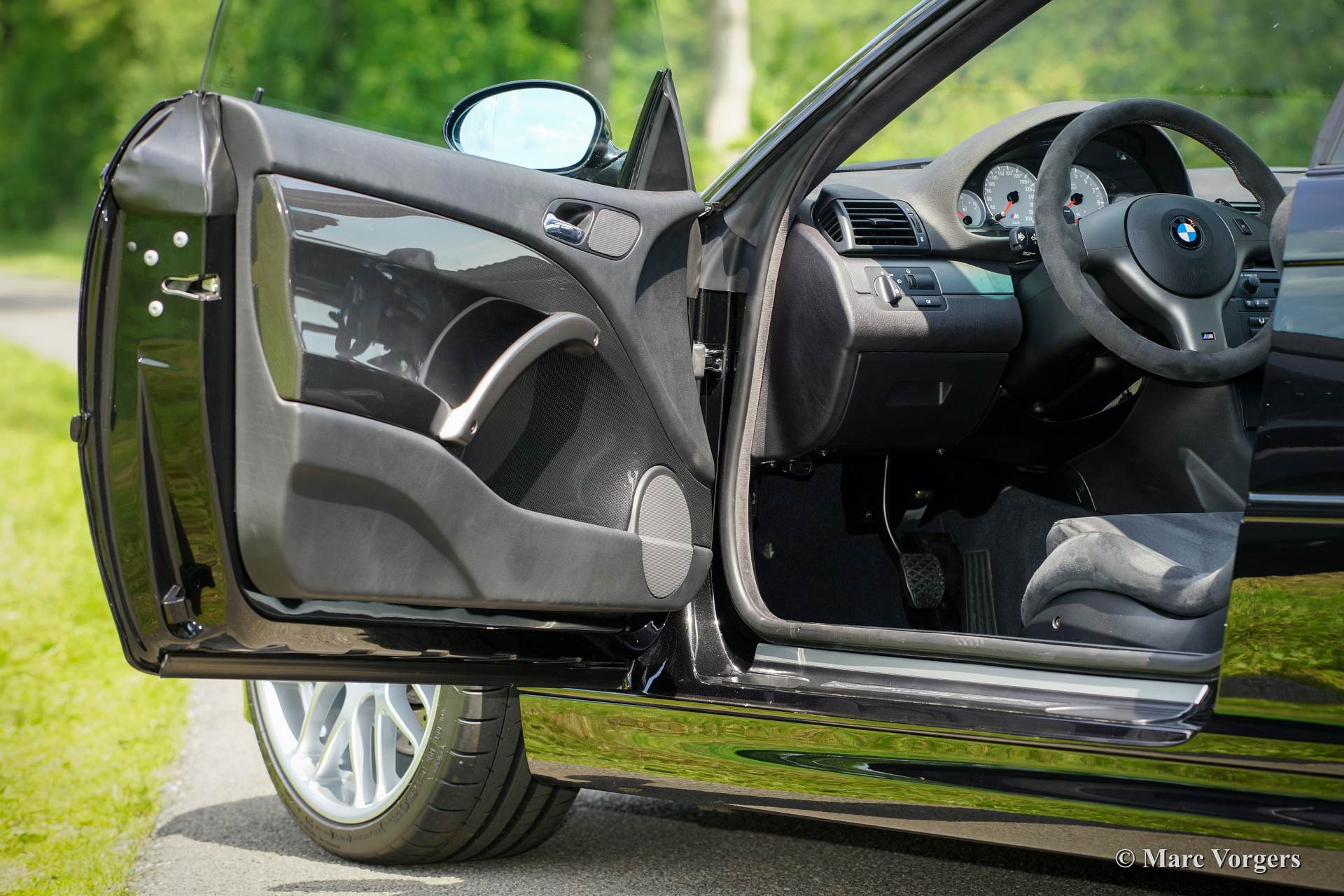 BMW M3 CSL, bouwjaar 2003. Kleur Saphirzwart (code 475) met een antraciet/grijs kleurig ‘Amaretta Reflex’ interieur. De BMW M3 CSL net als alle BMW M Modellen ‘Geboren op het circuit en thuis op alle wegen’. De M3 CSL (Coupe Sport Leichtbau) is een speciale M3 uitvoerig die in gelimiteerde oplage werd gebouwd van juni tot en met december 2003. De CSL is onder meer gebouwd met diverse zeer lichte carbonfiber delen zoals de kofferklep en het dak ter verlaging van het zwaartepunt. Verder is de besturing verder aangescherpt en werd de motor opgevoerd naar 360 pk, 17 pk meer dan de standaard M3. De auto is uitgerust met een automatische SMG zes versnellingsbak met ‘schakel-flippers’ aan het stuur.