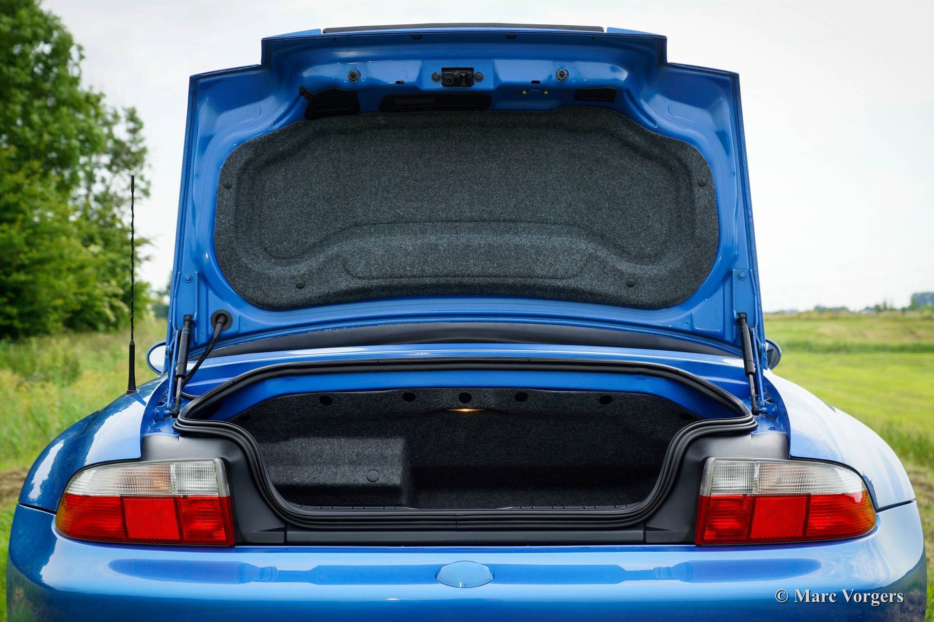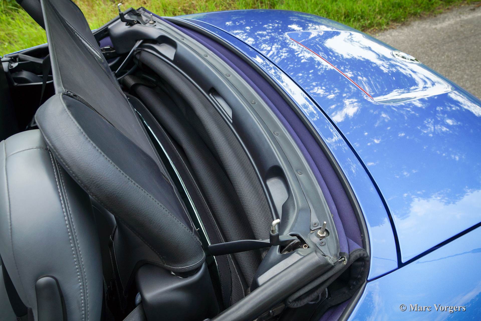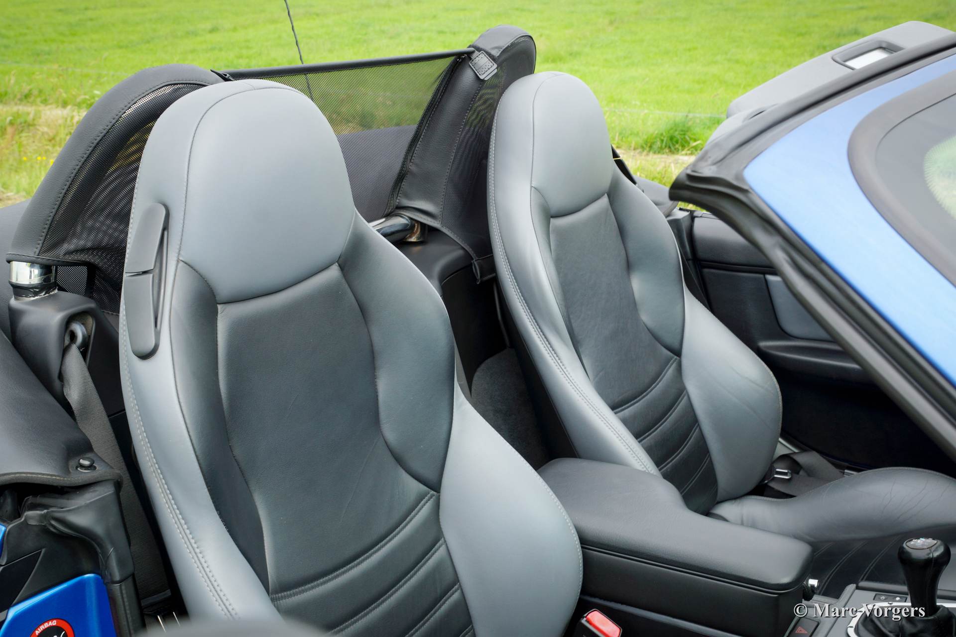 BMW Z3 roadster, bouwjaar 1998. Kleur Estoril blauw metallic met een zwart/grijs nappa lederen interieur en een donkerblauwe soft top.