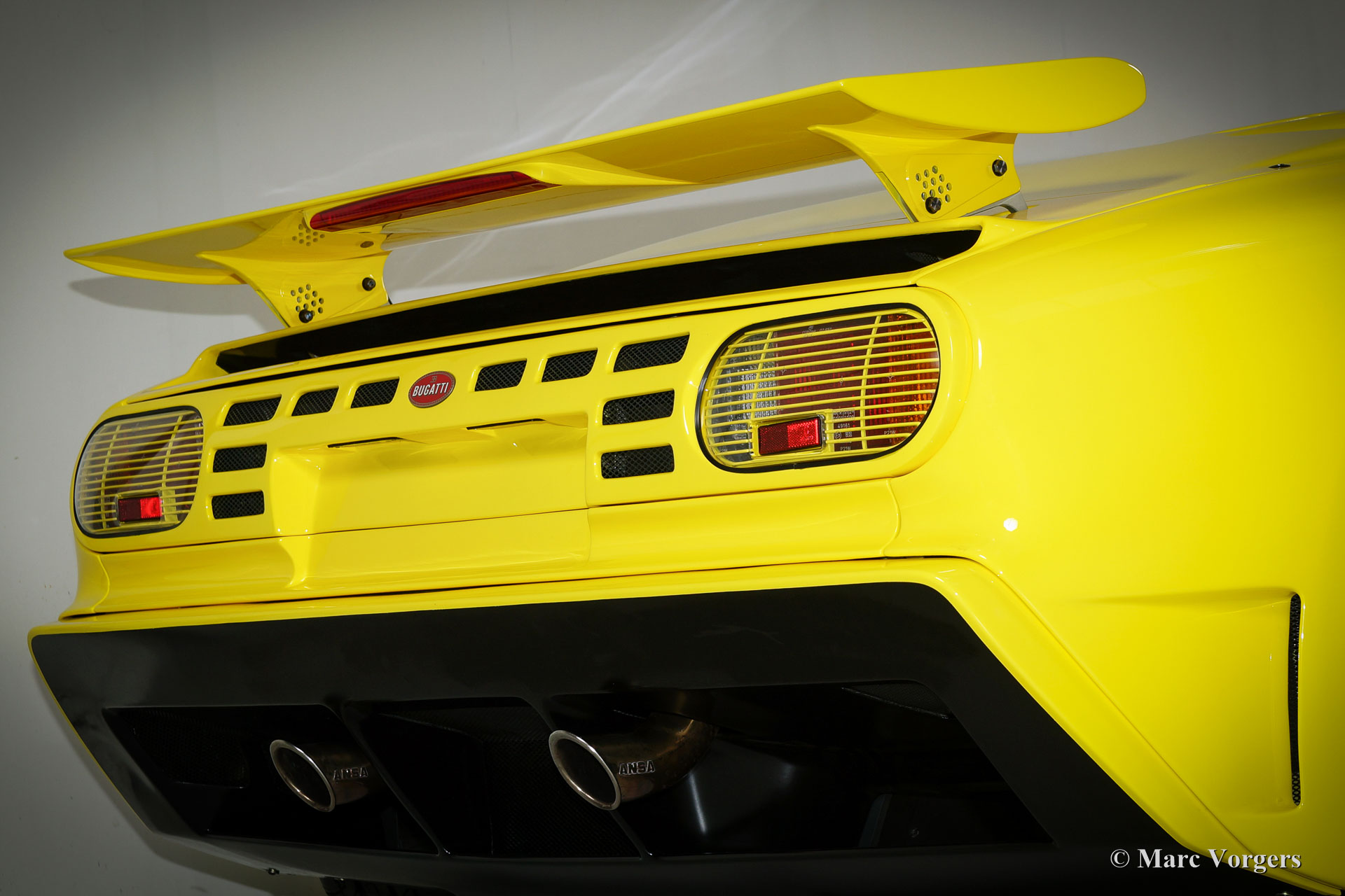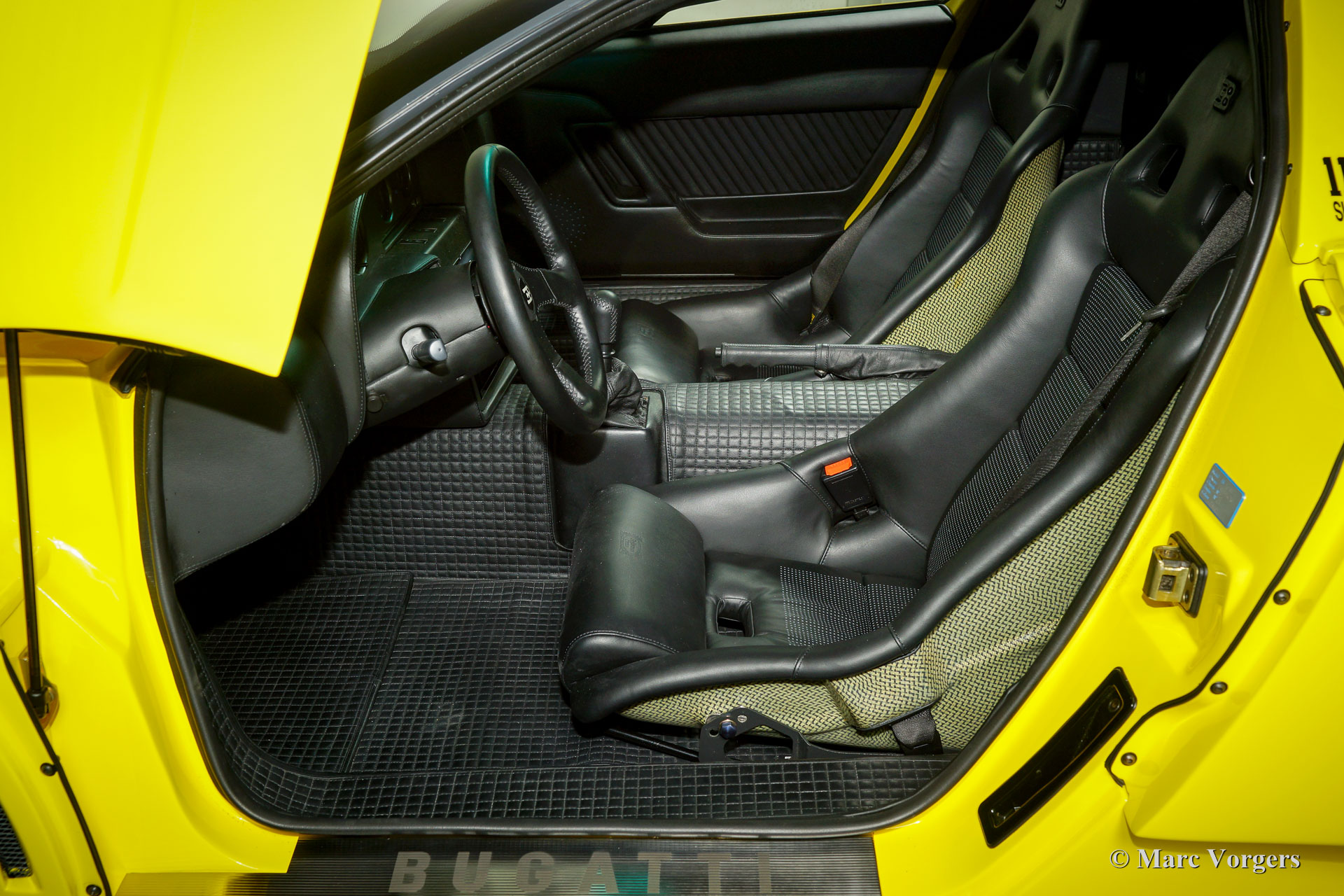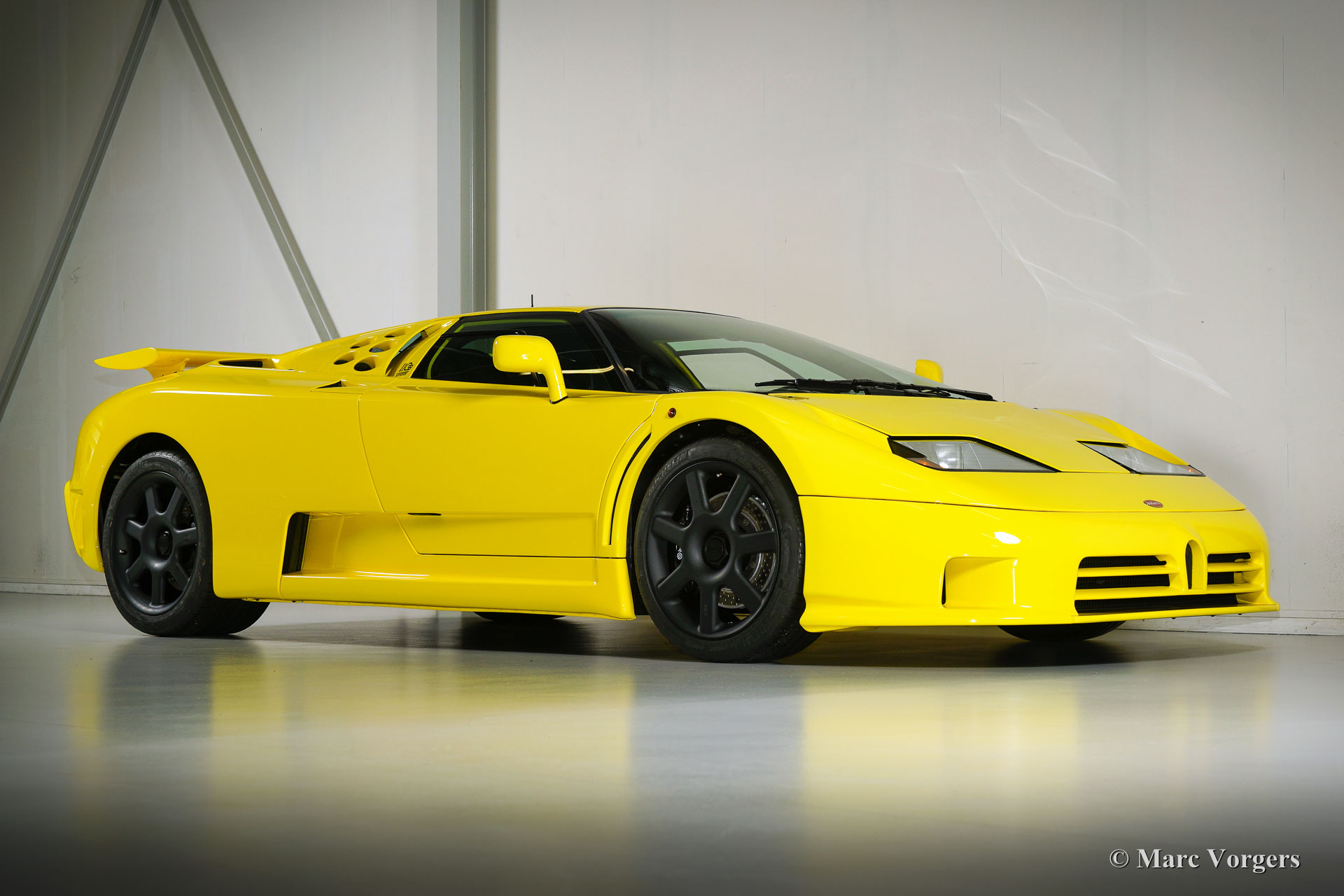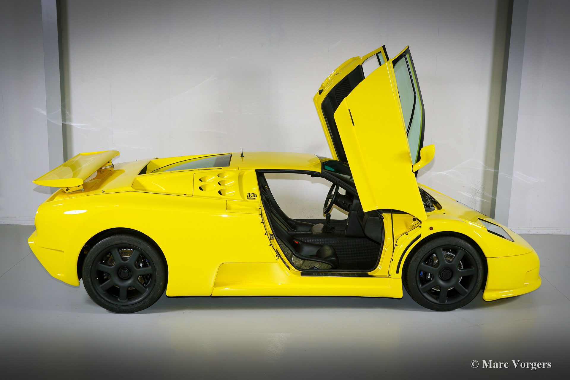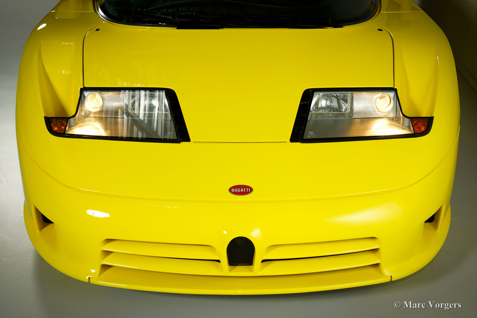 Bugatti EB110 SS (Super Sport), bouwjaar 1994. Kleur Giallo (geel) met een zwartleren interieur van Poltrona Frau. Deze magnifieke Bugatti EB110 SS is een van de slechts 33 geproduceerde Super Sport exemplaren en een van de vier geproduceerde gele auto's (de enige met zwarte velgen af fabriek).
