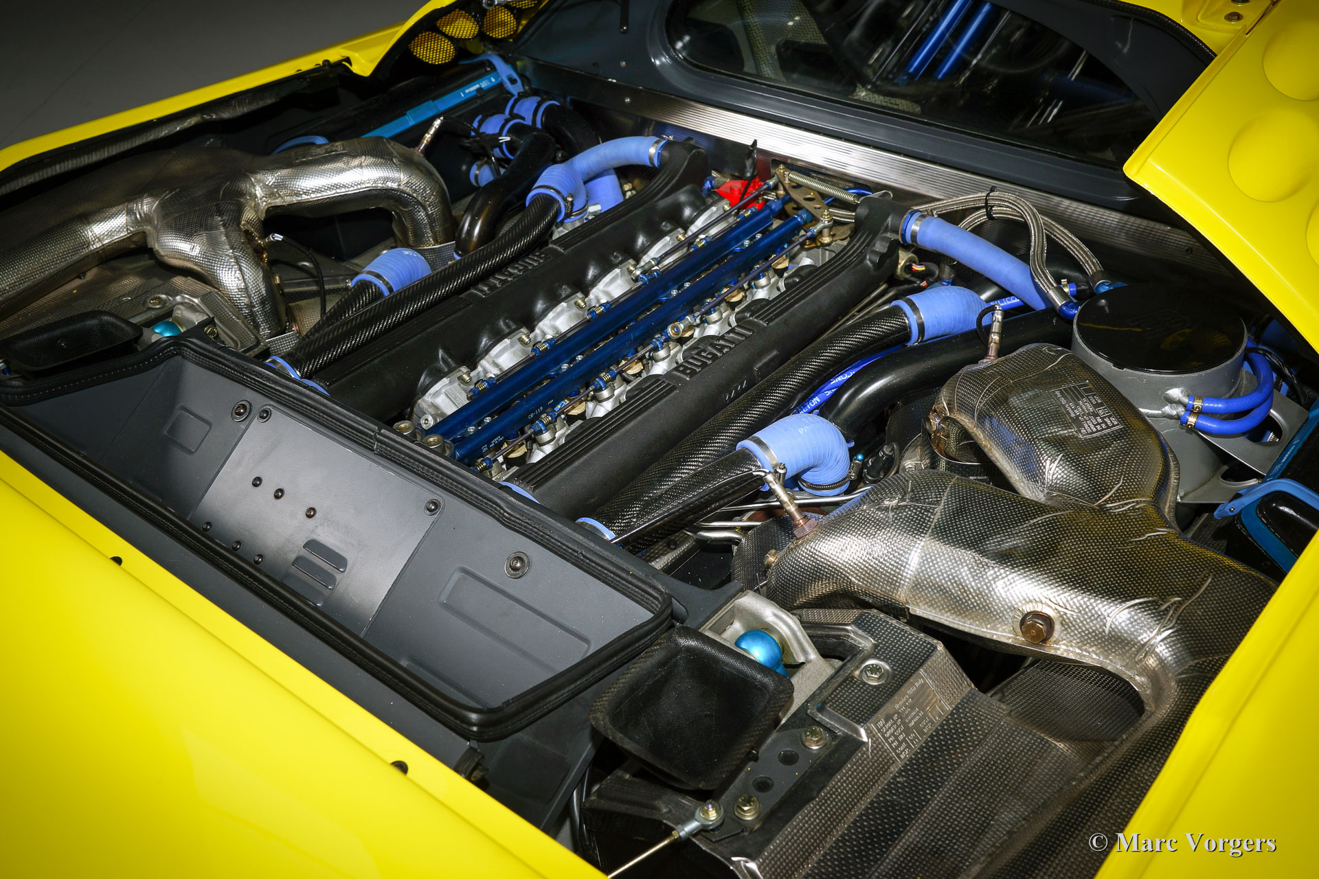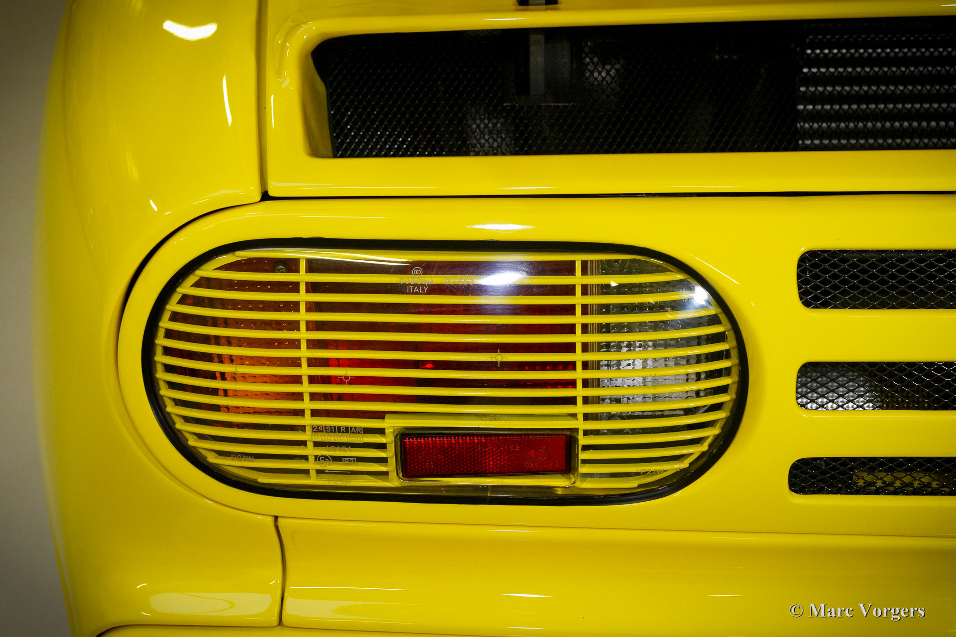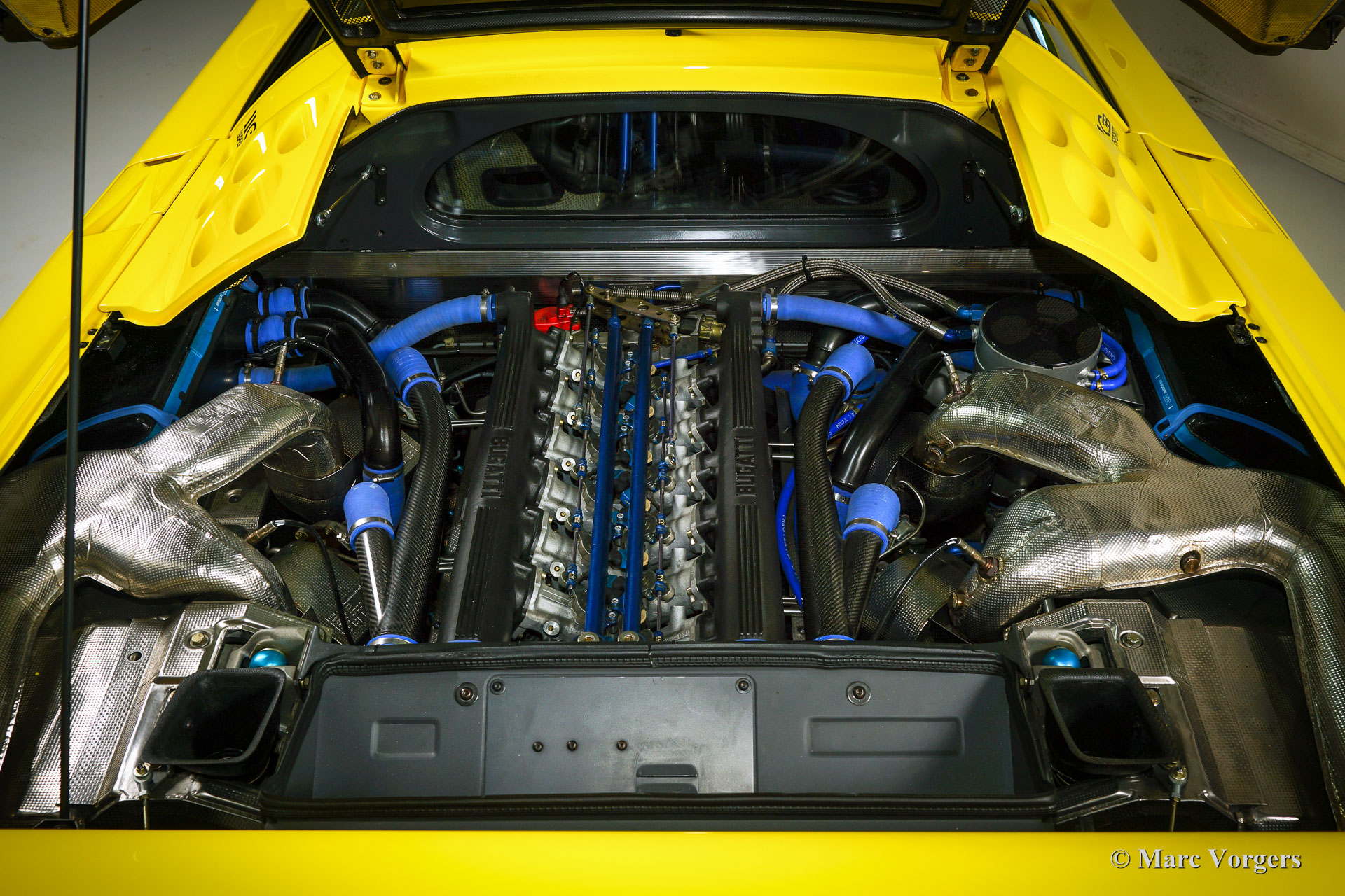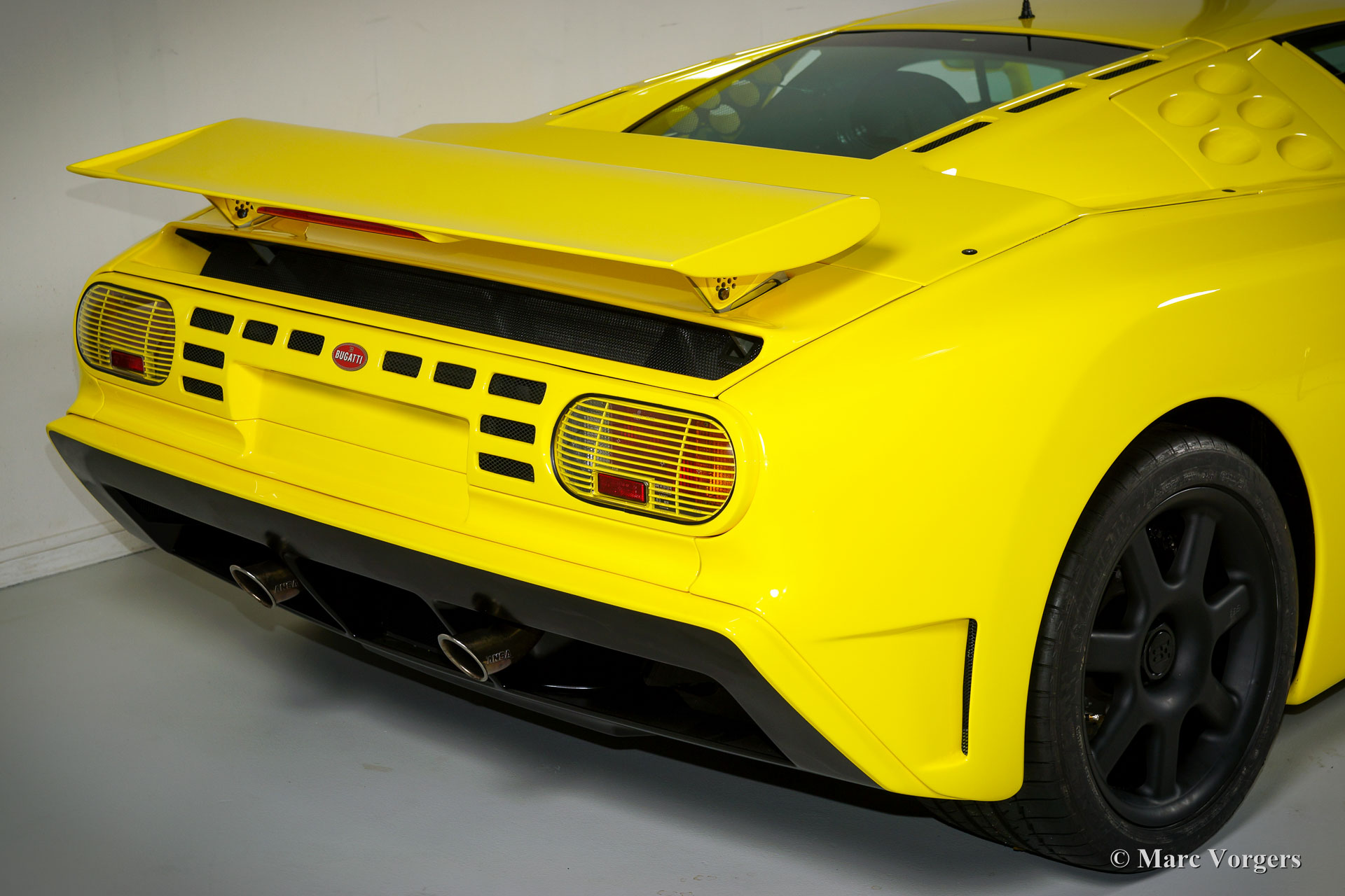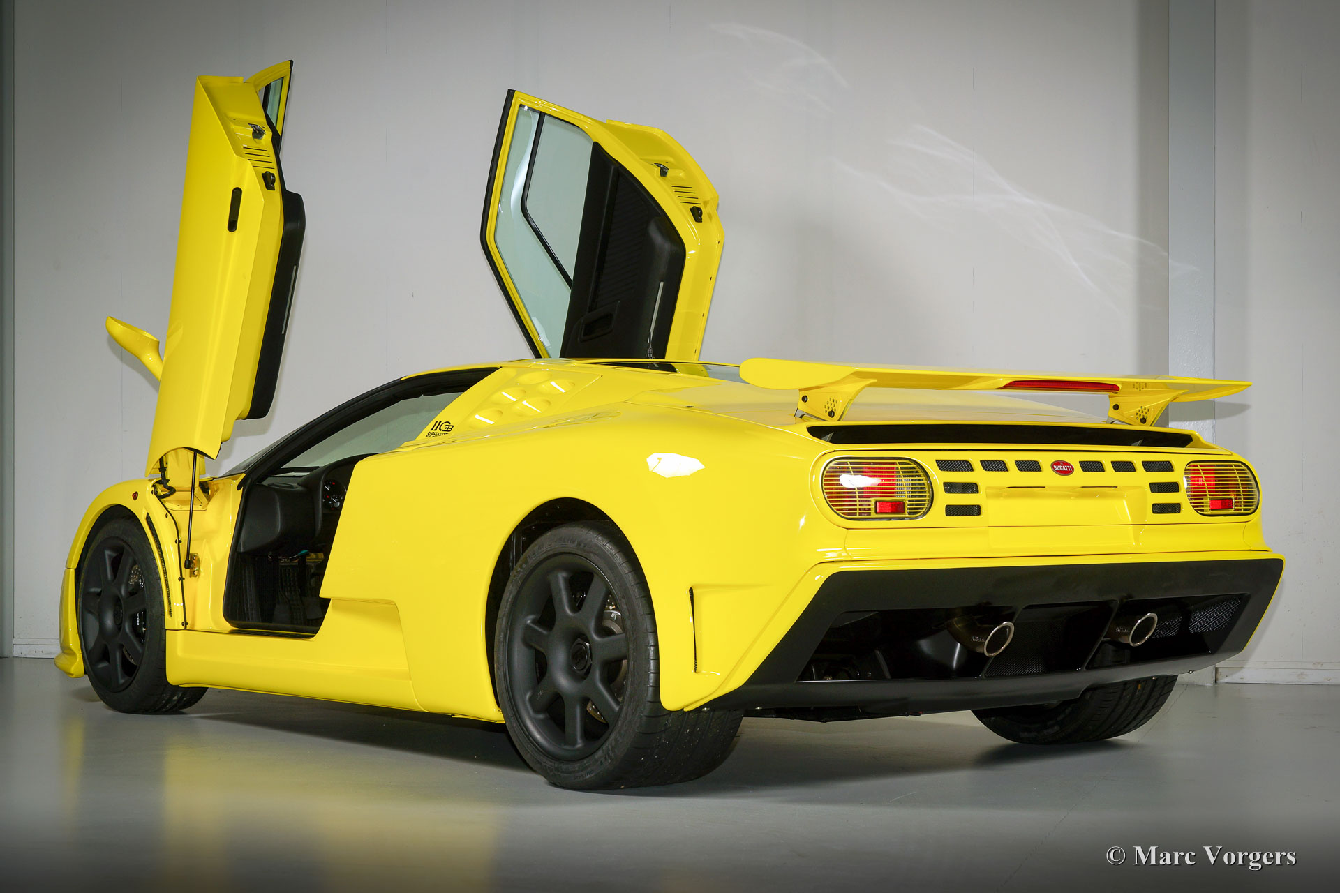 Bugatti EB110 SS (Super Sport), bouwjaar 1994. Kleur Giallo (geel) met een zwartleren interieur van Poltrona Frau. Deze magnifieke Bugatti EB110 SS is een van de slechts 33 geproduceerde Super Sport exemplaren en een van de vier geproduceerde gele auto's (de enige met zwarte velgen af fabriek).