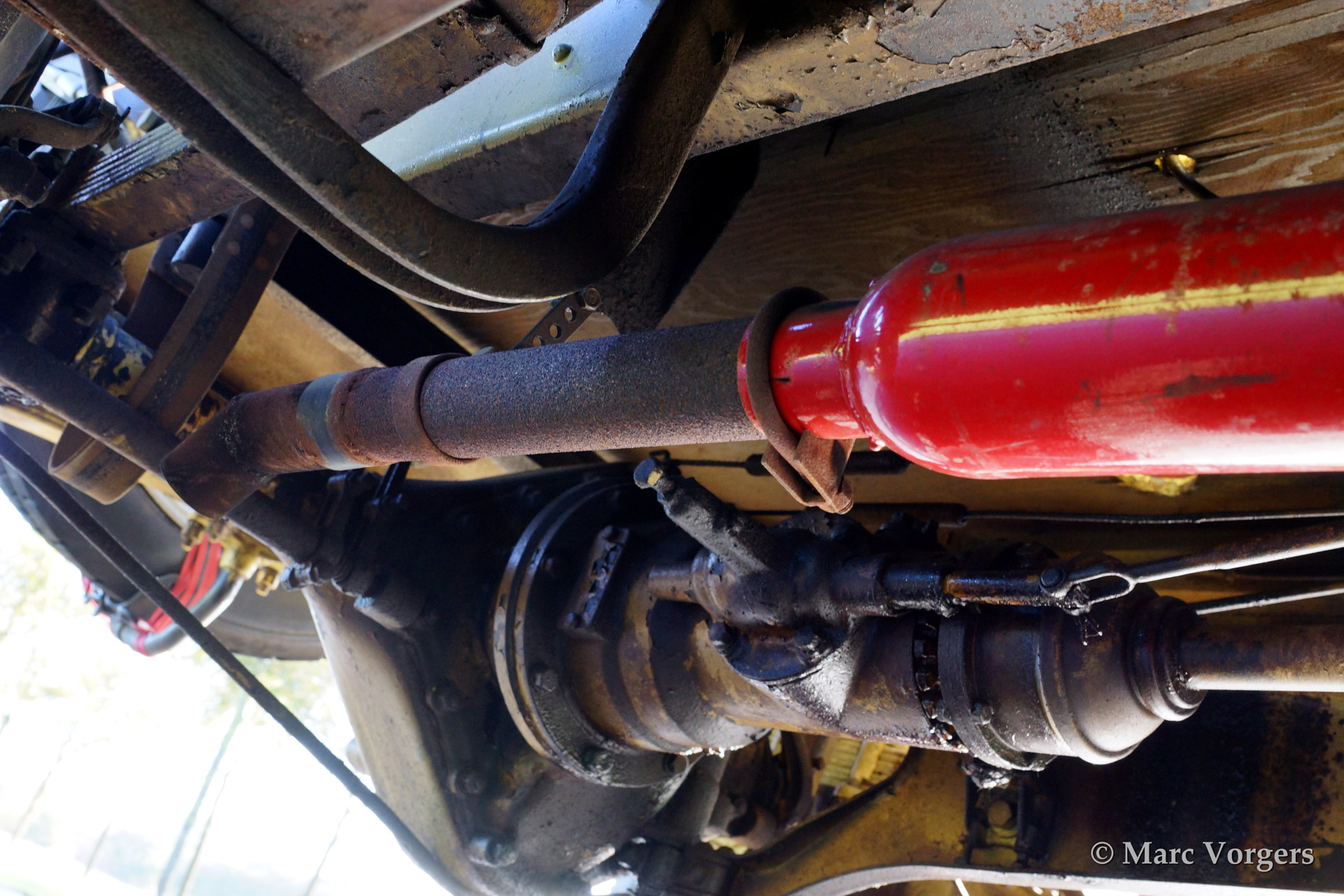 transmission: shaft drive to Timken two speed (low and high gearing) bevel drive differential within full floating rear axle
