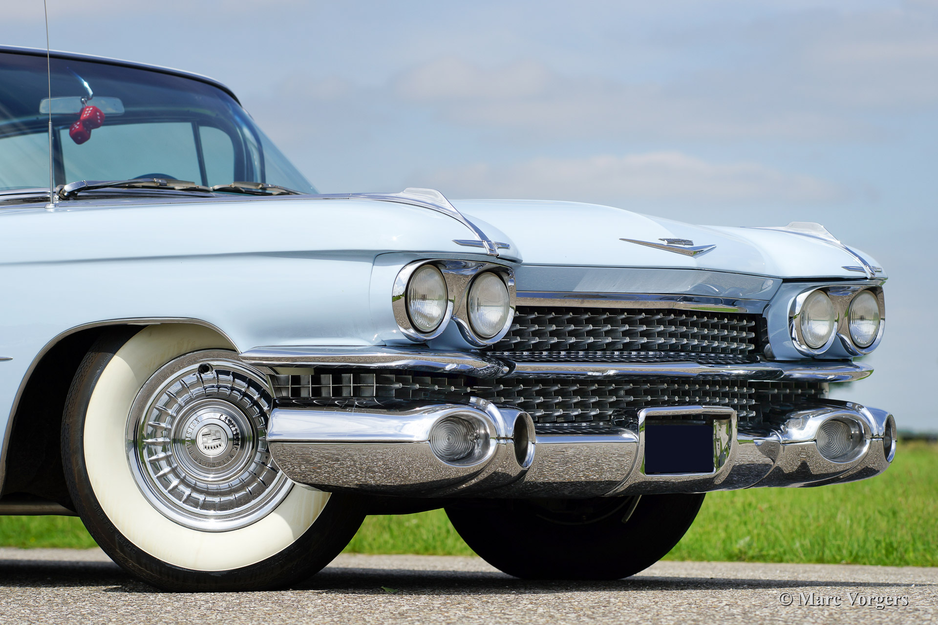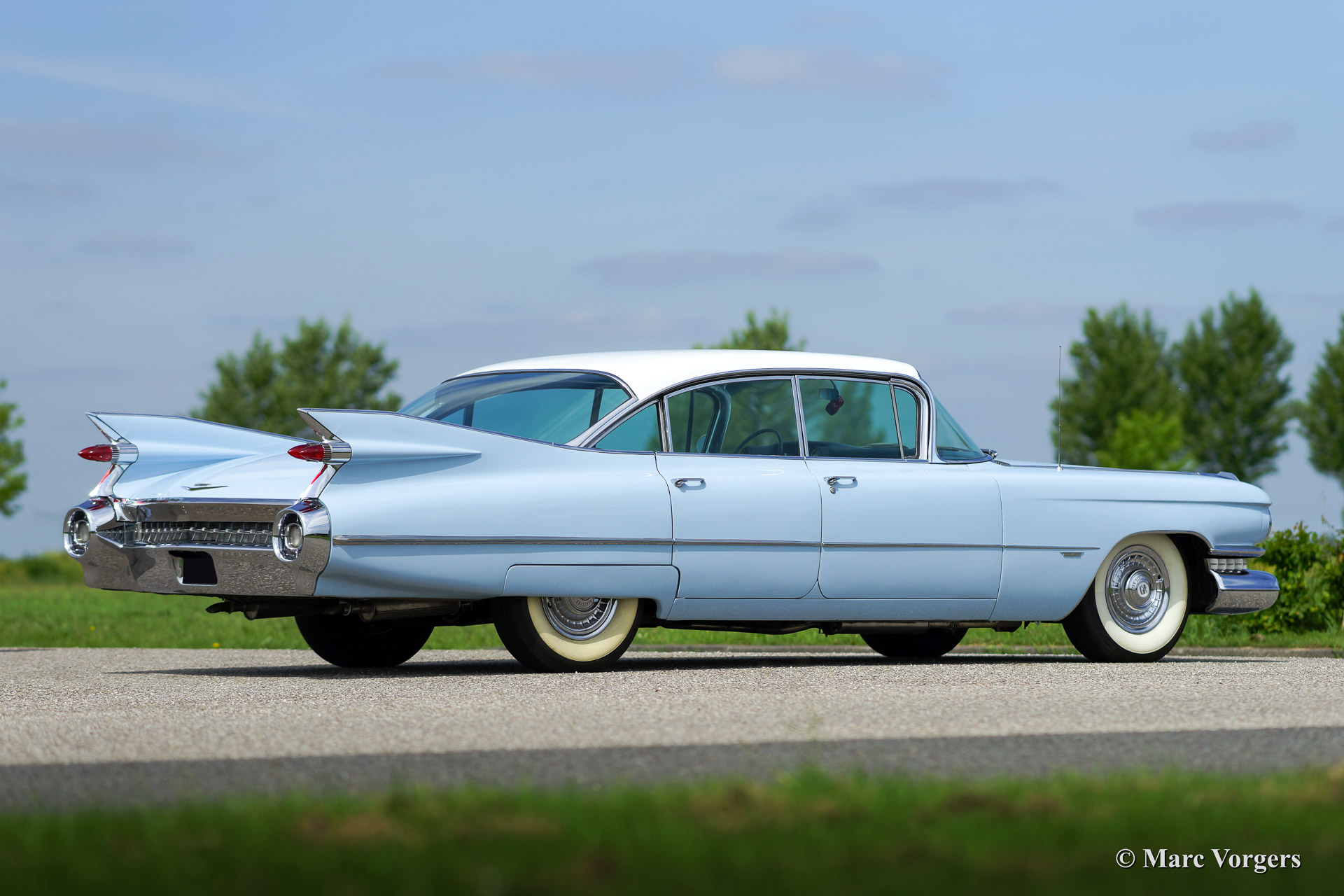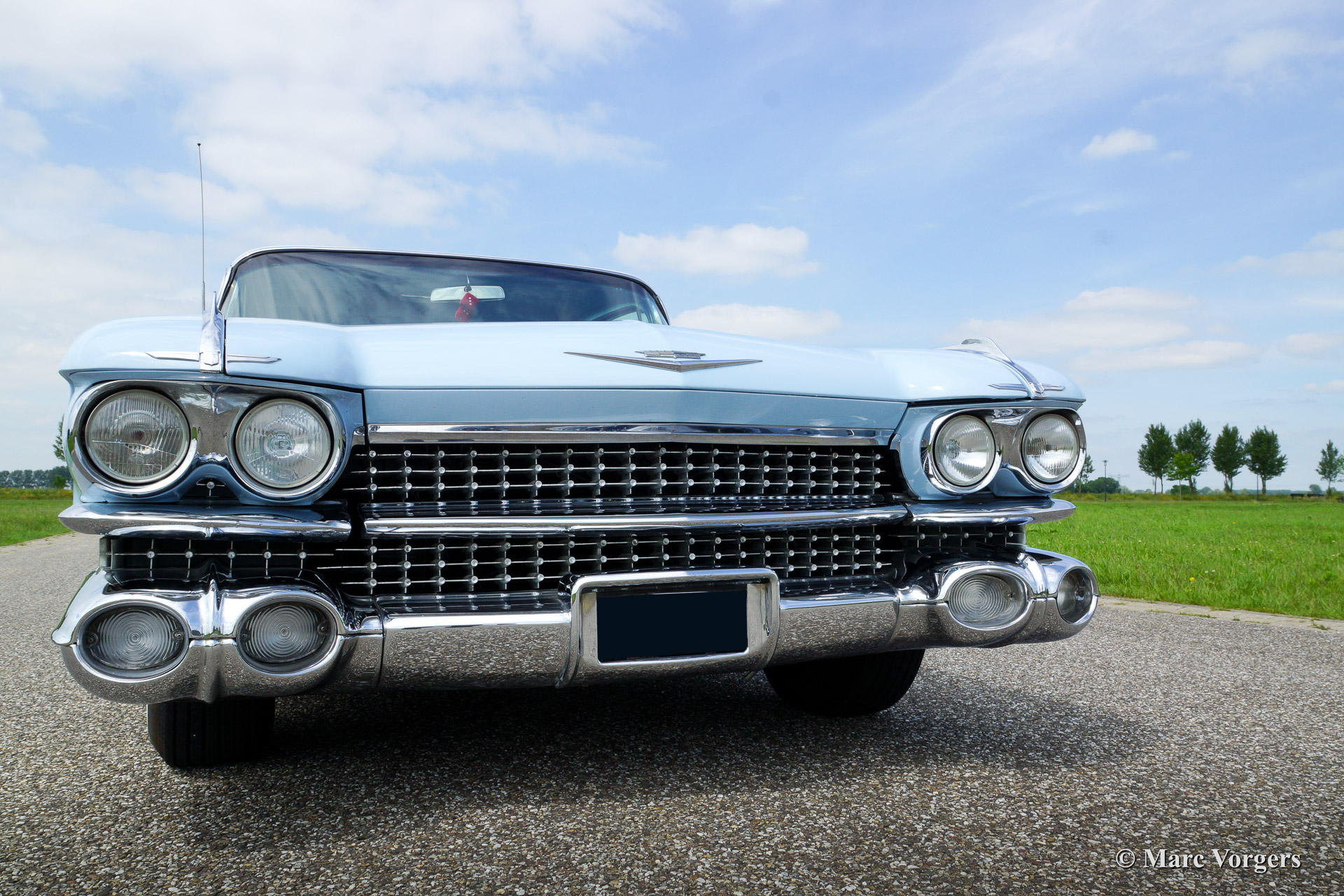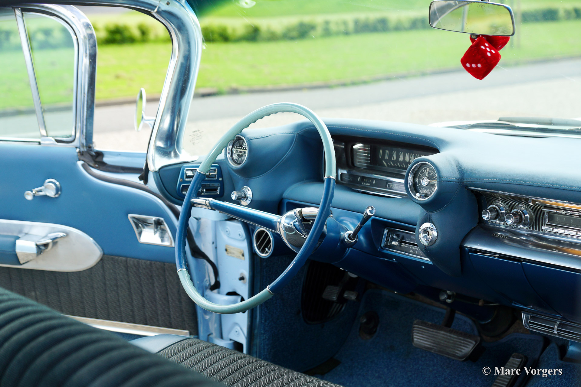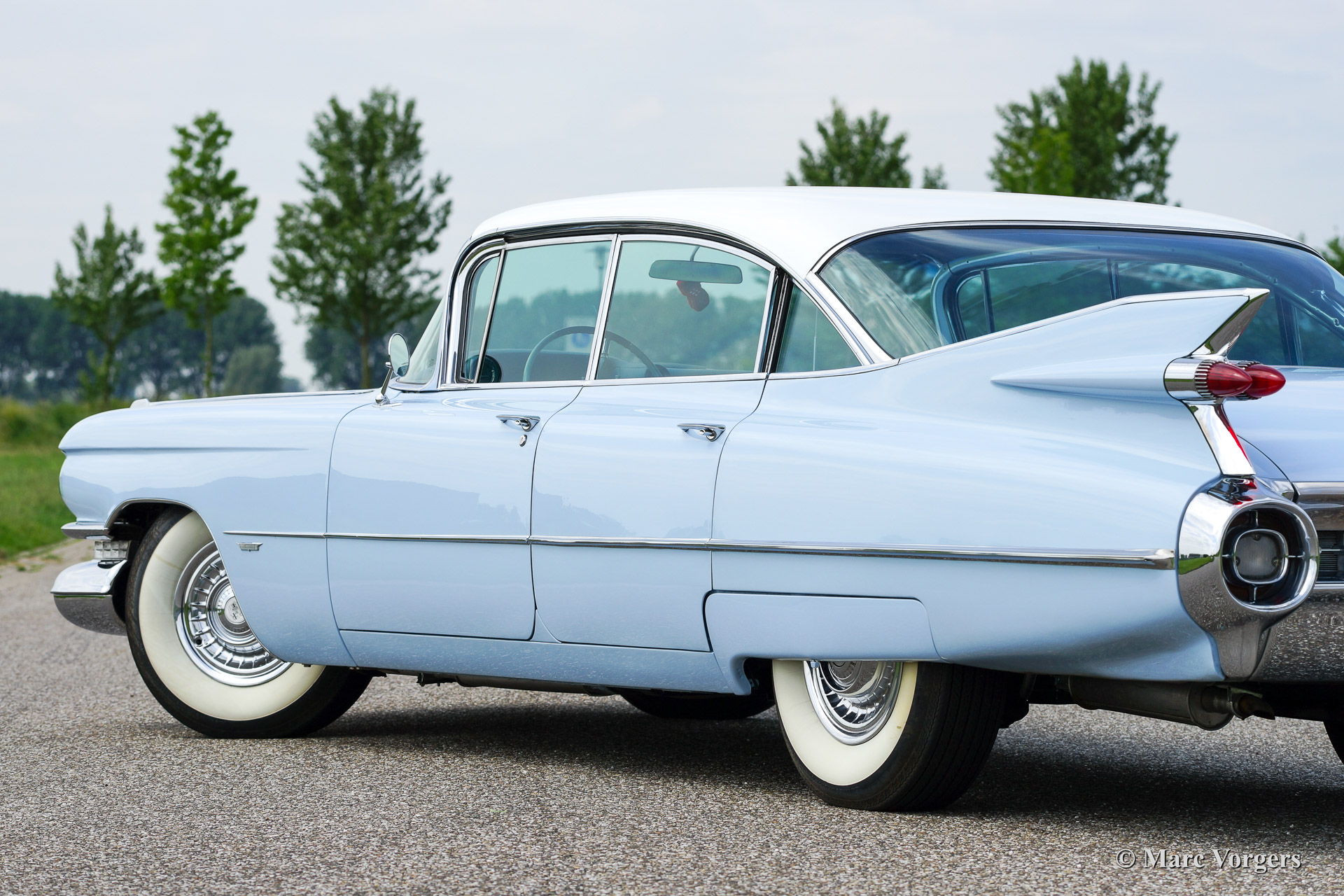 Cadillac Sedan de Ville, bouwjaar 1959. Chassis nummer 59K086XXX. kleur pastelblauw met een wit dak. Blauw vinyl met grijs stoffen interieur in combinatie met blauw tapijt. Deze indrukwekkende Cadillac Sedan de Ville is in recente jaren subliem gerestaureerd. De automobiel verkeert in concoursstaat! Dit geweldige slagschip toont alle originele details en is voorzien van een automatische versnellingsbak. Negeer de stofjes onder de motorkap; waar u ook kijkt, deze Cadillac is HAGELNIEUW!