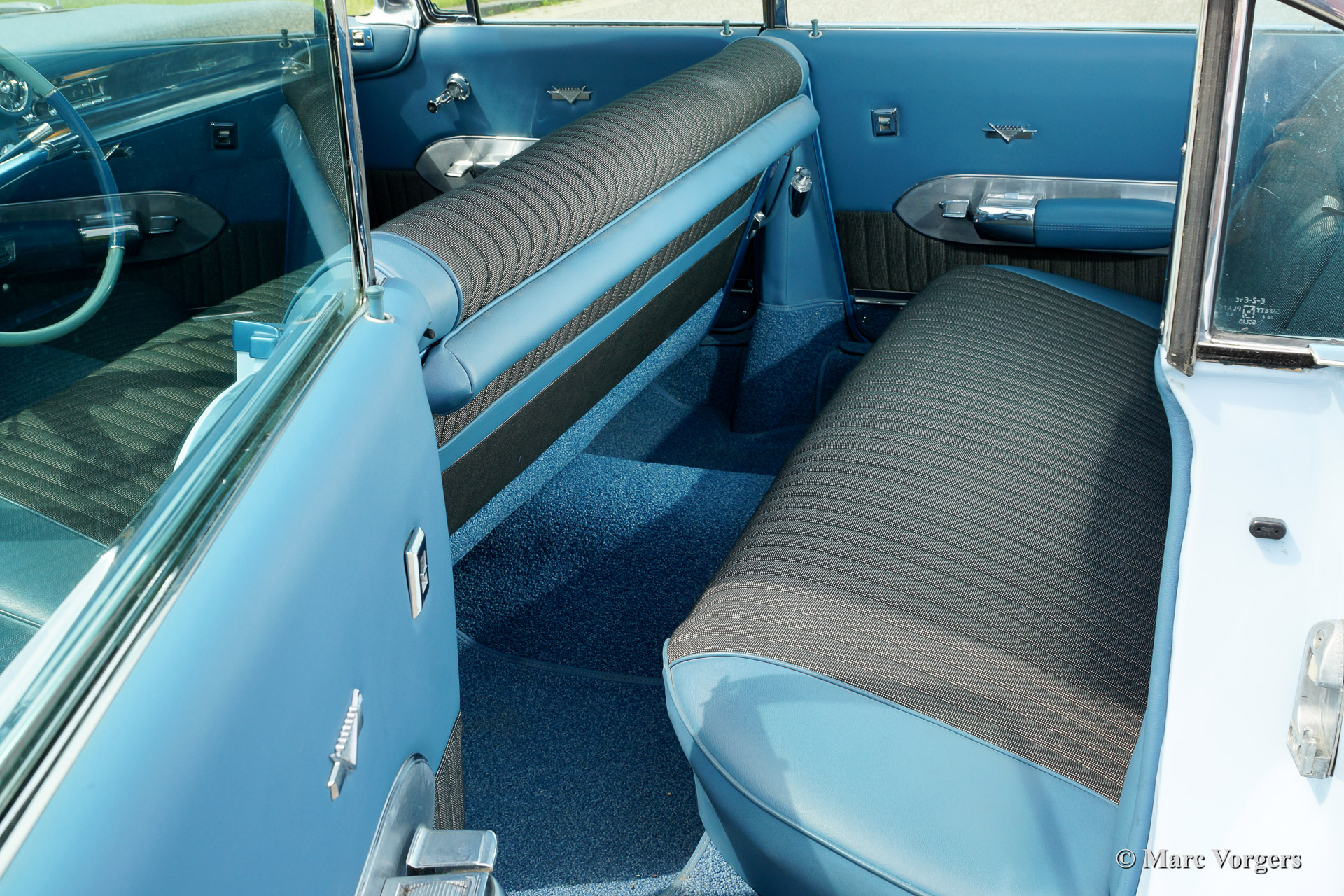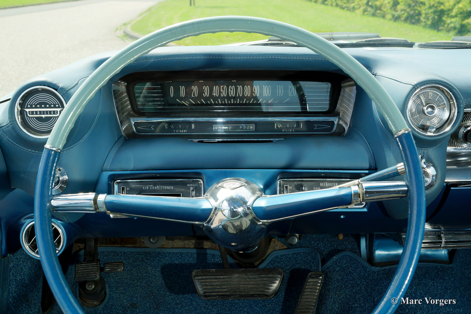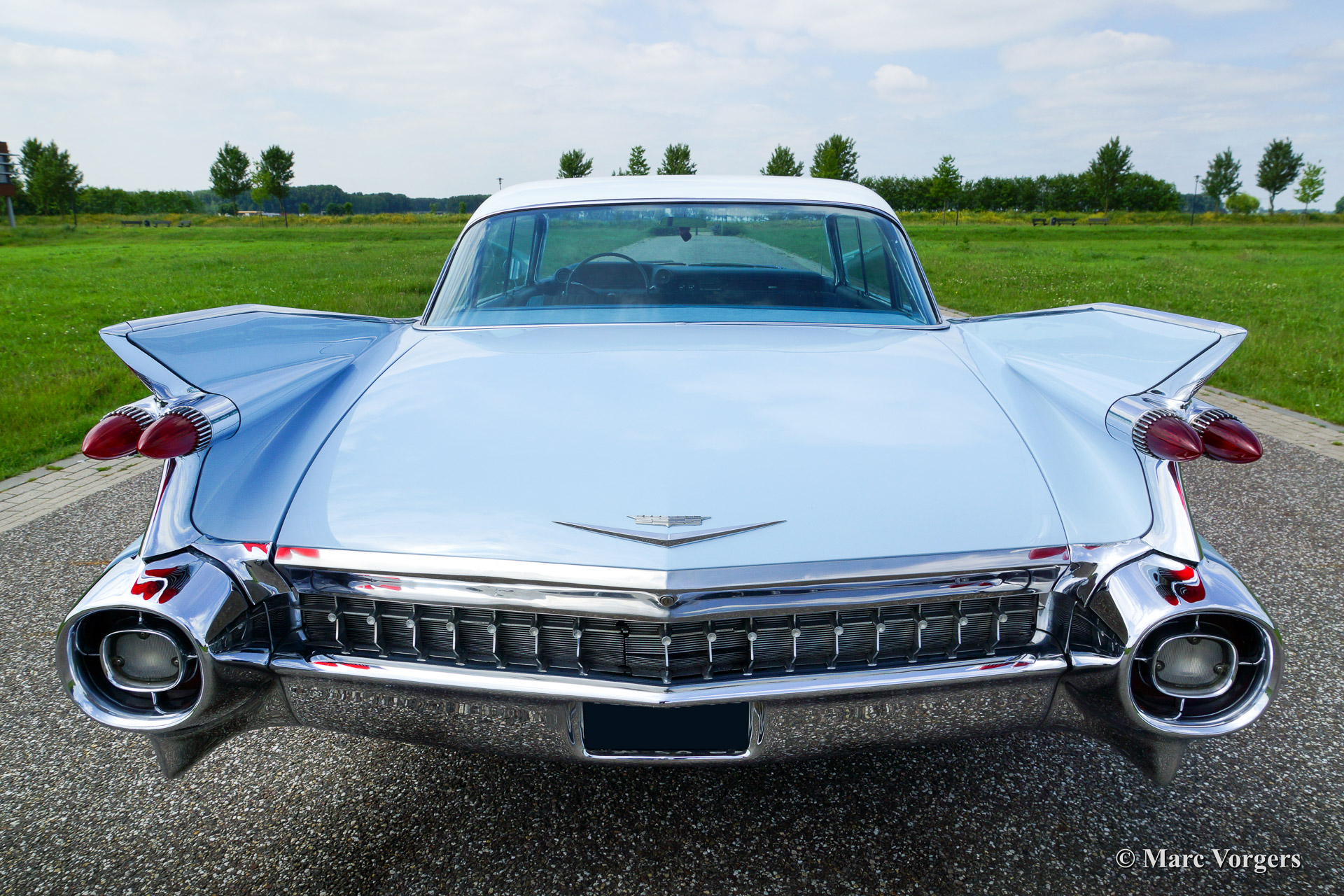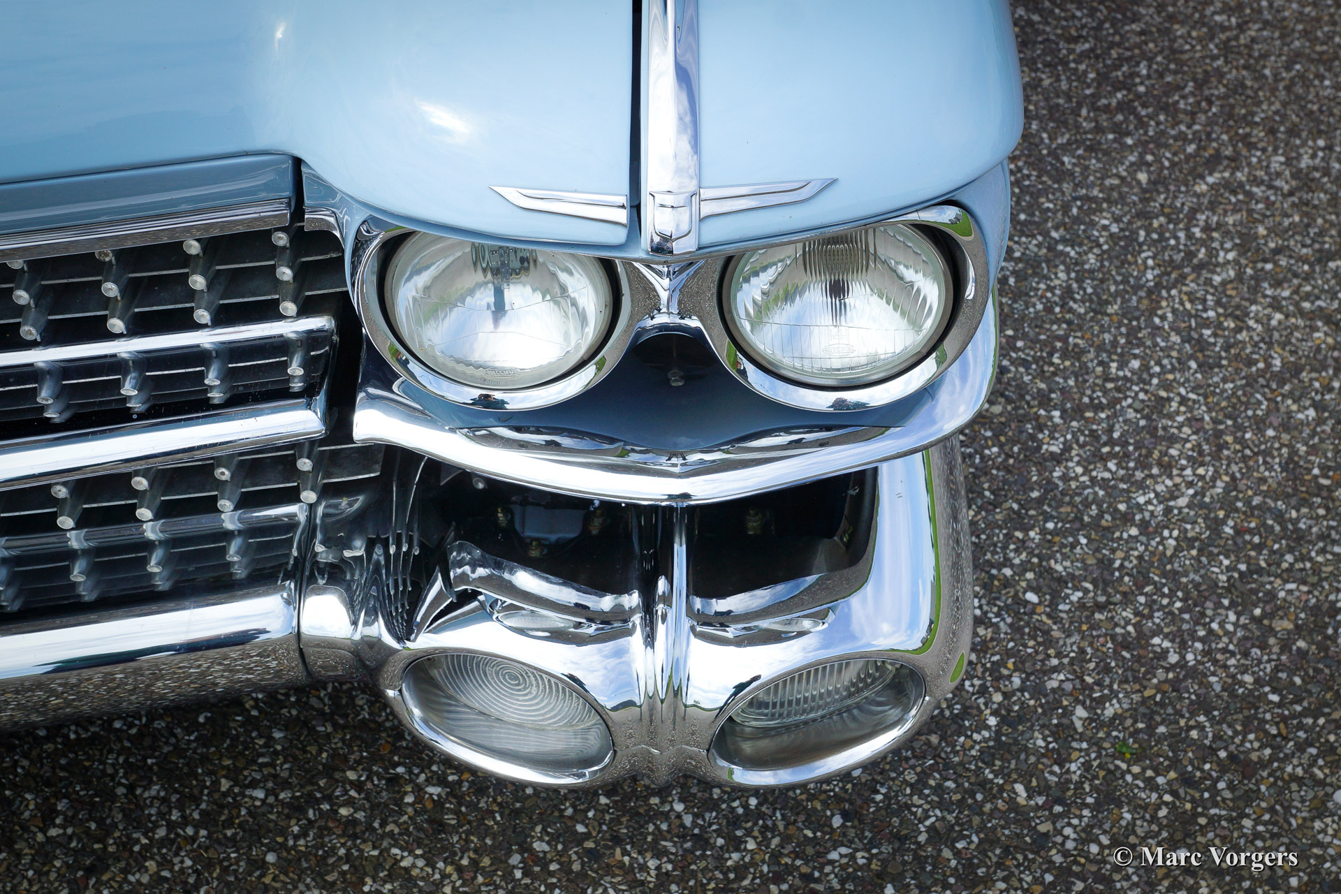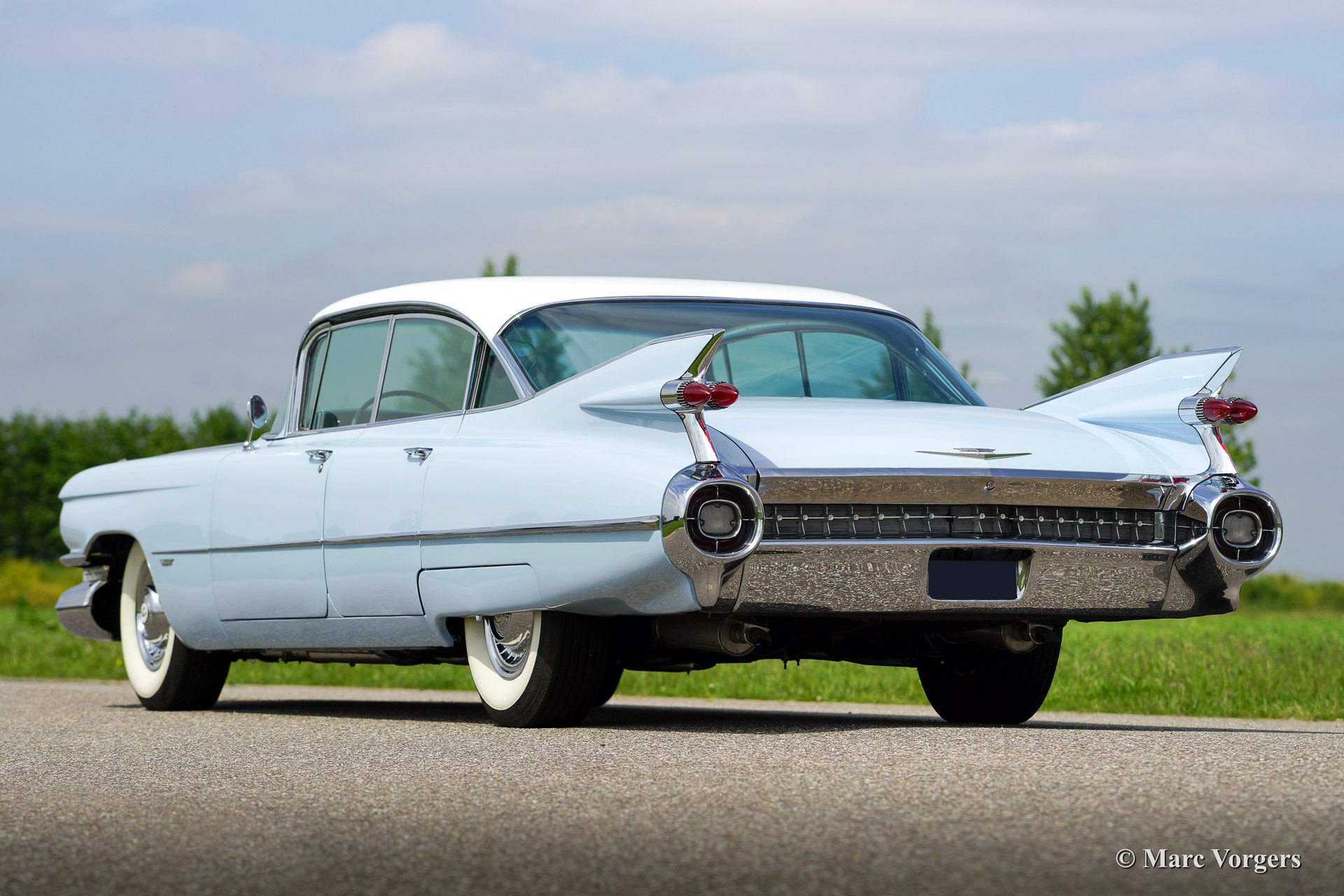 Cadillac Sedan de Ville, bouwjaar 1959. Chassis nummer 59K086XXX. kleur pastelblauw met een wit dak. Blauw vinyl met grijs stoffen interieur in combinatie met blauw tapijt. Deze indrukwekkende Cadillac Sedan de Ville is in recente jaren subliem gerestaureerd. De automobiel verkeert in concoursstaat! Dit geweldige slagschip toont alle originele details en is voorzien van een automatische versnellingsbak. Negeer de stofjes onder de motorkap; waar u ook kijkt, deze Cadillac is HAGELNIEUW!