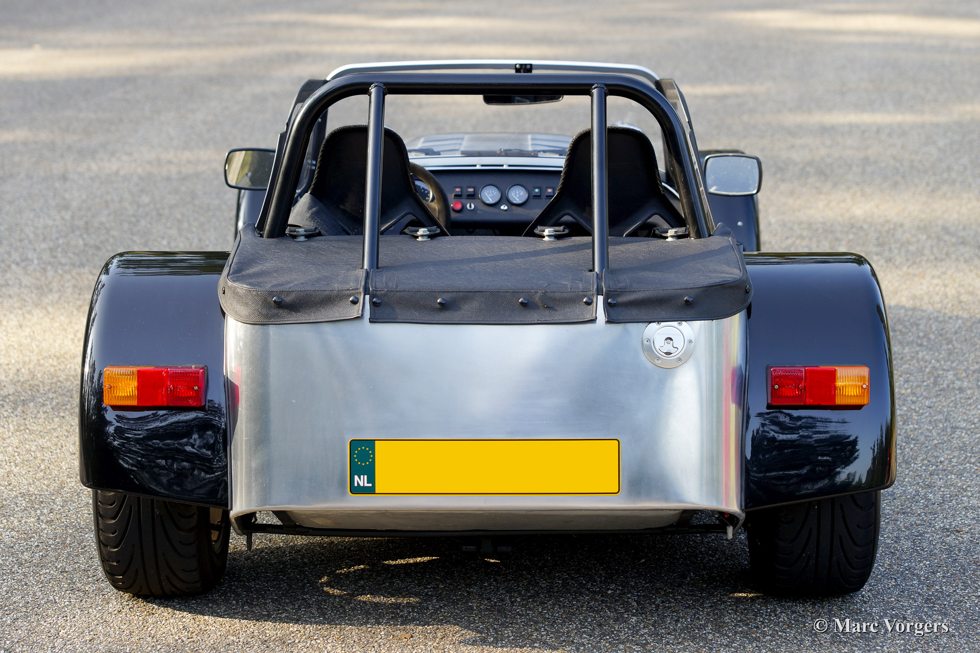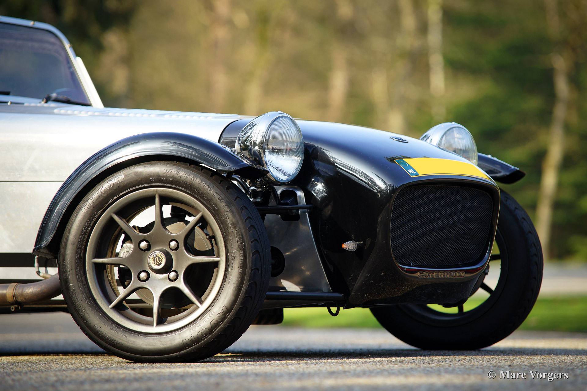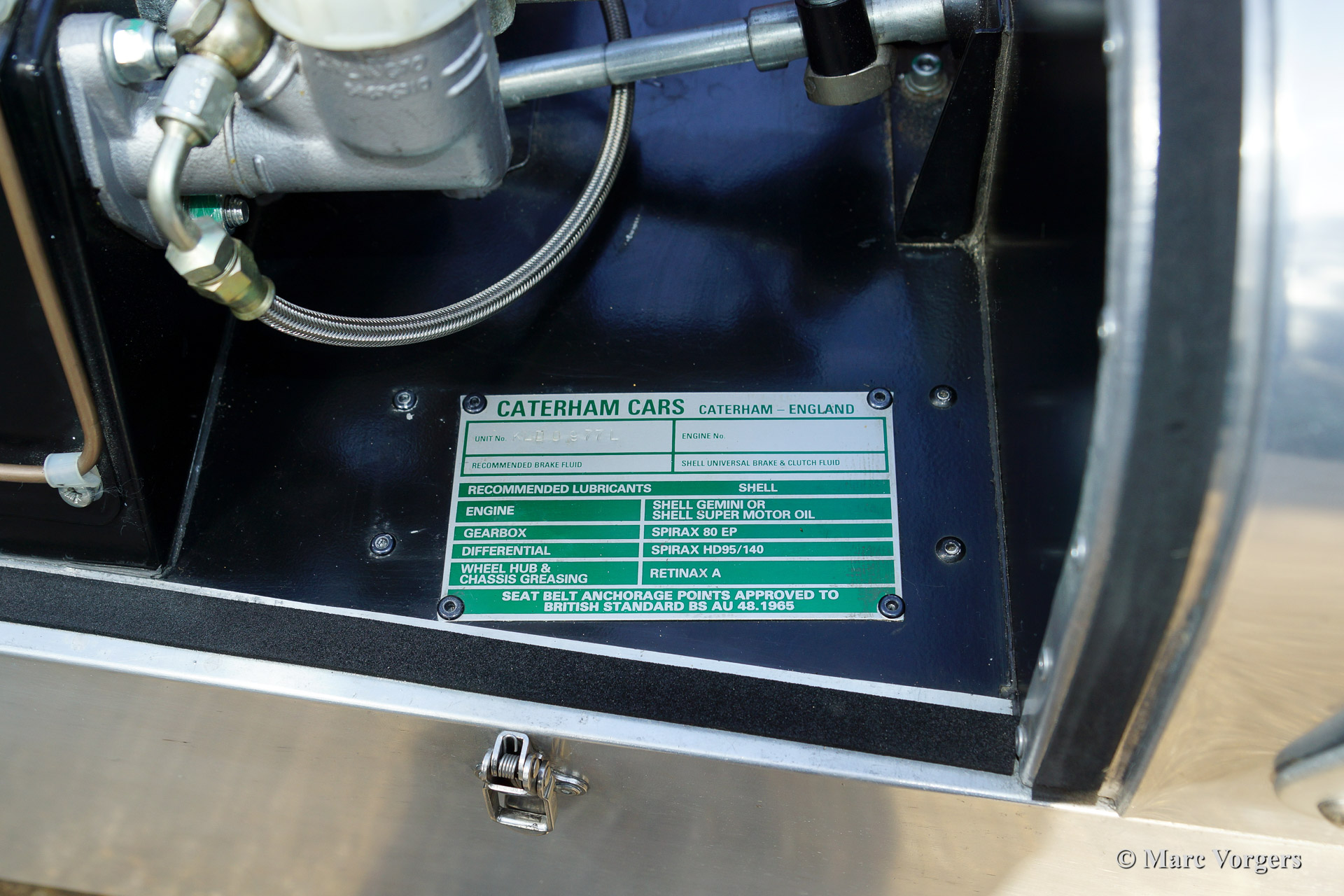 Caterham Super Seven 1600 GT, bouwjaar 2007. kleur gepolijst kaal aluminium met zwart. Zwart interieur. Deze ultralichte Caterham is voorzien van de Ford Sigma DOHC met een vermogen van 130 pk.. De auto is uitgerust met kuipstoelen die je aantrekt als een handschoen en vierpunts veiligheidsgordels die je stevig op de plek houden. The Super 7 is een spectaculaire 'pocket-rocket' die zich thuisvoelt op gladde kronkelende landwegen en op het circuit.